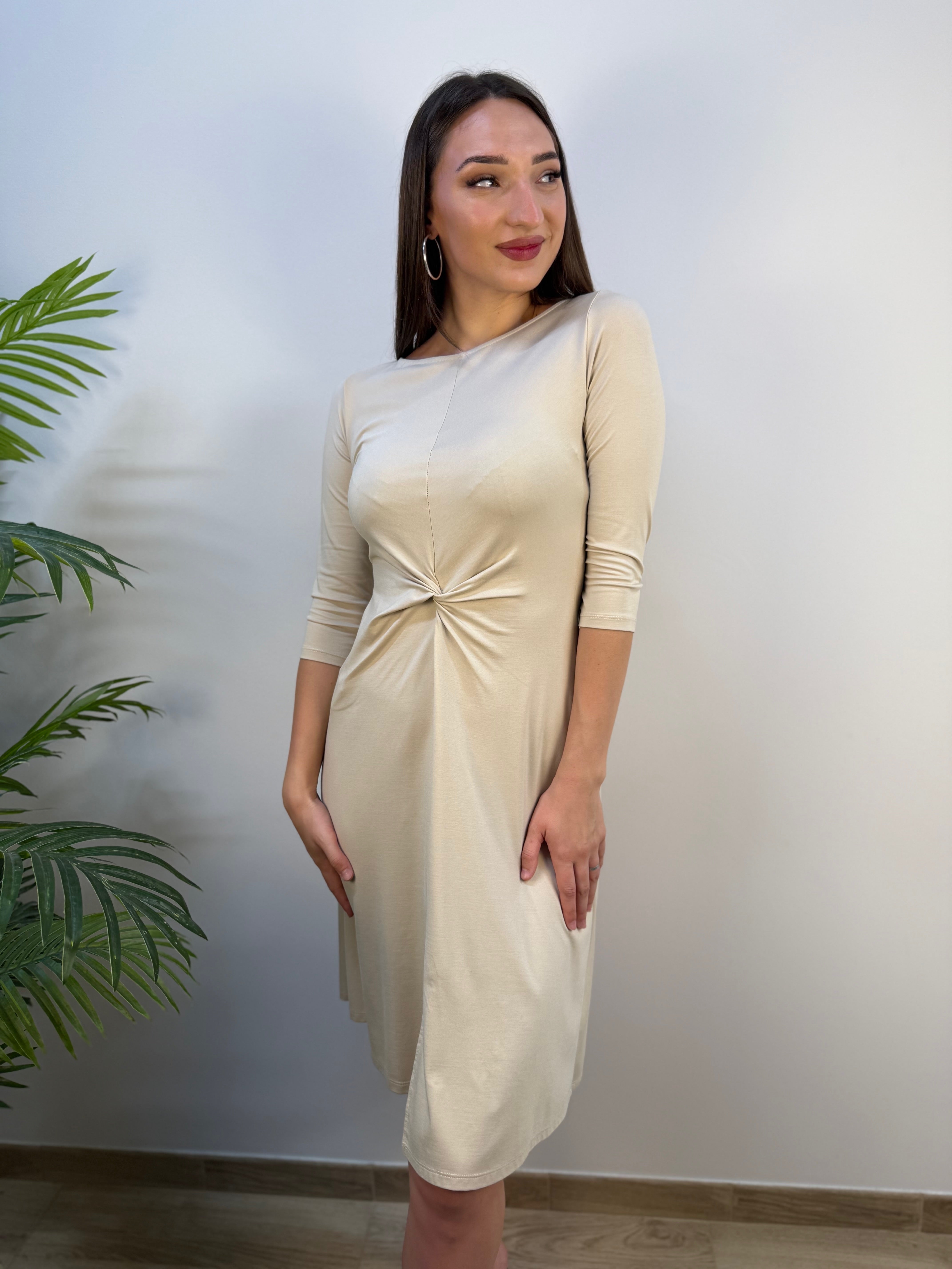 Elegante nella sua semplicità, questo abito Rinascimento in morbida viscosa color beige unisce comfort e stile con dettagli studiati per valorizzare la figura. Il taglio sfiancato accompagna le forme con delicatezza, mentre le maniche al gomito e lo scollo rotondo lo rendono adatto a diverse occasioni. L’effetto arricciato sulla zona della pancia crea un raffinato gioco di drappeggi, completato da un piccolo spacco centrale nella gonna che aggiunge movimento e femminilità. Un capo versatile da indossare con facilità, dal giorno alla sera.