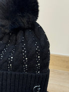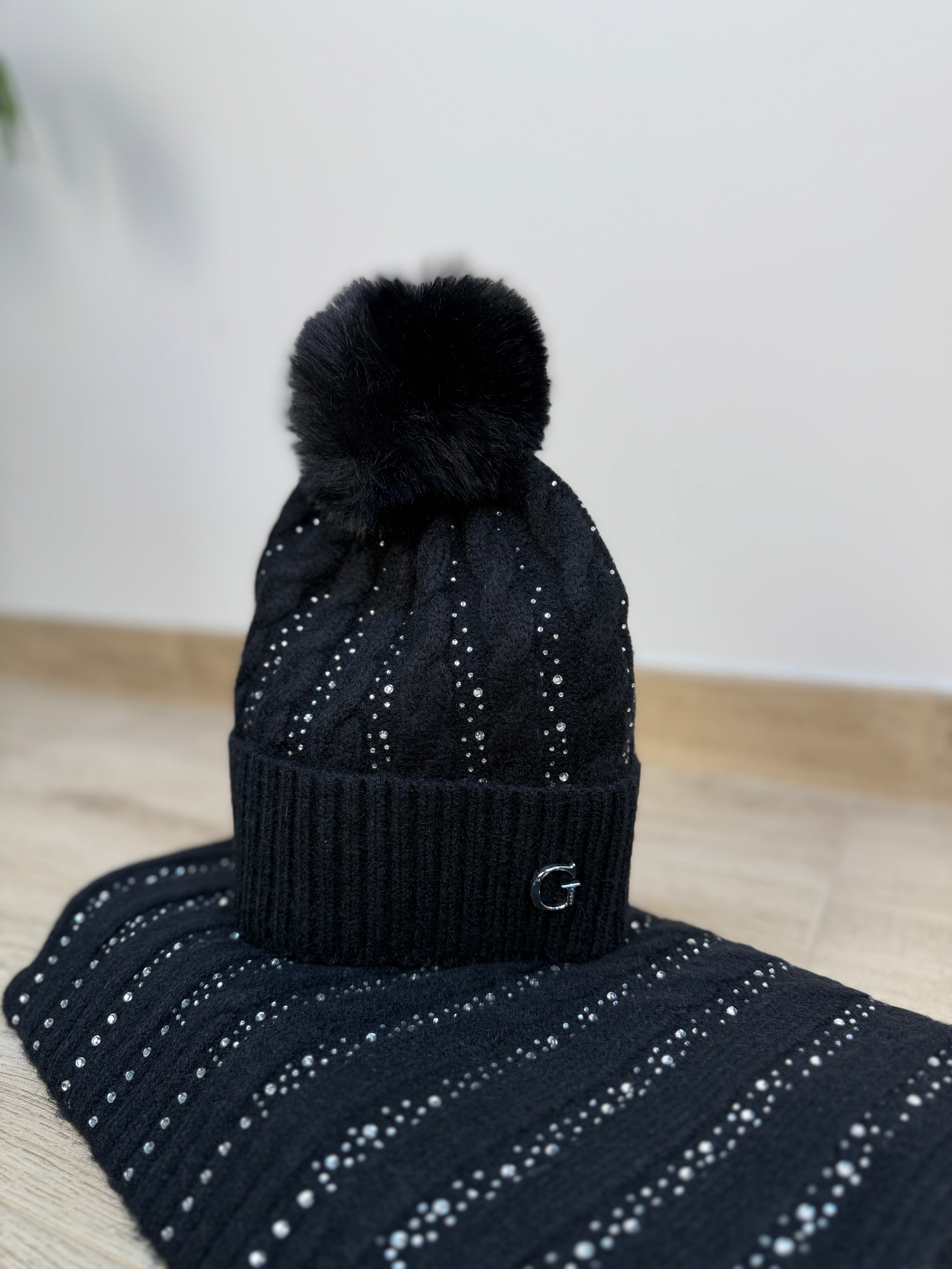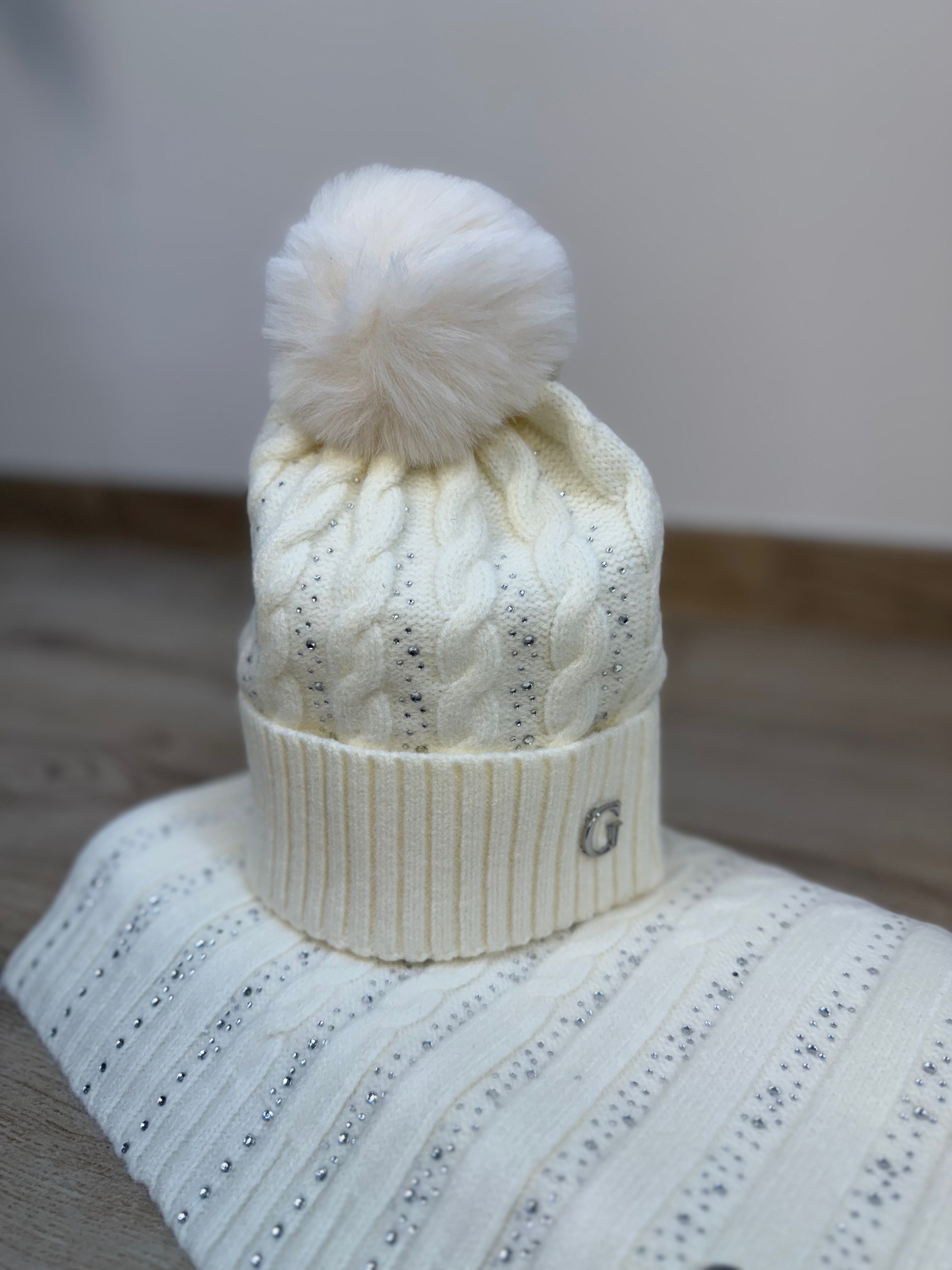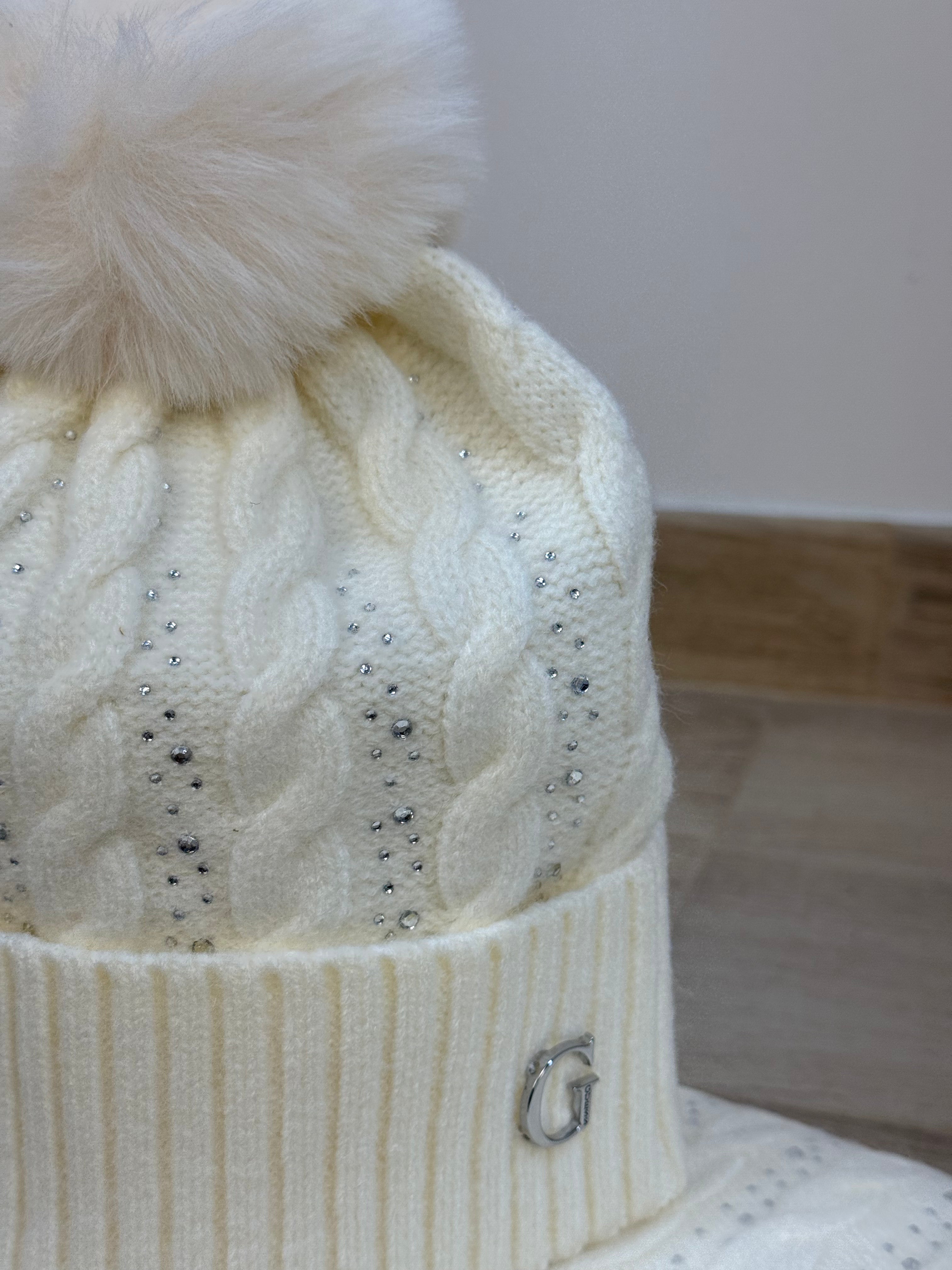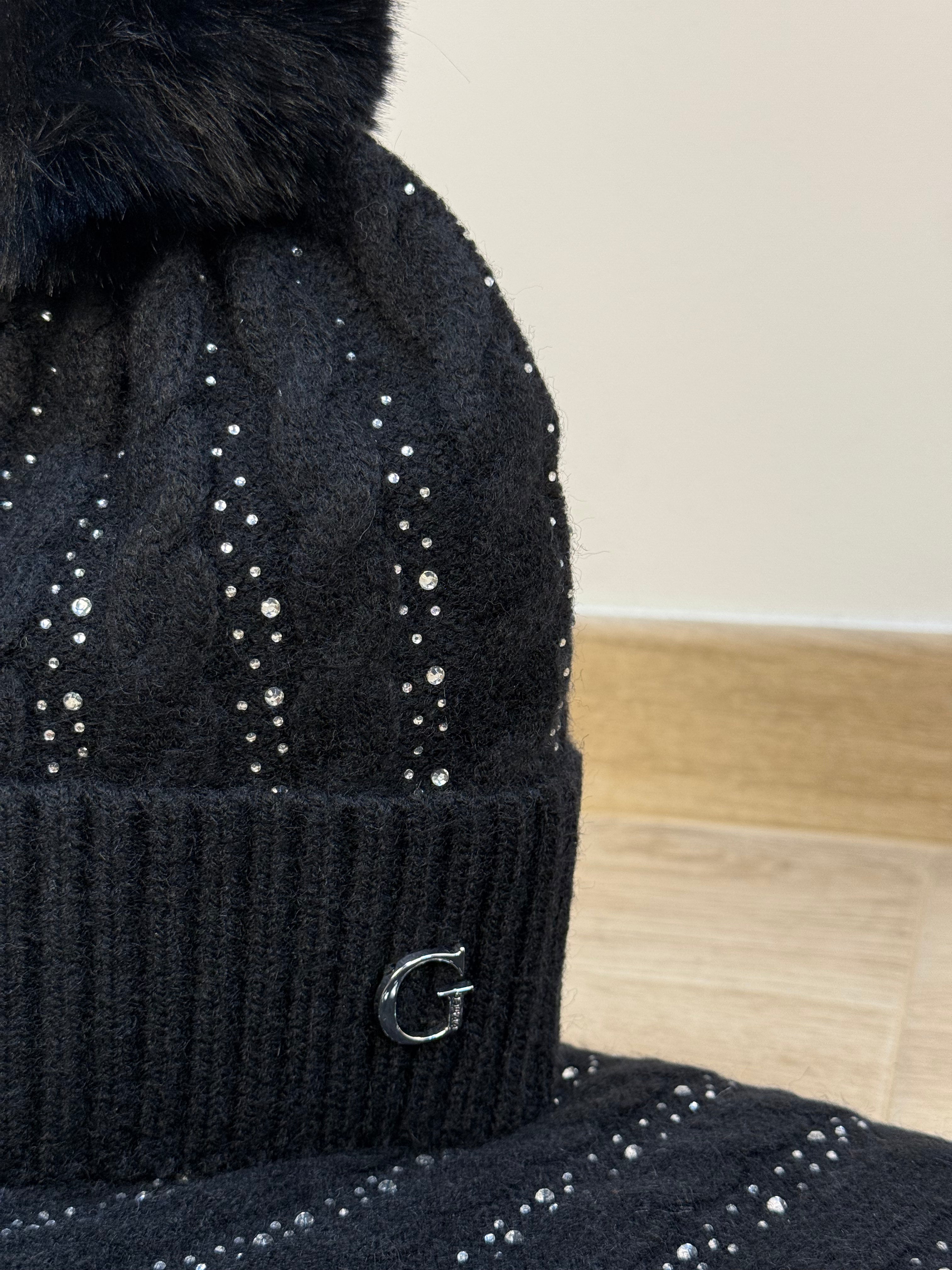 Berretto GUESS pensato per fare la differenza: la trama a treccia dona una texture ricca e avvolgente, mentre il soffice pom pom in cima aggiunge un tocco giocoso e sofisticato. Ai bordi, una cascata di piccoli strass illumina il modello, trasformandolo da semplice cuffia in dettaglio di stile contemporaneo. Perfetto per chi ama un look curato anche nei momenti più casual: un mix di comfort, personalità e luce.