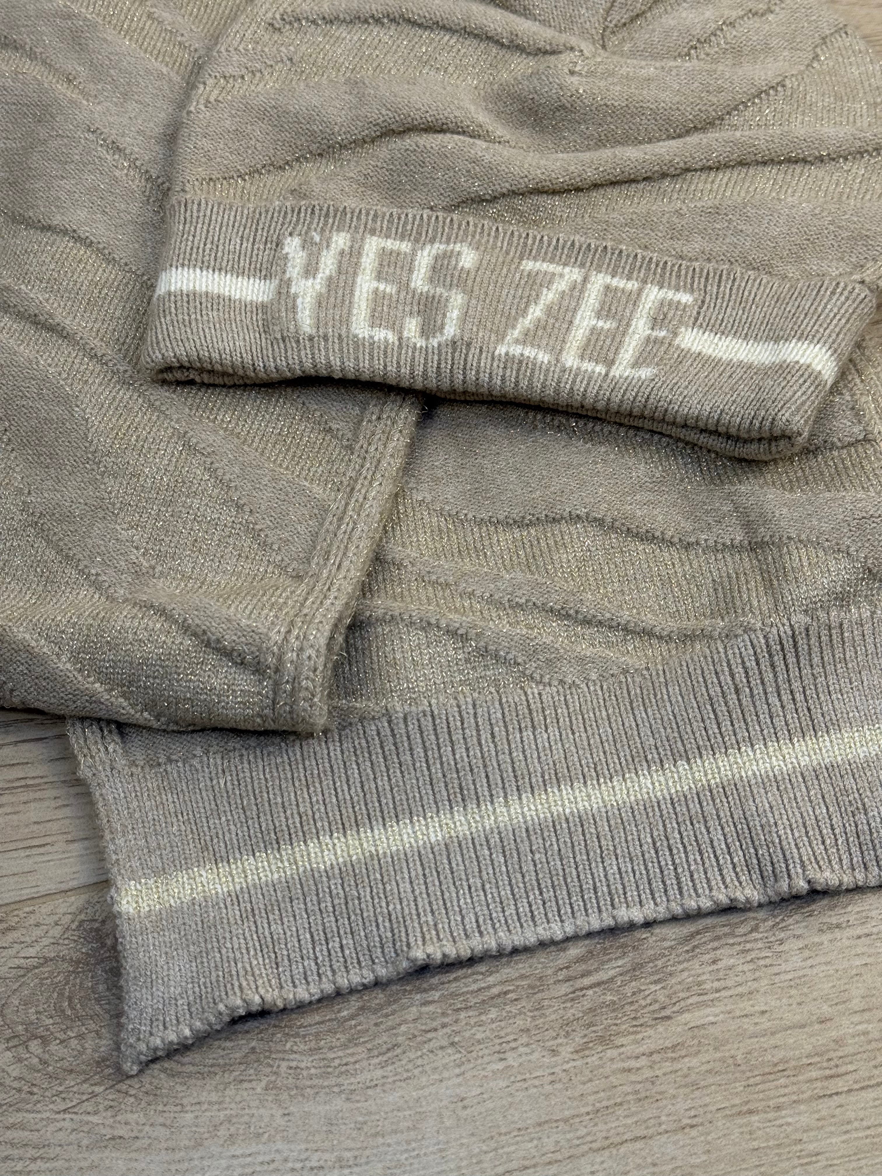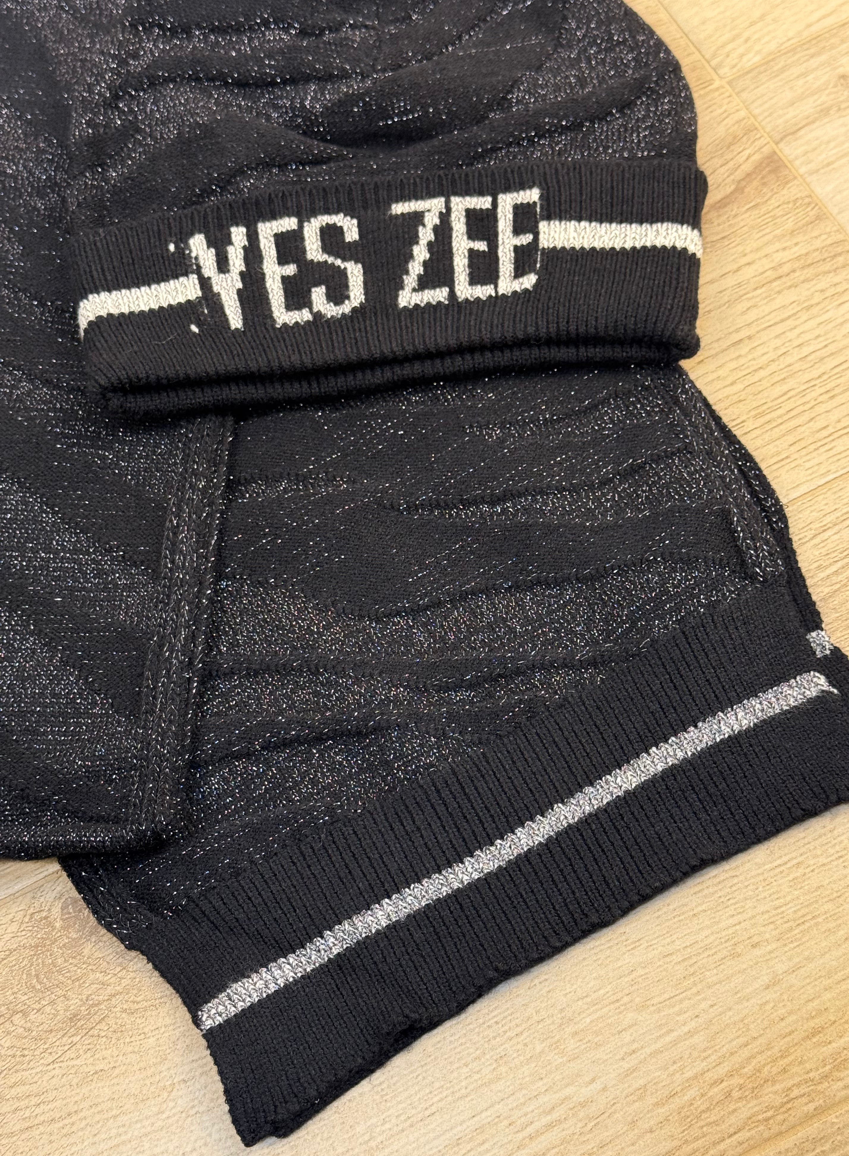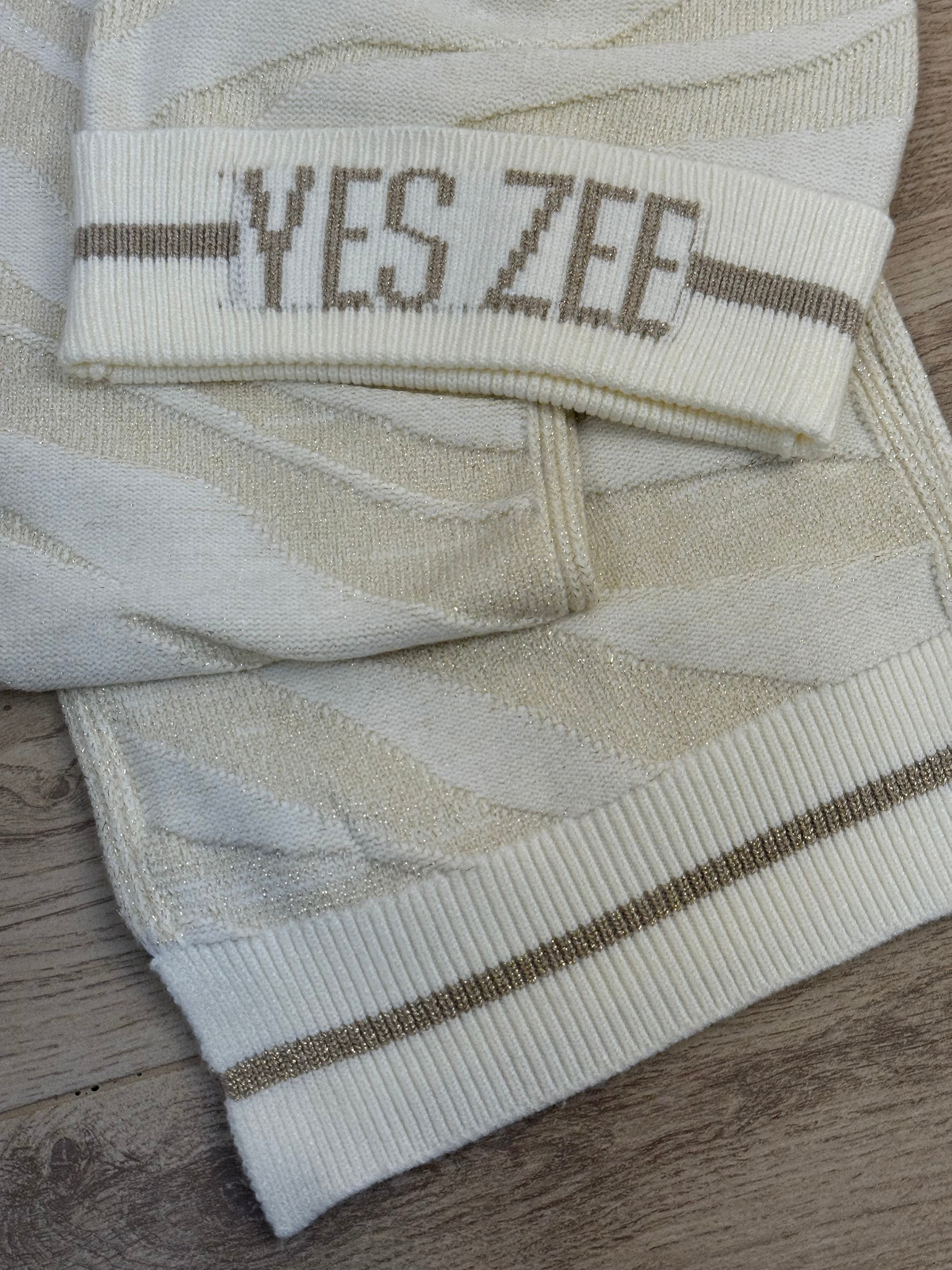 Completo Yes-Zee composto da sciarpa e berretto in morbida maglia con raffinata trama animalier, impreziosita da filati di lurex che aggiungono un tocco di luminosità. Il berretto presenta il logo applicato, mentre la sciarpa è calda, soffice e avvolgente. Un set elegante e coordinato, perfetto per illuminare i look invernali.