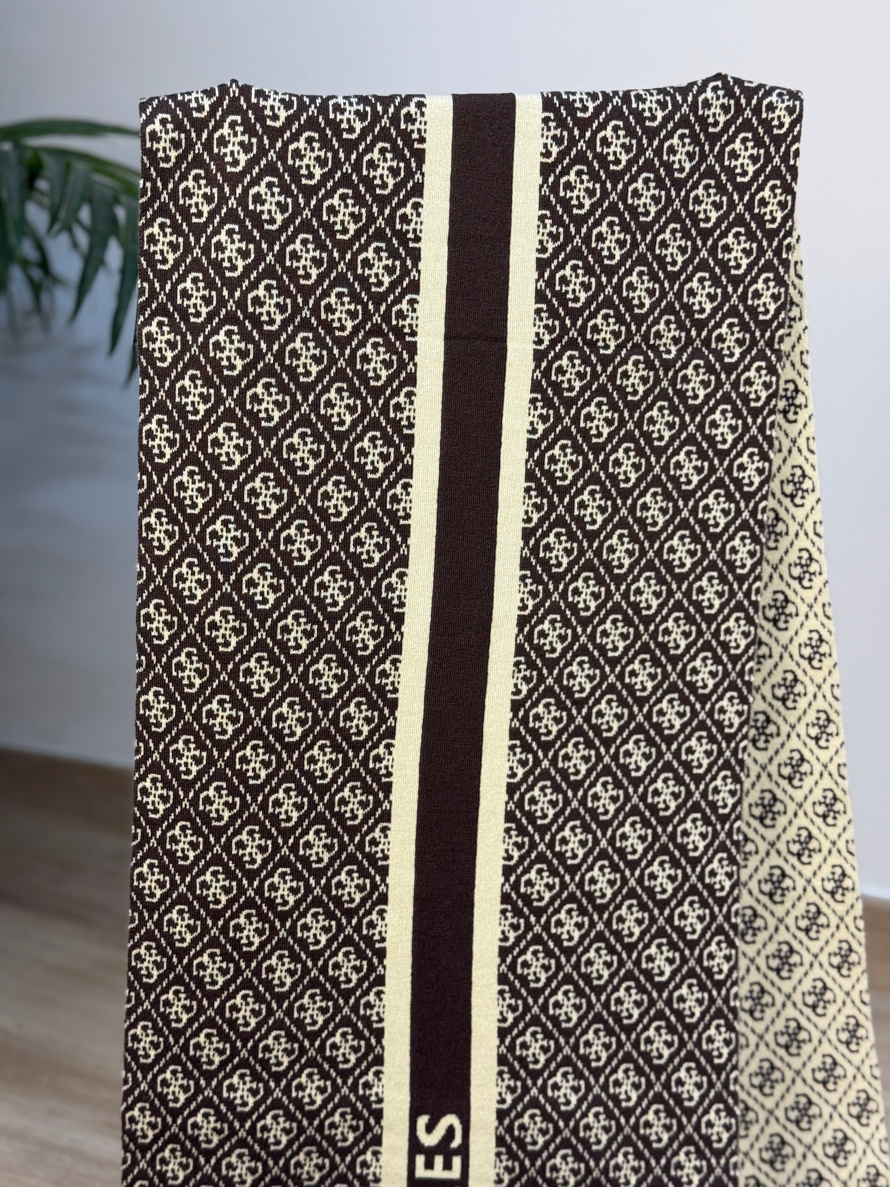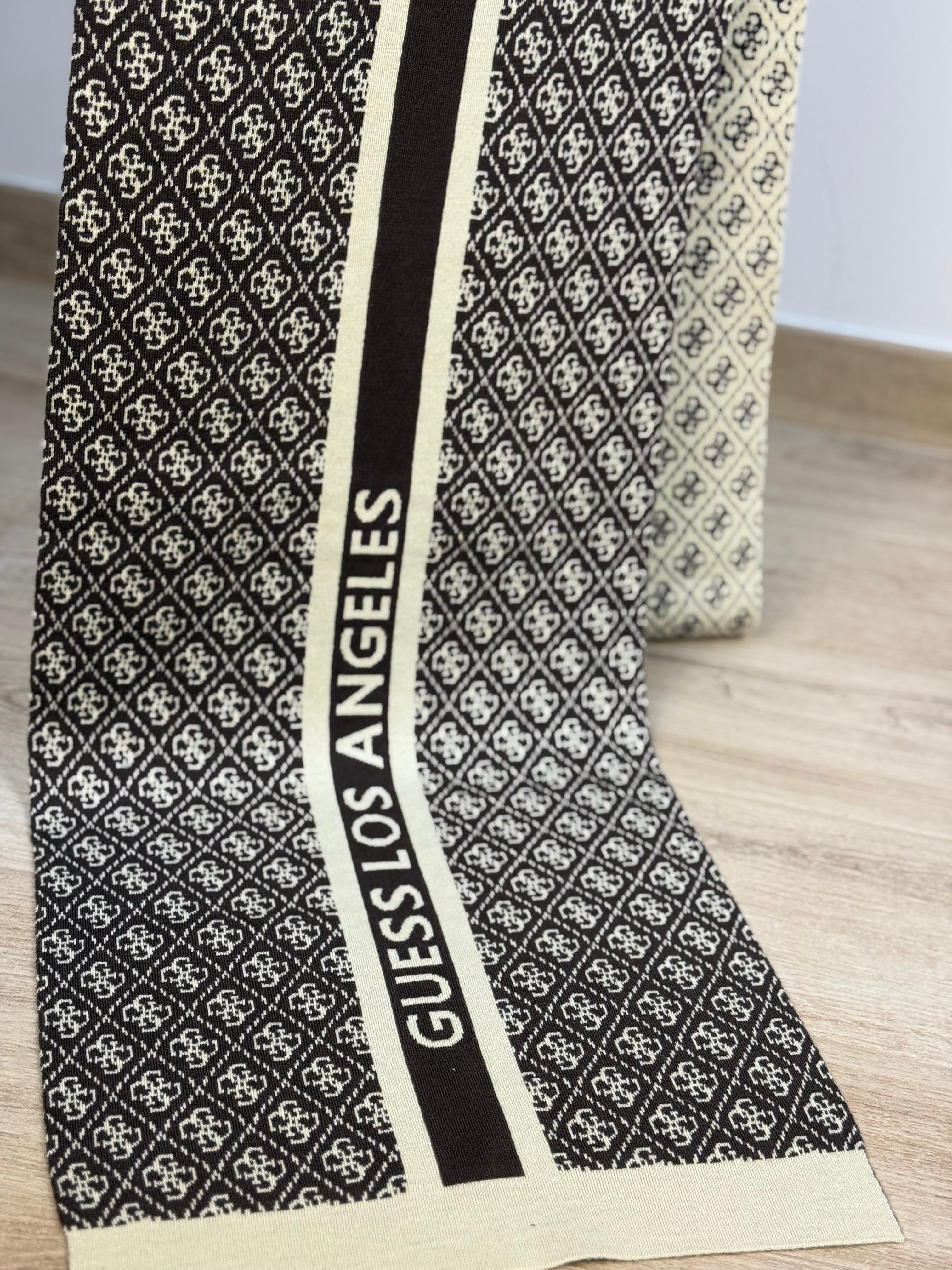 Sciarpa GUESS logata a contrasto fronte e retro, con banda centrale pulita con scritta logo.