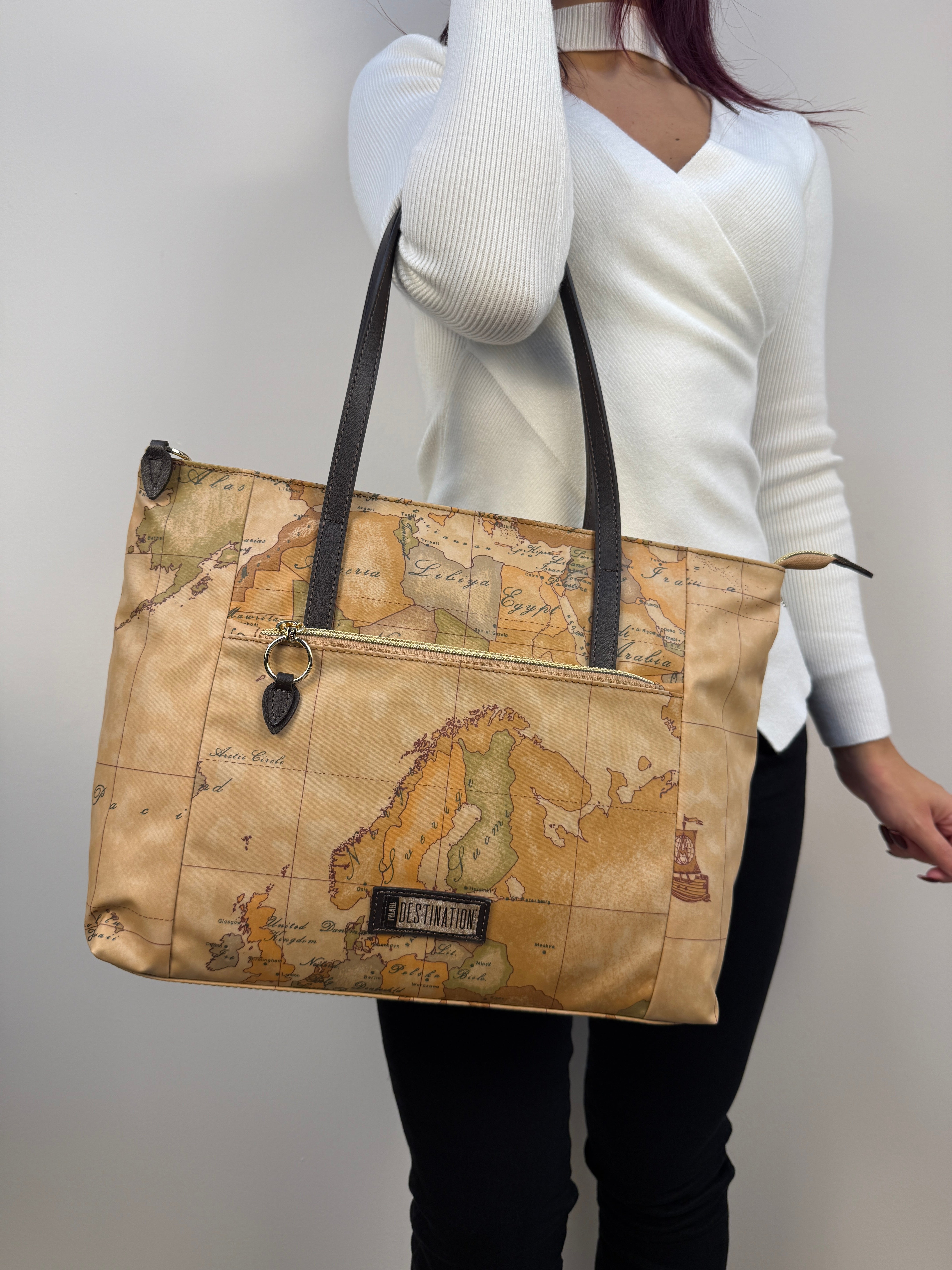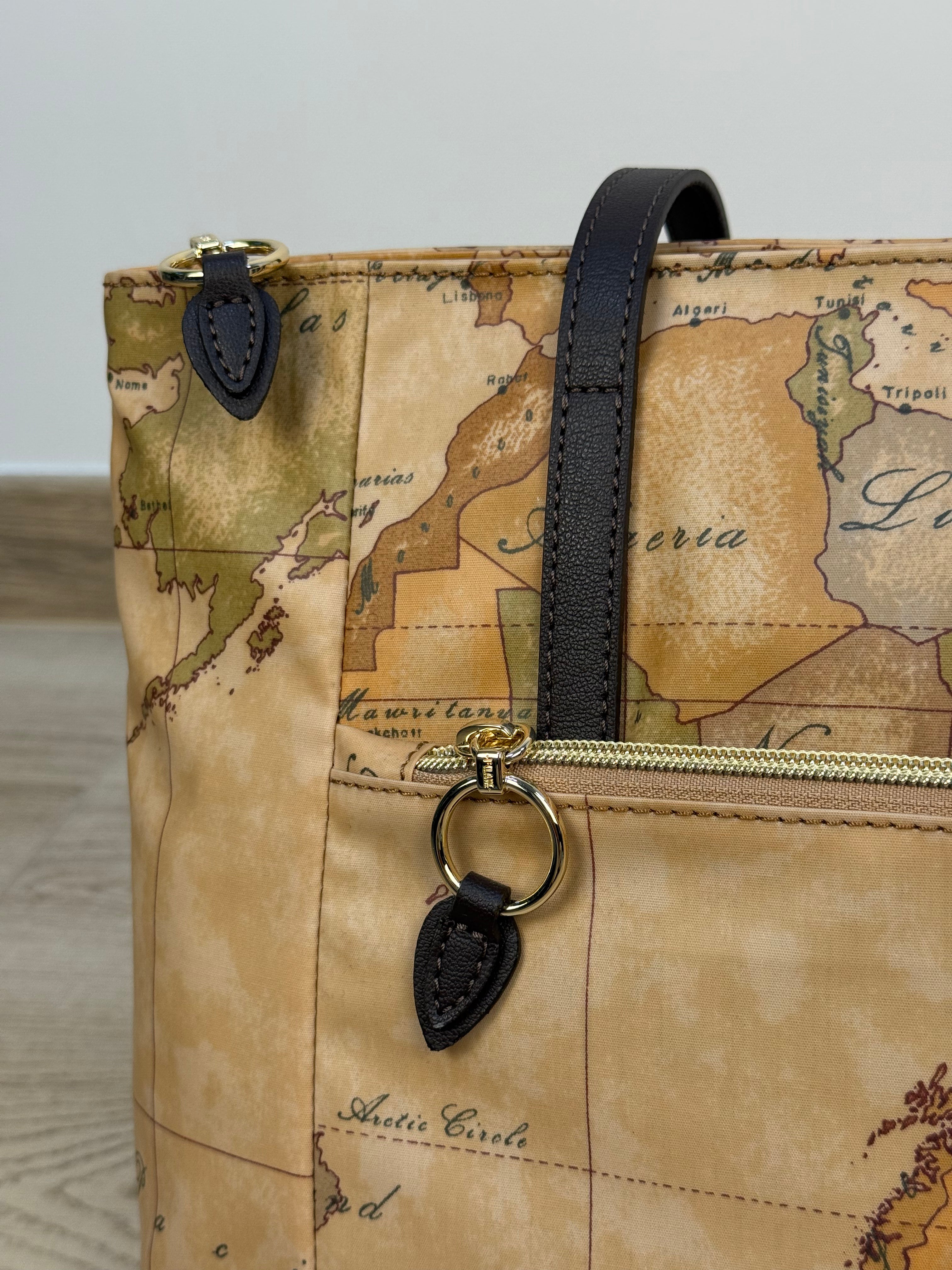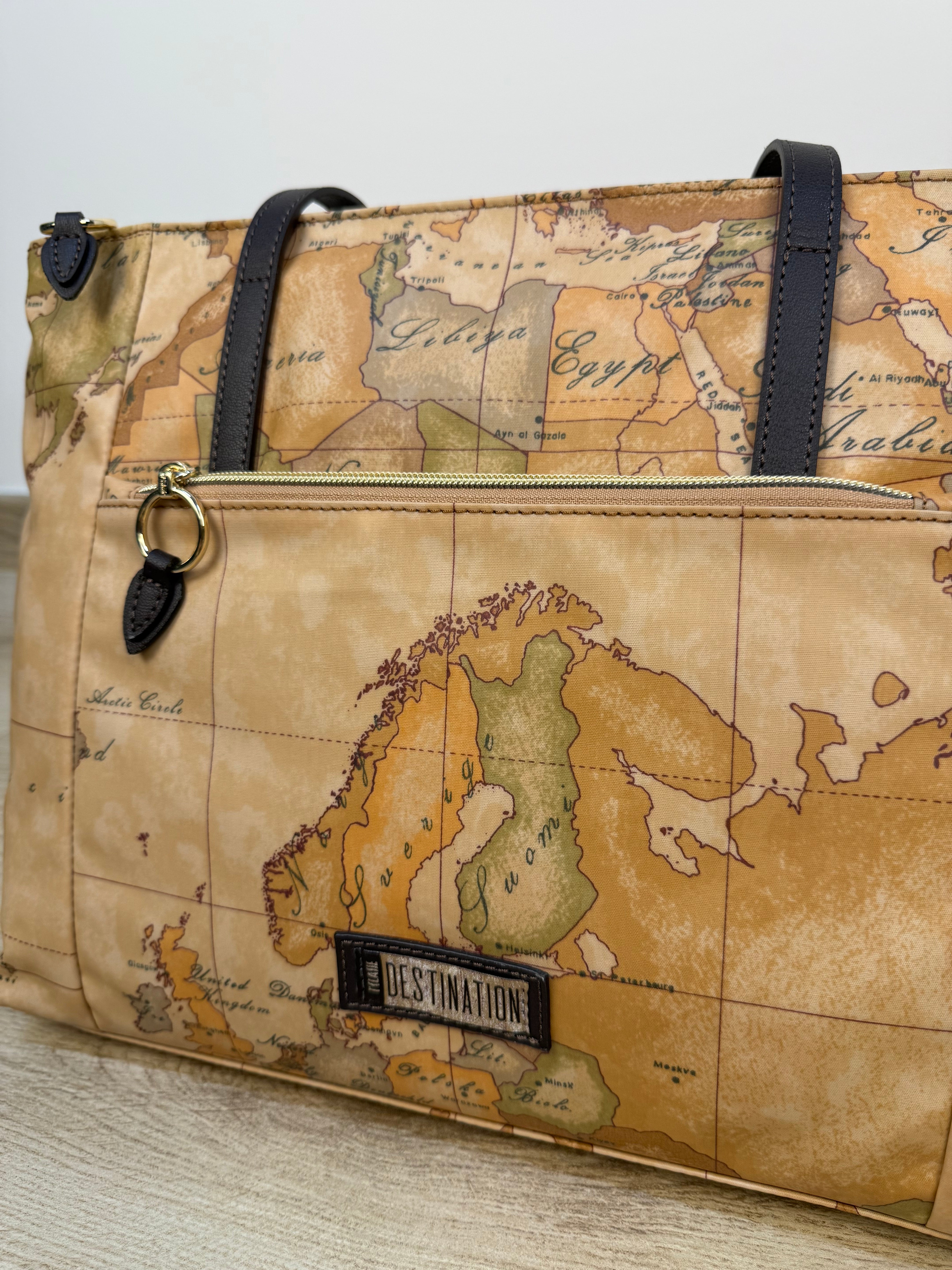 Spaziosa e versatile, questa borsa shopping in tessuto Soft Geo della linea Destination di Alviero Martini unisce eleganza e funzionalità. Dotata di una tasca esterna con chiusura a zip, offre facile accesso agli oggetti essenziali. All’interno dello scomparto principale, sono presenti due tasche aperte e una tasca con zip per una perfetta organizzazione. Completa il design la pratica tracolla regolabile in similpelle color cioccolato, affiancata da due manici resistenti per un comodo trasporto a mano o a spalla. La patch ricamata su similpelle sulla parte frontale e la metalleria logata in finitura oro aggiungono un tocco di raffinatezza e stile.