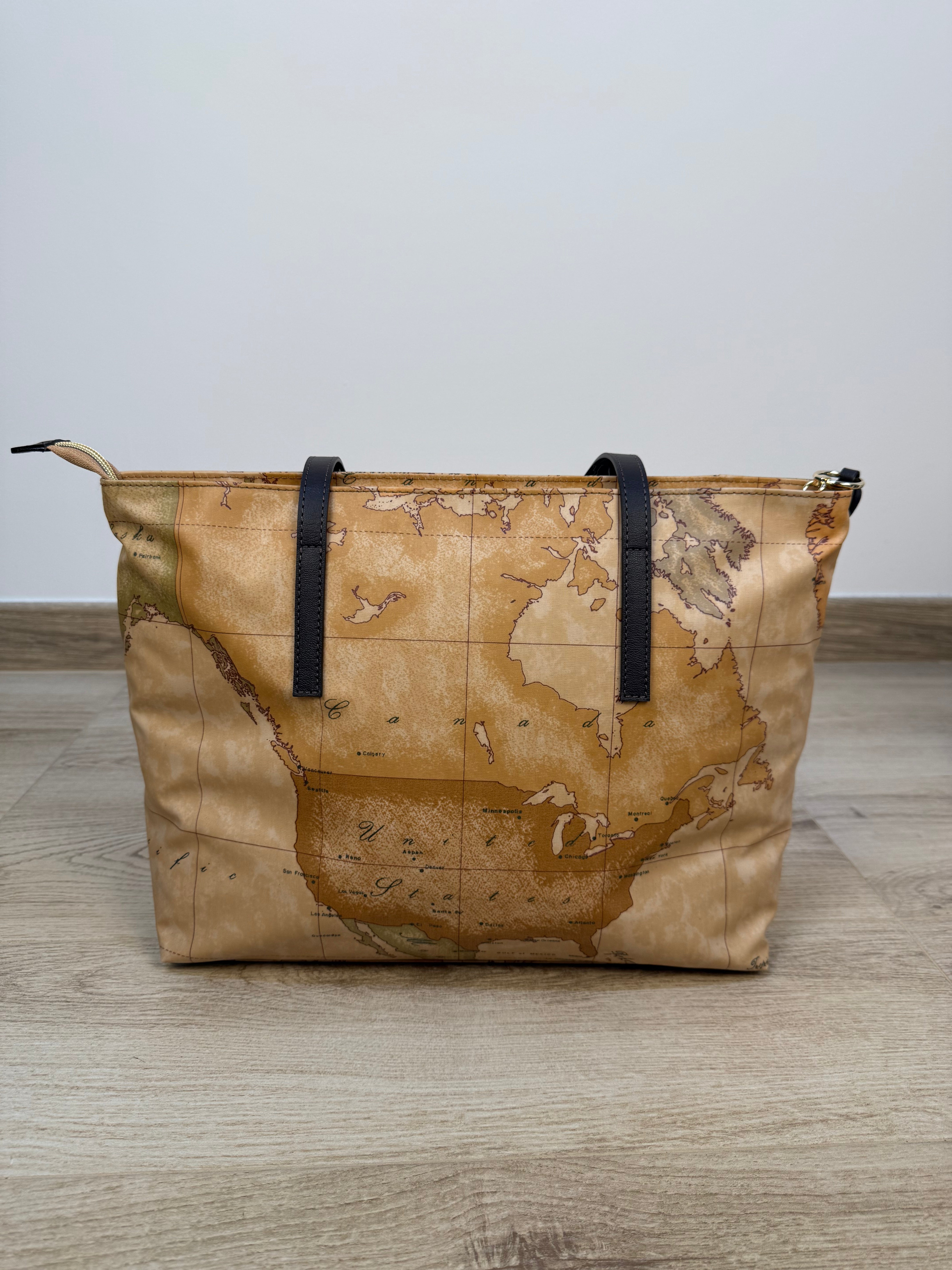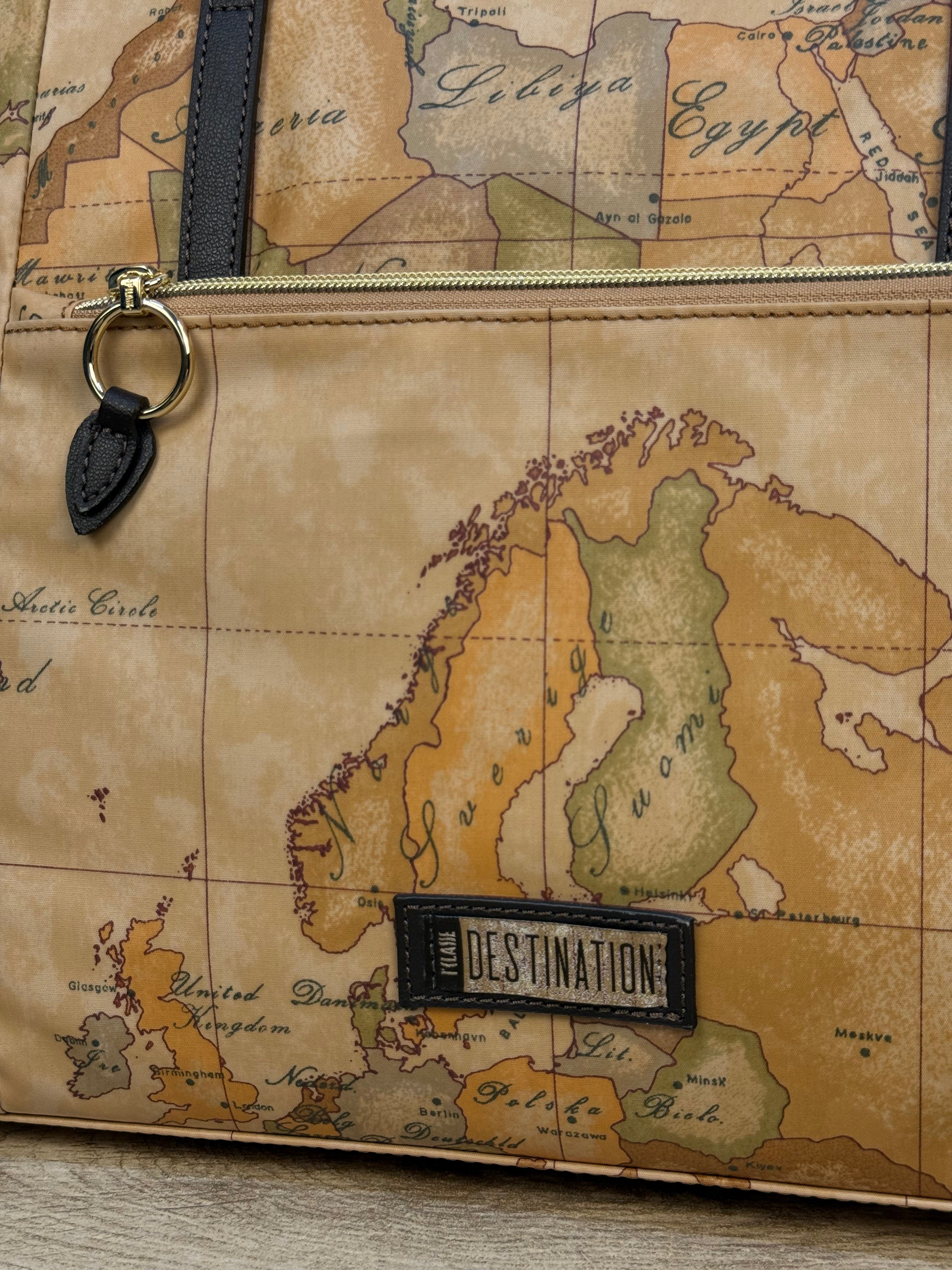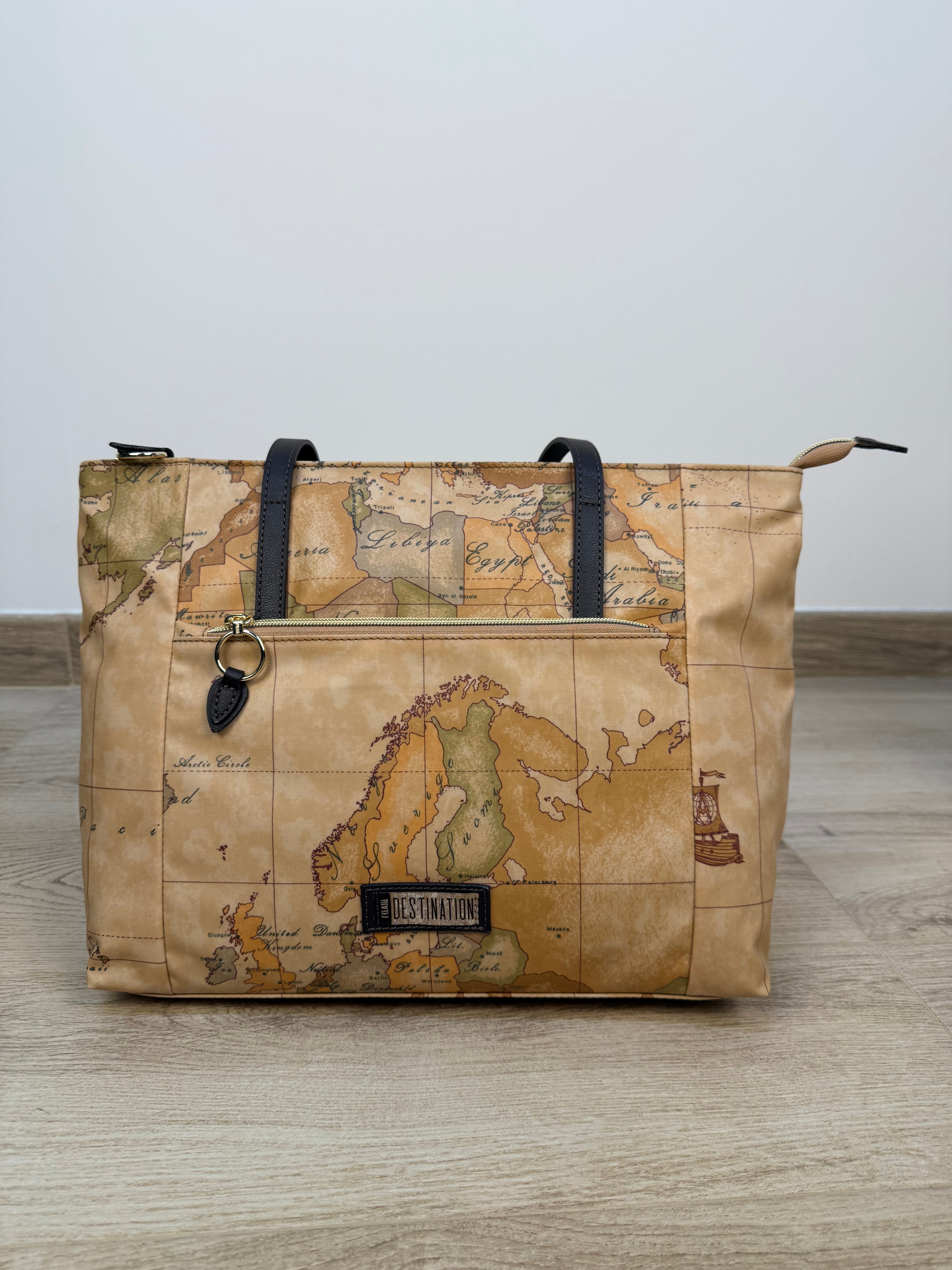 Spaziosa e versatile, questa borsa shopping in tessuto Soft Geo della linea Destination di Alviero Martini unisce eleganza e funzionalità. Dotata di una tasca esterna con chiusura a zip, offre facile accesso agli oggetti essenziali. All’interno dello scomparto principale, sono presenti due tasche aperte e una tasca con zip per una perfetta organizzazione. Completa il design la pratica tracolla regolabile in similpelle color cioccolato, affiancata da due manici resistenti per un comodo trasporto a mano o a spalla. La patch ricamata su similpelle sulla parte frontale e la metalleria logata in finitura oro aggiungono un tocco di raffinatezza e stile.