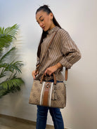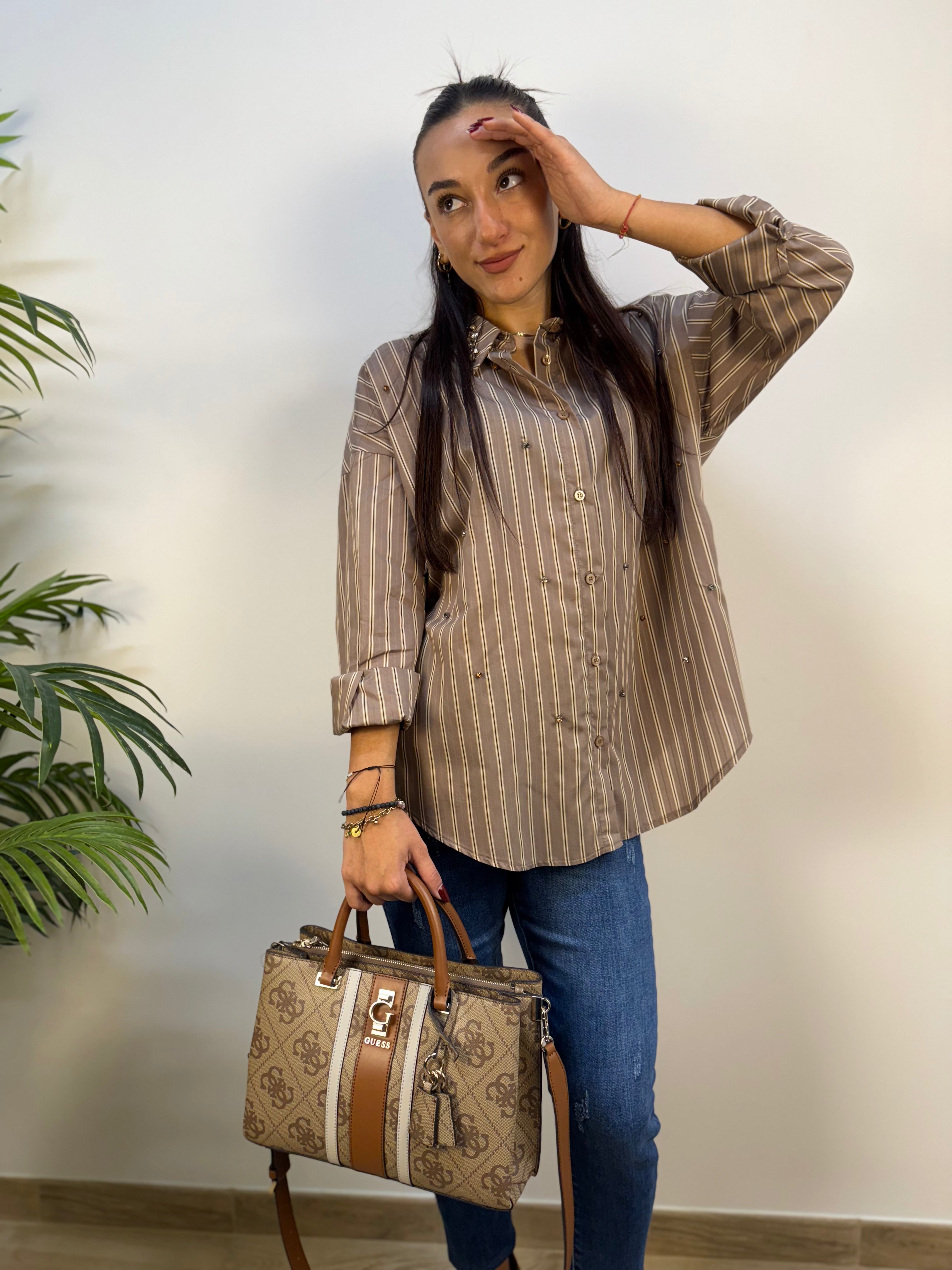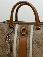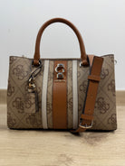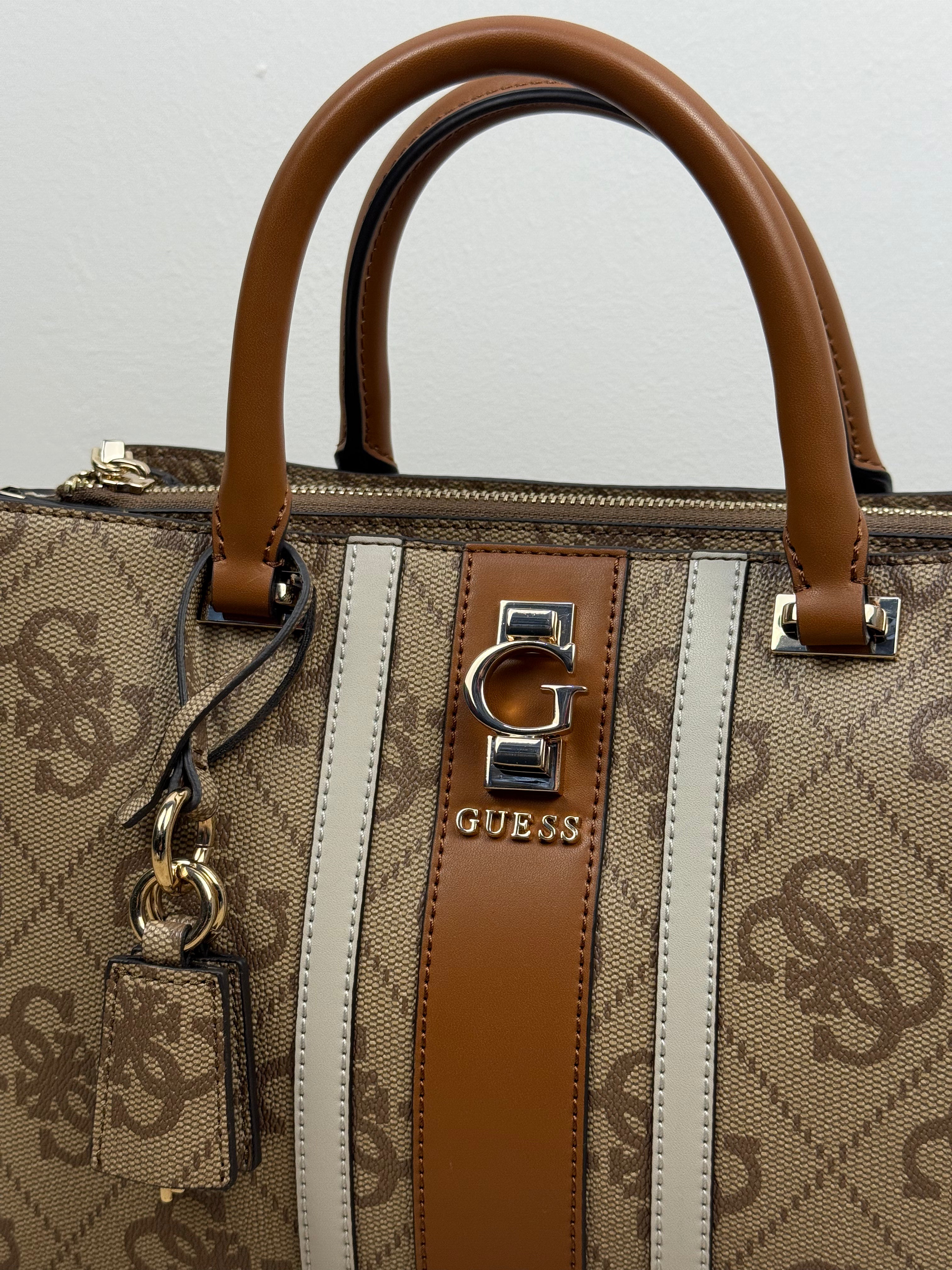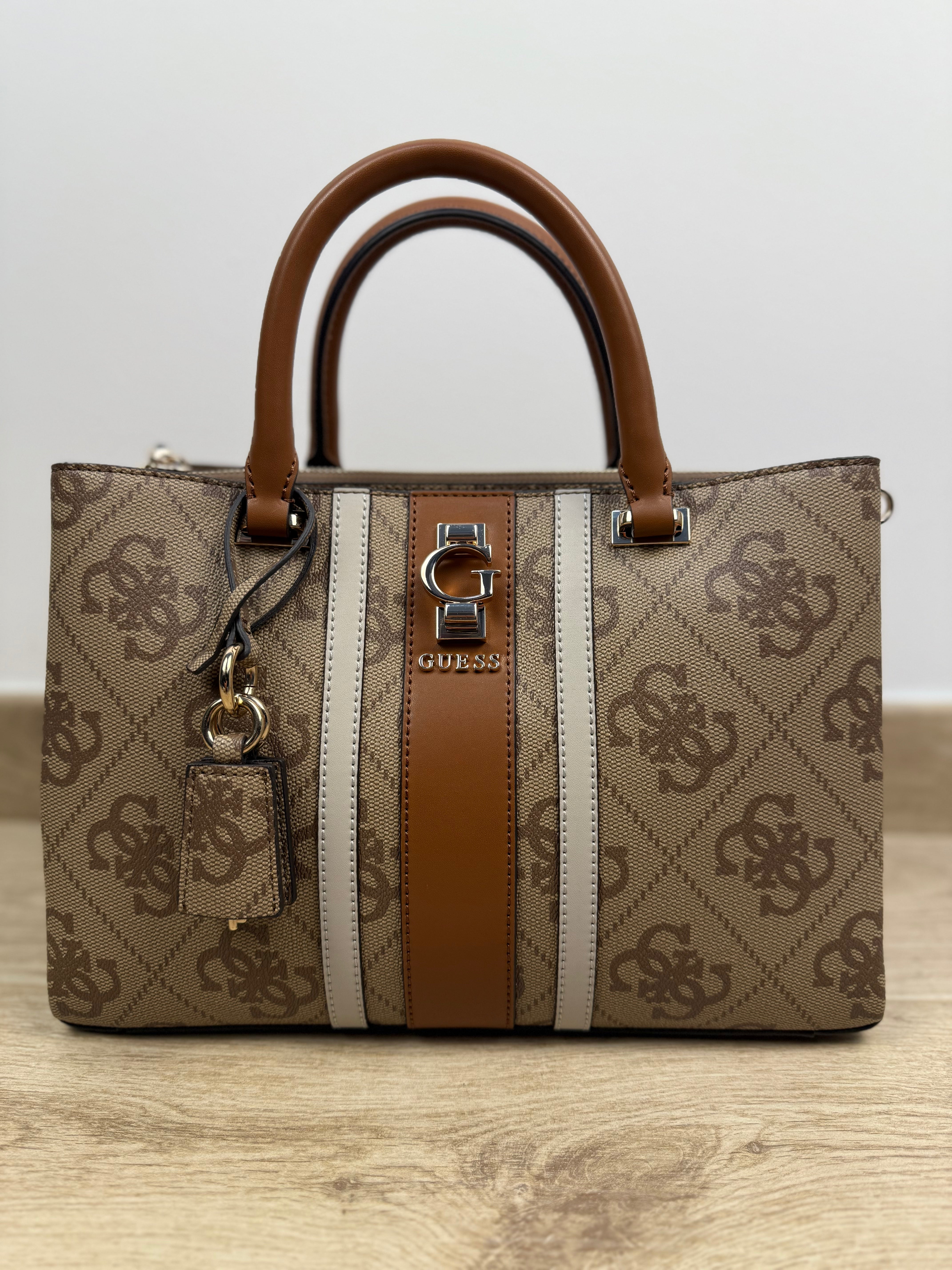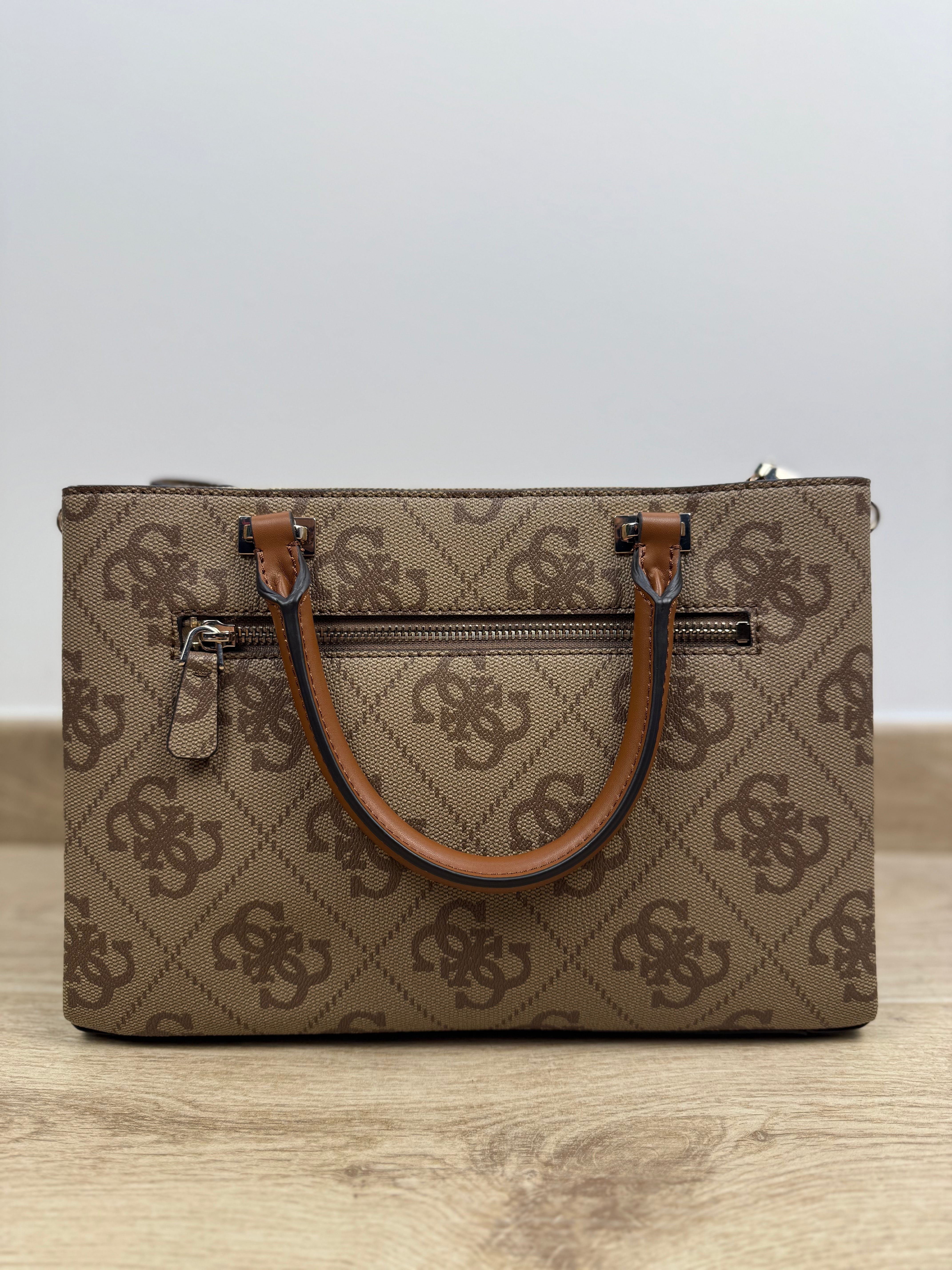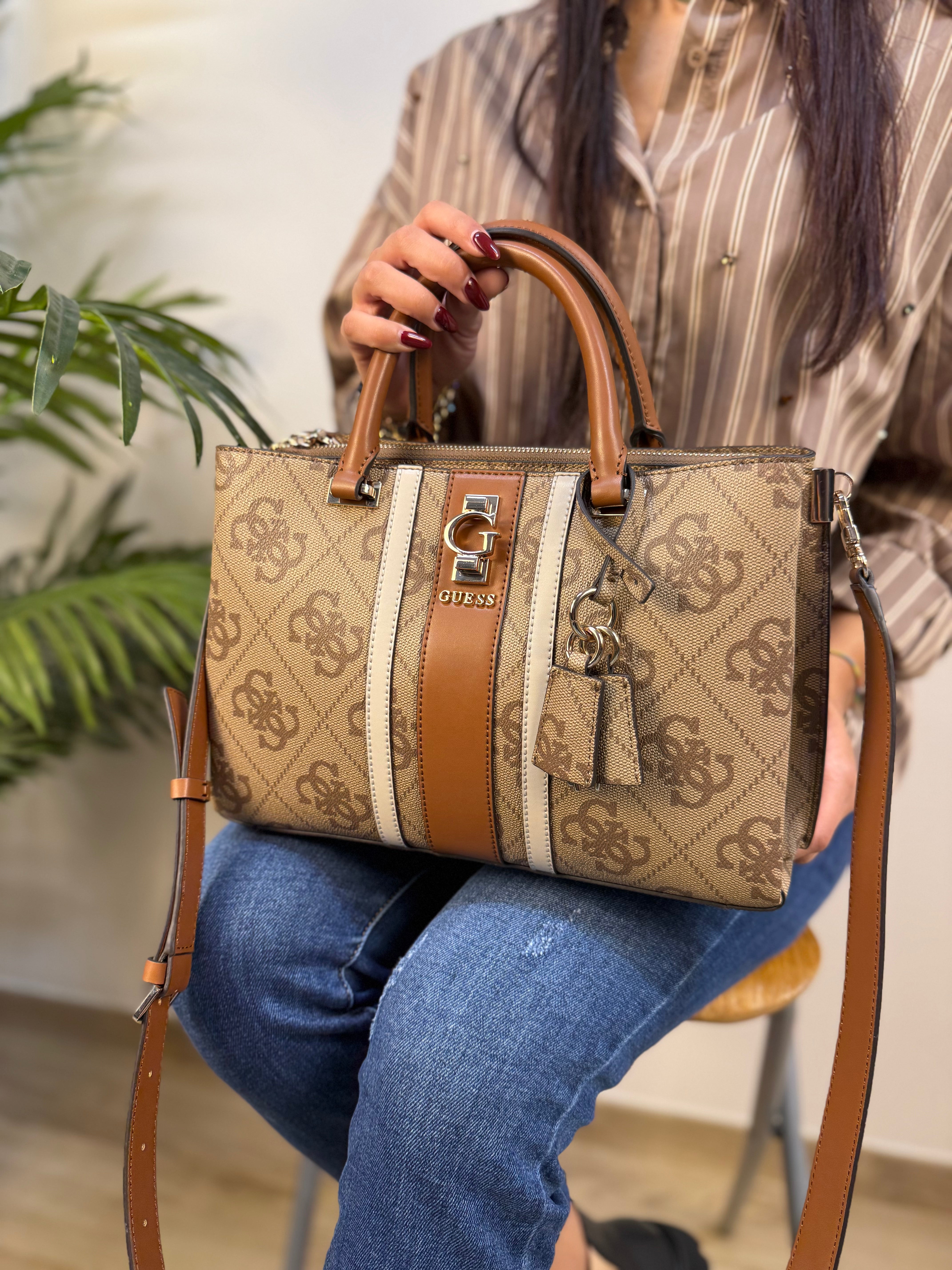 Borsa Guess di taglia media realizzata in similpelle con trama logata 4G a contrasto e dettagli in similpelle liscia color cognac. Presenta manici rigidi tono su tono e tracolla regolabile e removibile nello stesso colore per la massima versatilità. I dettagli metallici color oro e il logo frontale in rilievo metallico dorato completano il design con un tocco elegante. L’interno è organizzato con chiusura a bottone magnetico, due sezioni laterali con due tasche aperte e una con zip, e una sezione centrale con chiusura a zip. Sul retro è presente una tasca con zip pratica e funzionale. Un modello elegante e versatile, perfetto per l’uso quotidiano e per completare ogni outfit con stile.