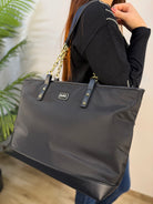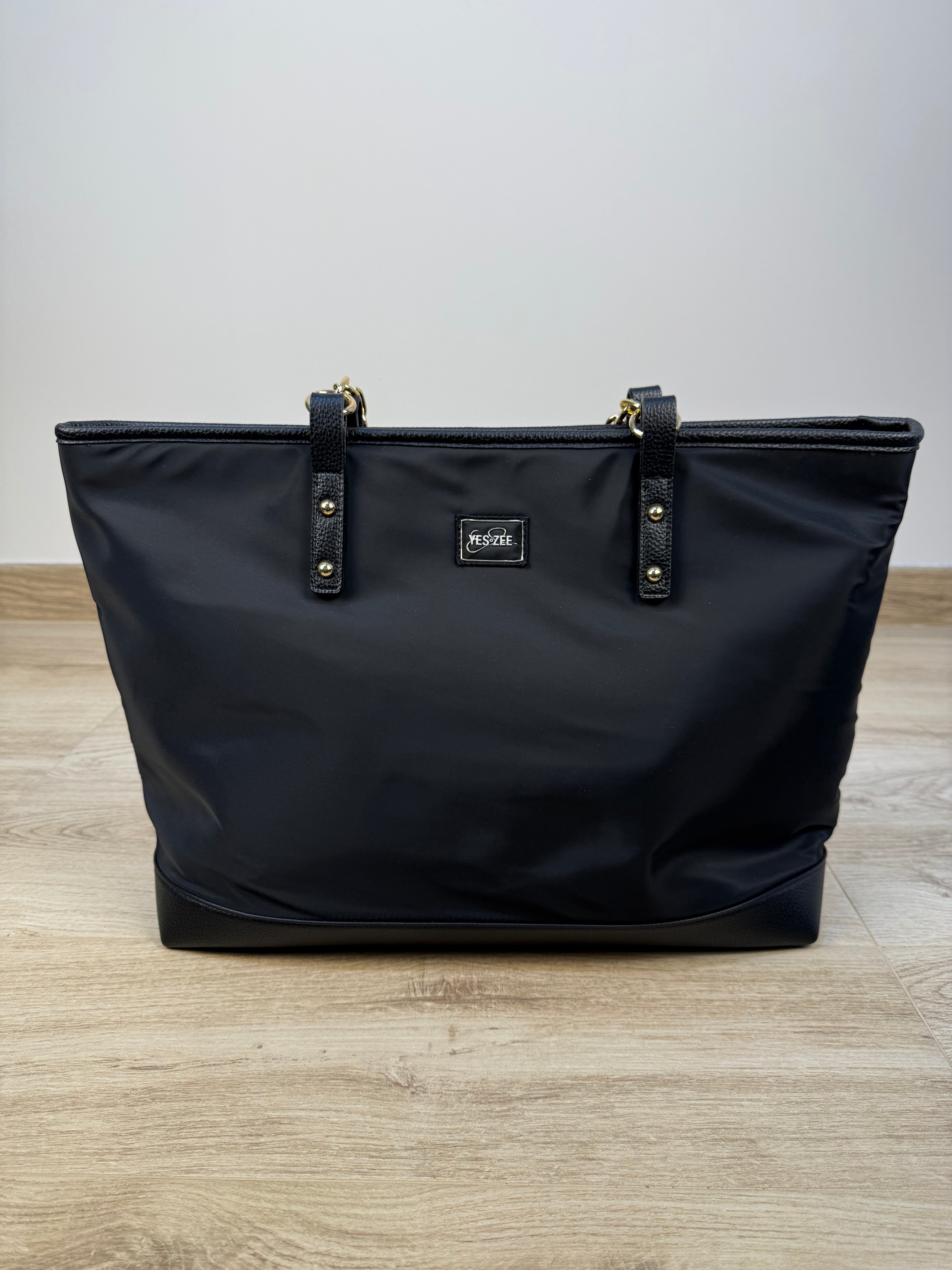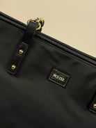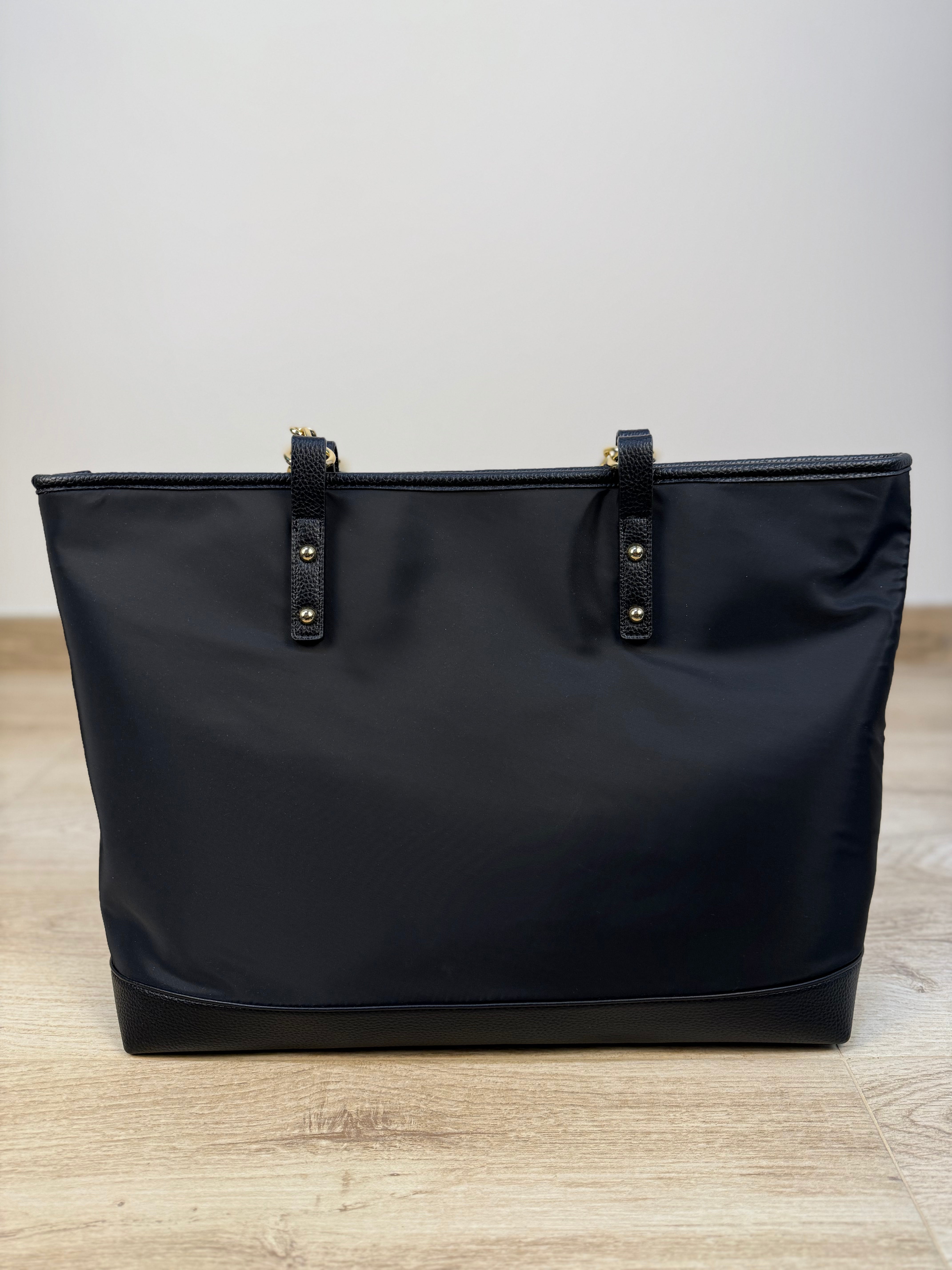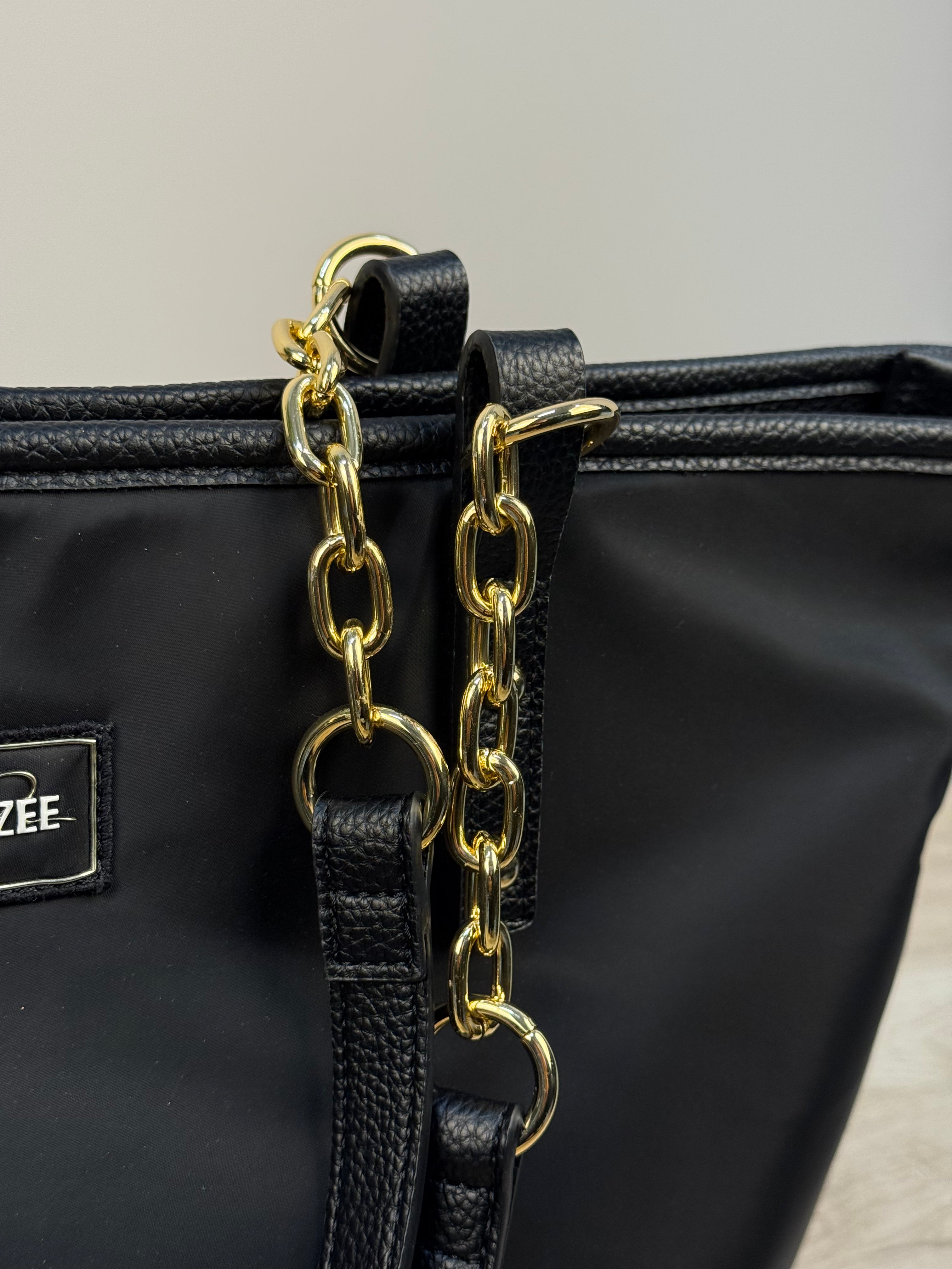 Borsa shopper Yes-Zee realizzata in tessuto tecnico, impreziosita da inserti in similpelle pitonata sul fondo e nei manici con catena dorata, che riprende i dettagli metallici della zip donando al capo un tocco di luce e raffinatezza. Sul fronte è presente una piccola patch logata, discreta ma distintiva. La borsa presenta una sezione interna unica con chiusura a zip per una maggiore praticità. All’interno si trovano una tasca con chiusura a zip, una tasca aperta e una patch logata in similpelle, per una cura dei dettagli impeccabile. Un accessorio sofisticato e funzionale, ideale per completare i look quotidiani con eleganza e stile contemporaneo.