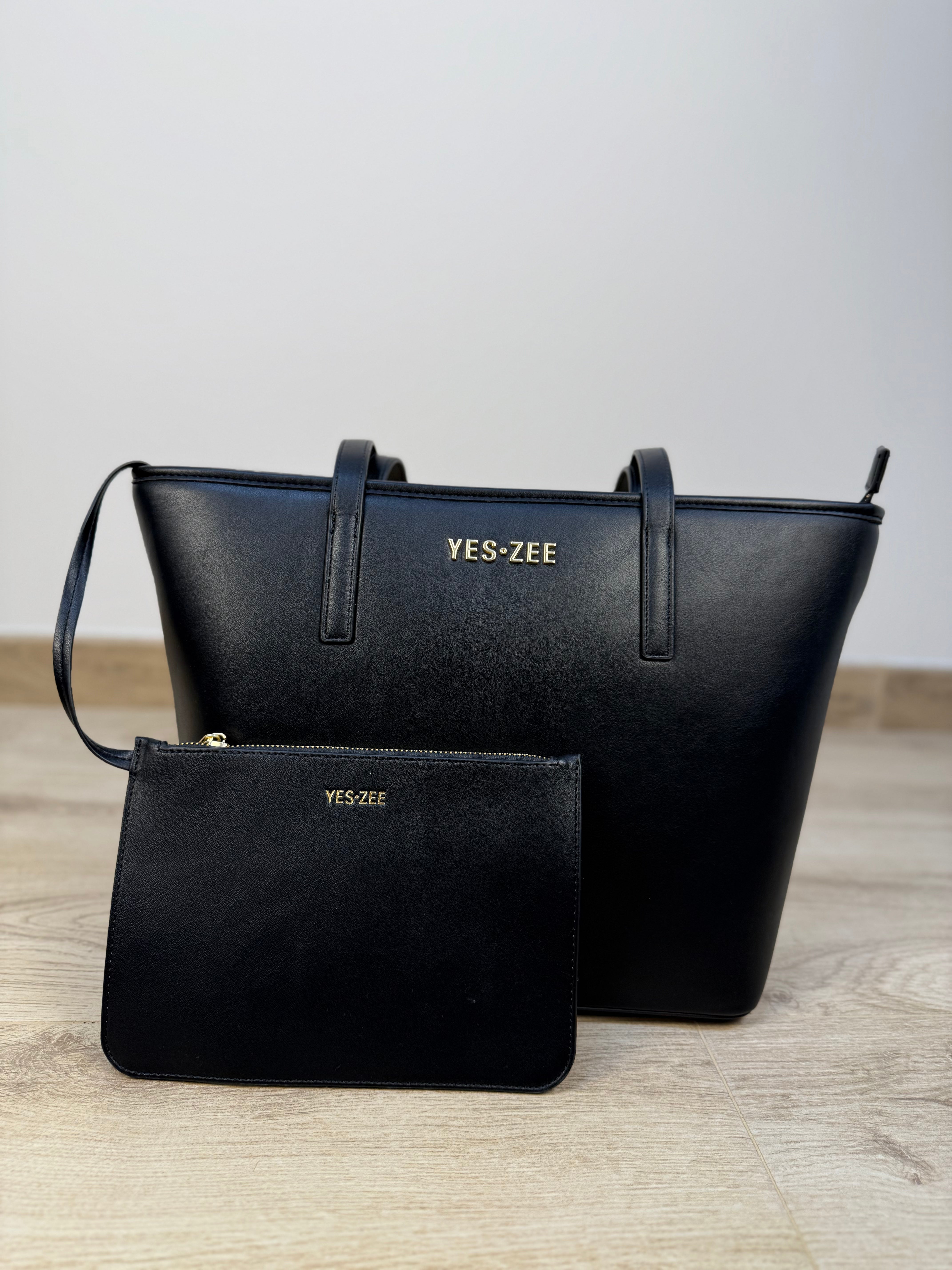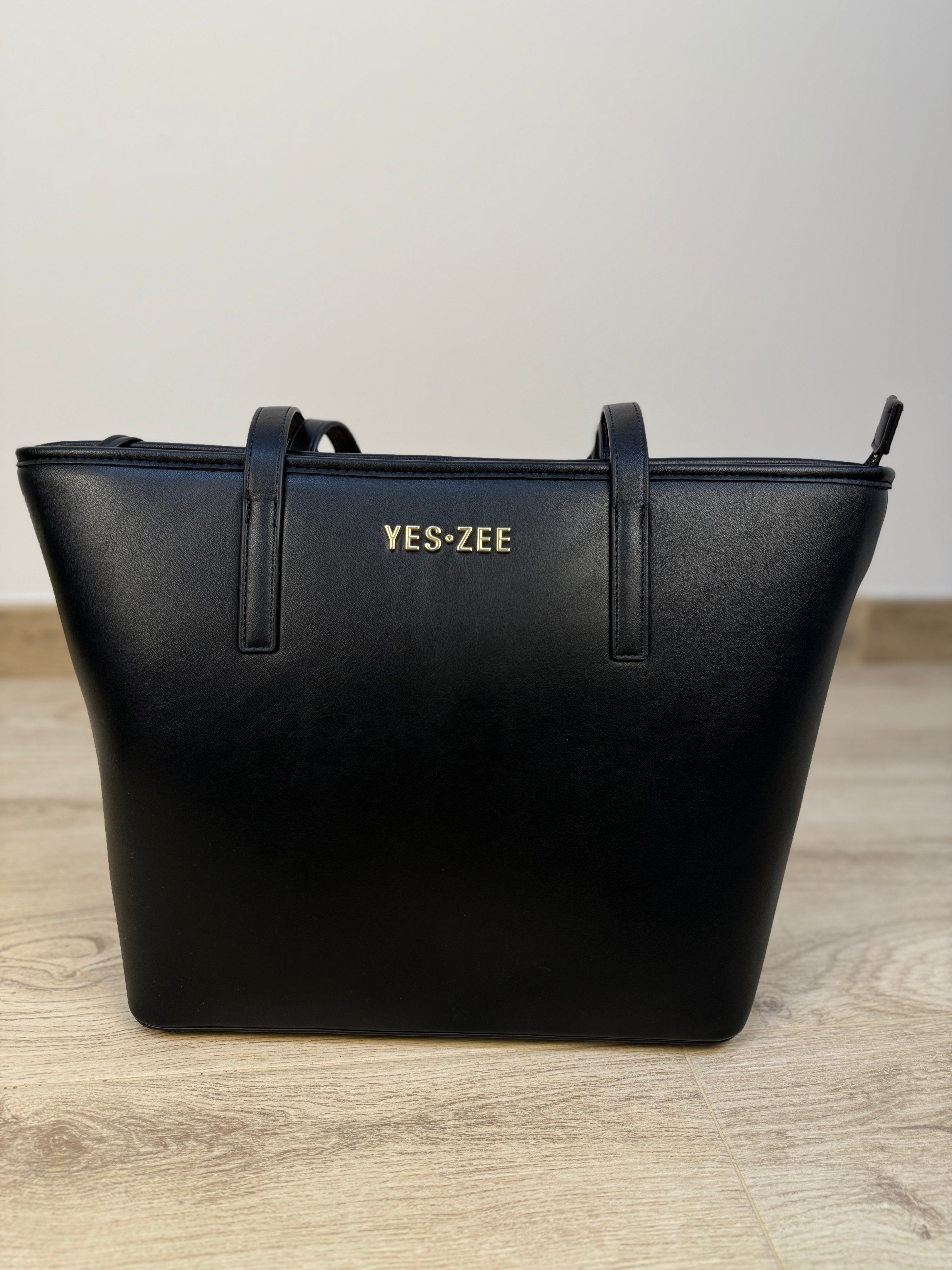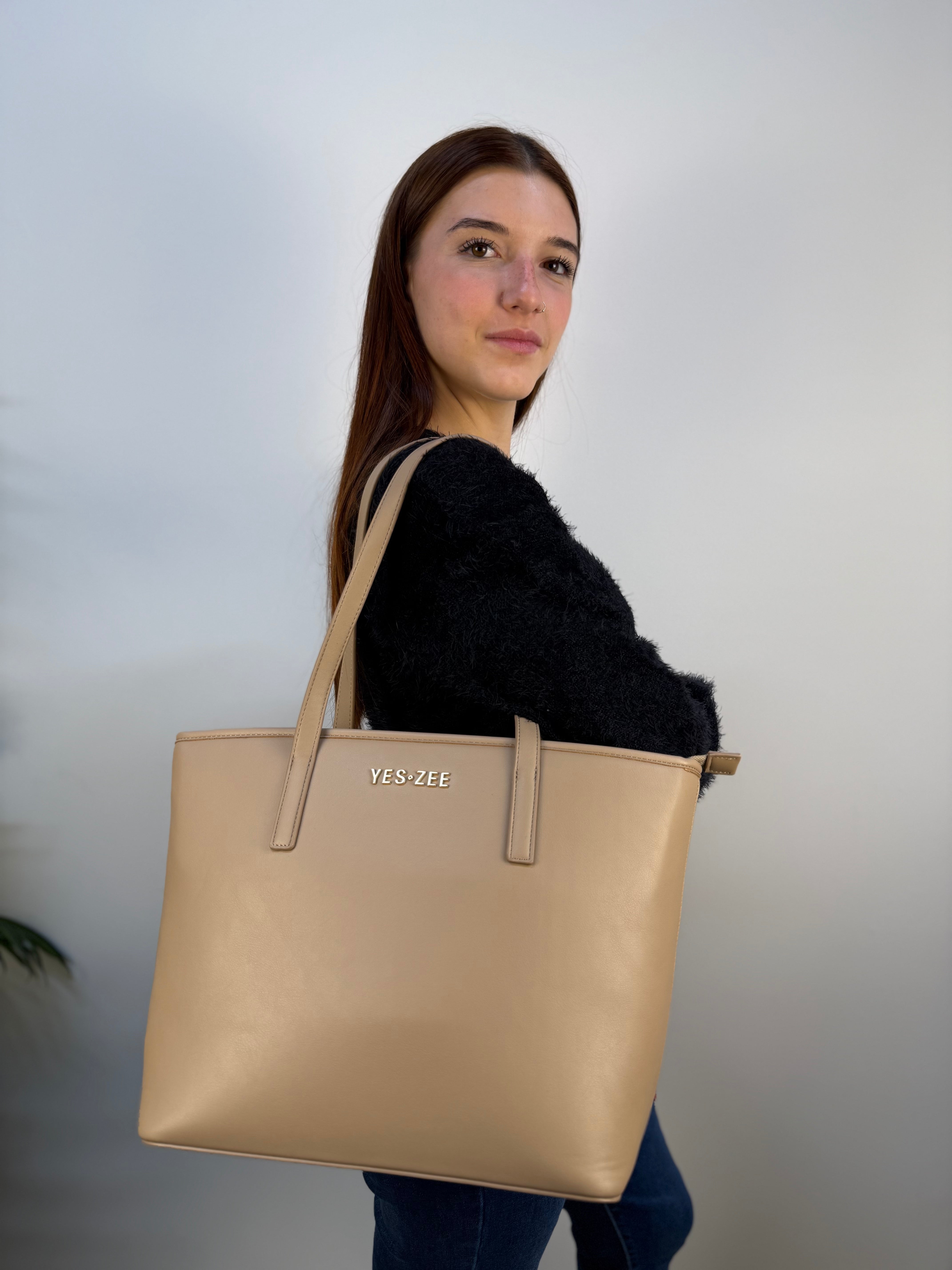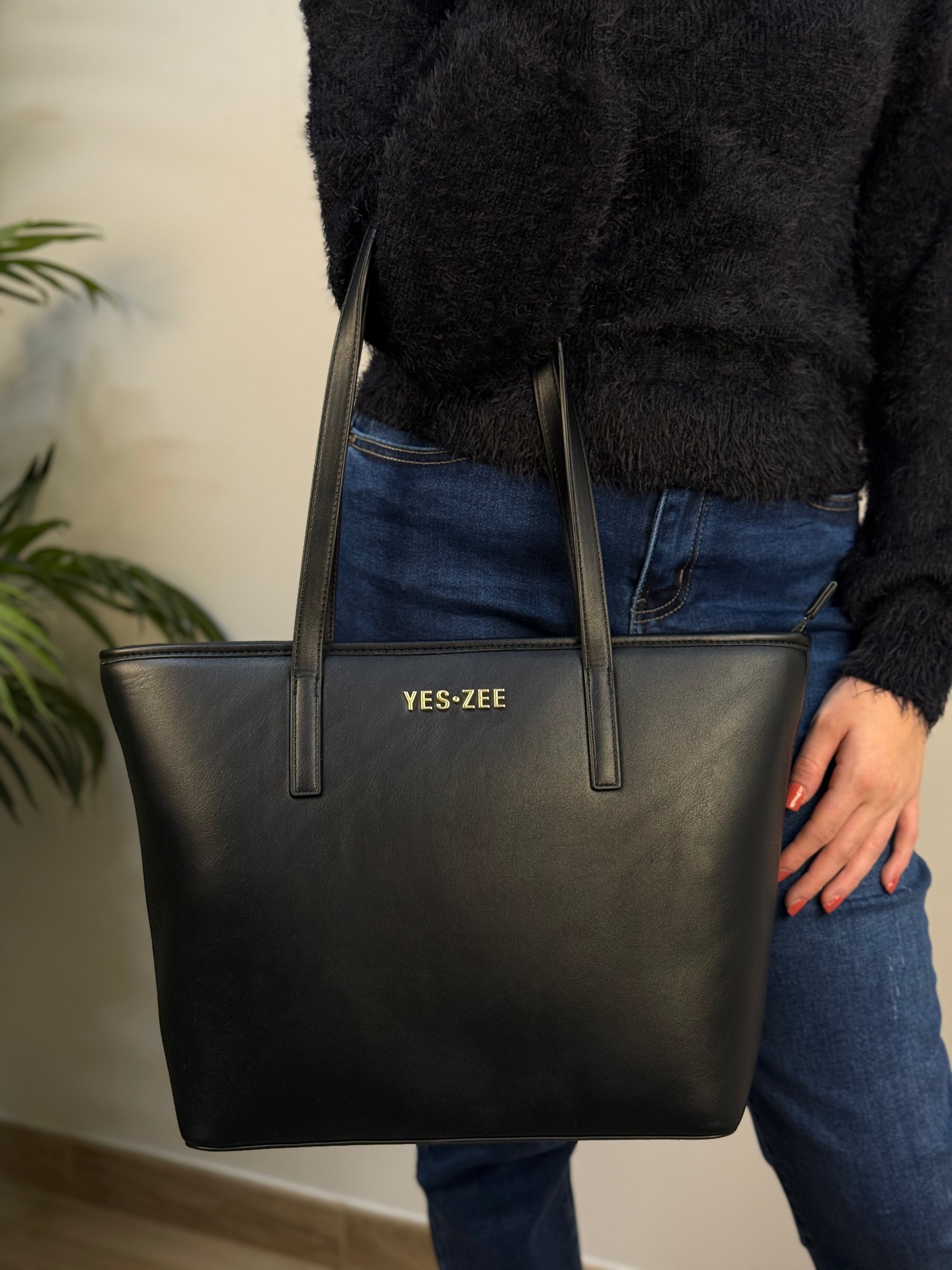 Borsa shopper Yes-Zee realizzata in similpelle liscia tinta unita, dal design pulito e sofisticato. Sul fronte spicca un logo metallico in rilievo dorato, mentre i manici tono su tono completano il look con eleganza. La chiusura principale è dotata di zip, che custodisce un interno foderato con trama logata, organizzato in un unico scomparto con una tasca con zip, una tasca aperta e una patch logata in similpelle. Abbinata alla shopper, una pochette removibile tono su tono, agganciata tramite piccolo moschettone dorato. La pochette, con logo laserato oro sul fronte, è pratica e raffinata, ideale anche da portare separatamente grazie alla chiusura con zip. Un set versatile ed elegante, perfetto per completare i look quotidiani con stile e funzionalità.