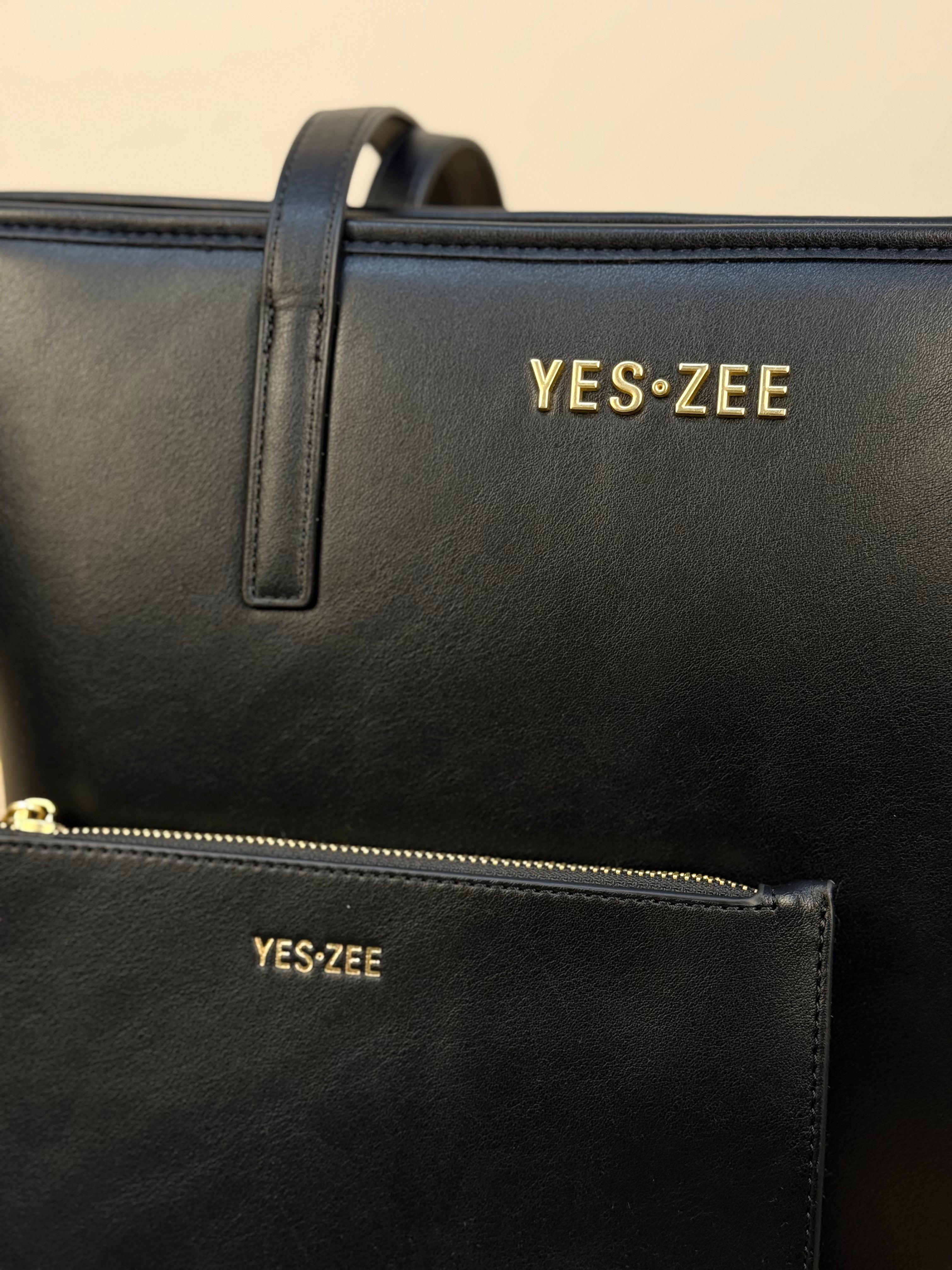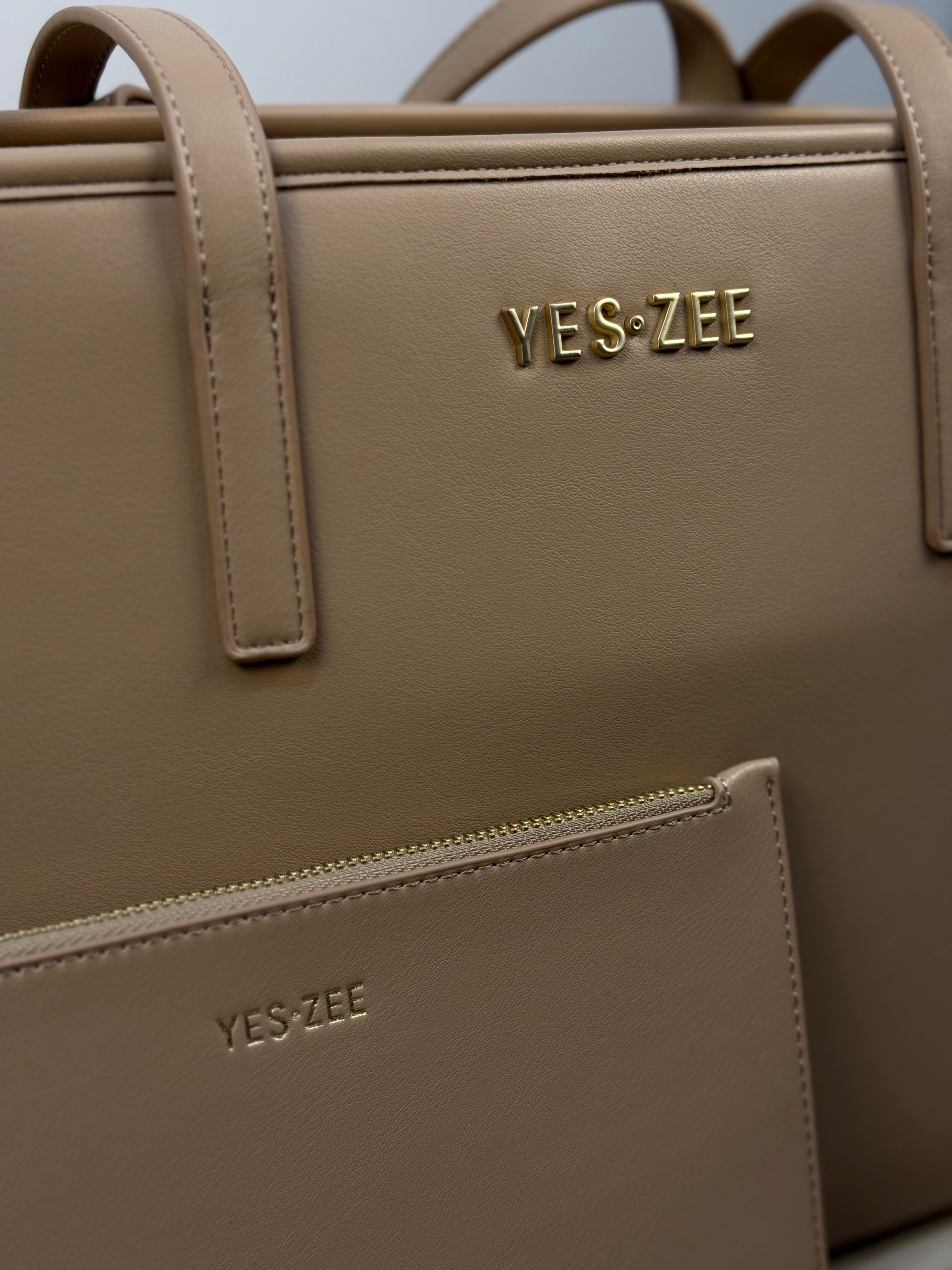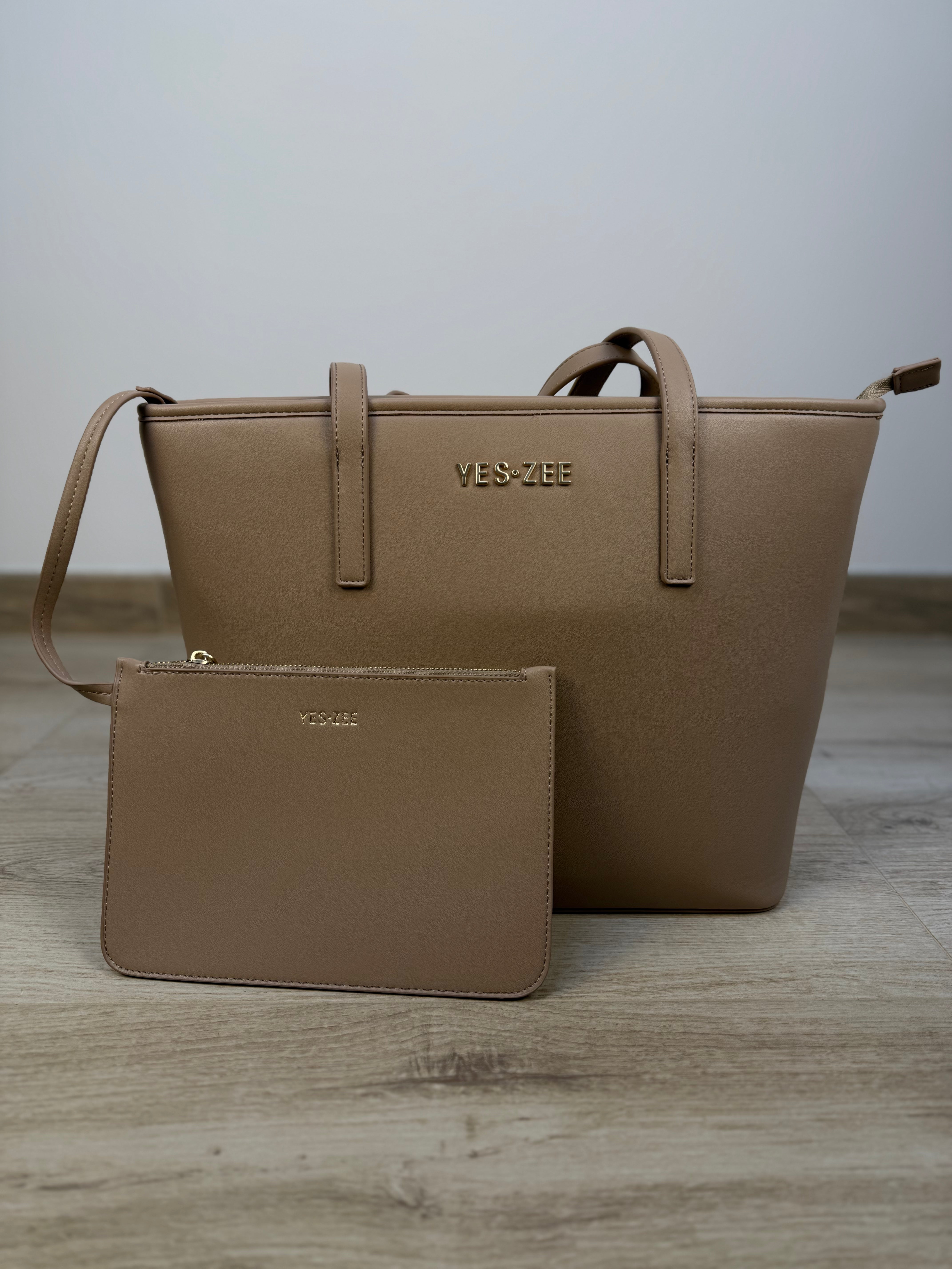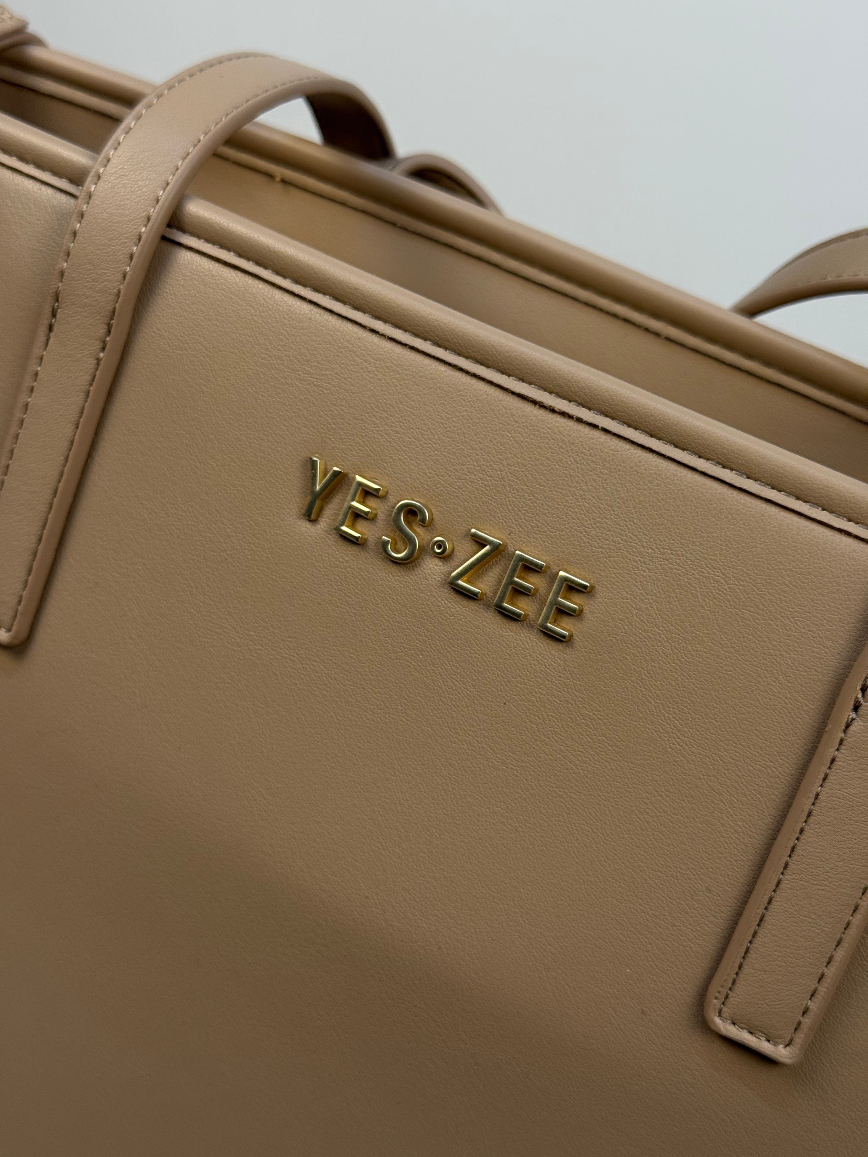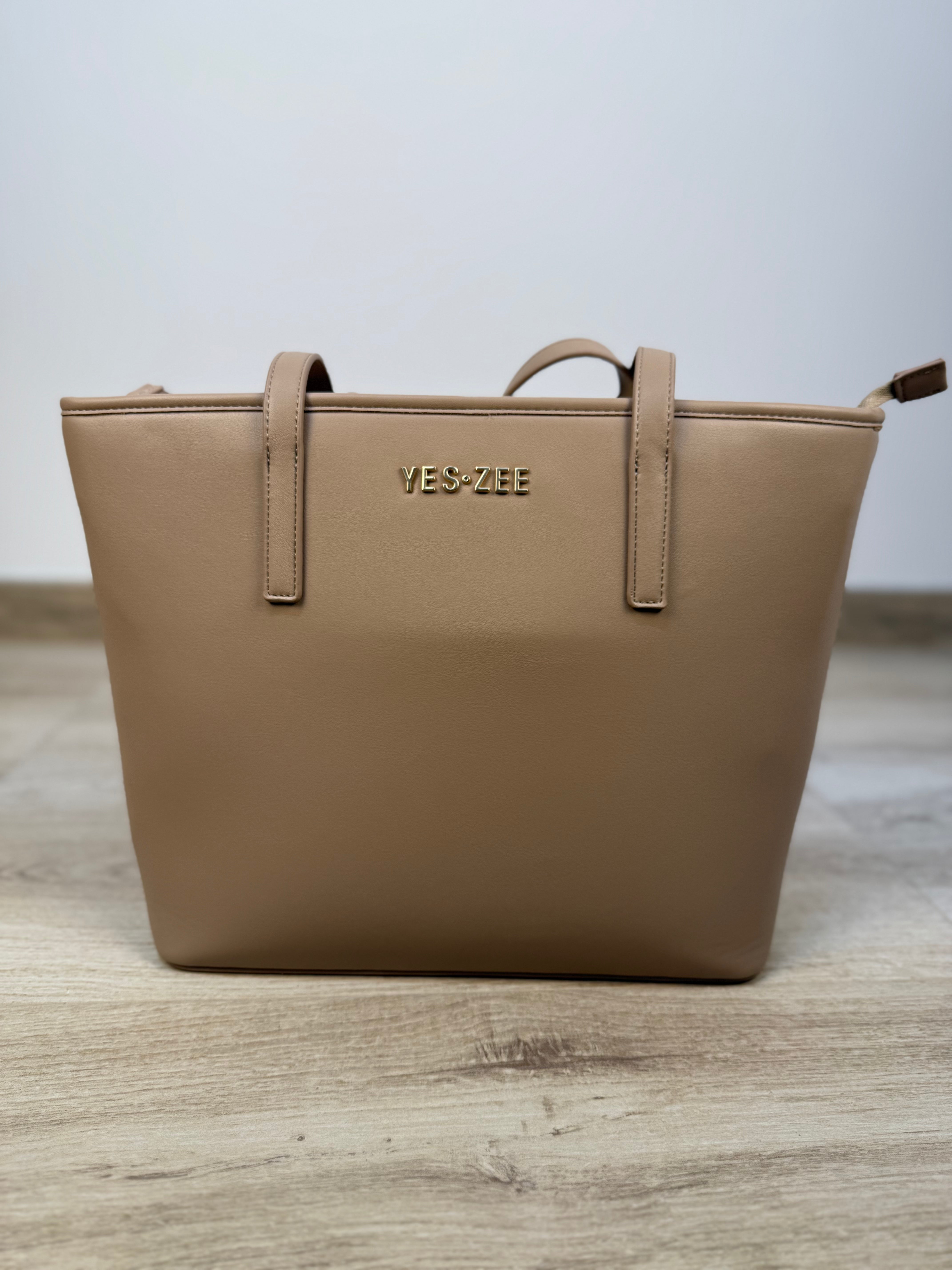 Borsa shopper Yes-Zee realizzata in similpelle liscia tinta unita, dal design pulito e sofisticato. Sul fronte spicca un logo metallico in rilievo dorato, mentre i manici tono su tono completano il look con eleganza. La chiusura principale è dotata di zip, che custodisce un interno foderato con trama logata, organizzato in un unico scomparto con una tasca con zip, una tasca aperta e una patch logata in similpelle. Abbinata alla shopper, una pochette removibile tono su tono, agganciata tramite piccolo moschettone dorato. La pochette, con logo laserato oro sul fronte, è pratica e raffinata, ideale anche da portare separatamente grazie alla chiusura con zip. Un set versatile ed elegante, perfetto per completare i look quotidiani con stile e funzionalità.