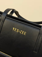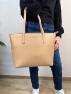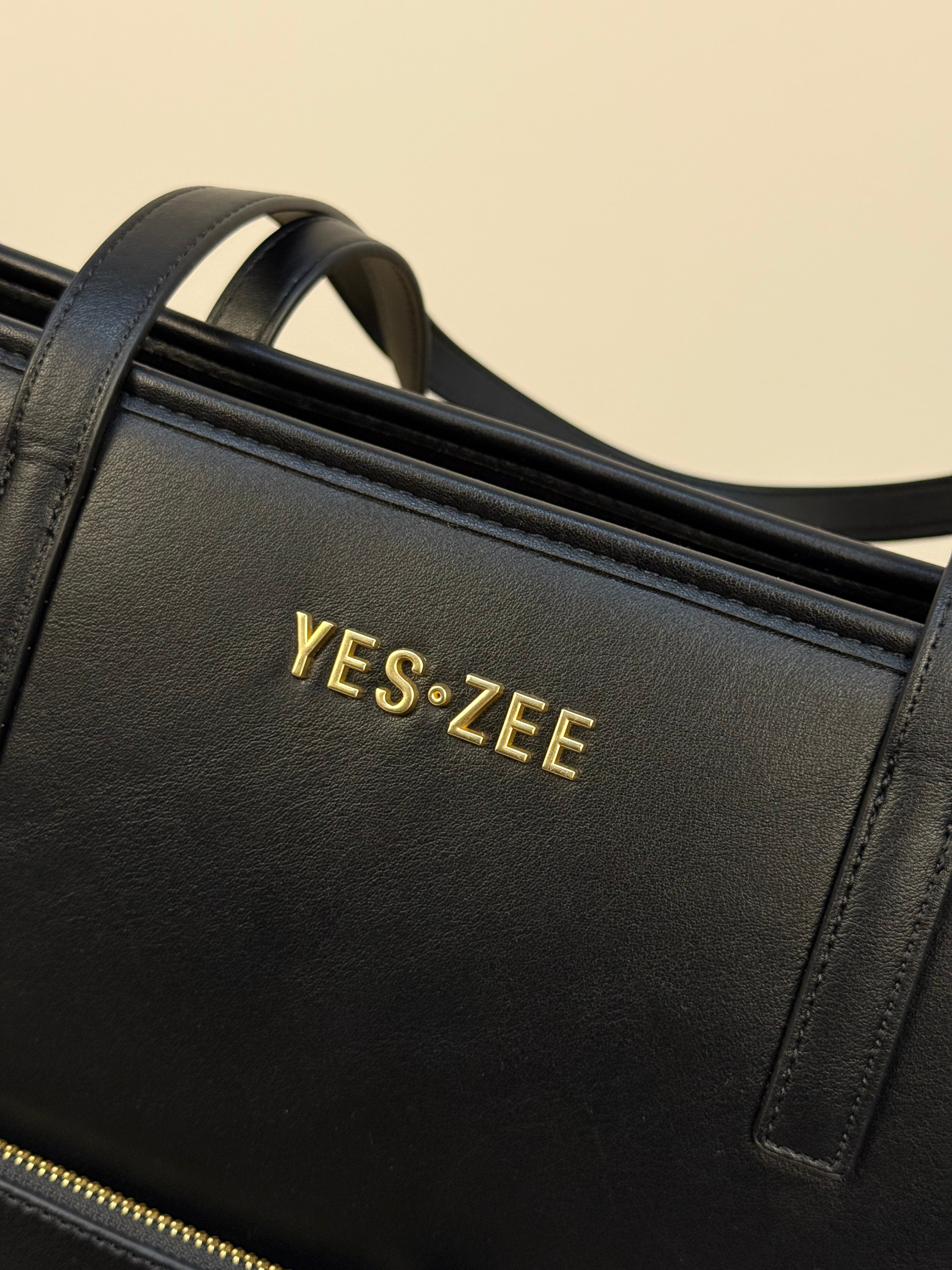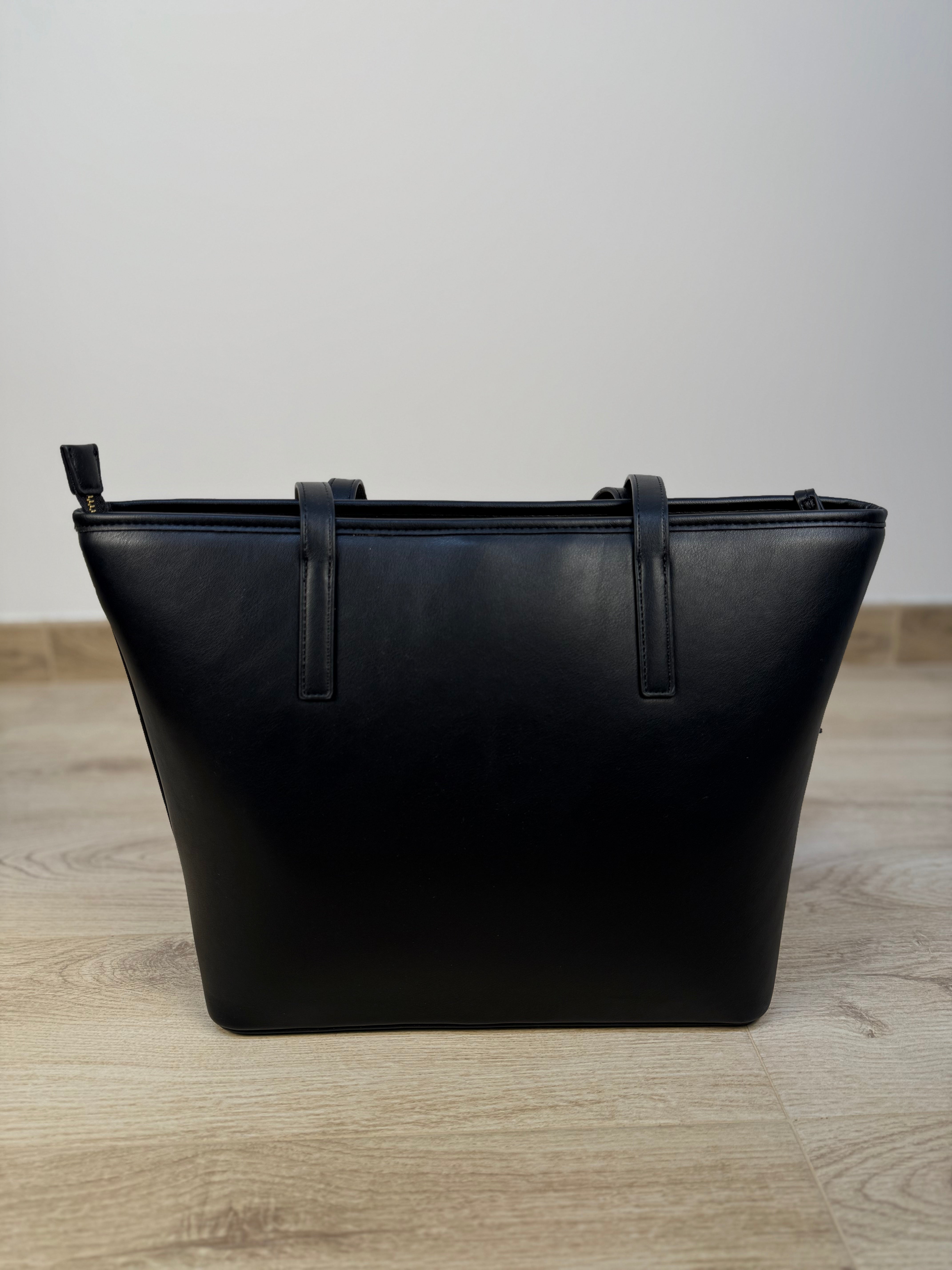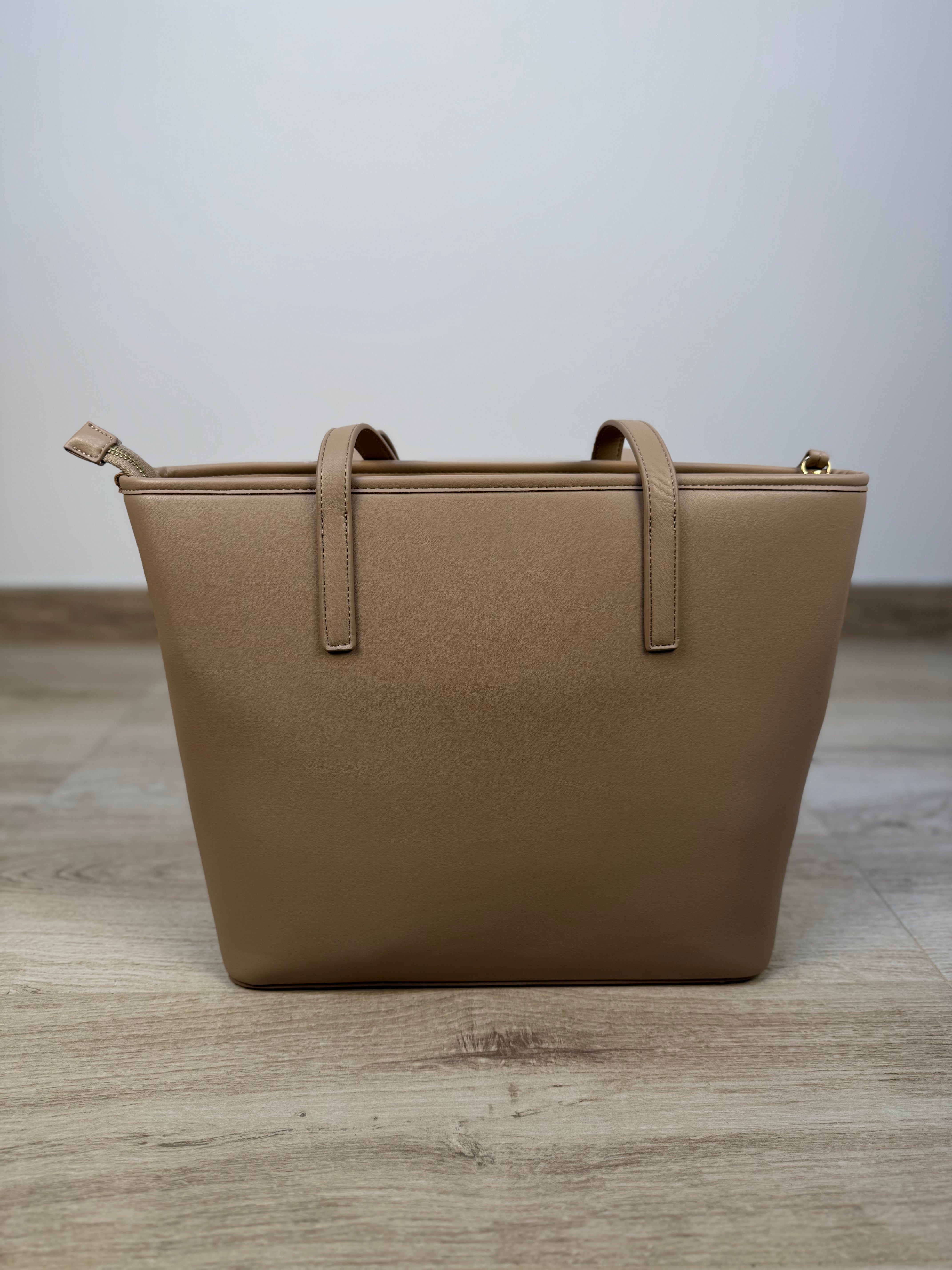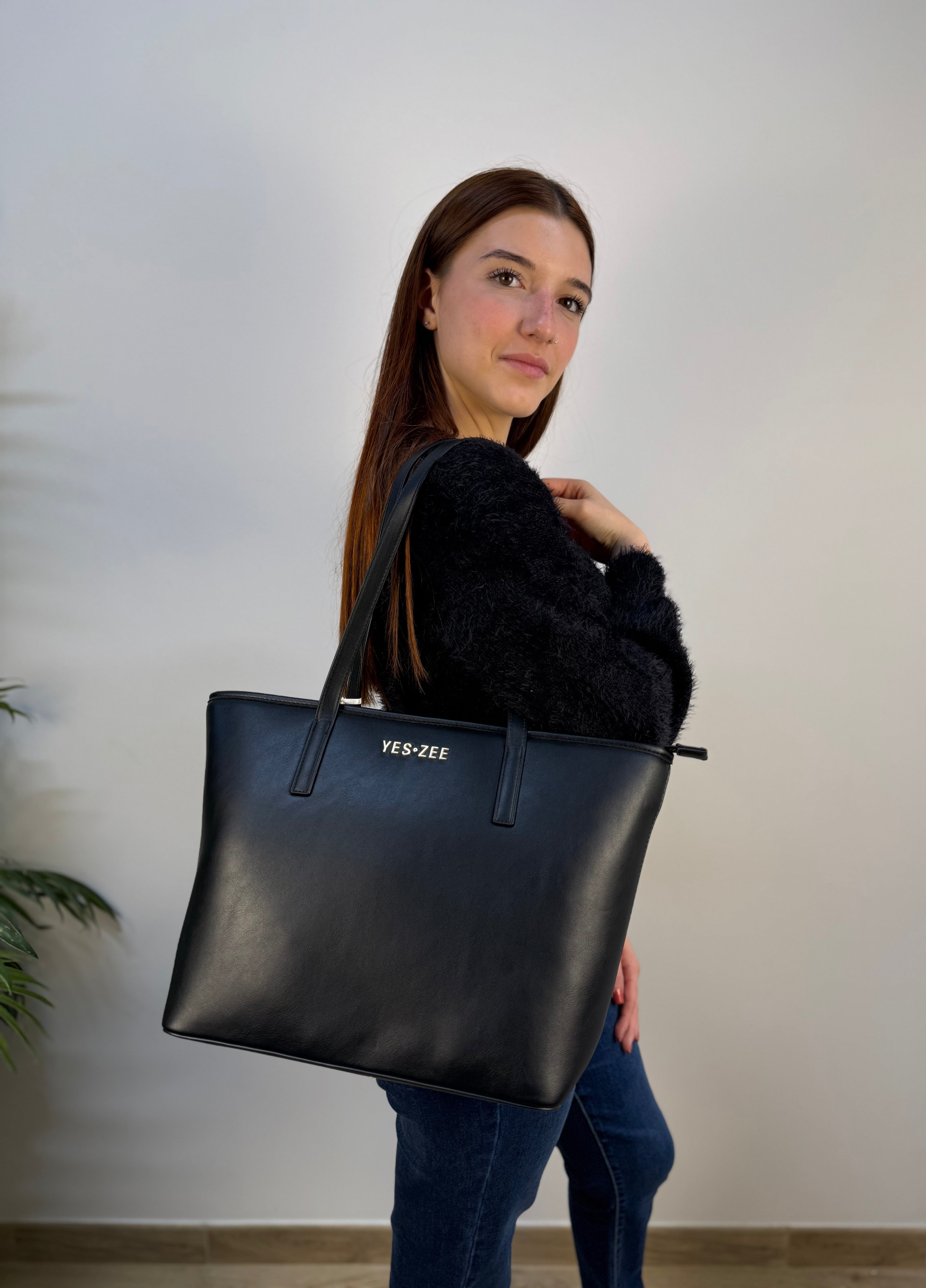 Borsa shopper Yes-Zee realizzata in similpelle liscia tinta unita, dal design pulito e sofisticato. Sul fronte spicca un logo metallico in rilievo dorato, mentre i manici tono su tono completano il look con eleganza. La chiusura principale è dotata di zip, che custodisce un interno foderato con trama logata, organizzato in un unico scomparto con una tasca con zip, una tasca aperta e una patch logata in similpelle. Abbinata alla shopper, una pochette removibile tono su tono, agganciata tramite piccolo moschettone dorato. La pochette, con logo laserato oro sul fronte, è pratica e raffinata, ideale anche da portare separatamente grazie alla chiusura con zip. Un set versatile ed elegante, perfetto per completare i look quotidiani con stile e funzionalità.