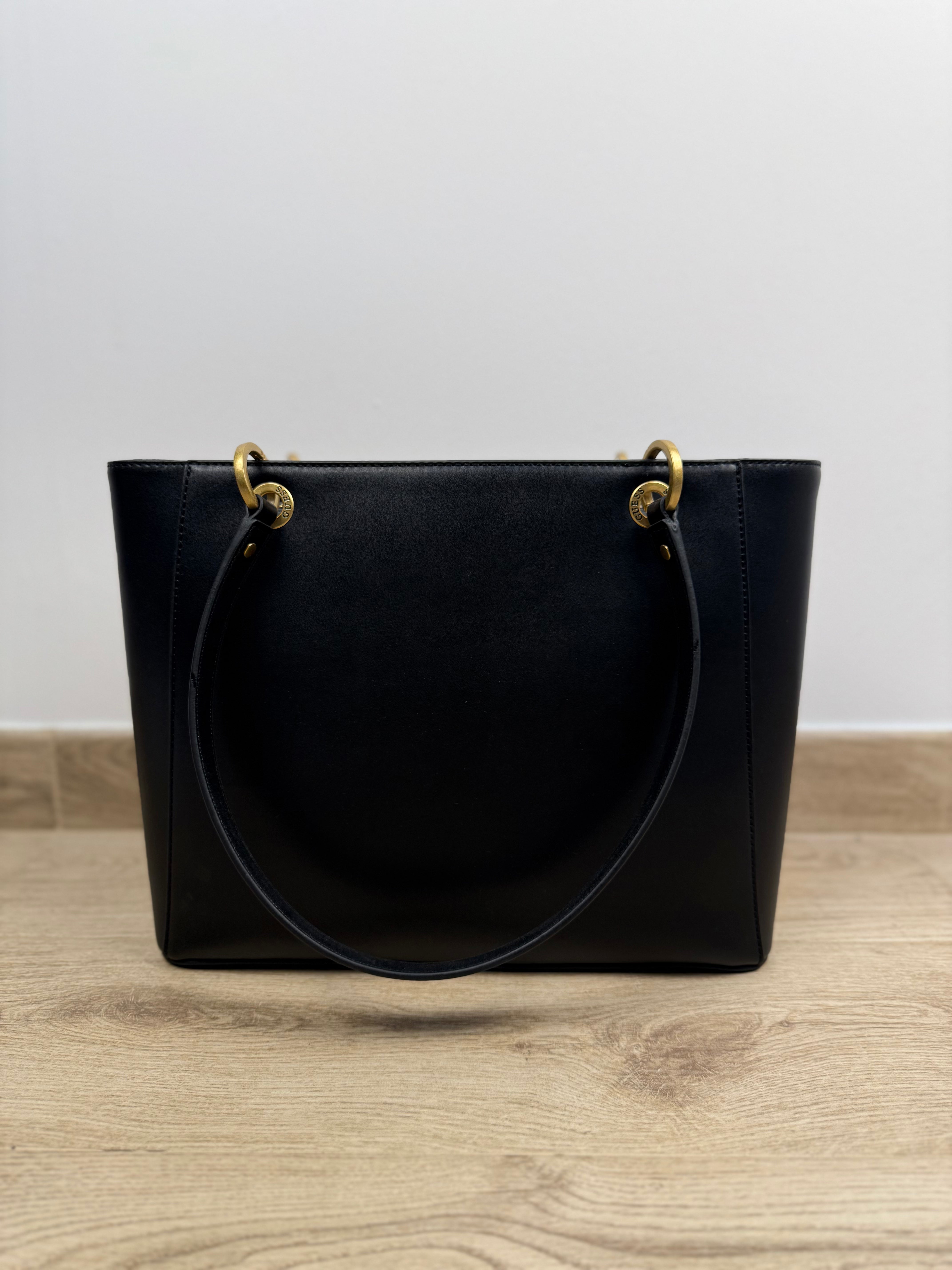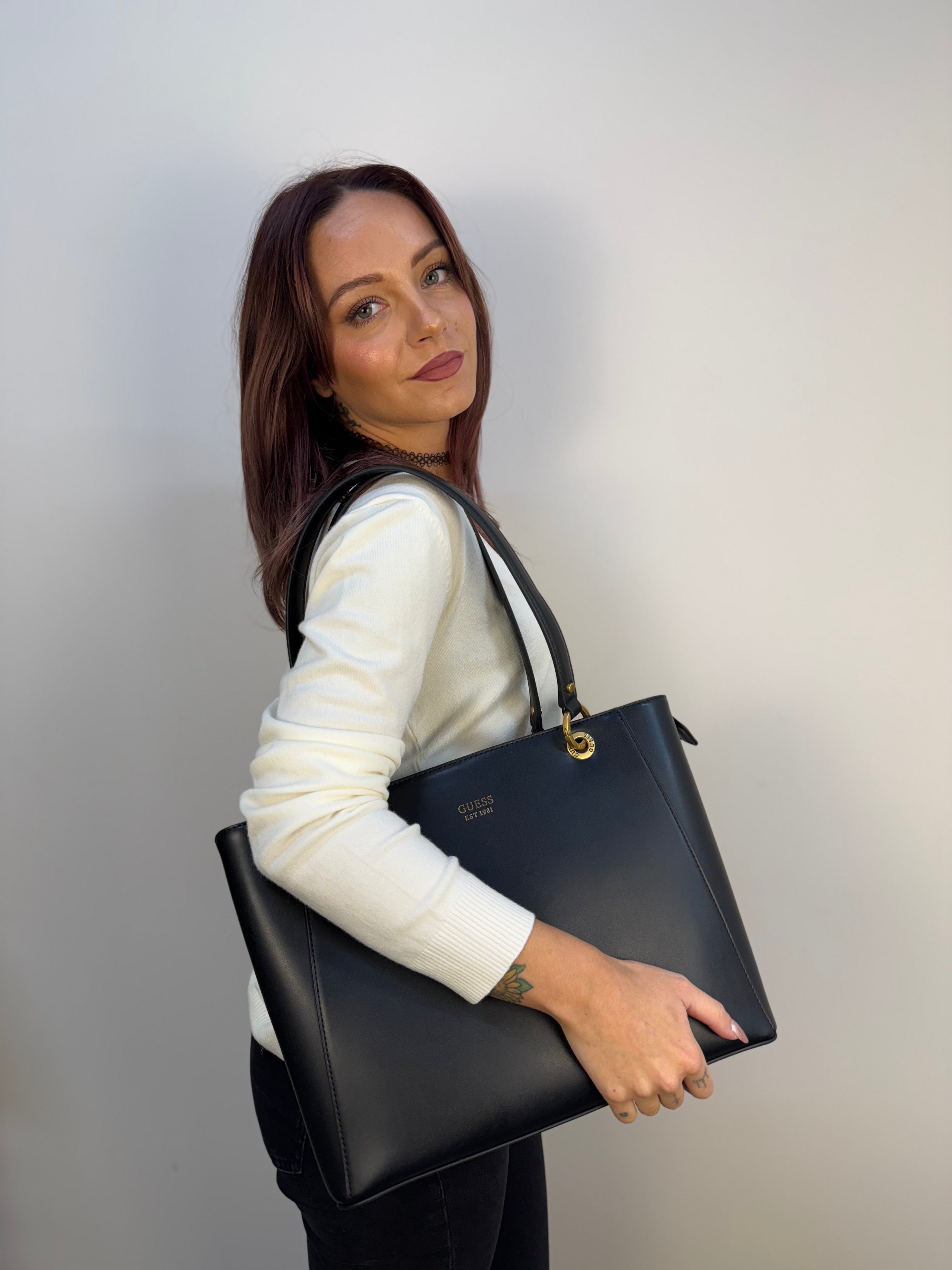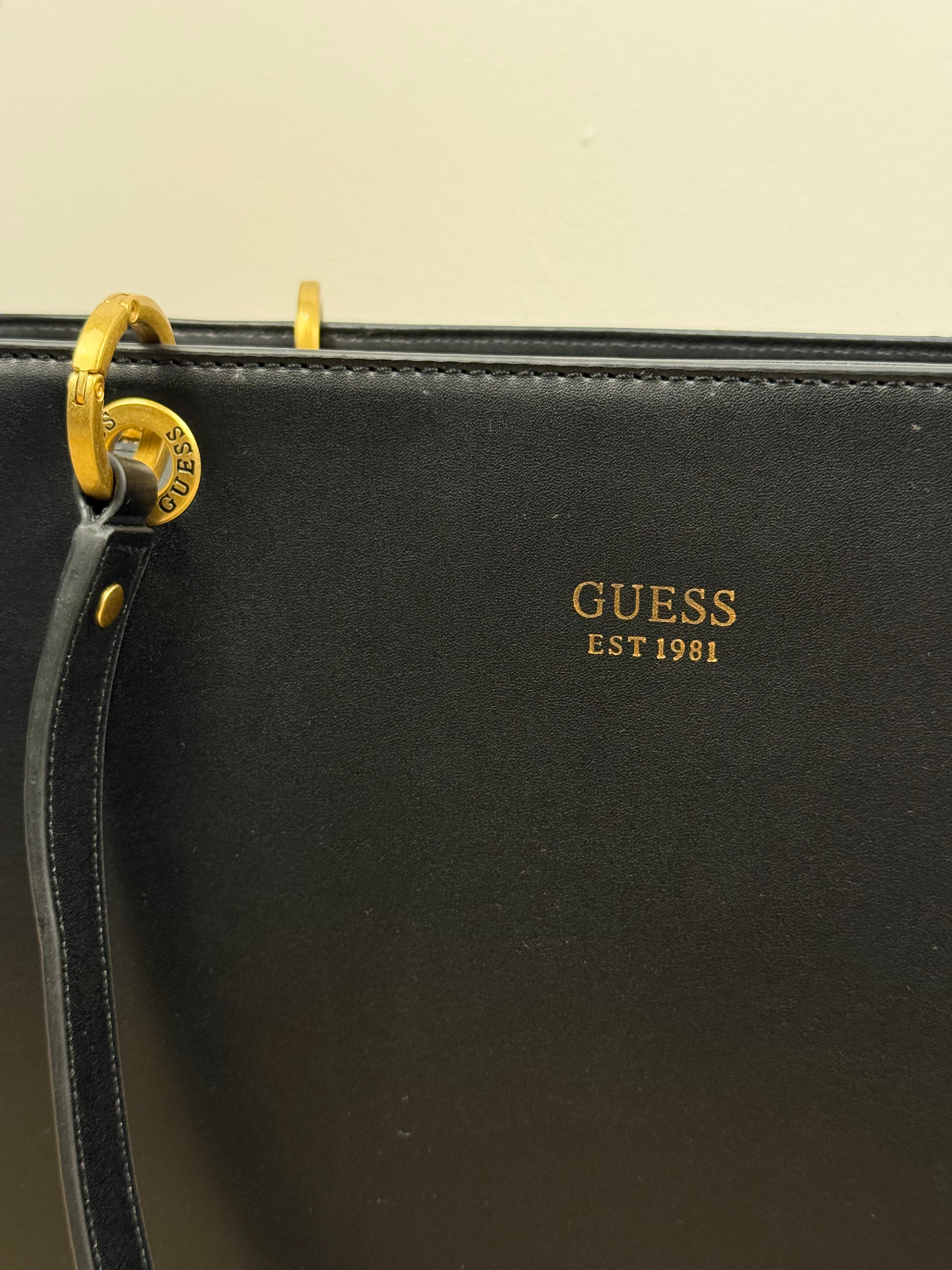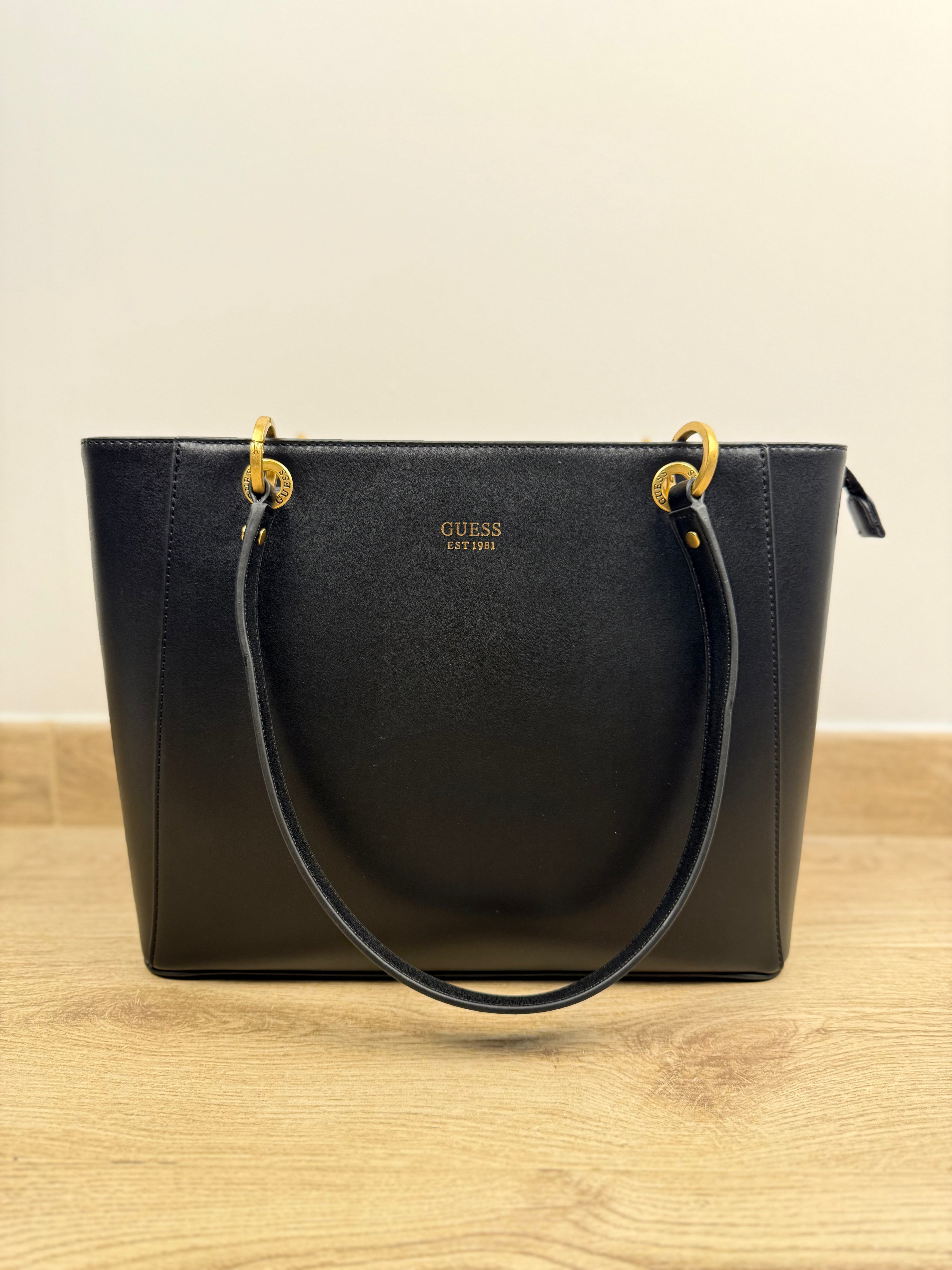 Borsa Guess realizzata in similpelle liscia con stampa logata color oro delicata sul fronte e dettagli metallici dorati. Presenta manici rigidi e chiusura con zip per un utilizzo pratico e sicuro. L’interno, rivestito in similpelle, è organizzato con due tasche aperte, una tasca con zip e un ulteriore scomparto laterale aperto, per mantenere tutto in ordine. Un modello elegante e funzionale, perfetto per completare look quotidiani o più raffinati.
