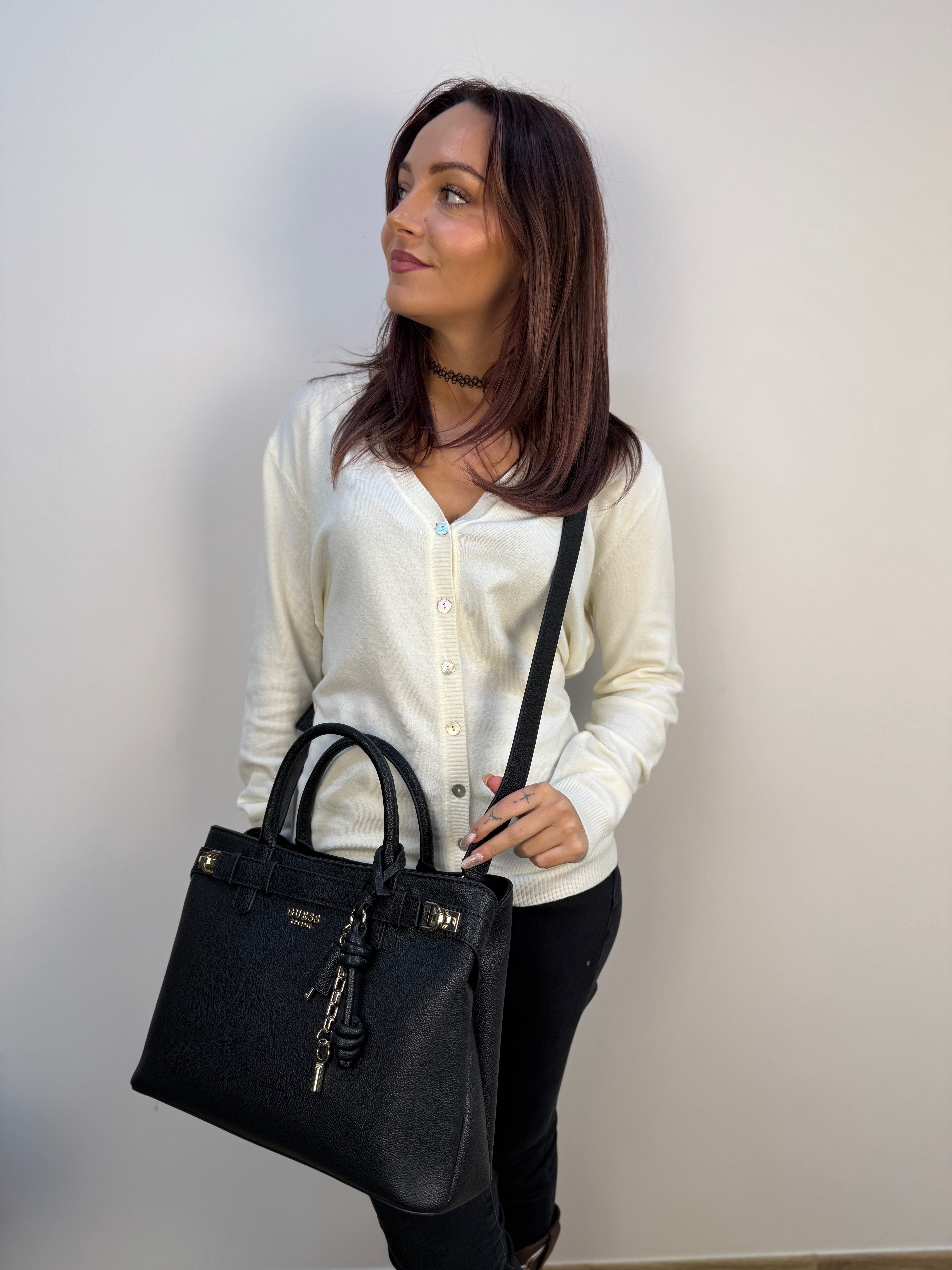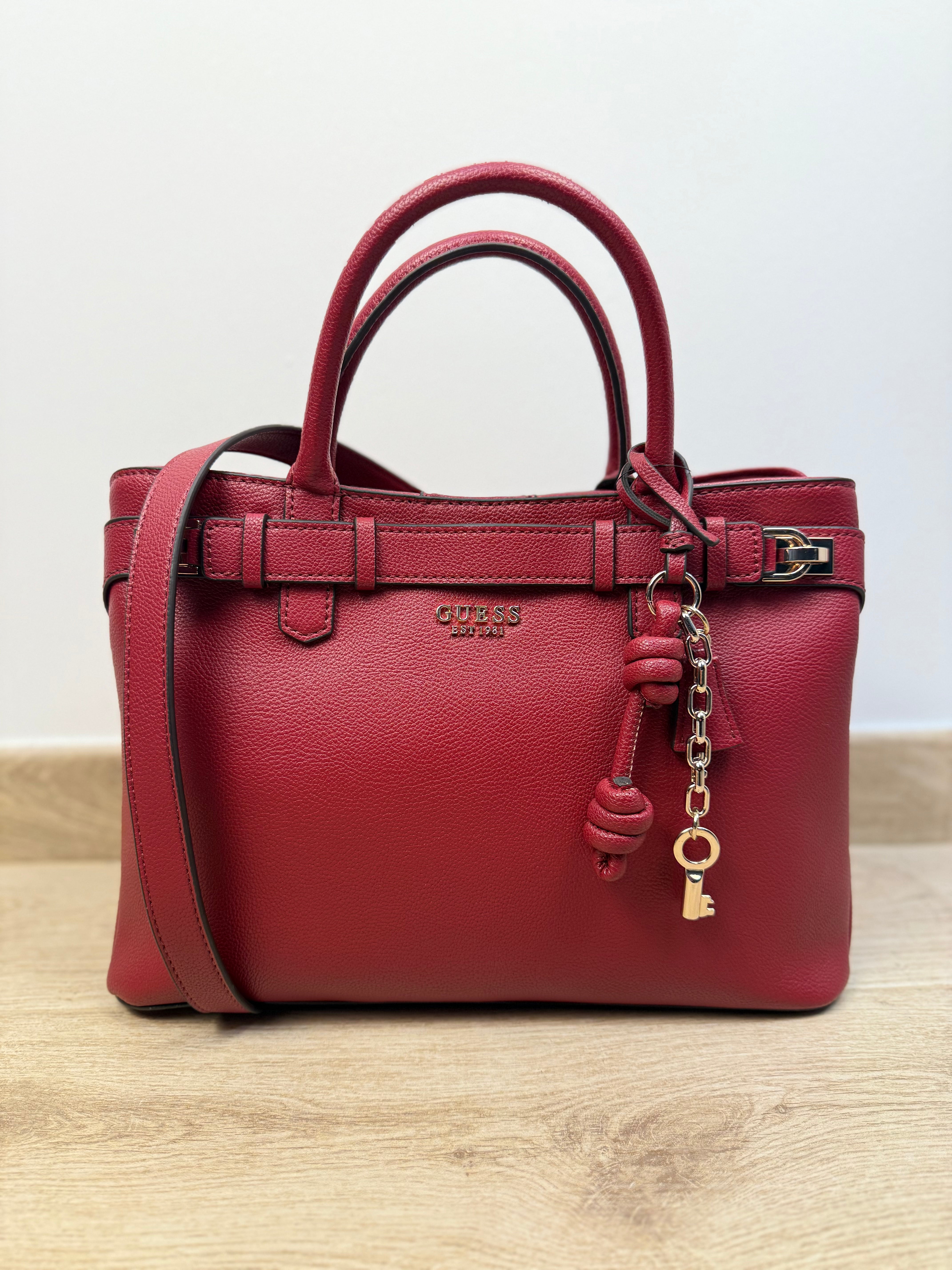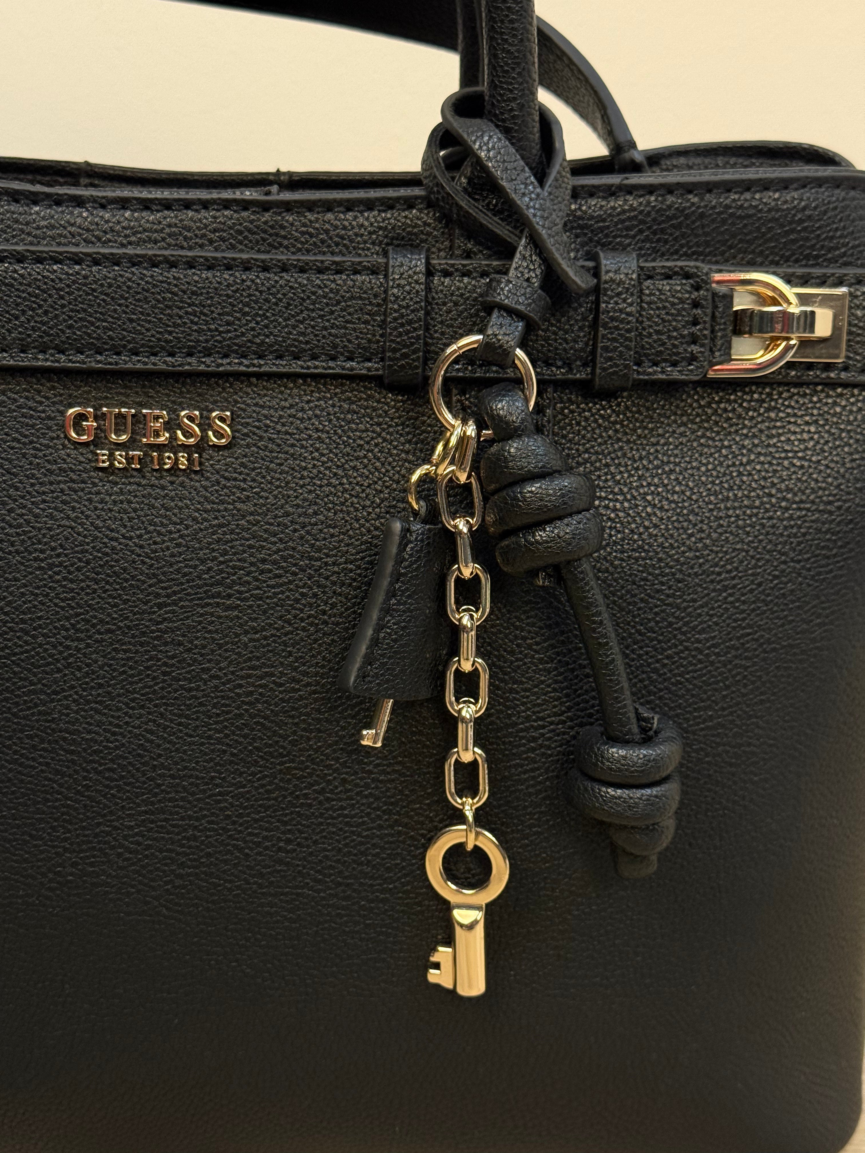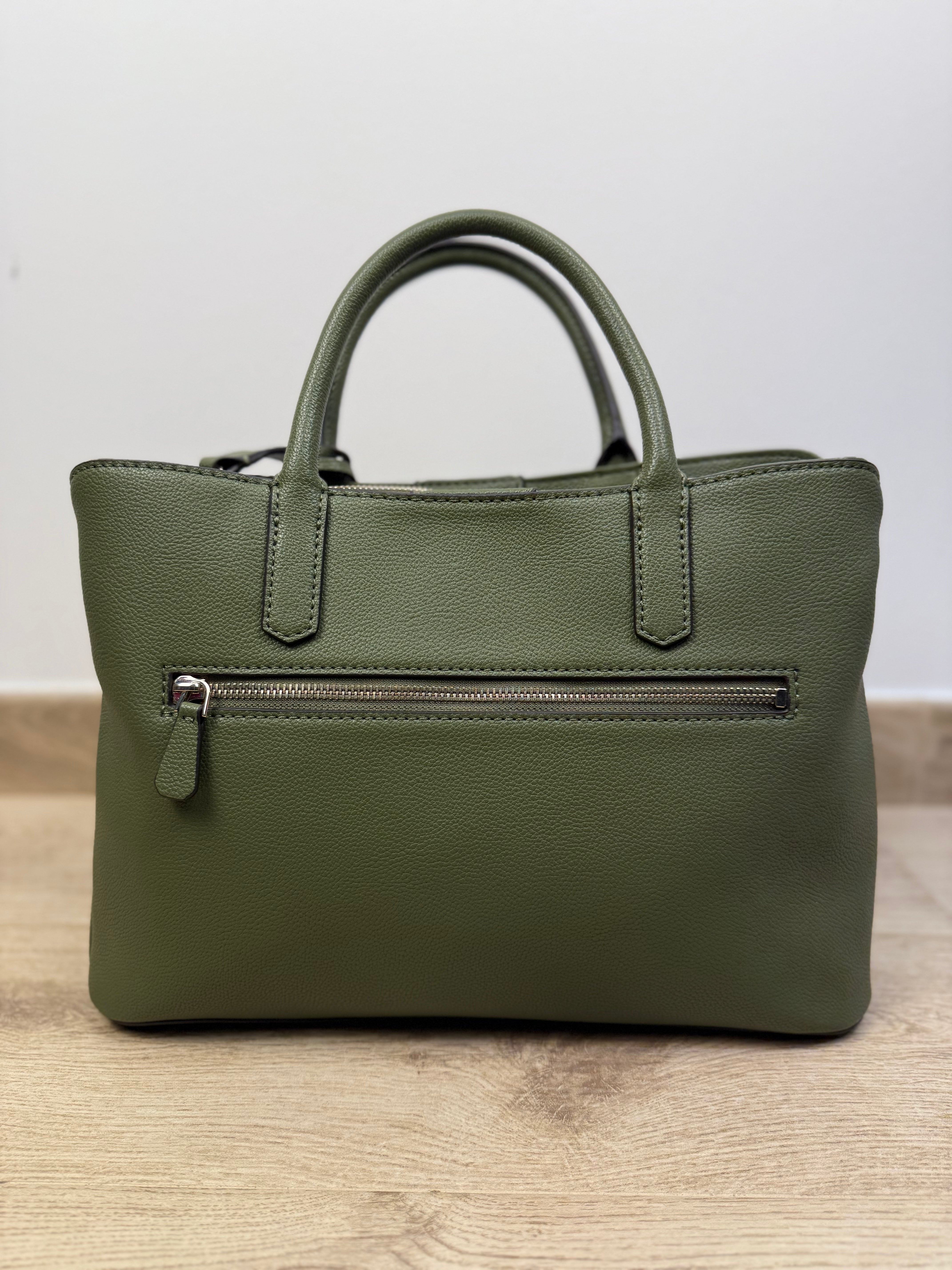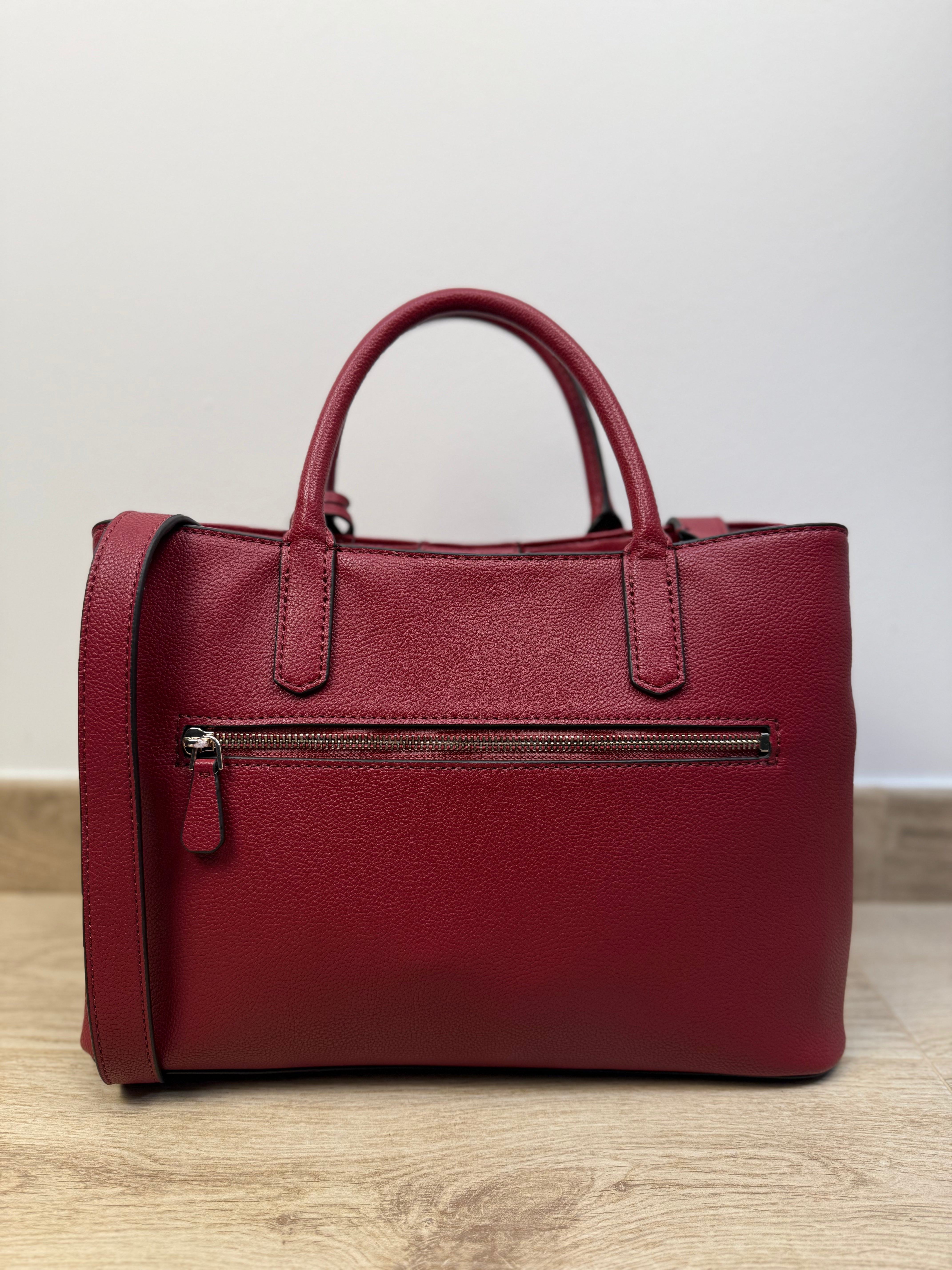 Borsa Guess dal design elegante e raffinato, realizzata in similpelle tinta unita micro pitonata, che conferisce un effetto sofisticato e contemporaneo. I dettagli metallici oro e il ciondolo coordinato aggiungono un tocco di luce e femminilità. Dotata di manici rigidi e tracolla regolabile e removibile tono su tono, può essere portata a mano o a spalla, adattandosi a ogni occasione. La chiusura con doppio bottone a calamita custodisce tre pratici scomparti interni: la sezione centrale è dotata di chiusura con zip, mentre i due scomparti laterali offrono spazio organizzato con due taschine aperte e una tasca con zip. Sul retro è presente un’ulteriore tasca con zip per gli oggetti di uso quotidiano. Un modello capiente e curato nei dettagli, perfetto per aggiungere un tocco di eleganza e stile a ogni look, dal giorno alla sera.