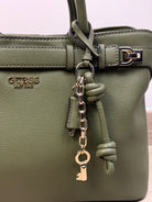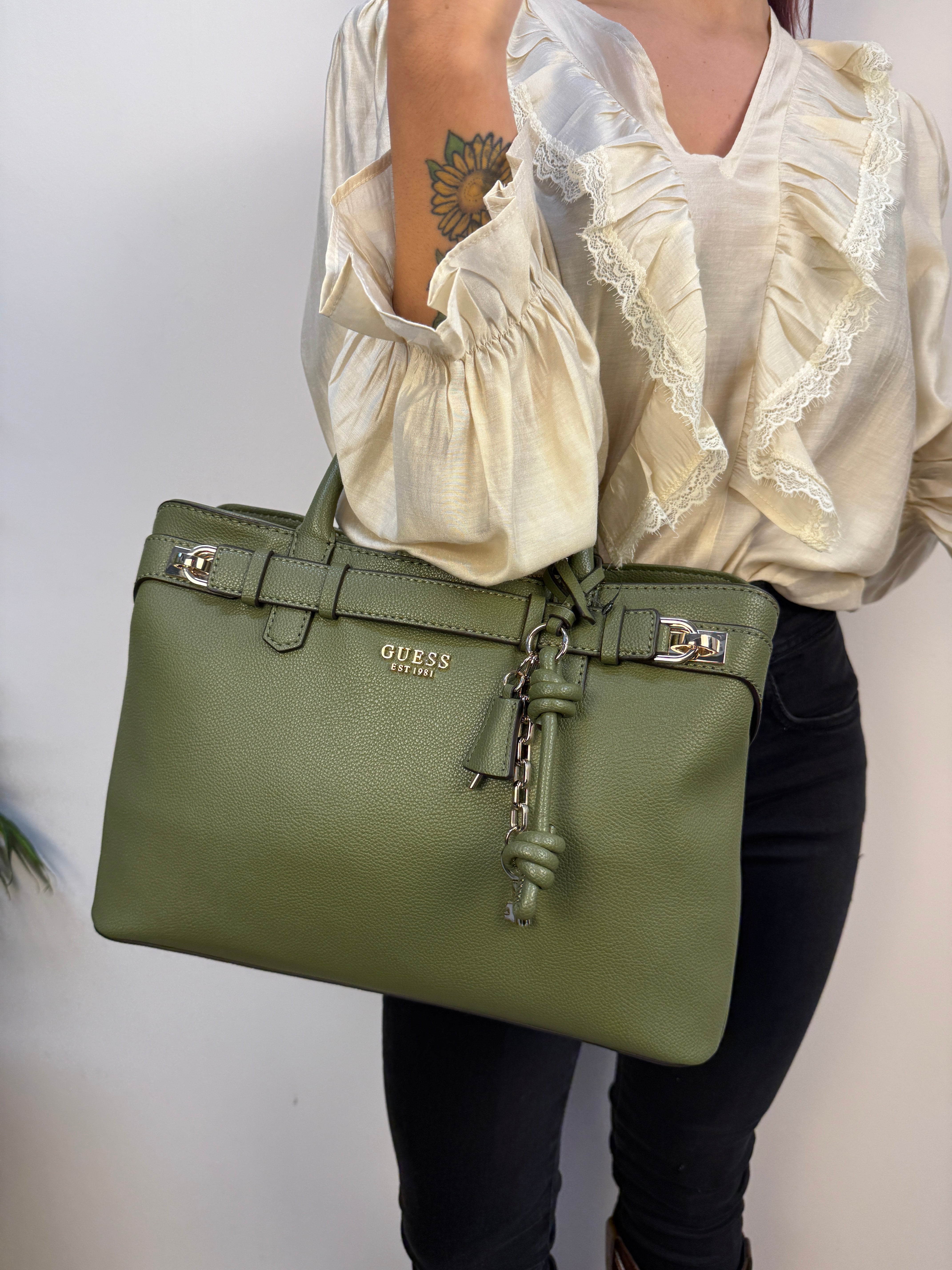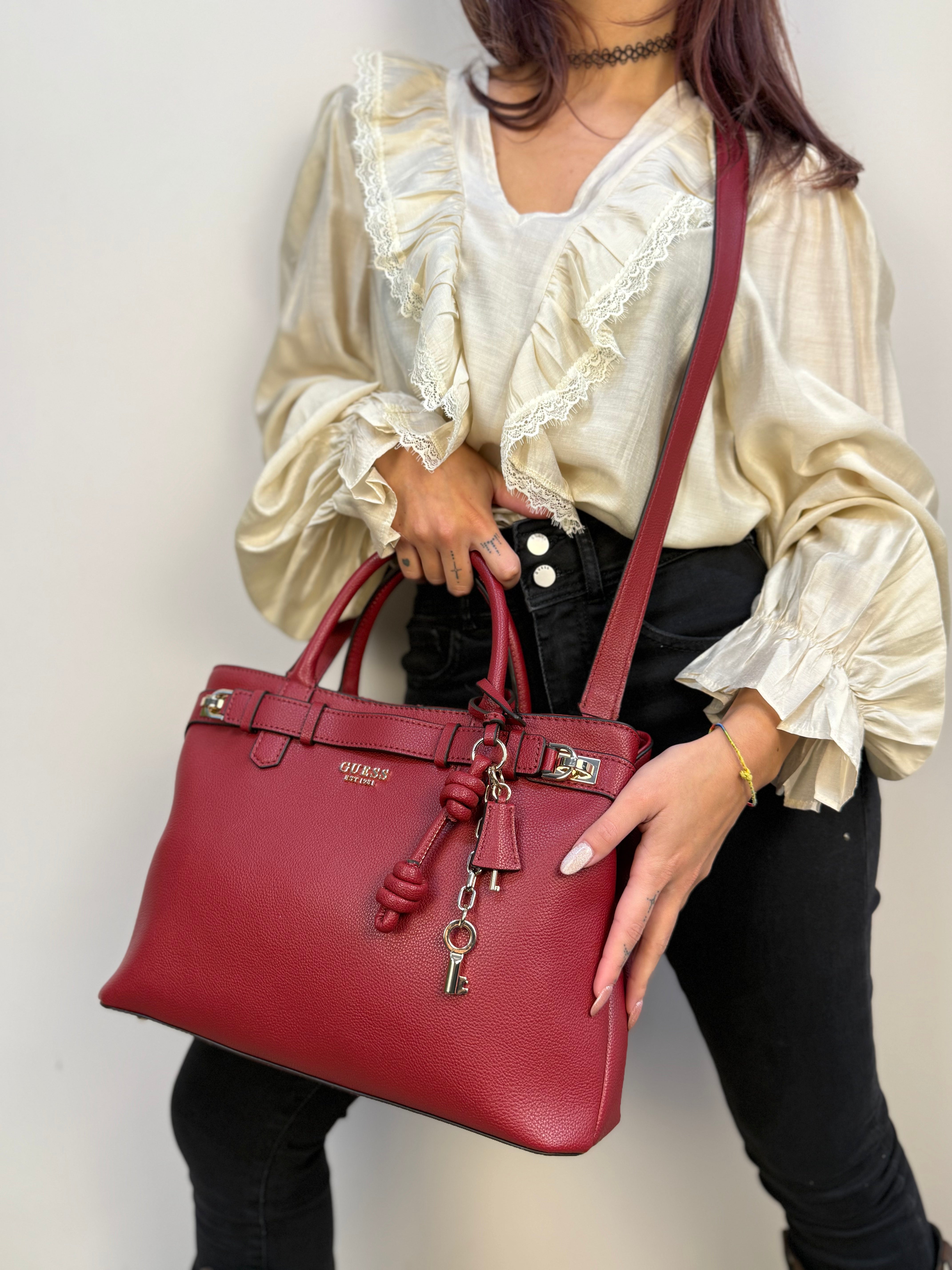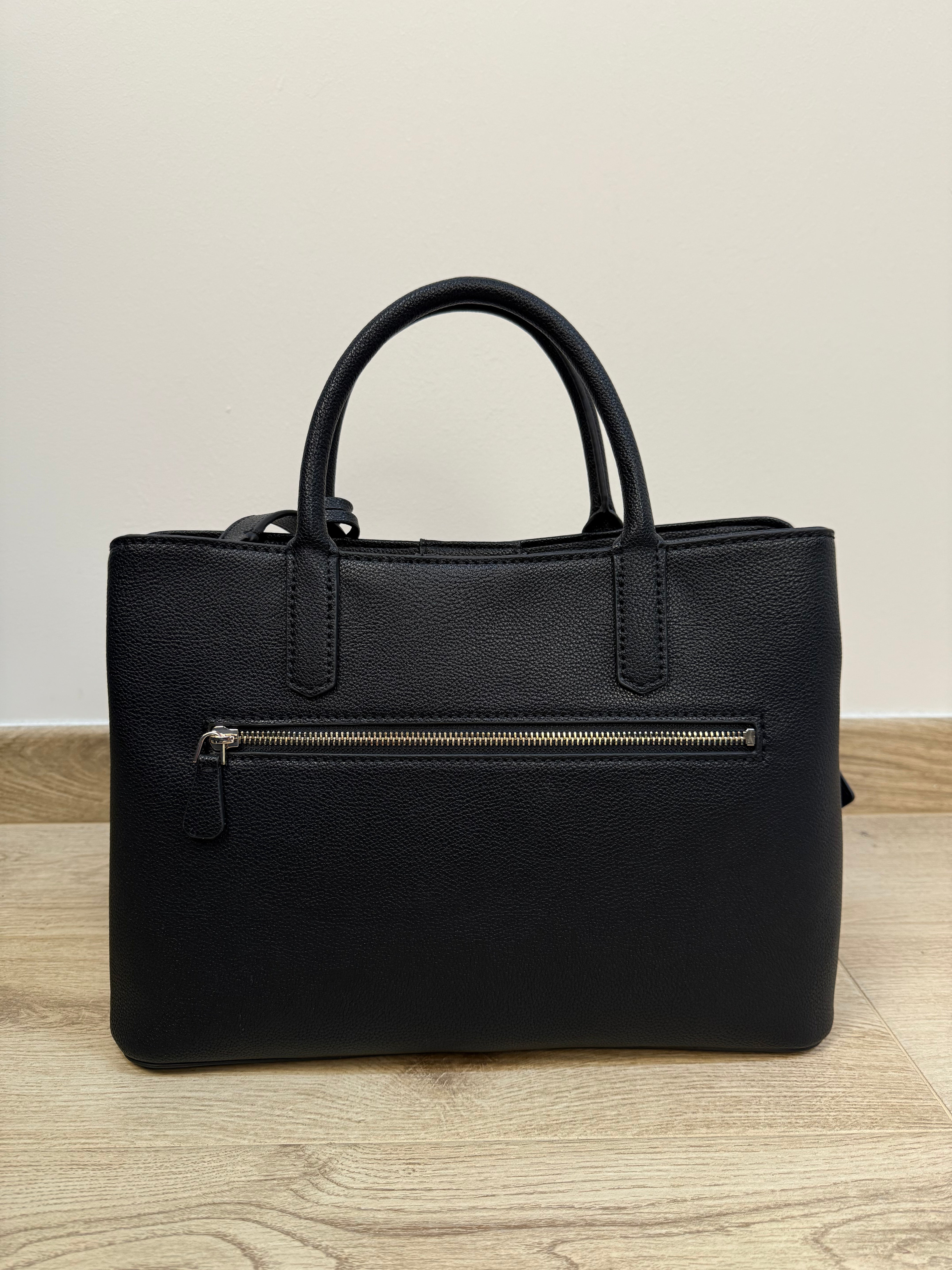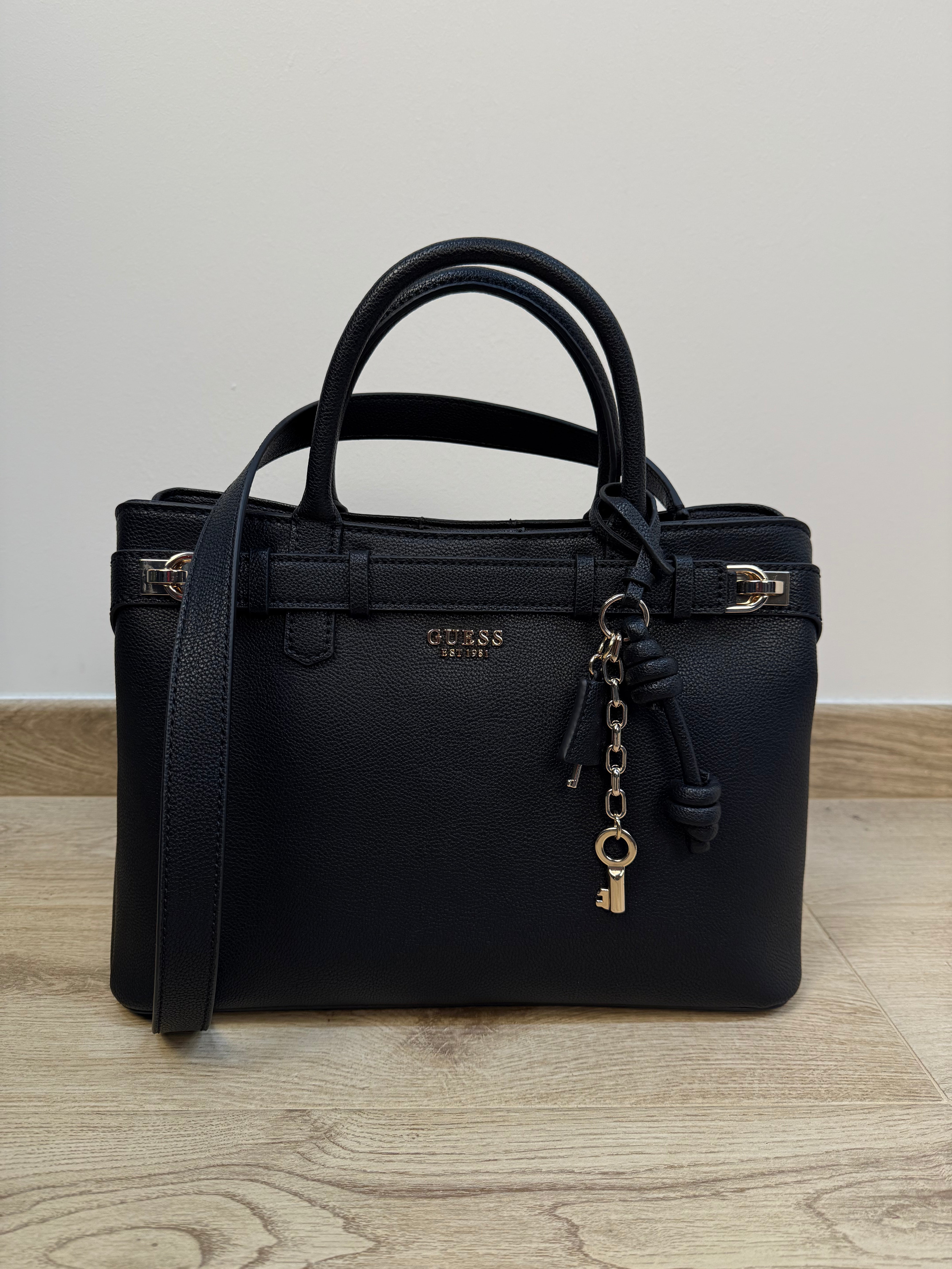 Borsa Guess dal design elegante e raffinato, realizzata in similpelle tinta unita micro pitonata, che conferisce un effetto sofisticato e contemporaneo. I dettagli metallici oro e il ciondolo coordinato aggiungono un tocco di luce e femminilità. Dotata di manici rigidi e tracolla regolabile e removibile tono su tono, può essere portata a mano o a spalla, adattandosi a ogni occasione. La chiusura con doppio bottone a calamita custodisce tre pratici scomparti interni: la sezione centrale è dotata di chiusura con zip, mentre i due scomparti laterali offrono spazio organizzato con due taschine aperte e una tasca con zip. Sul retro è presente un’ulteriore tasca con zip per gli oggetti di uso quotidiano. Un modello capiente e curato nei dettagli, perfetto per aggiungere un tocco di eleganza e stile a ogni look, dal giorno alla sera.