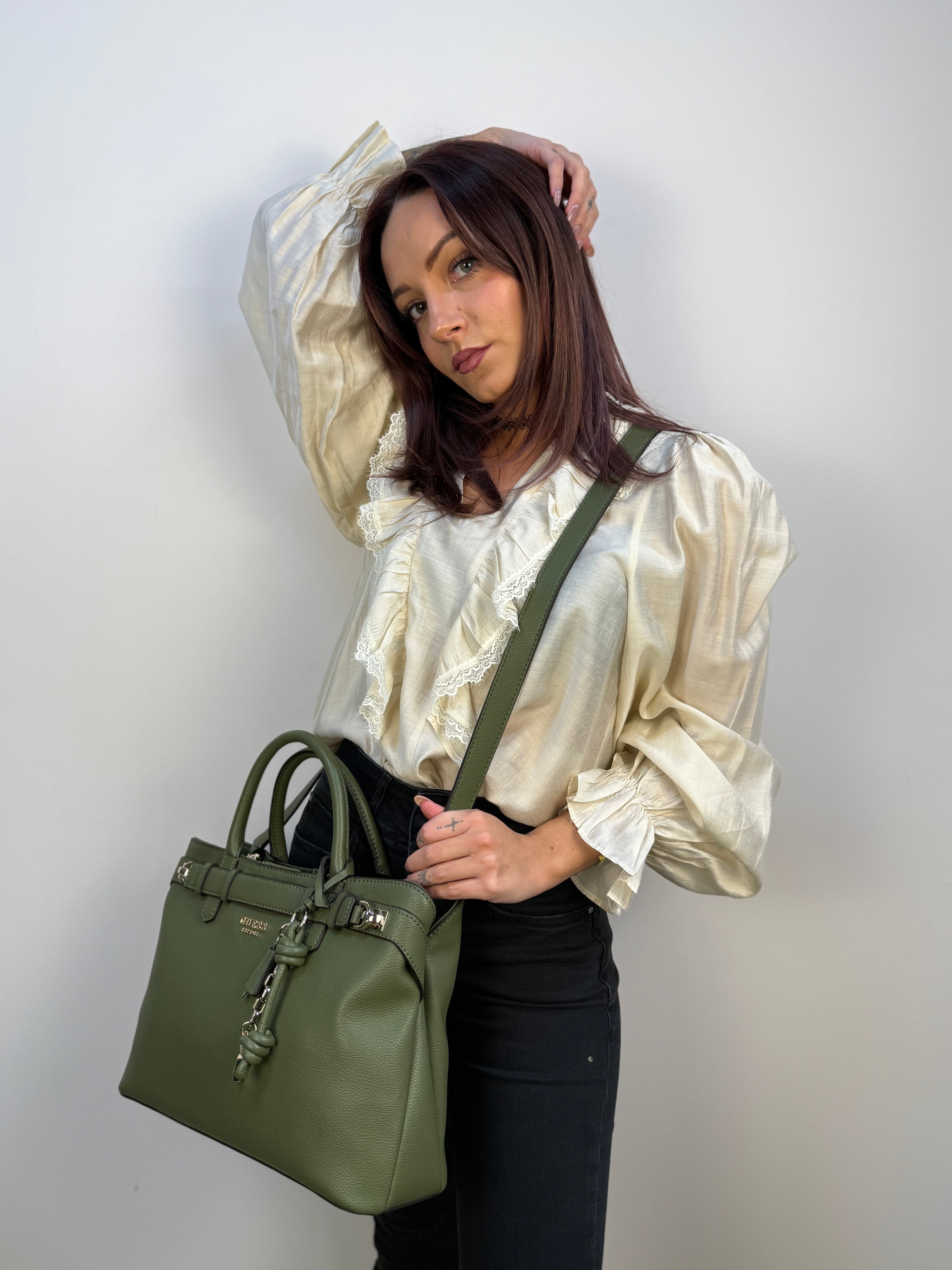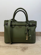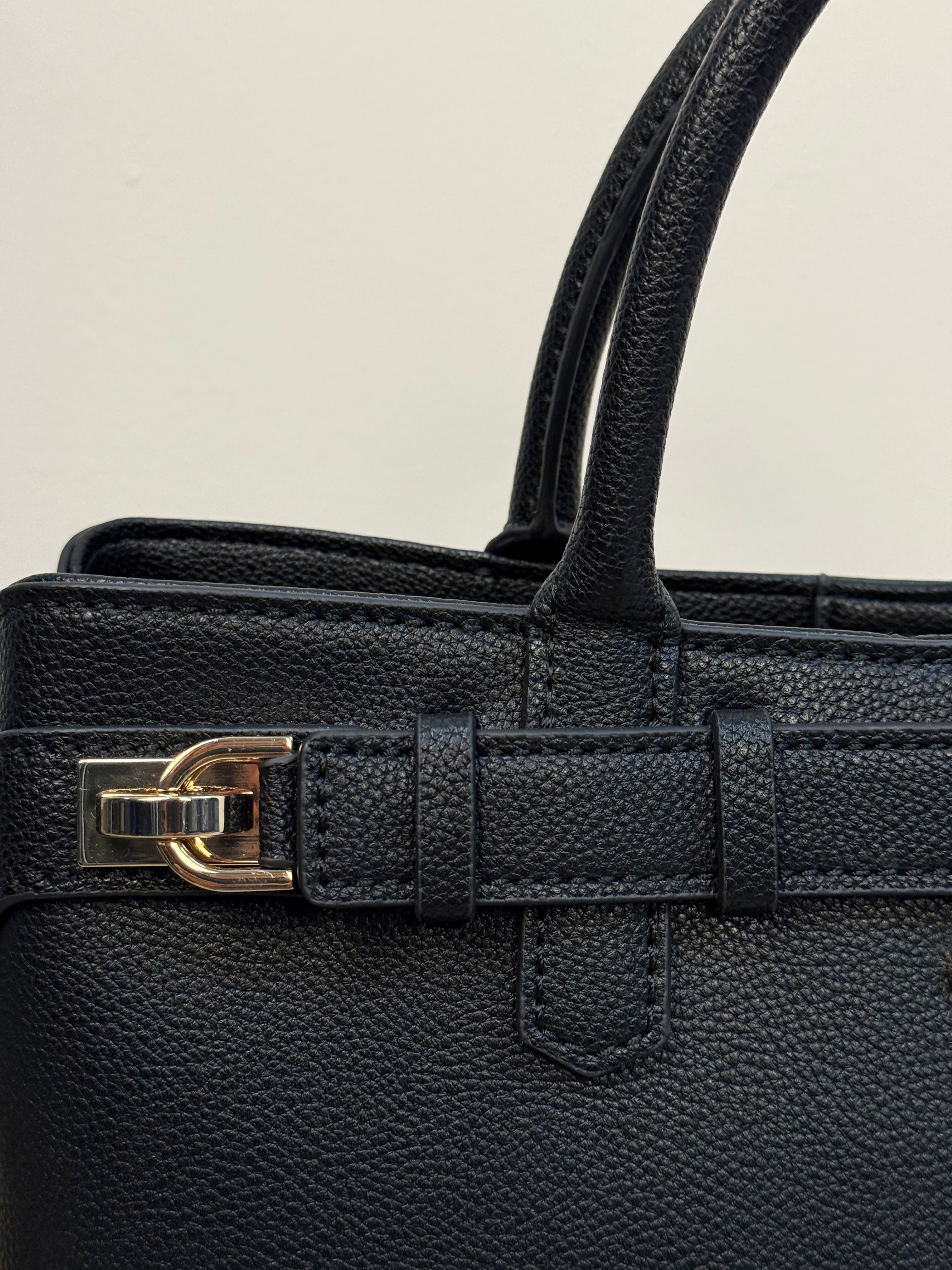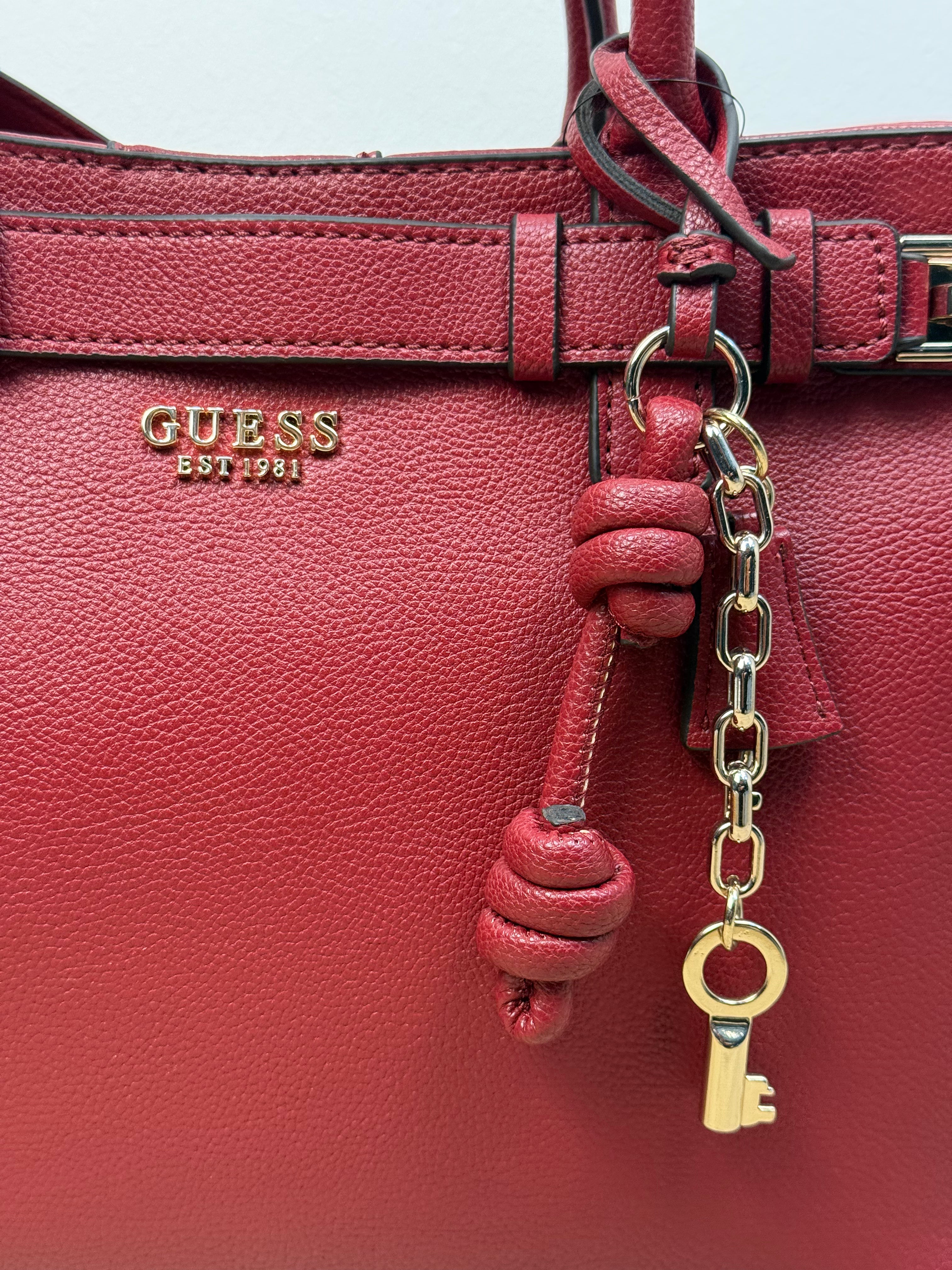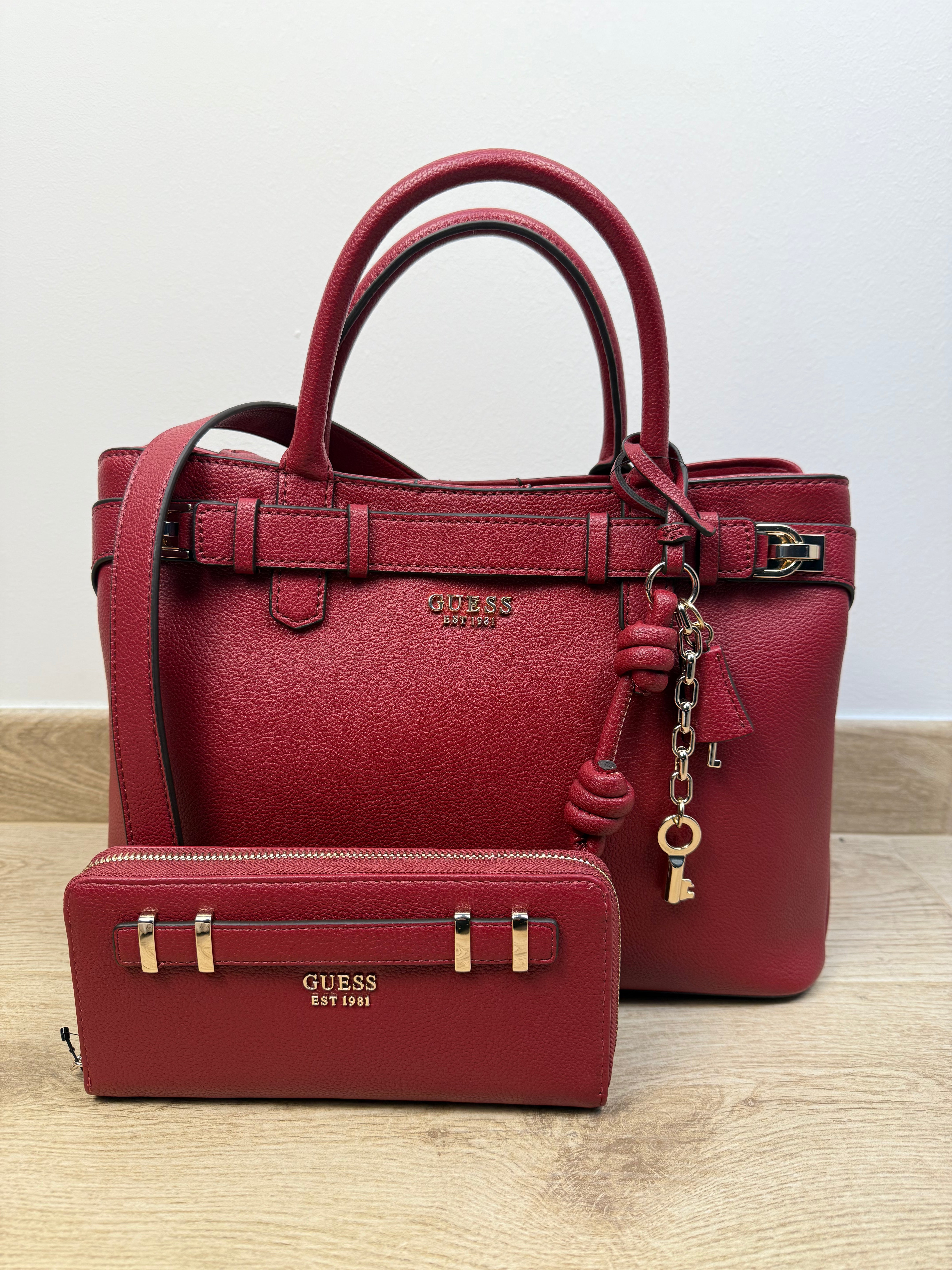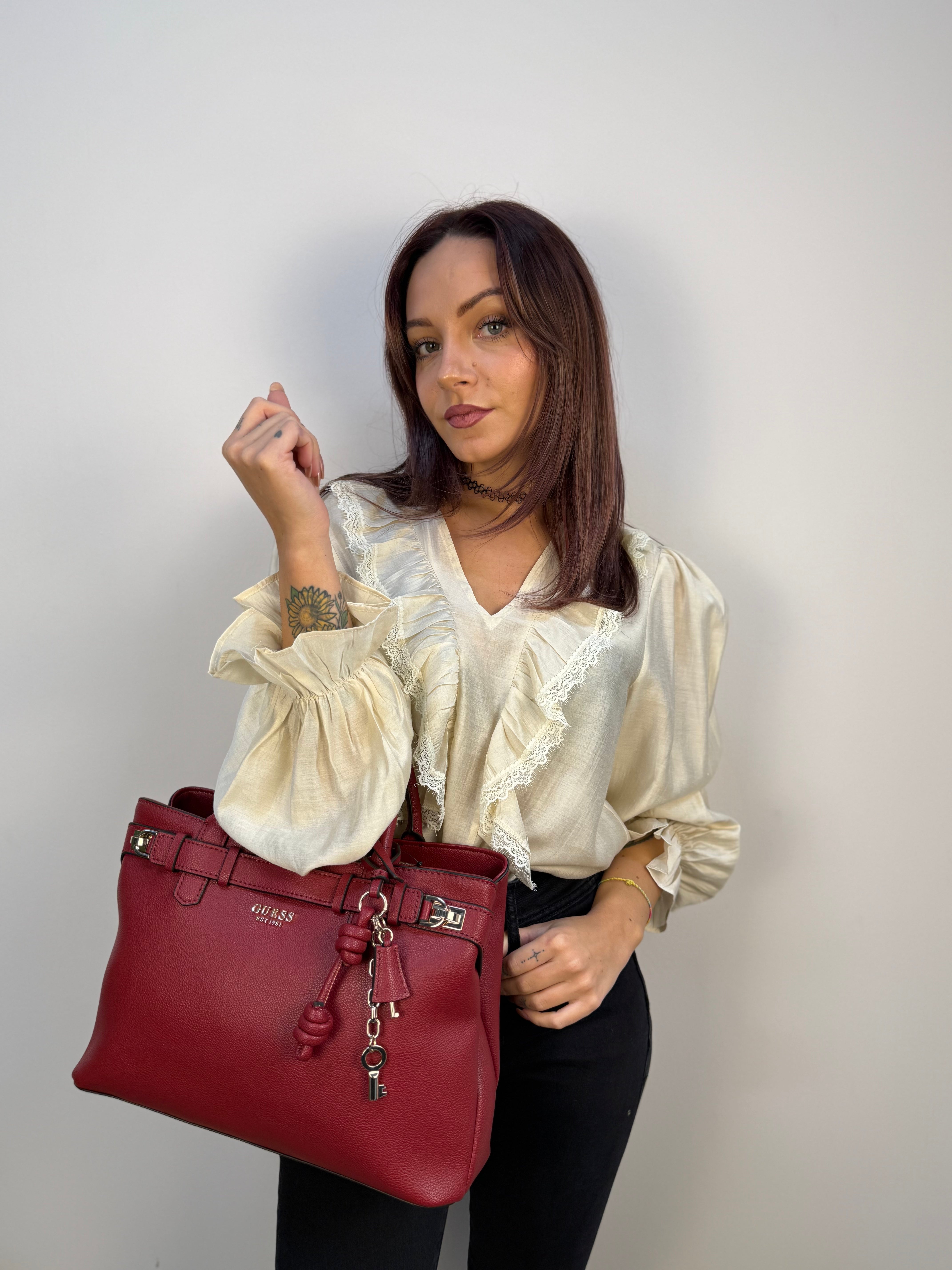 Borsa Guess dal design elegante e raffinato, realizzata in similpelle tinta unita micro pitonata, che conferisce un effetto sofisticato e contemporaneo. I dettagli metallici oro e il ciondolo coordinato aggiungono un tocco di luce e femminilità. Dotata di manici rigidi e tracolla regolabile e removibile tono su tono, può essere portata a mano o a spalla, adattandosi a ogni occasione. La chiusura con doppio bottone a calamita custodisce tre pratici scomparti interni: la sezione centrale è dotata di chiusura con zip, mentre i due scomparti laterali offrono spazio organizzato con due taschine aperte e una tasca con zip. Sul retro è presente un’ulteriore tasca con zip per gli oggetti di uso quotidiano. Un modello capiente e curato nei dettagli, perfetto per aggiungere un tocco di eleganza e stile a ogni look, dal giorno alla sera.