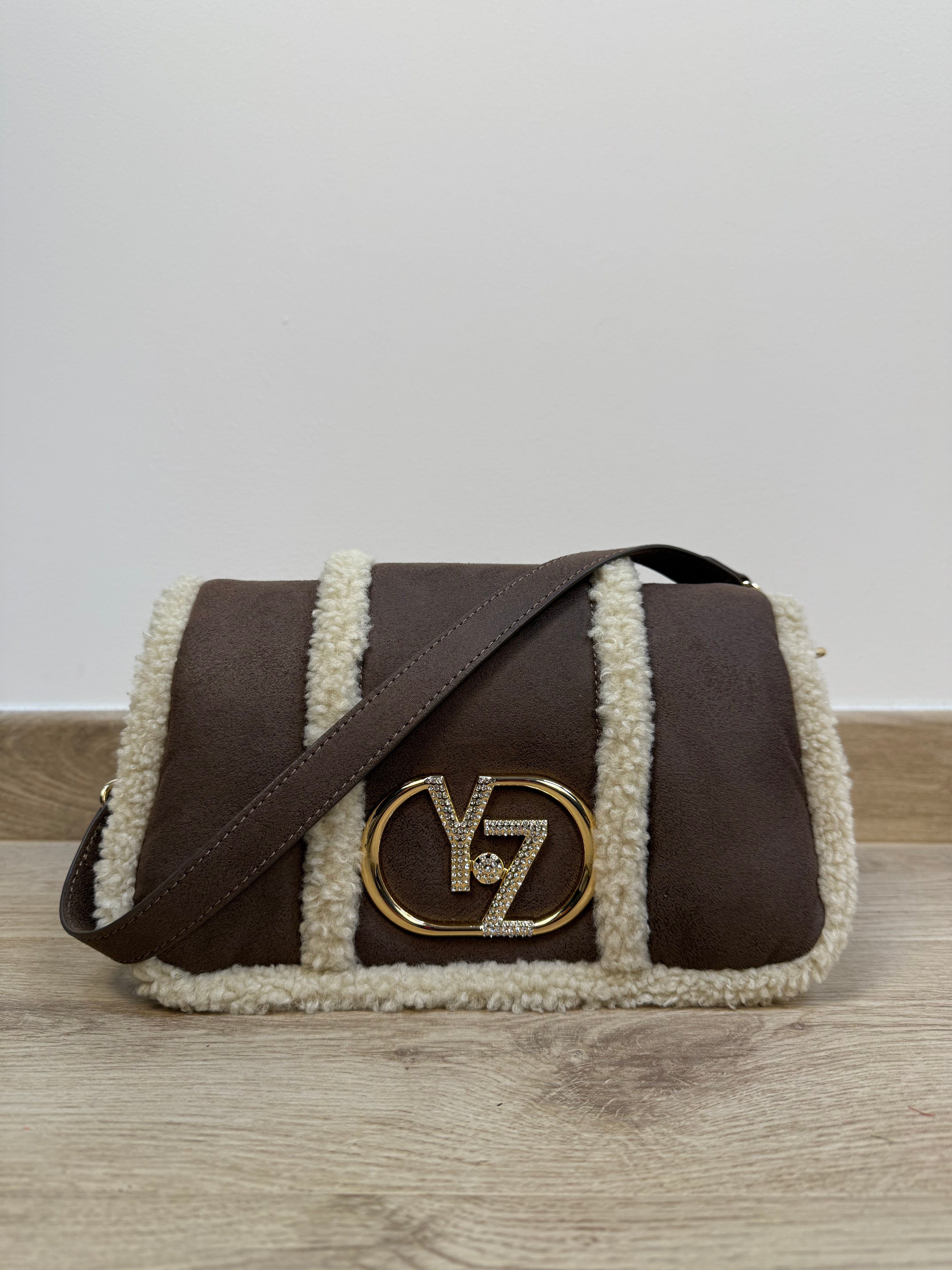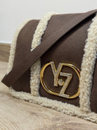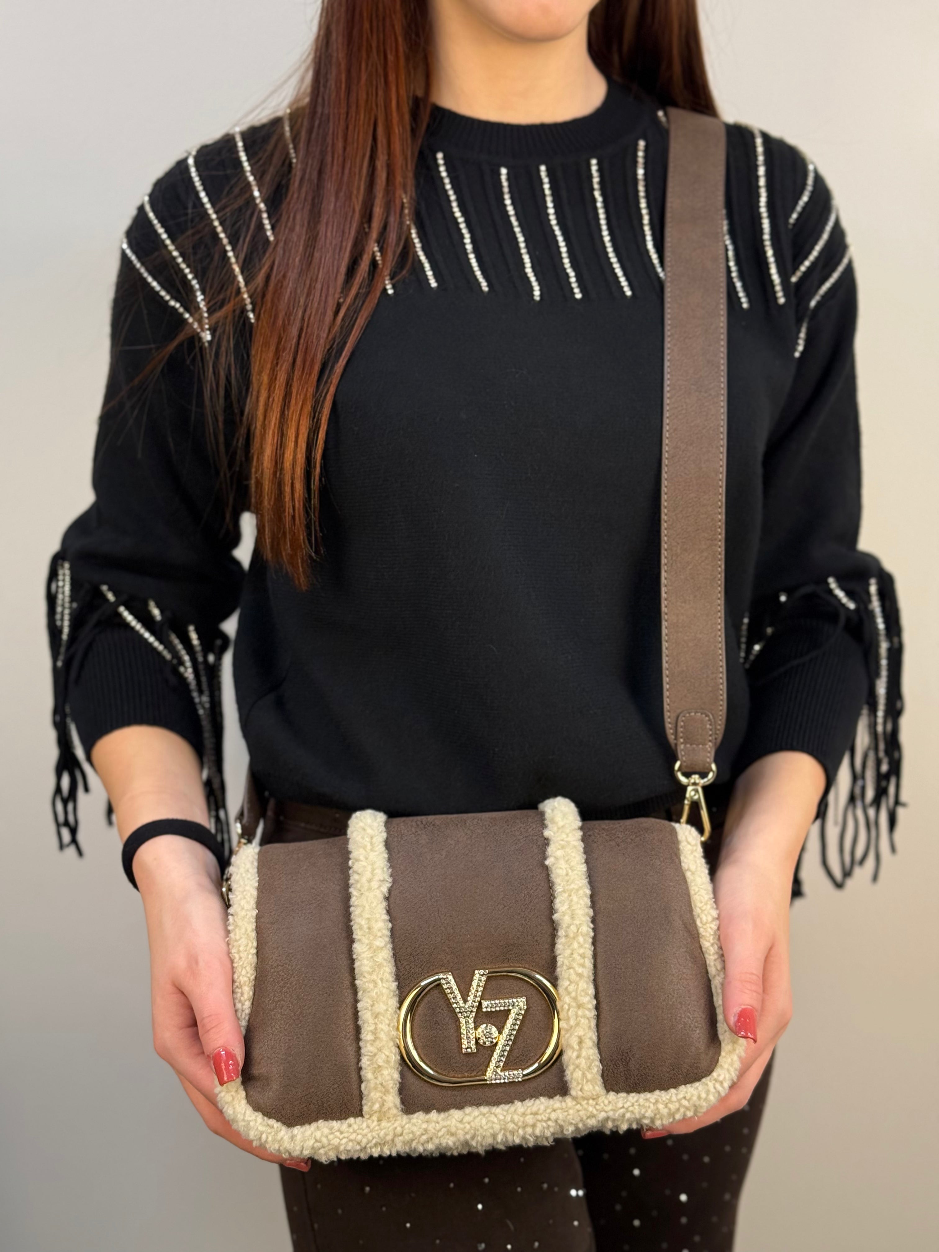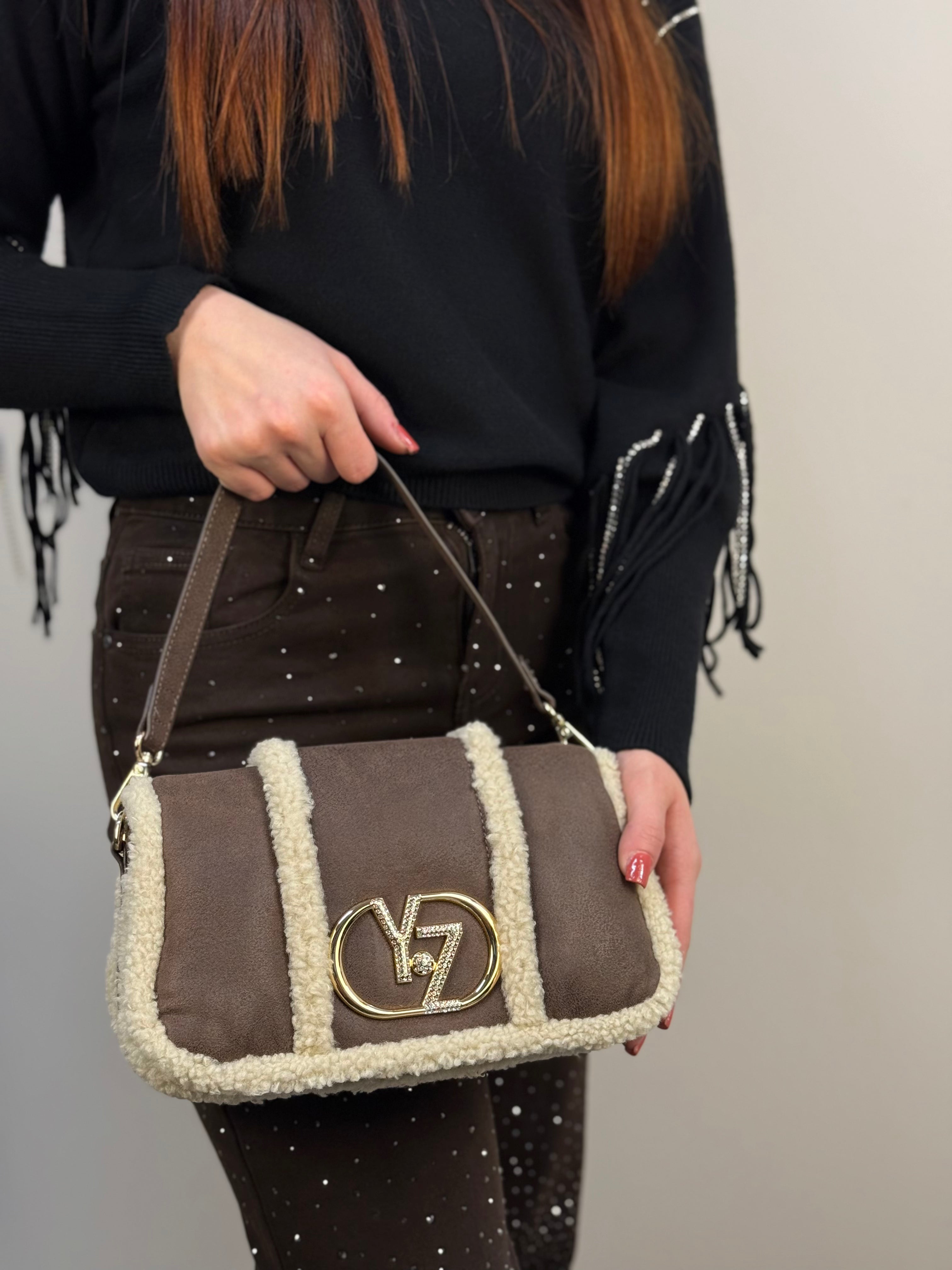 Borsa Yes-Zee dal design elegante e contemporaneo, realizzata in un tessuto morbido effetto graffiato color marrone, caratterizzata da un soffice rivestimento simil montone beige che le dona un aspetto ricercato e d’effetto. La patta con chiusura a bottone calamita assicura praticità e un’apertura comoda, mentre sul fronte spicca il logo metallico logato arricchito da strass, per un tocco di luce e femminilità. Il manico in similpelle tono su tono marrone, removibile, permette di portarla a mano o di indossarla a spalla grazie alla tracolla coordinata. L’interno è foderato e ben organizzato, con una tasca con zip, una tasca aperta e una patch logata in similpelle, che ne sottolinea la cura dei dettagli. Una borsa versatile e sofisticata, perfetta per completare look casual chic o più eleganti con un tocco morbido e luminoso.