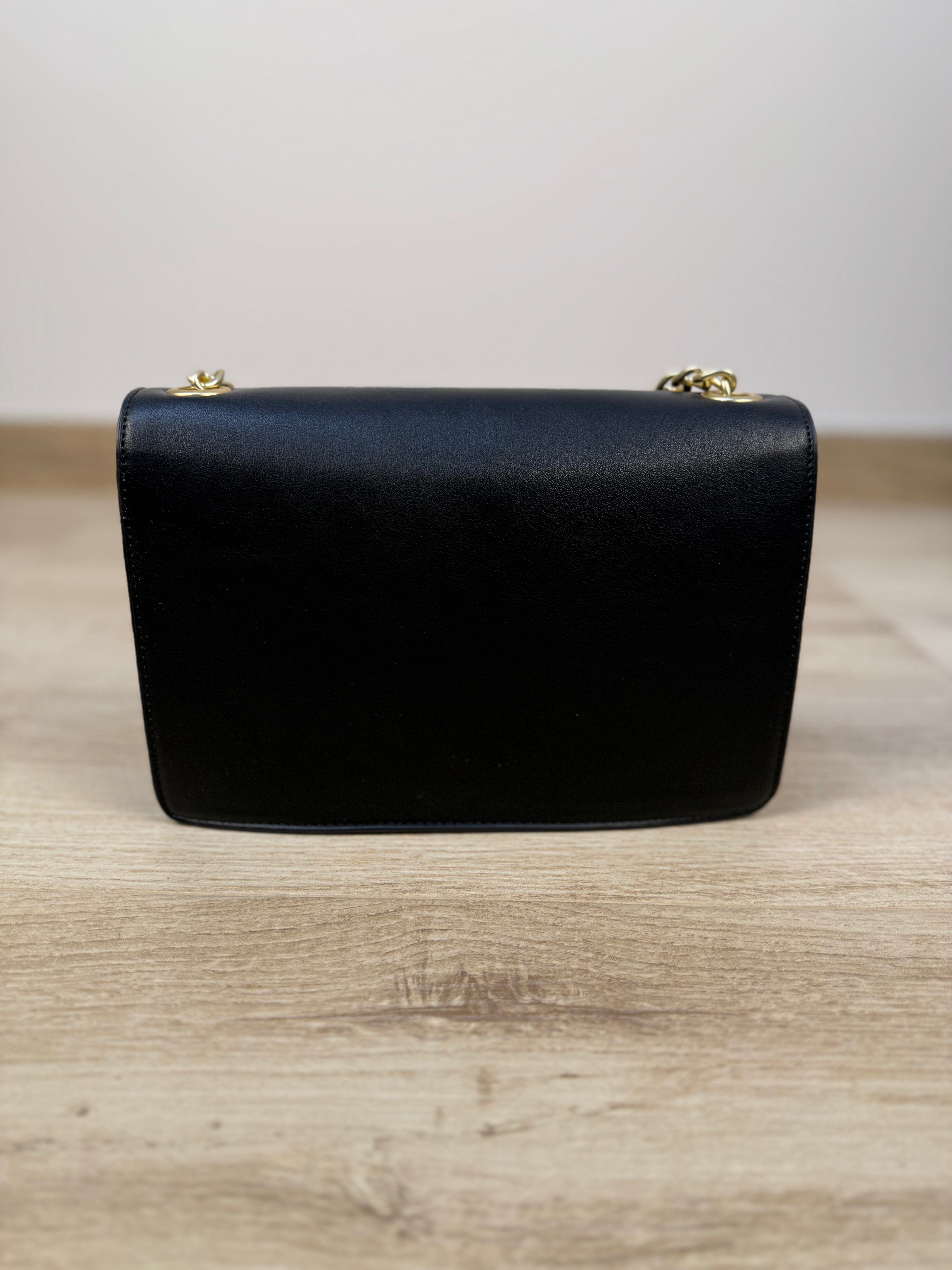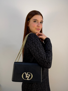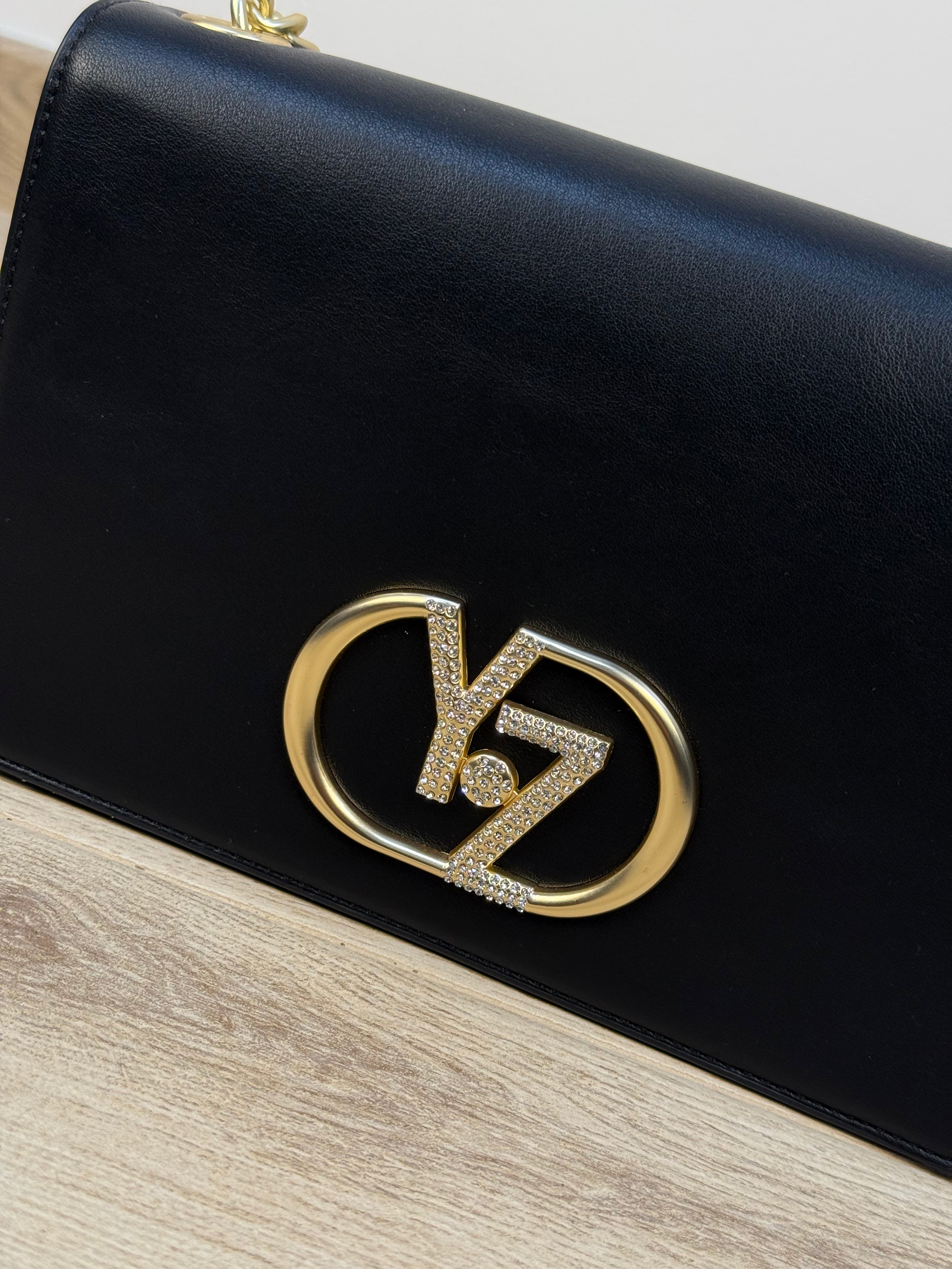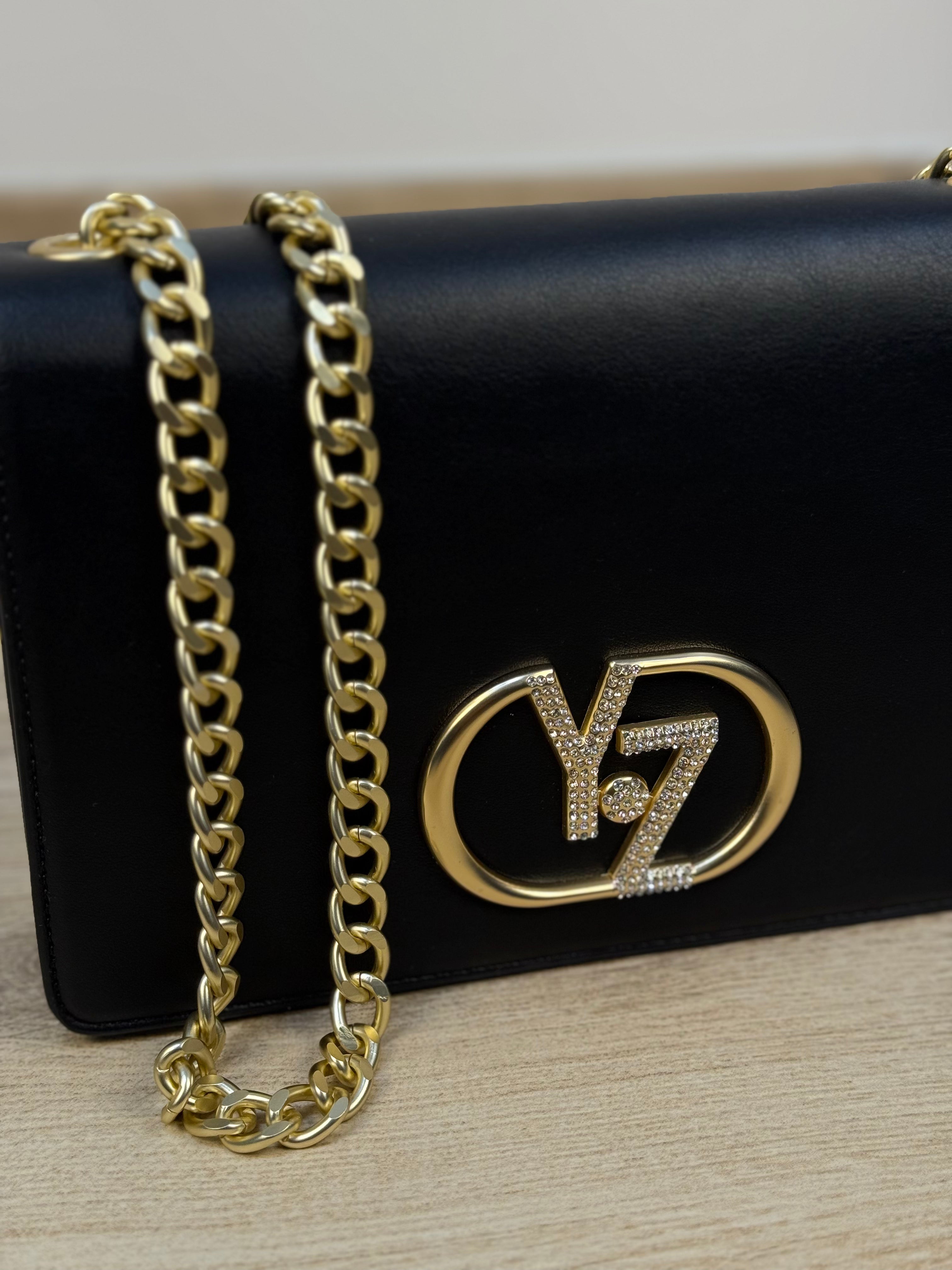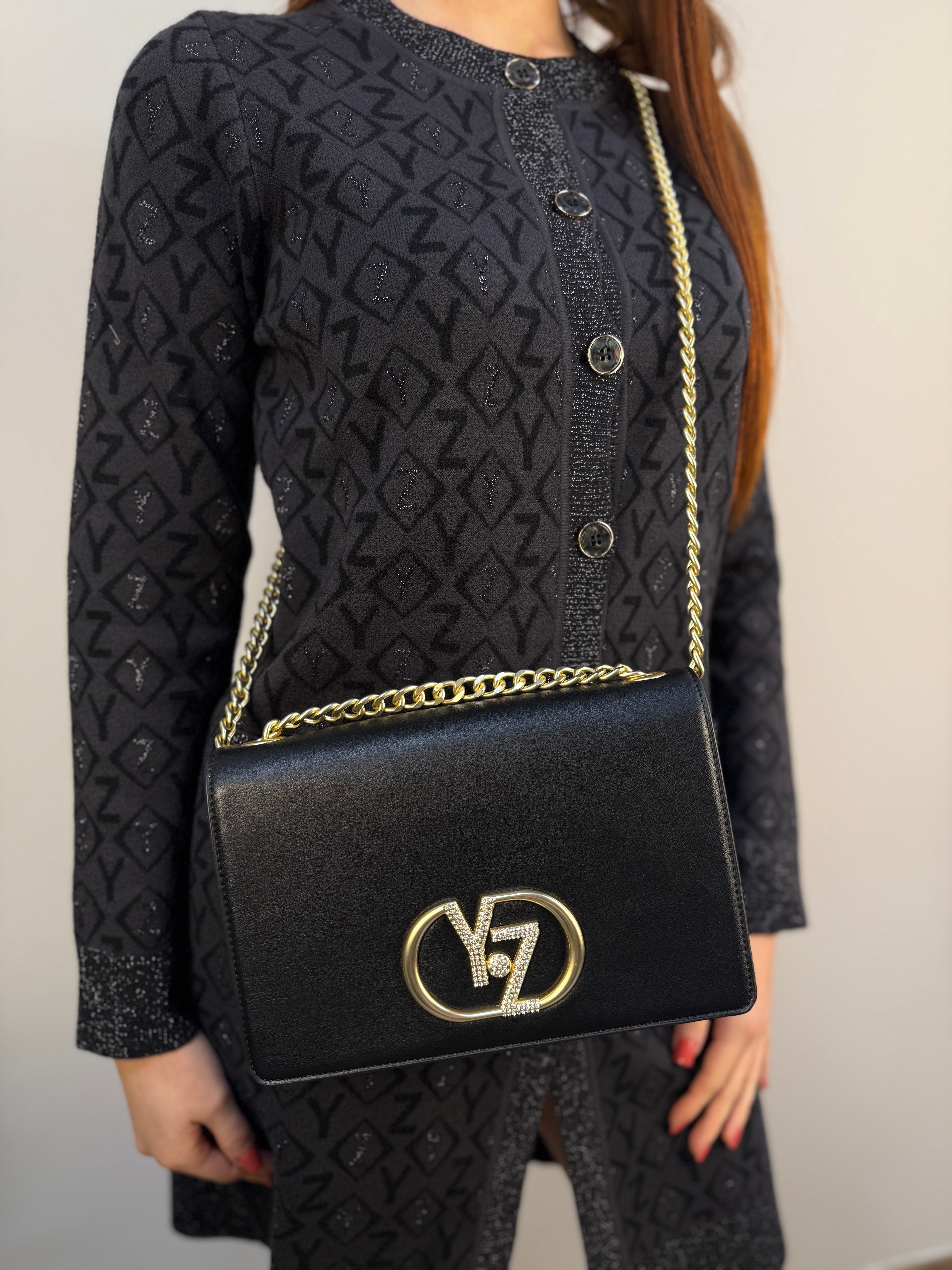 Borsa a tracolla o da spalla Yes-Zee realizzata in similpelle rigida, dal design strutturato e raffinato. La chiusura con bottone a calamita garantisce praticità e sicurezza, mentre sul fronte spicca il logo metallico in rilievo arricchito da strass, che dona luminosità e un tocco glamour al modello. La borsa può essere indossata a spalla con la catena doppia per un look elegante, oppure a tracolla con la catena singola per uno stile più casual e versatile. L’interno presenta uno scomparto unico con una tasca con chiusura a zip, una tasca aperta e una piccola patch logata in similpelle, per la massima organizzazione. Un accessorio sofisticato e funzionale, perfetto per aggiungere un dettaglio luminoso a qualsiasi outfit.