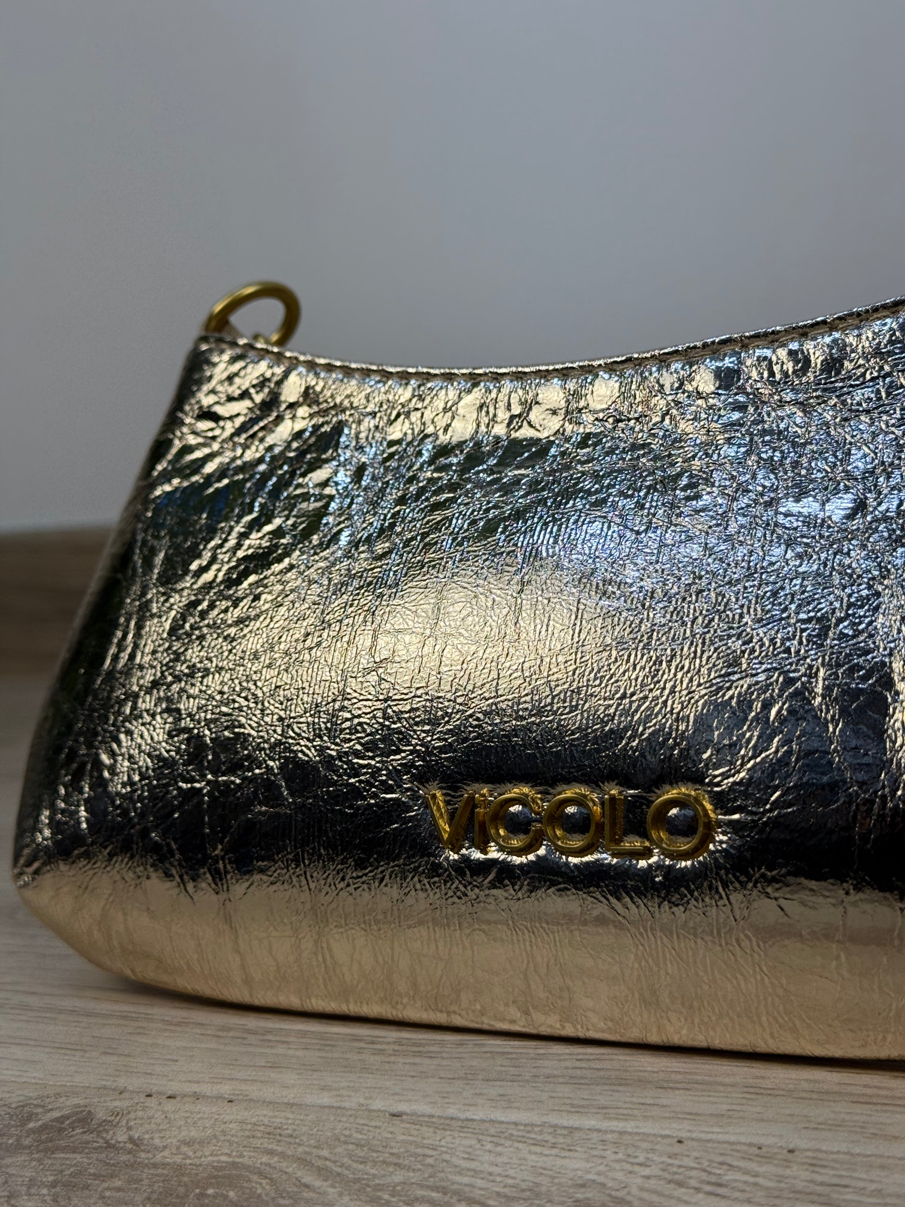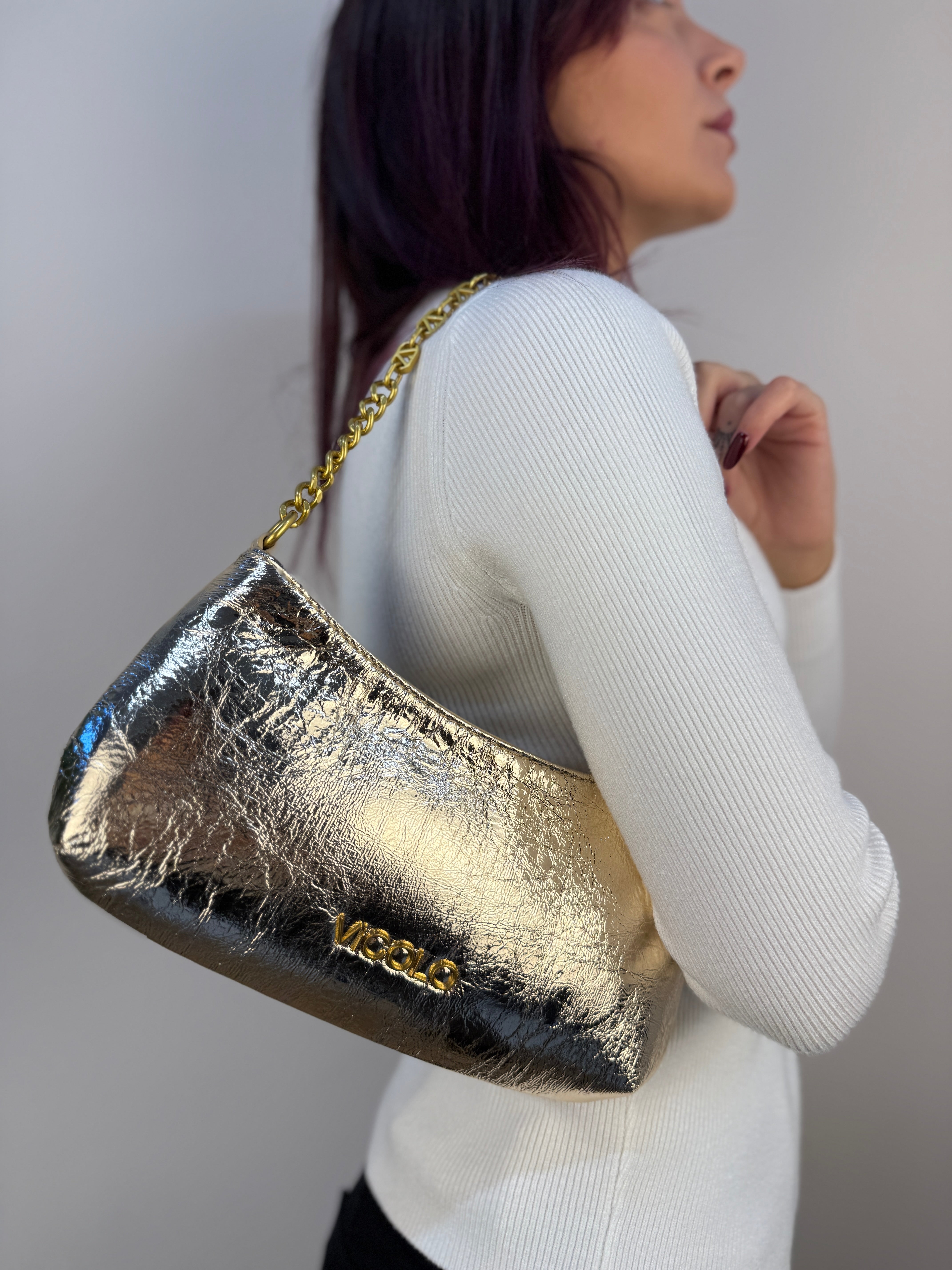 Dal design audace e raffinato, questa pochette Vicolo in similpelle rigida con finitura effetto specchiato color oro è l’accessorio perfetto per aggiungere un tocco glamour a qualsiasi outfit. Può essere portata comodamente sotto spalla o indossata a tracolla grazie alla catenella in metallo logata, per uno stile versatile e sofisticato. La chiusura con zip consente un’apertura pratica e sicura. L’interno, foderato in tessuto, è organizzato con una tasca con zip ideale per custodire gli oggetti più piccoli. Perfetta per la sera o le occasioni speciali, questa pochette non passerà inosservata.