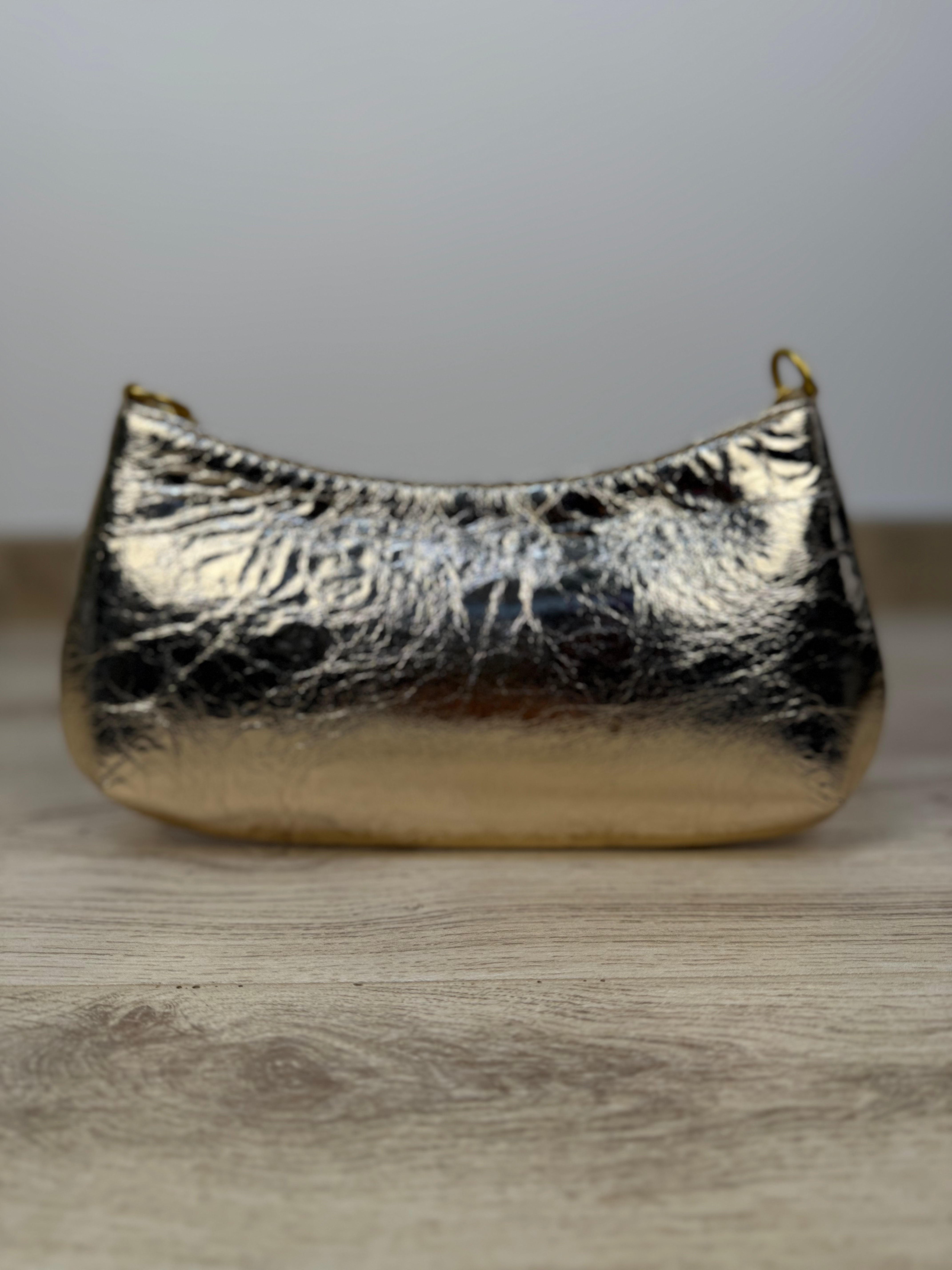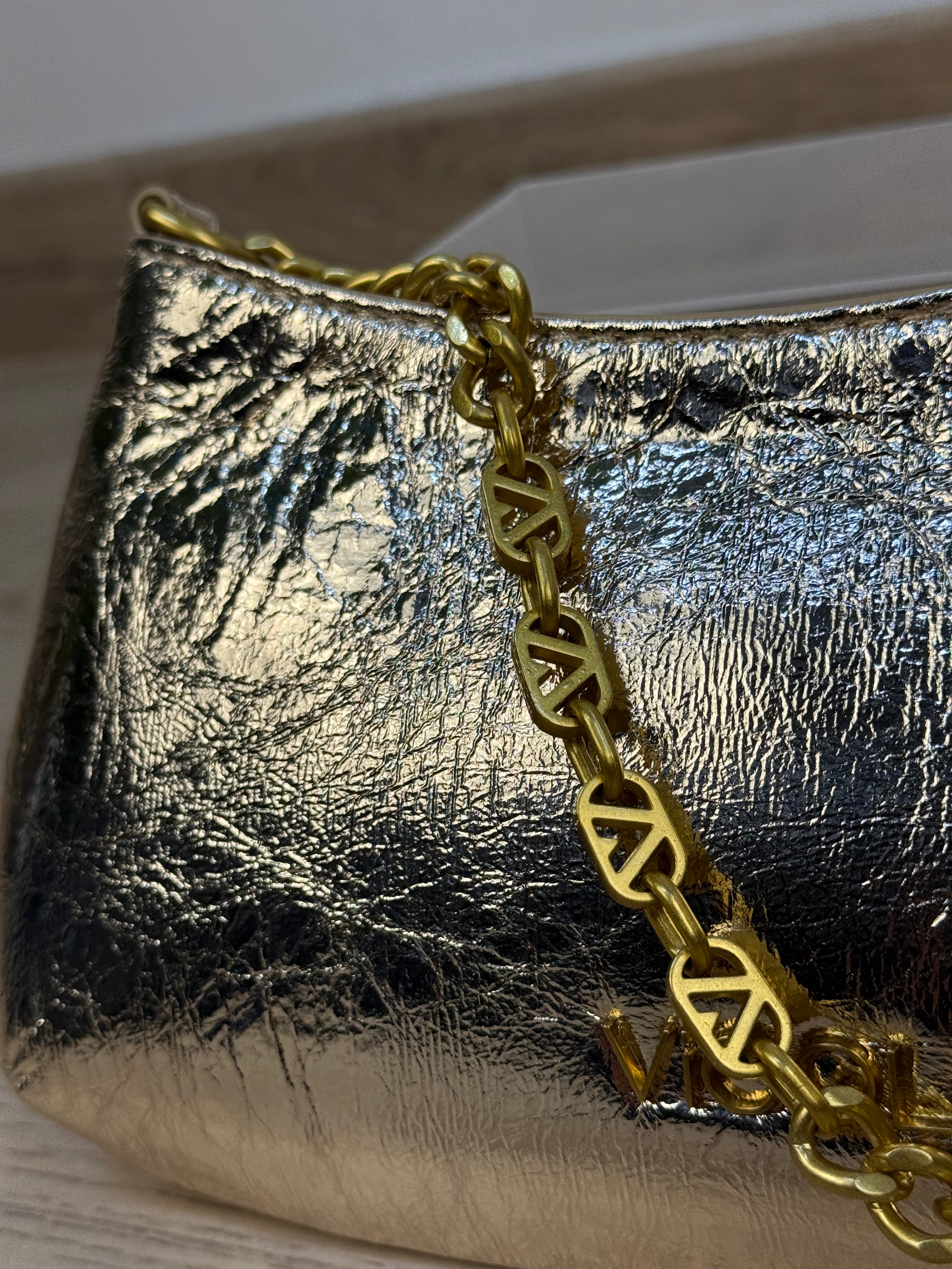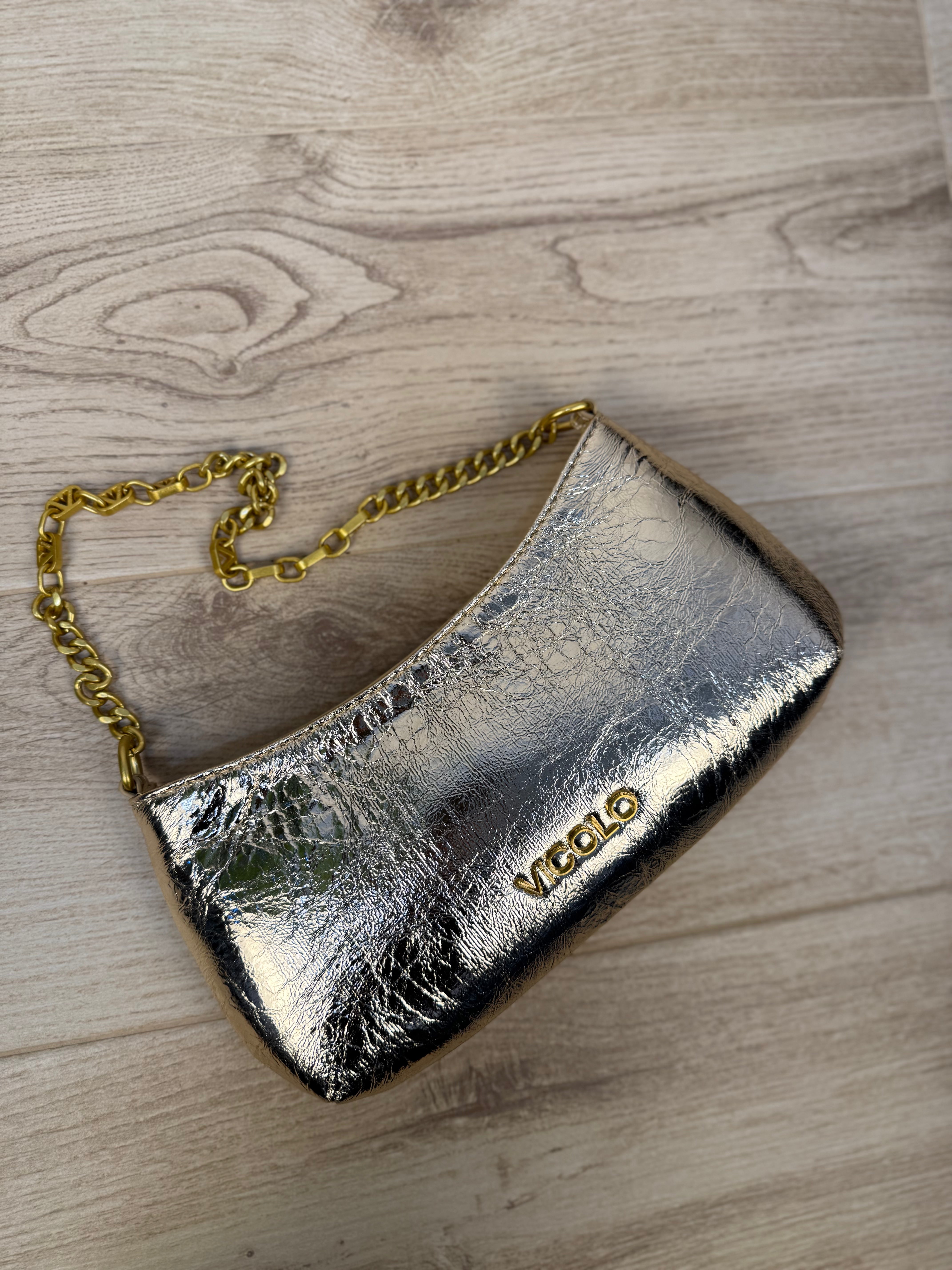 Pochette in similpelle effetto specchiato oro con tracolla a catena
