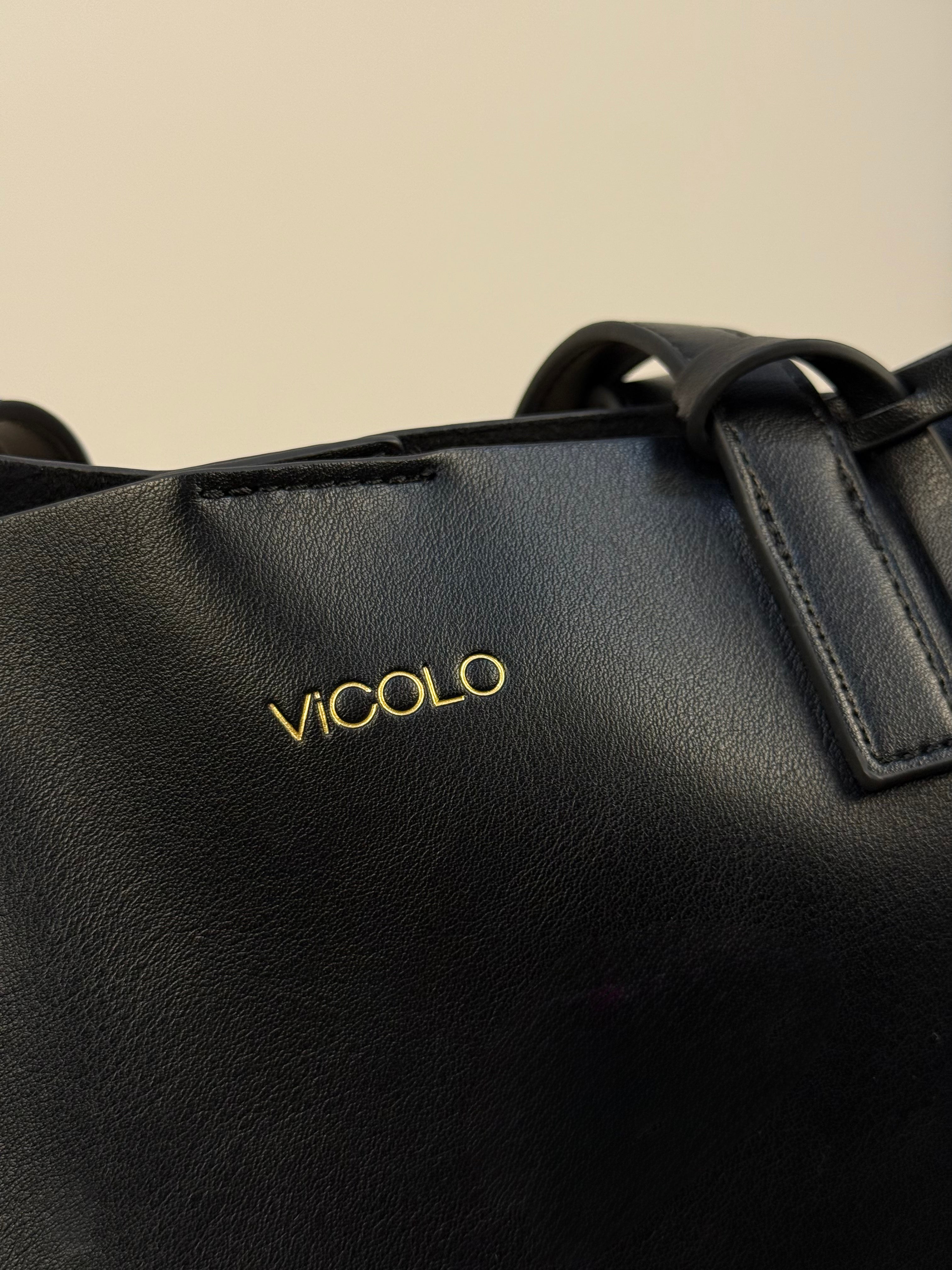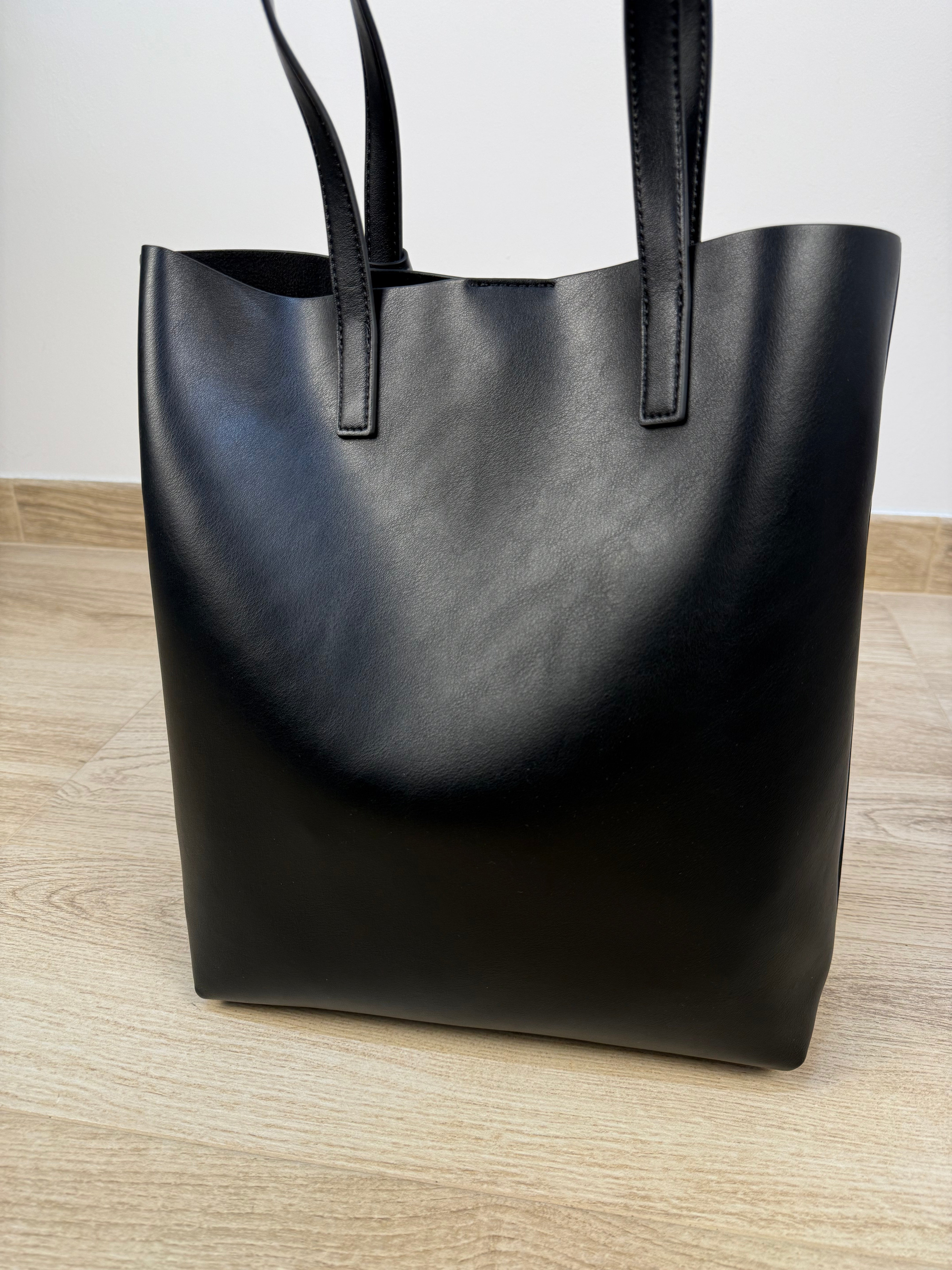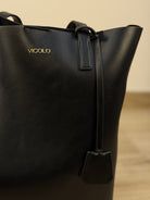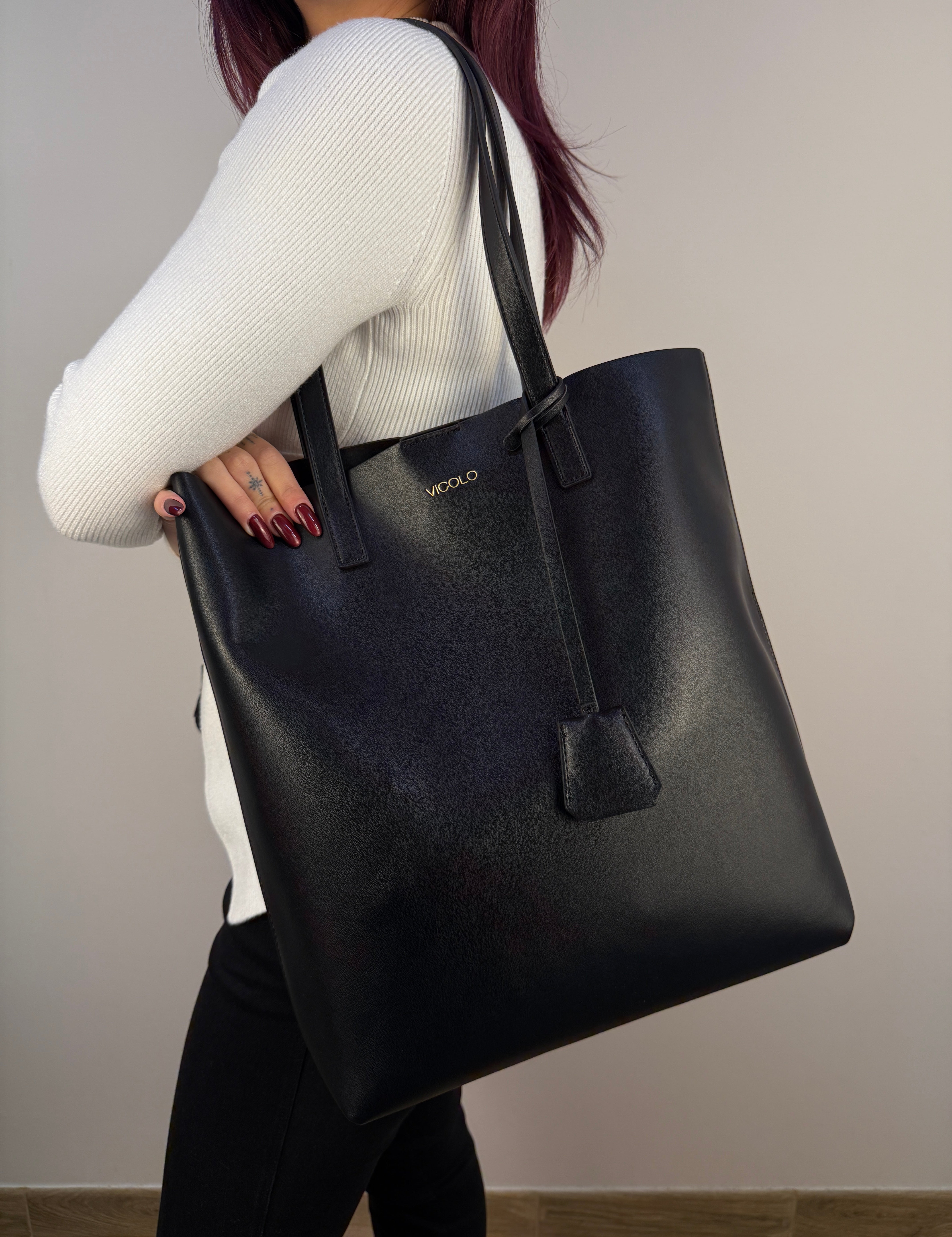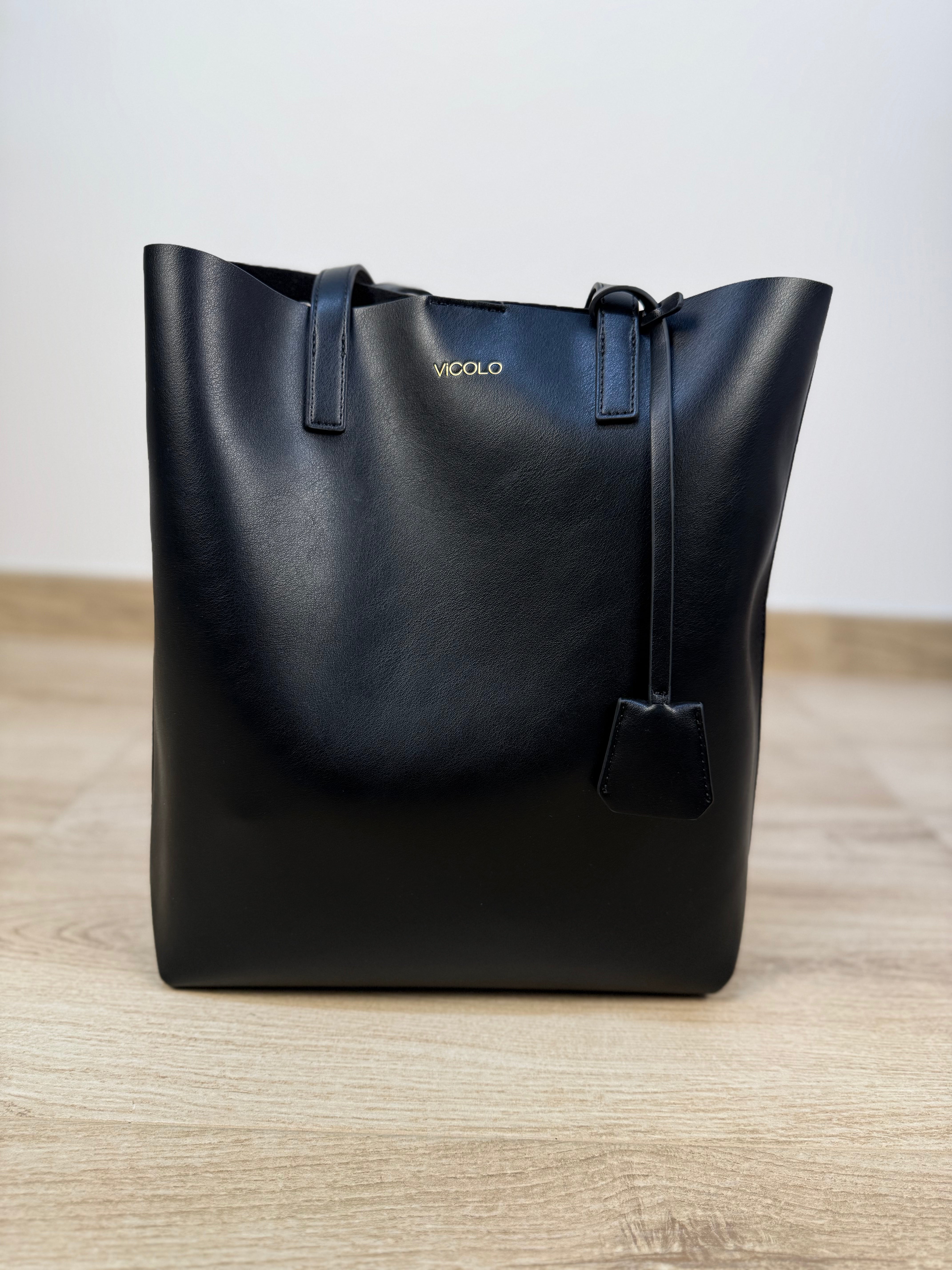 Dal design slanciato e minimal, questa tote bag Vicolo in similpelle semirigida si distingue per la sua forma verticale, ideale per chi cerca capienza senza rinunciare all’eleganza. I manici morbidi assicurano una presa comoda, mentre la chiusura con bottone a calamita garantisce praticità nell’uso quotidiano. L’interno, rivestito in morbido tessuto vellutato, protegge con stile tutto ciò che porti con te. Proposta in un’elegante versione total black, è perfetta per l’ufficio, lo shopping o le uscite di tutti i giorni.