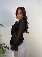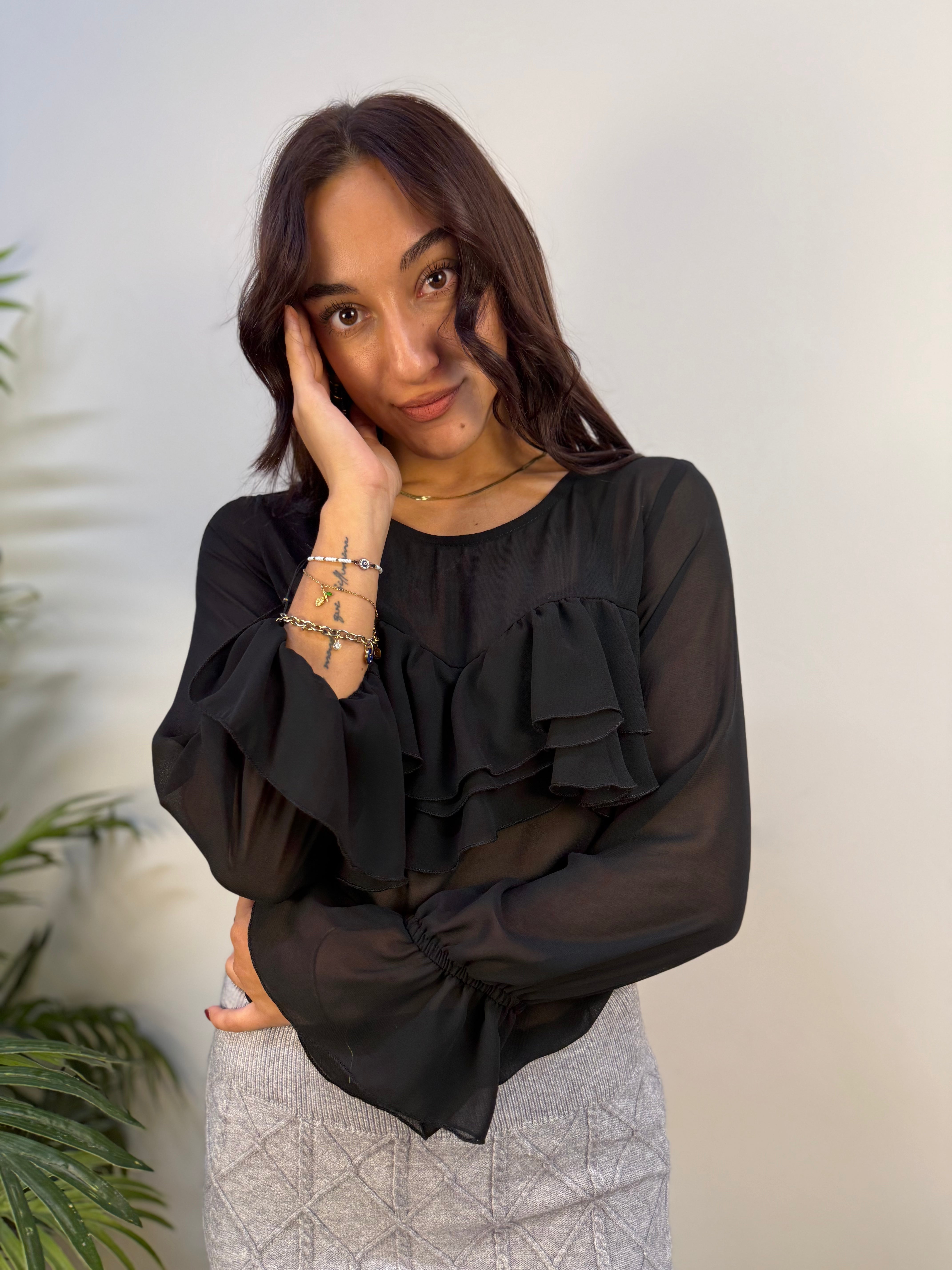 Blusa Rinascimento elegante in tessuto velato, leggermente trasparente, perfetta per look raffinati e femminili. Il tessuto fermo dona struttura al capo, mentre le balze applicate aggiungono movimento e un tocco romantico. Ideale da abbinare a pantaloni o gonne a vita alta per un effetto sofisticato, sia di giorno che di sera.