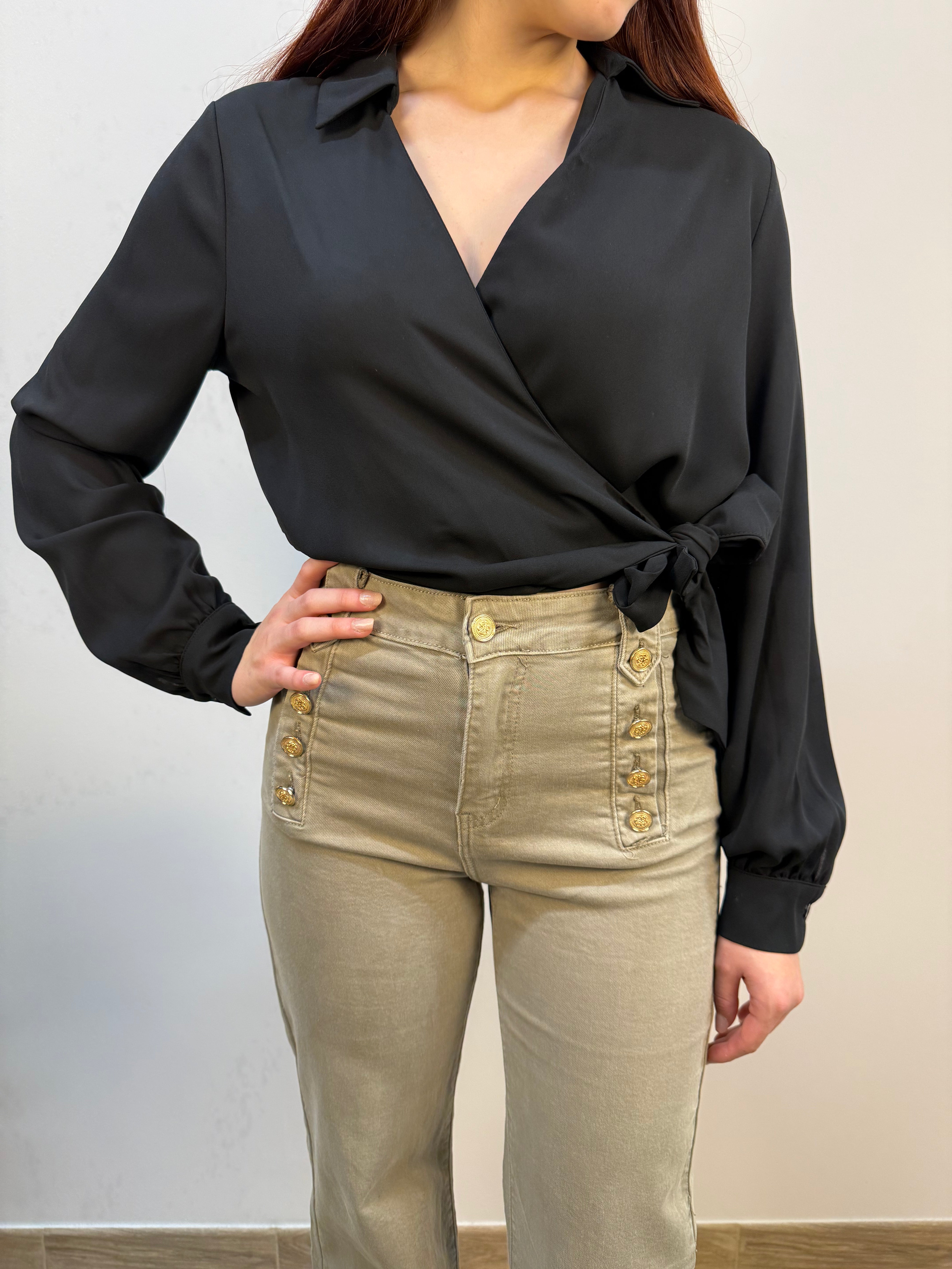 Blusa Akè leggera e femminile in tessuto velato, caratterizzata da uno scollo a V che valorizza la silhouette. Il colletto a camicia aggiunge un tocco classico e raffinato al design. La chiusura ad intreccio sul fianco si chiude delicatamente con un fiocco, donando movimento e originalità al capo. Il fondo è arricchito da un elastico che assicura una vestibilità confortevole e aderente, mentre i bottoni ai polsini completano il look con un dettaglio curato e sofisticato.