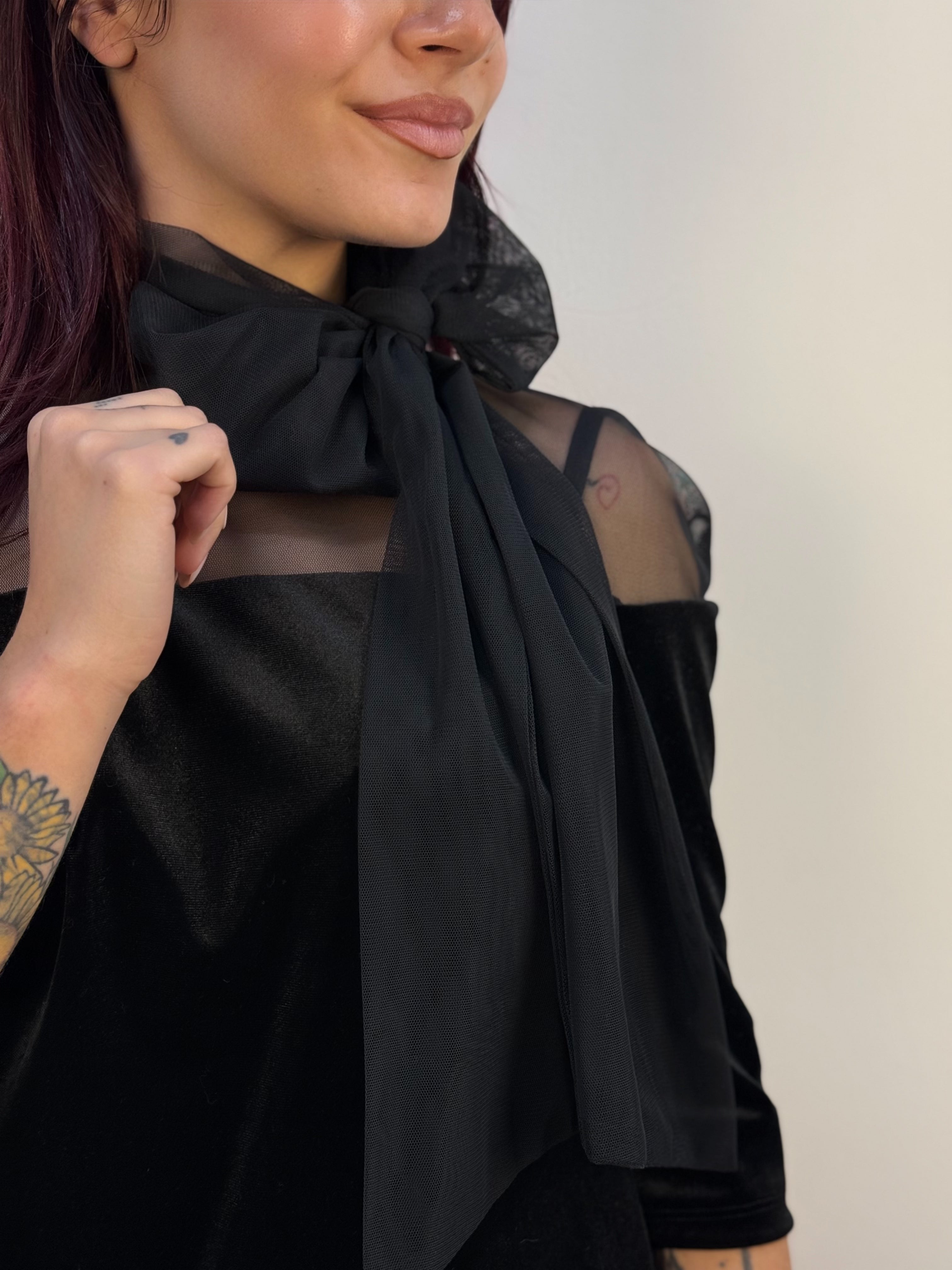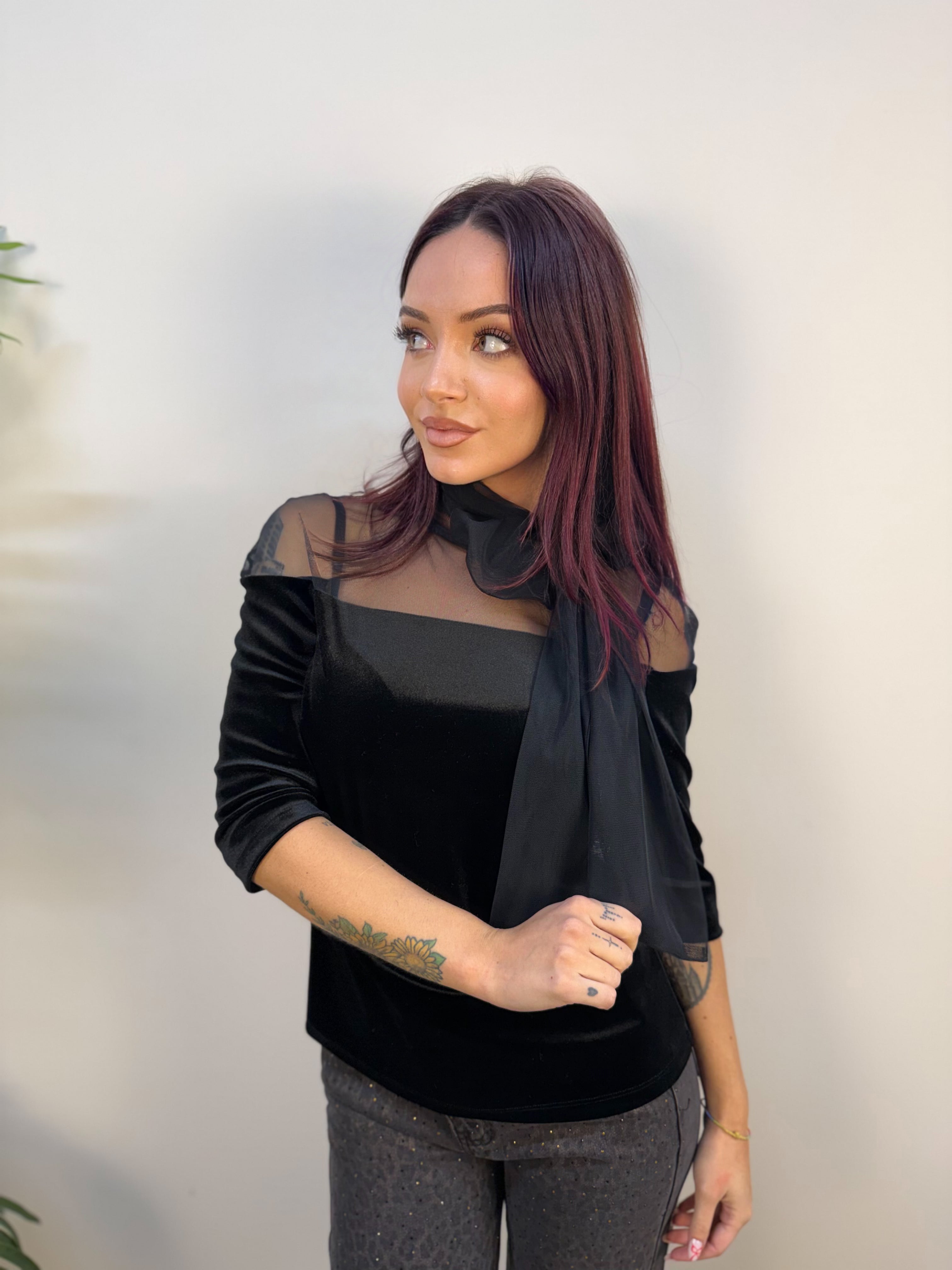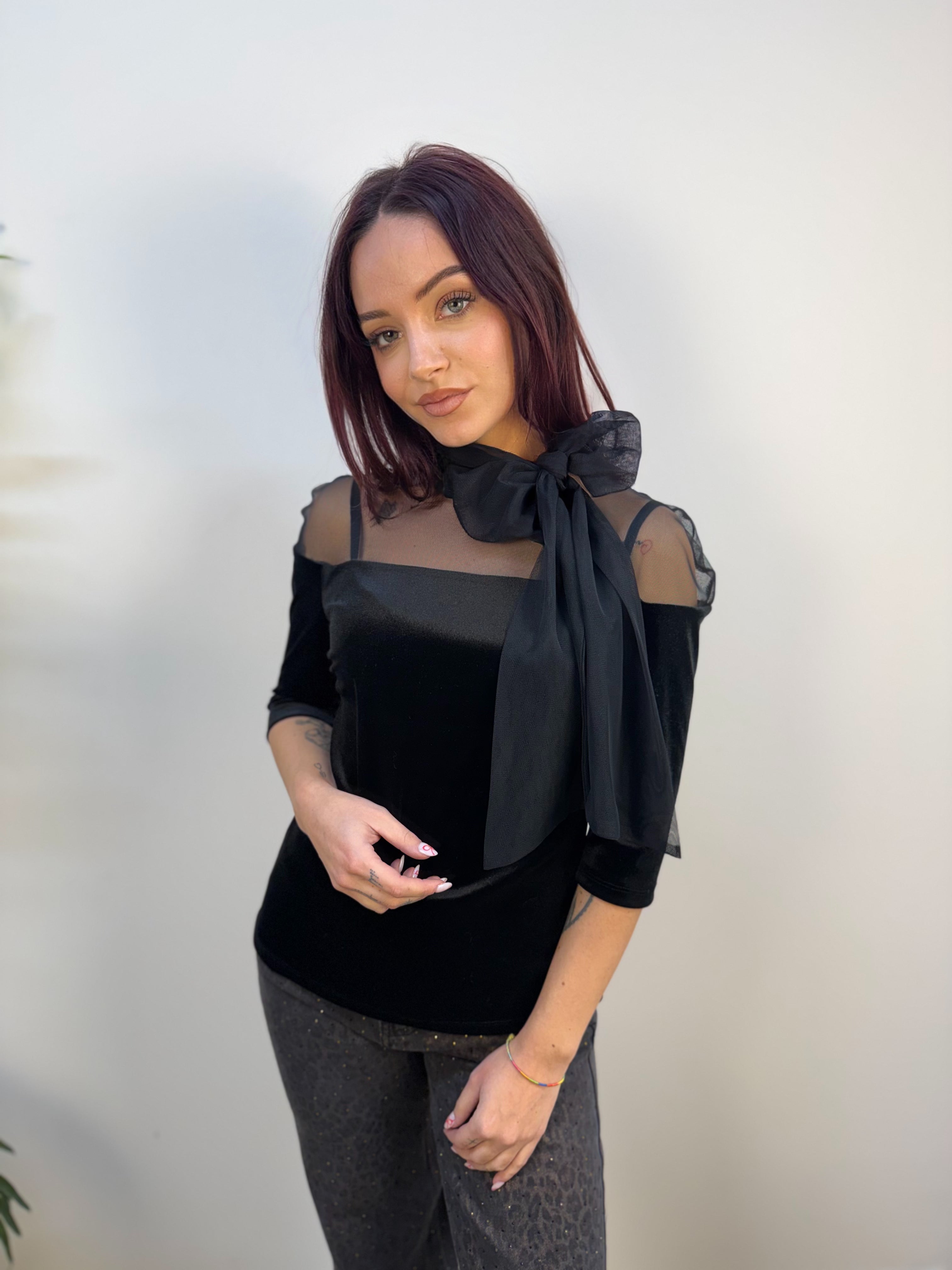 Blusa RINASCIMENTO con doppio tessuto, la parte che interessa il decolletè è in velo, mentre la parte principale è in velluto. Dettaglio fiocco nel colletto.