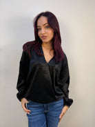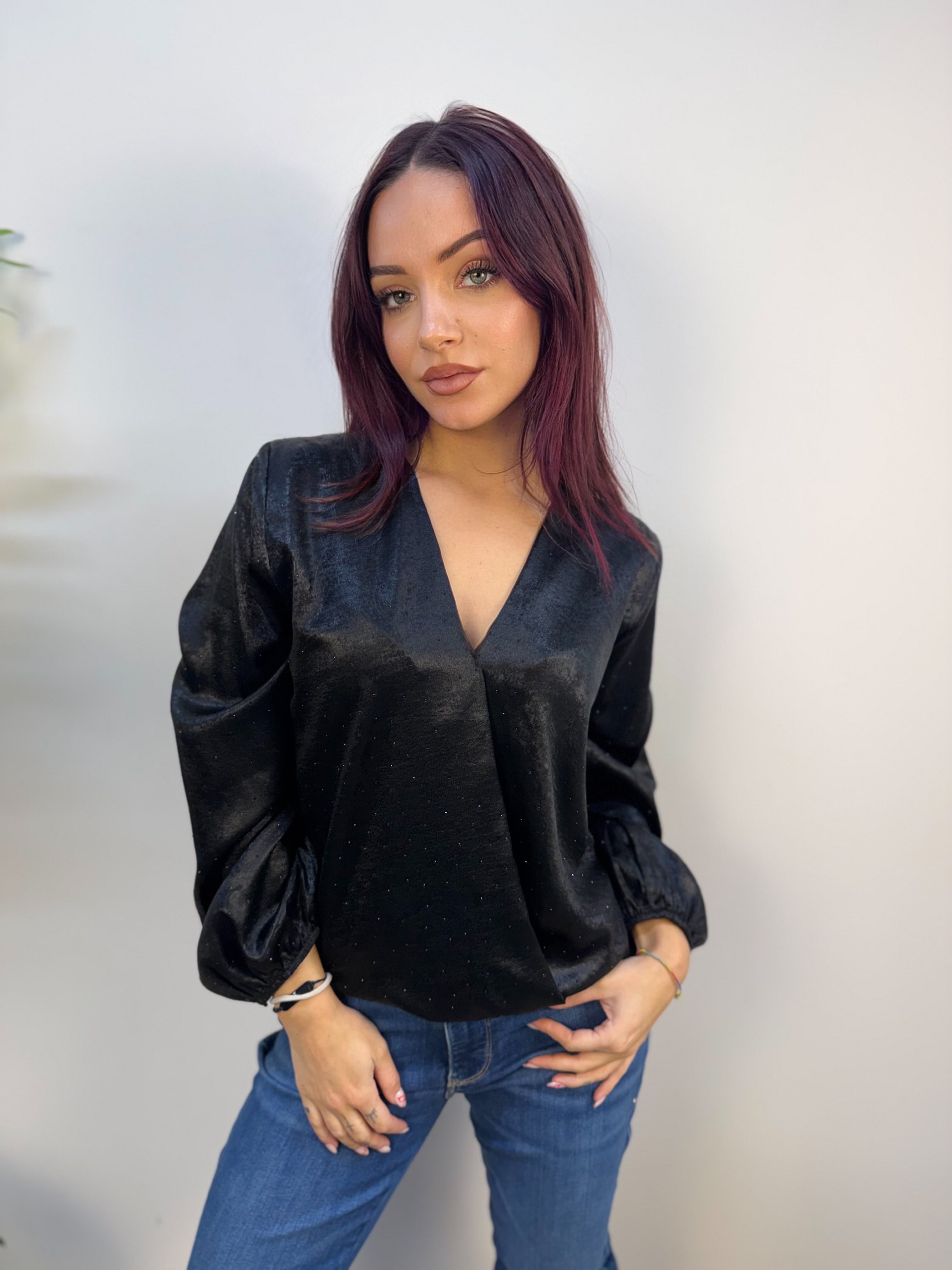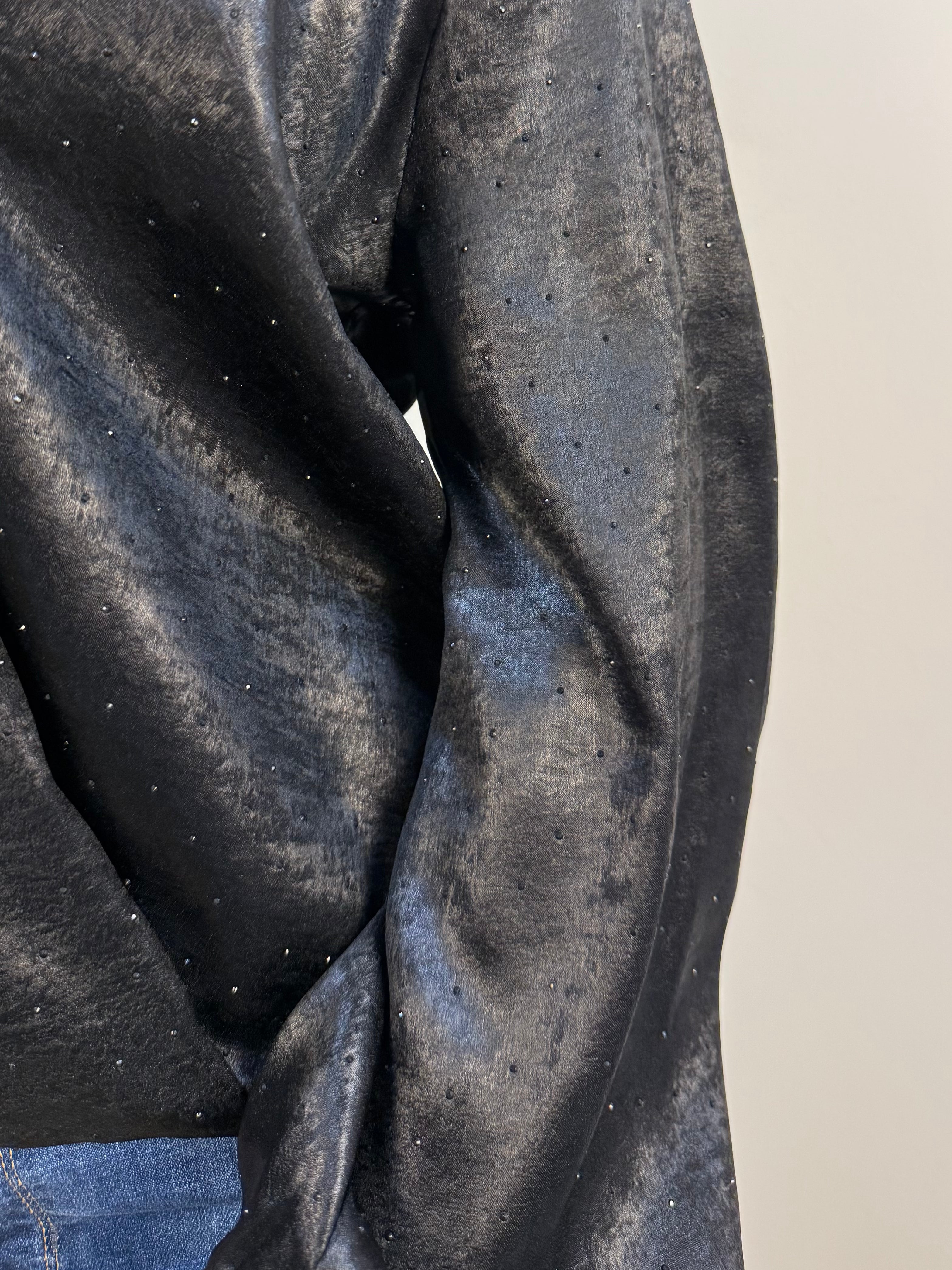 Blusa ARTIGLI in tessuto effetto metallizzato, ricoperta di strass tono su tono fronte e retro. Scollo a V ed elastico sui polsini delle maniche e sul bordo per enfatizzare l'effetto "sblusato".