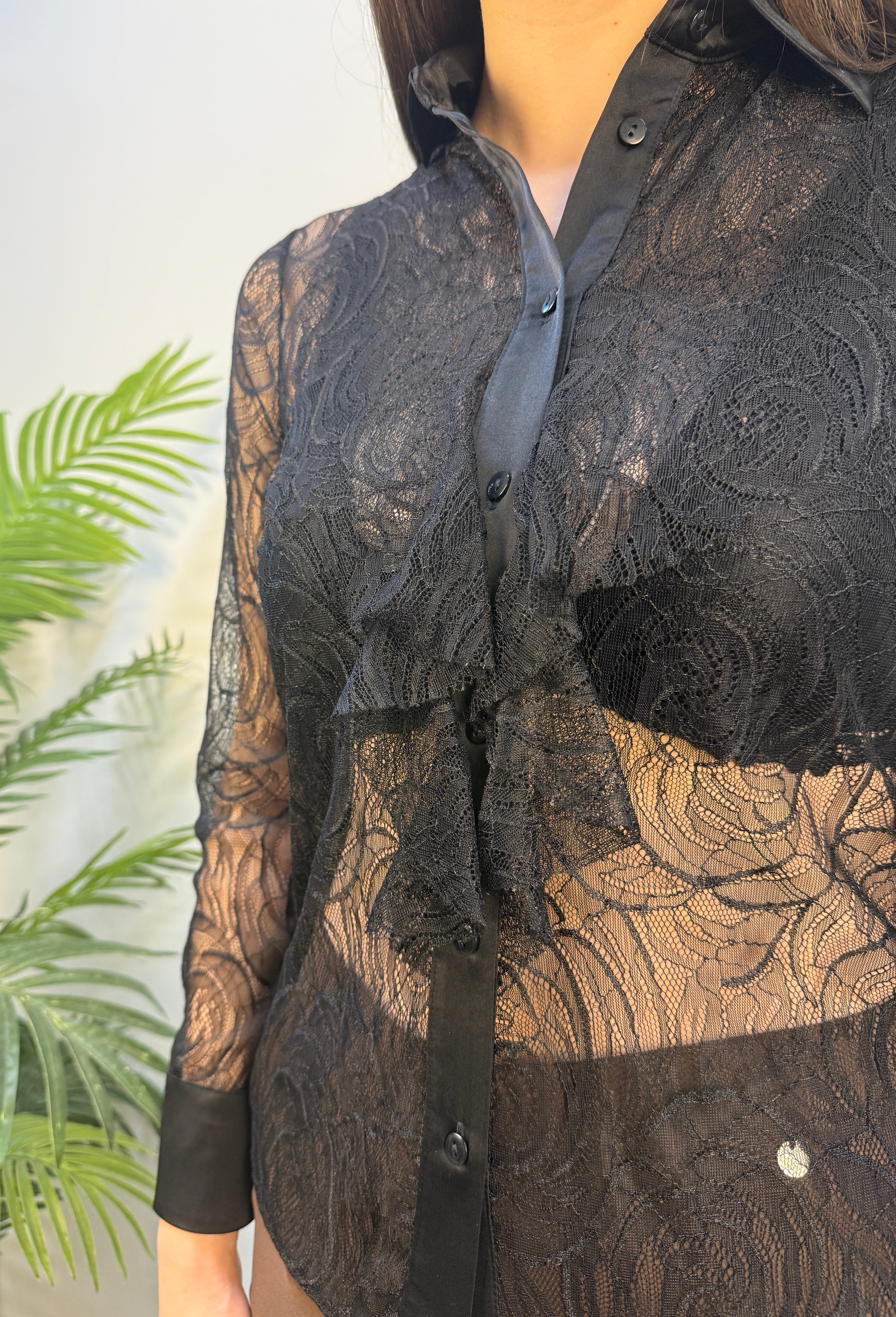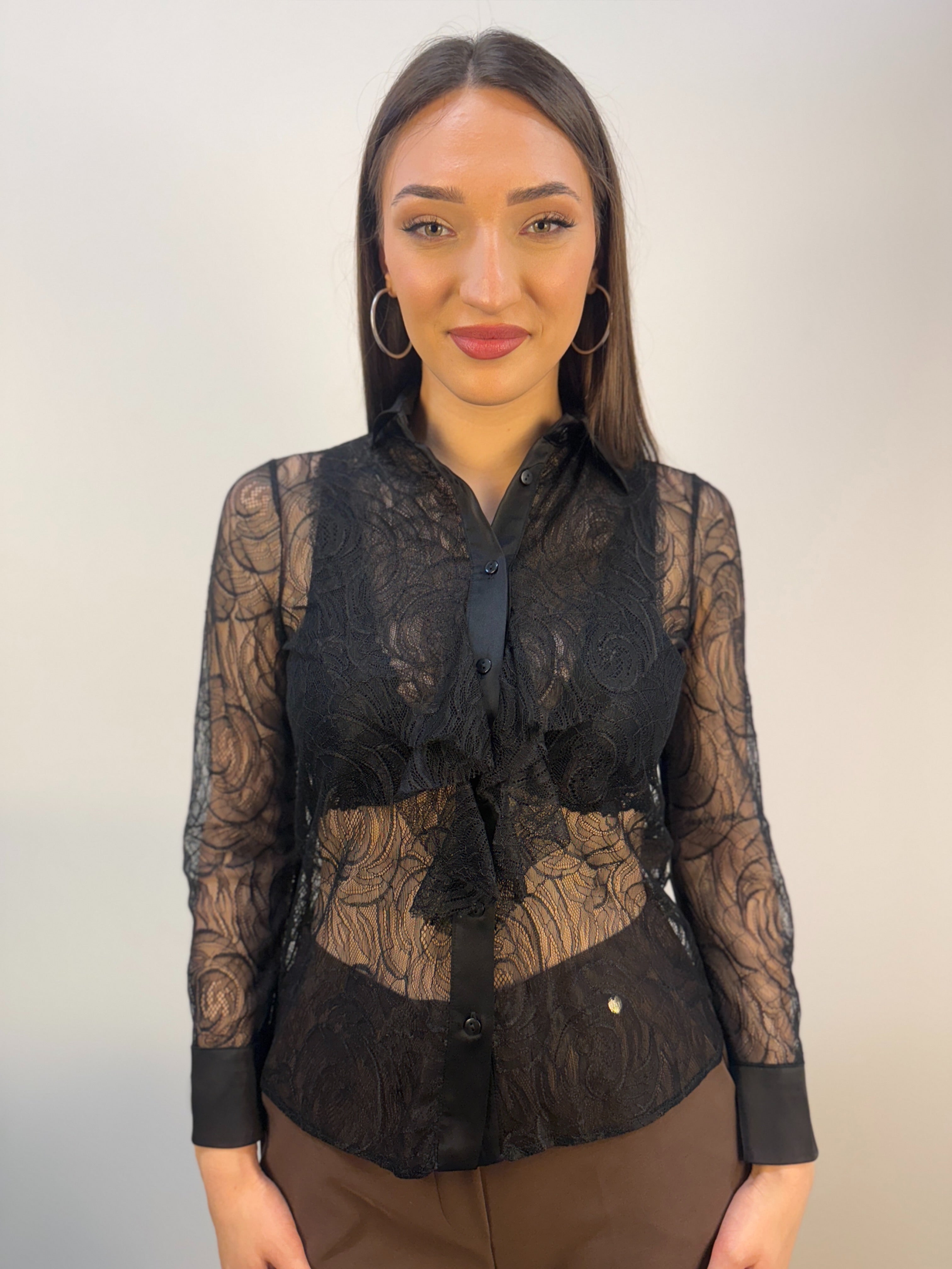 Femminile e sofisticata, questa camicia Artigli gioca con trasparenze delicate e materiali ricercati. Gli inserti in pizzo e raso, tono su tono, creano un raffinato contrasto di texture, mentre una balza sottile segna con grazia il décolleté, donando movimento al capo. La chiusura frontale presenta bottoni ad asola tono su tono, discreti ed eleganti, mentre i polsini sono impreziositi da bottoni logati in oro, che aggiungono un tocco di luce e personalità. Perfetta per look da sera o per occasioni speciali in cui ogni dettaglio fa la differenza.