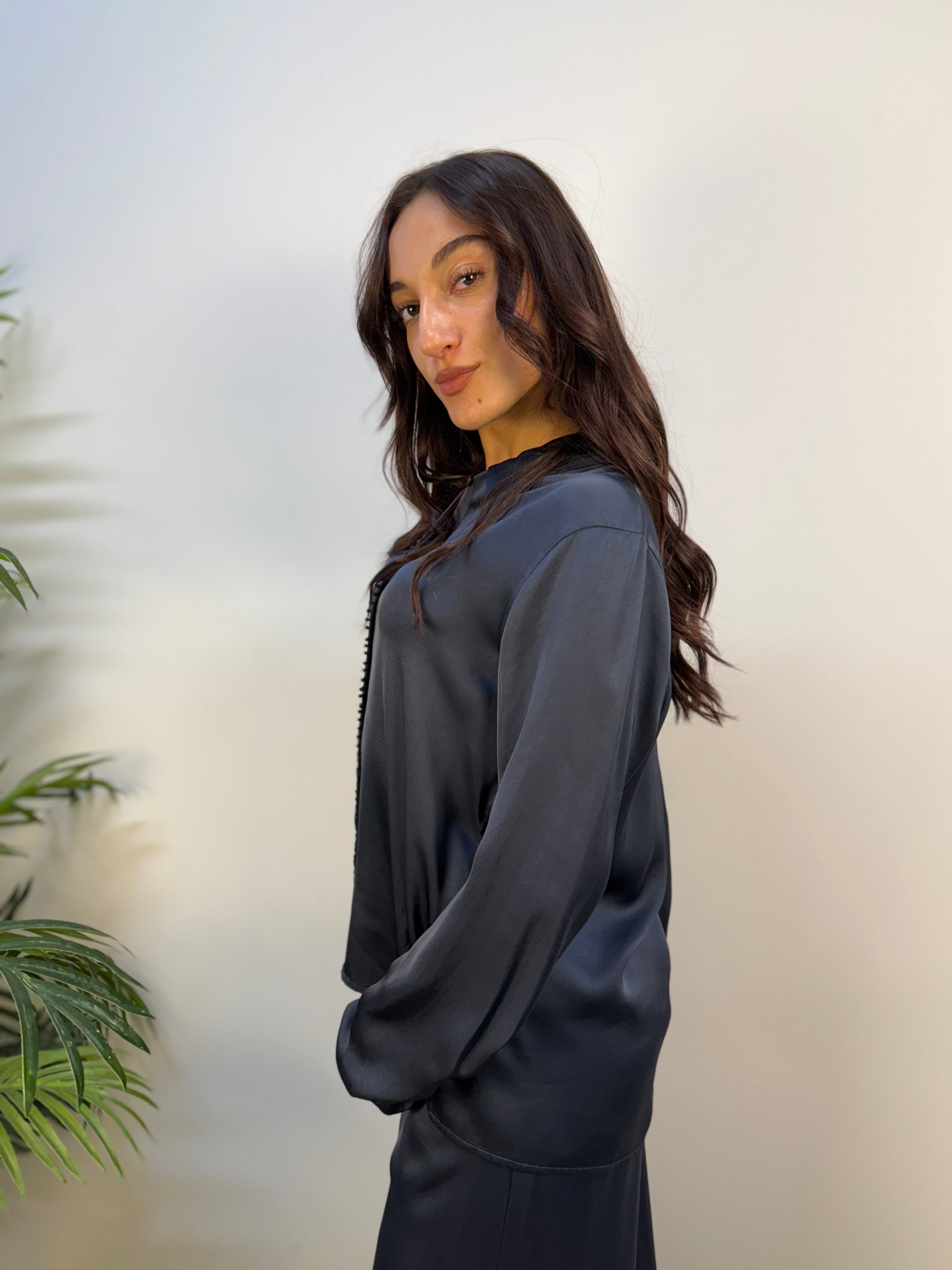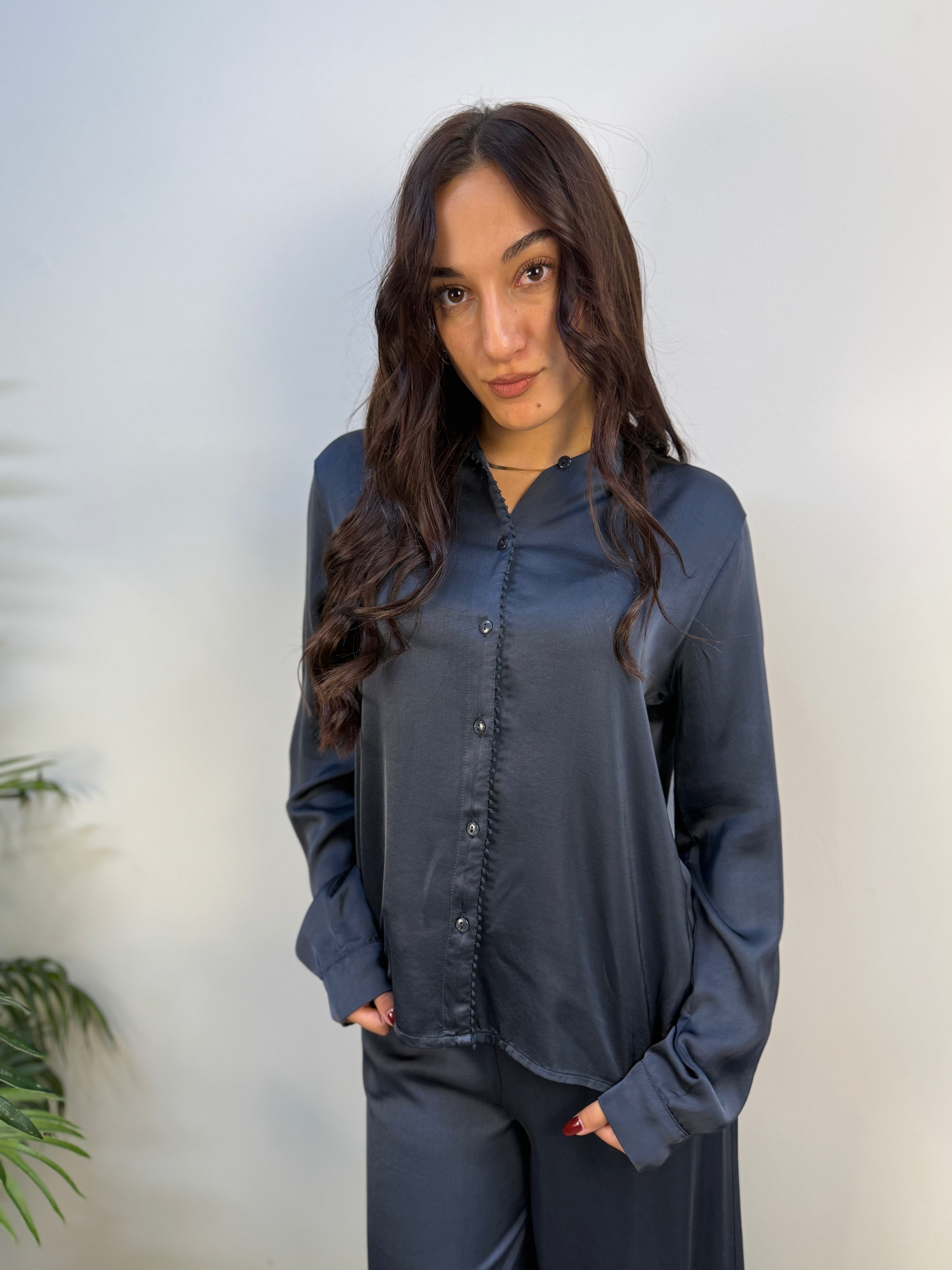Camicia Susy Mix in viscosa effetto raso, dal tessuto morbido e fluido che cade con eleganza, perfetta per un look raffinato e sofisticato. La patta con bottoni è arricchita da pallini decorativi in tessuto, un dettaglio originale e delicato, mentre i bottoni tono su tono ad asola completano il capo con discrezione e stile. Un modello ideale per chi cerca un capo versatile, elegante e dal design ricercato.