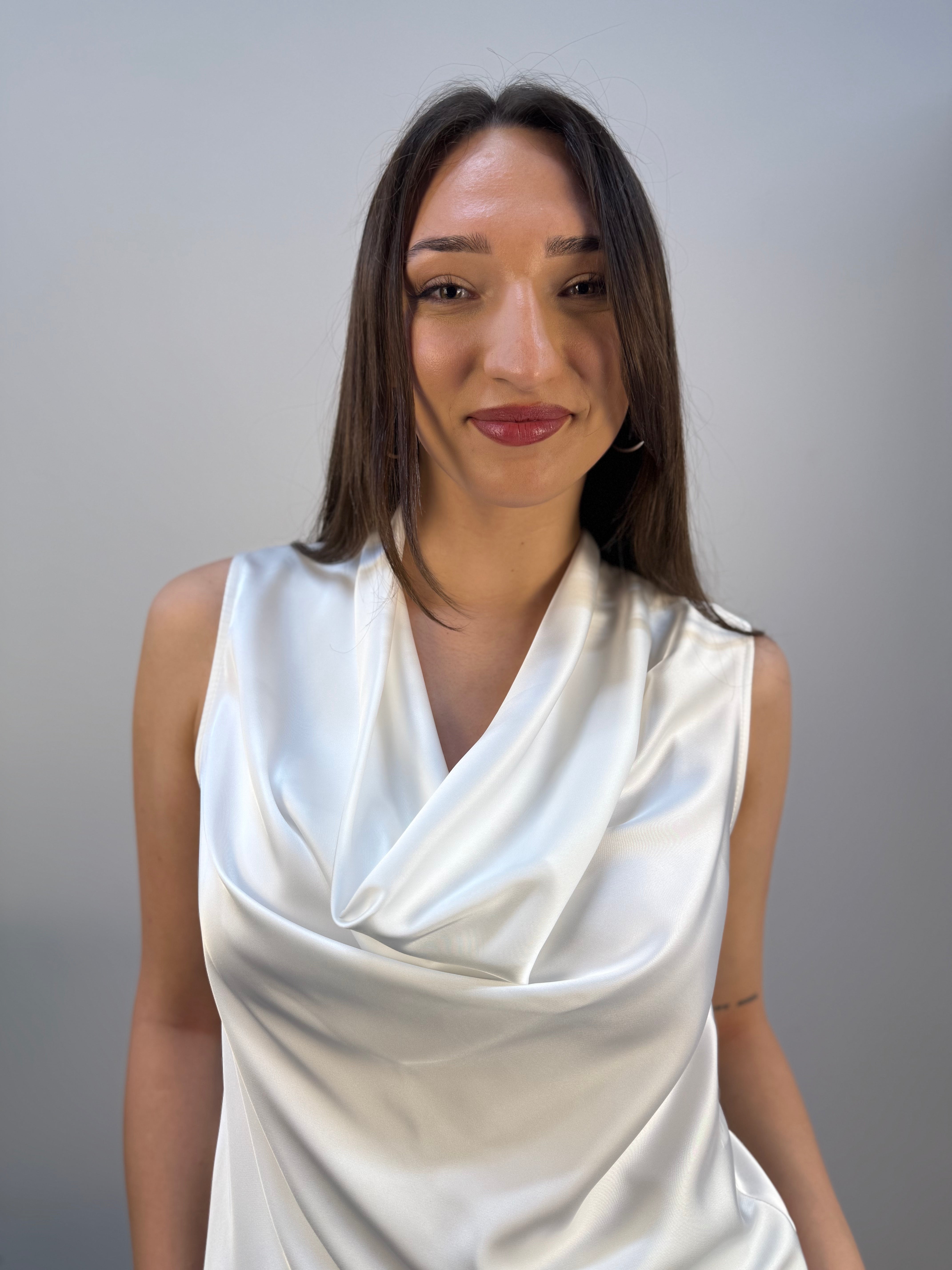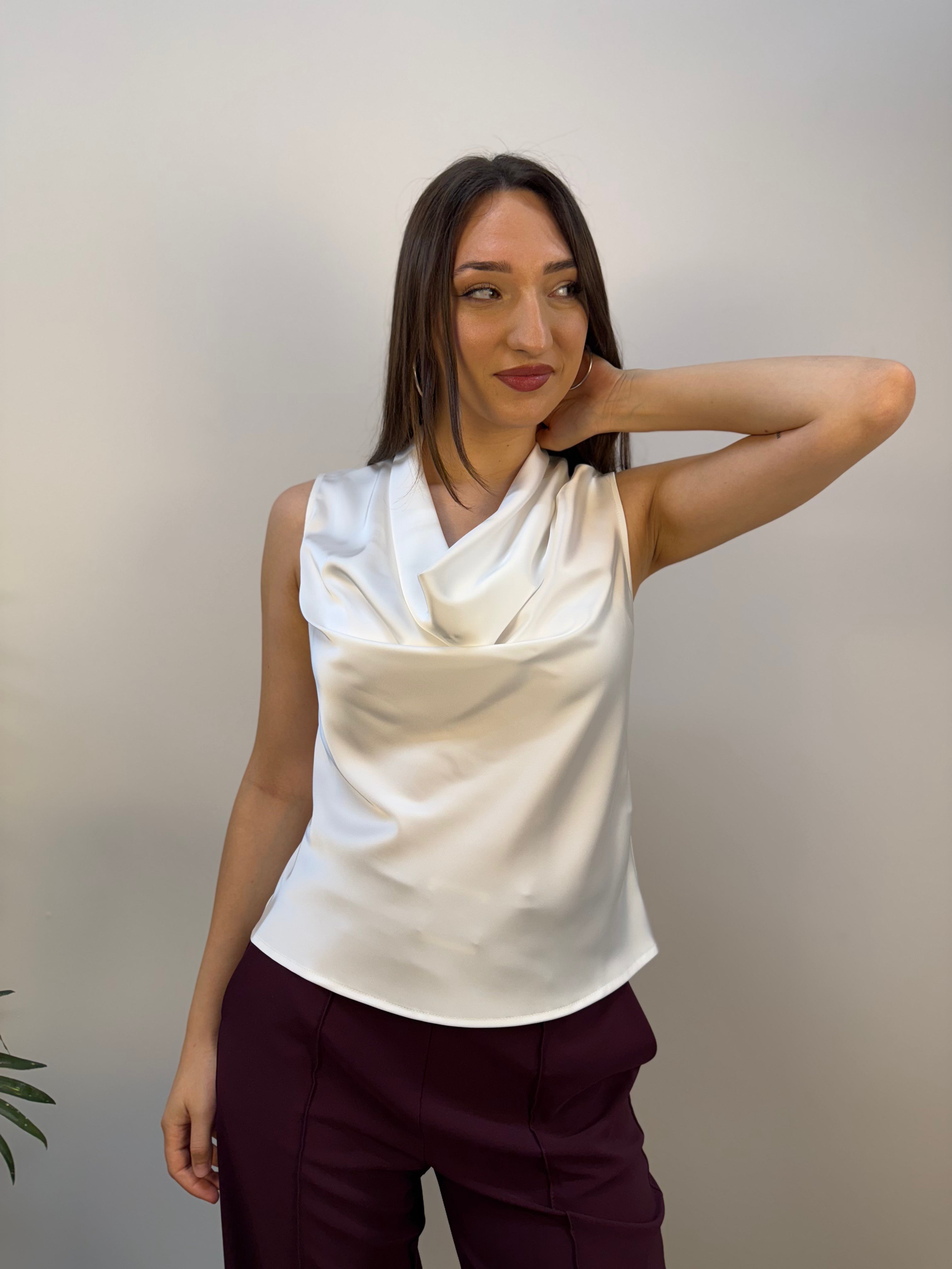 Canotta Rinascimento raffinata in raso bianco dal finish luminoso, caratterizzata da un elegante scollo drappeggiato che valorizza il décolleté con delicatezza. Il design semplice ma sofisticato la rende un capo estremamente versatile: perfetta da indossare da sola per un look minimal chic, oppure sotto giacche e blazer per un tocco femminile e luminoso. Ideale per completare outfit eleganti o formali con discrezione e stile.