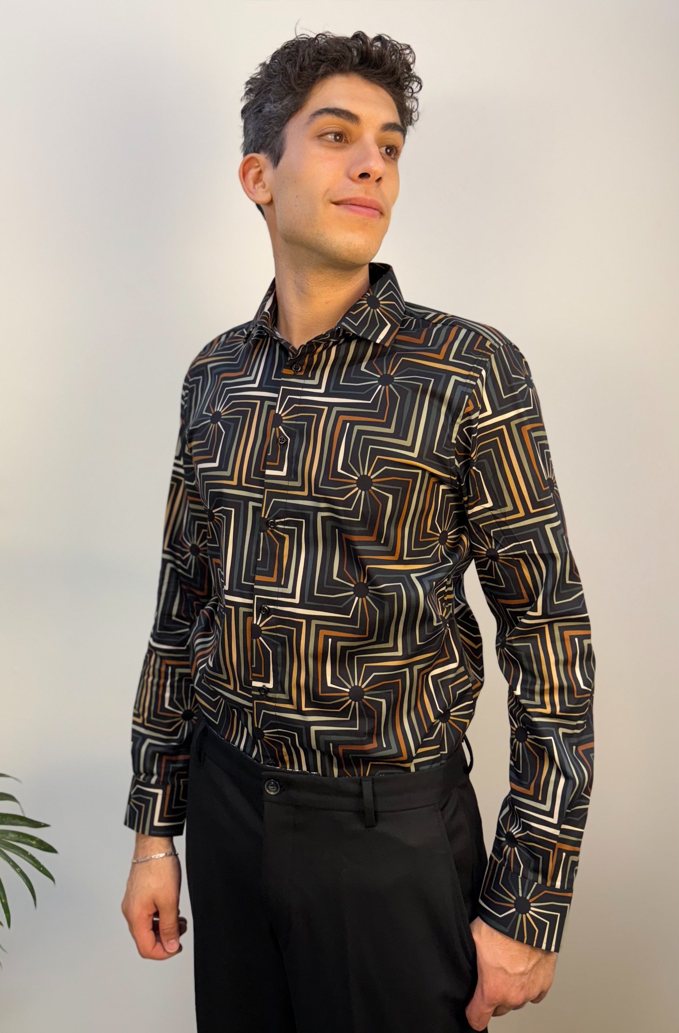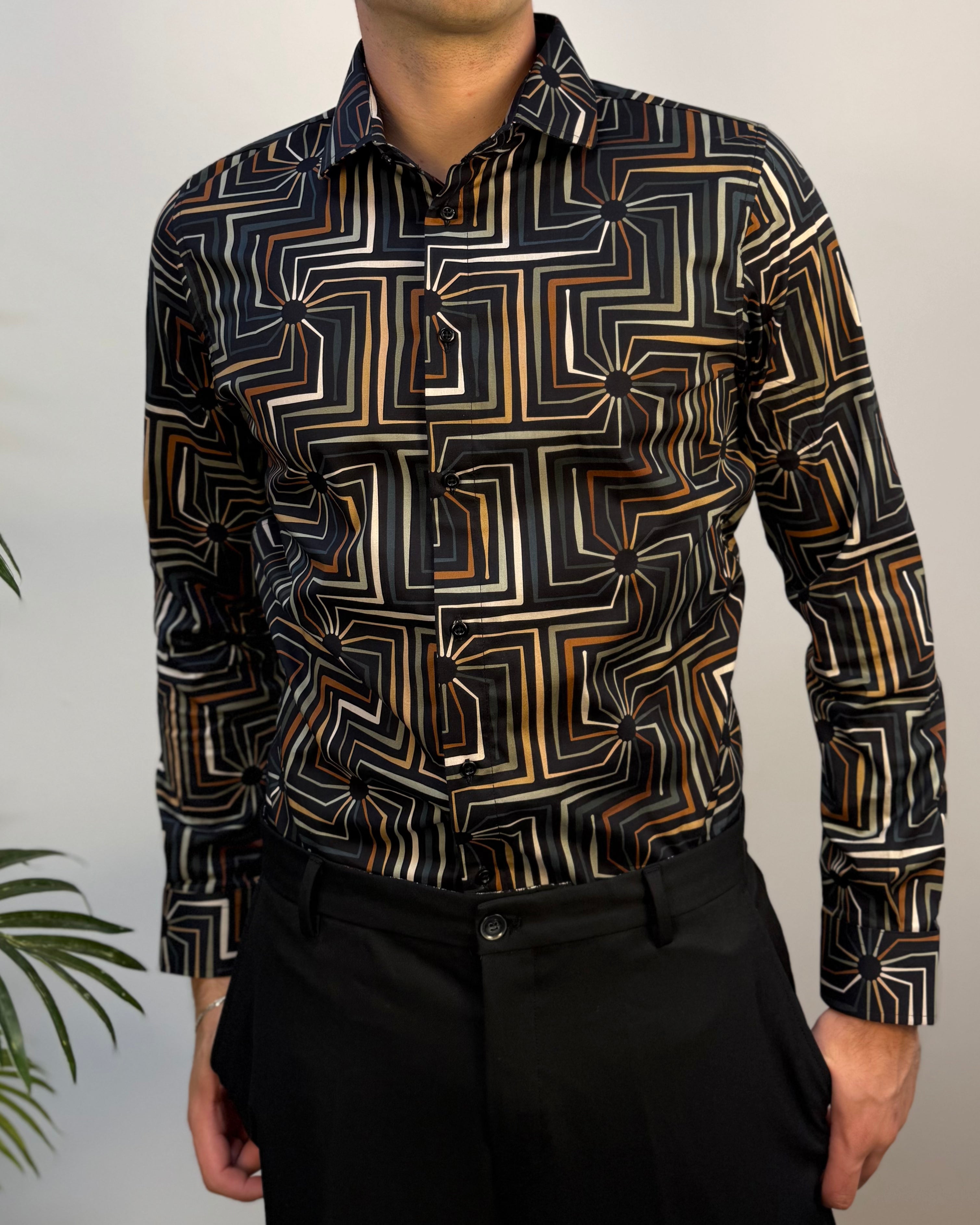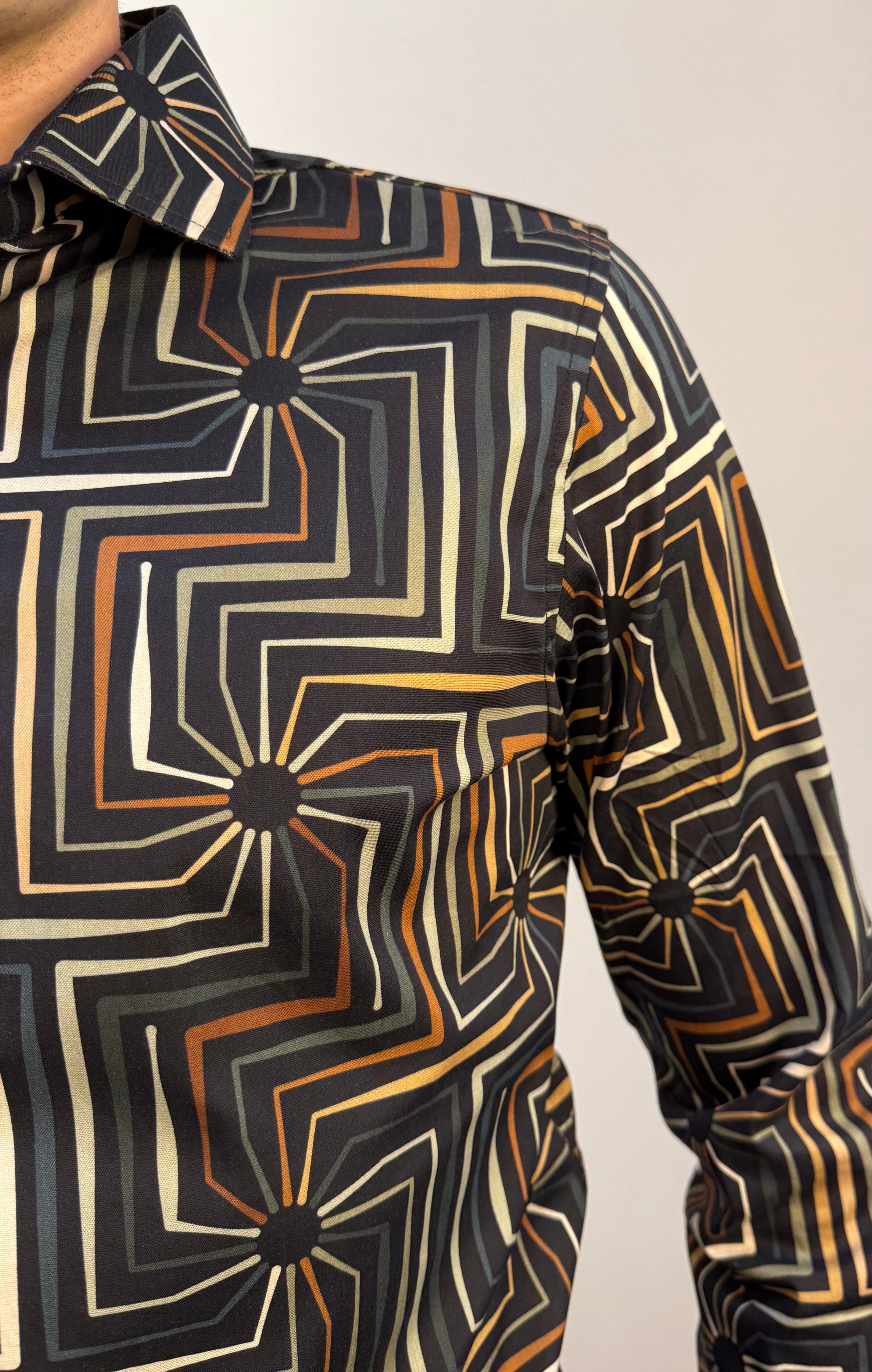 Decisa e contemporanea, questa camicia Karl Mommoo Made in Italy si distingue per la sua fantasia geometrica nei toni del verde, giallo e mattone su base nera, un mix di colori raffinato e di tendenza. Realizzata in tessuto leggero e morbido, offre una vestibilità moderna e confortevole, ideale per look dal carattere distintivo ma sempre eleganti. Perfetta da abbinare a capi neutri per far risaltare la fantasia con equilibrio.