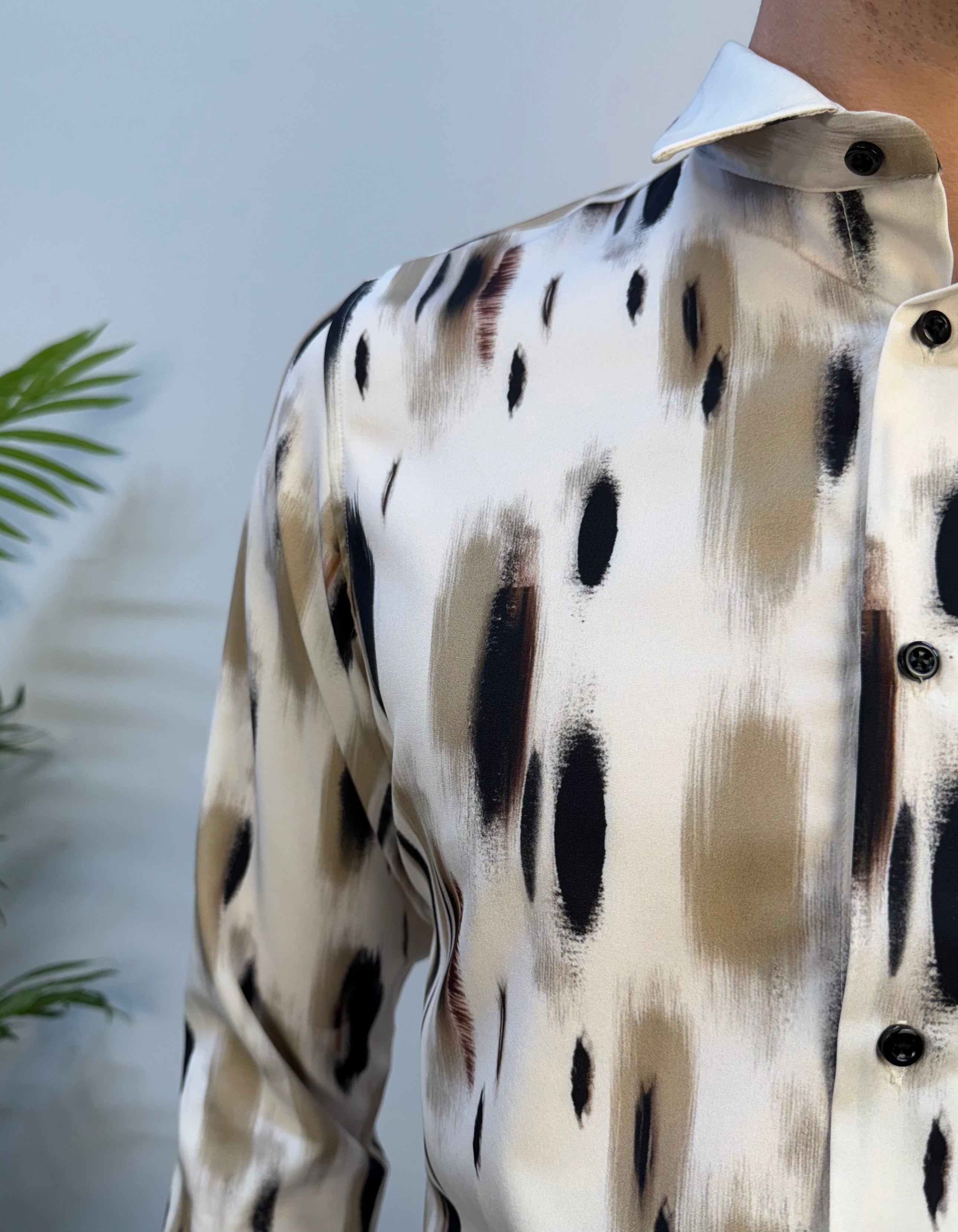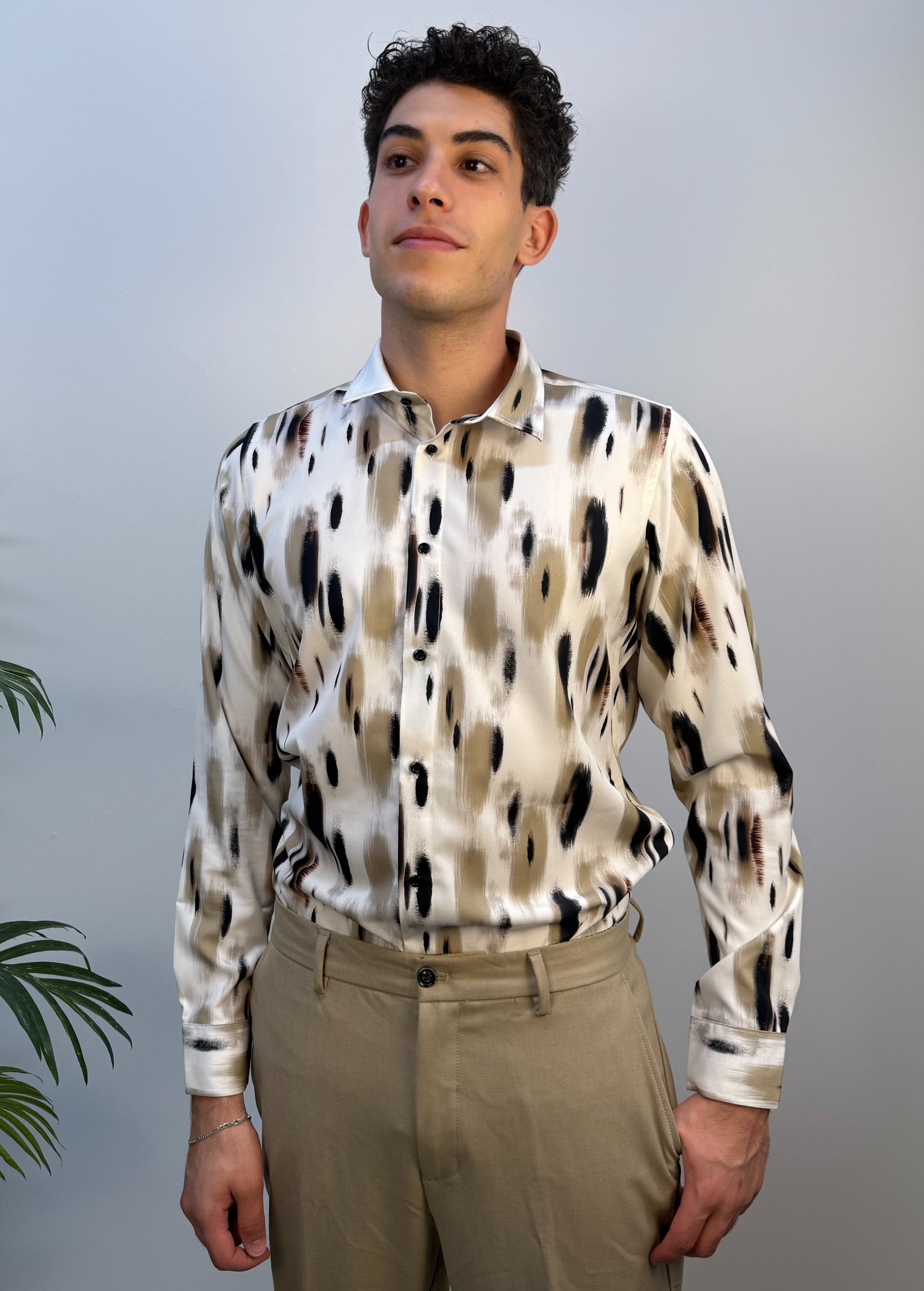 Un equilibrio perfetto tra eleganza e leggerezza. Questa camicia Karl Mommoo in tessuto leggero e delicato, interamente Made in Italy, offre una sensazione di comfort e raffinatezza in ogni occasione. La fantasia nei toni del verde, nero e marrone crea un effetto sofisticato e contemporaneo, ideale per chi ama distinguersi con stile senza rinunciare alla versatilità. Facile da abbinare sia a pantaloni classici che a denim, è il capo ideale per la stagione e per un look curato ma naturale.