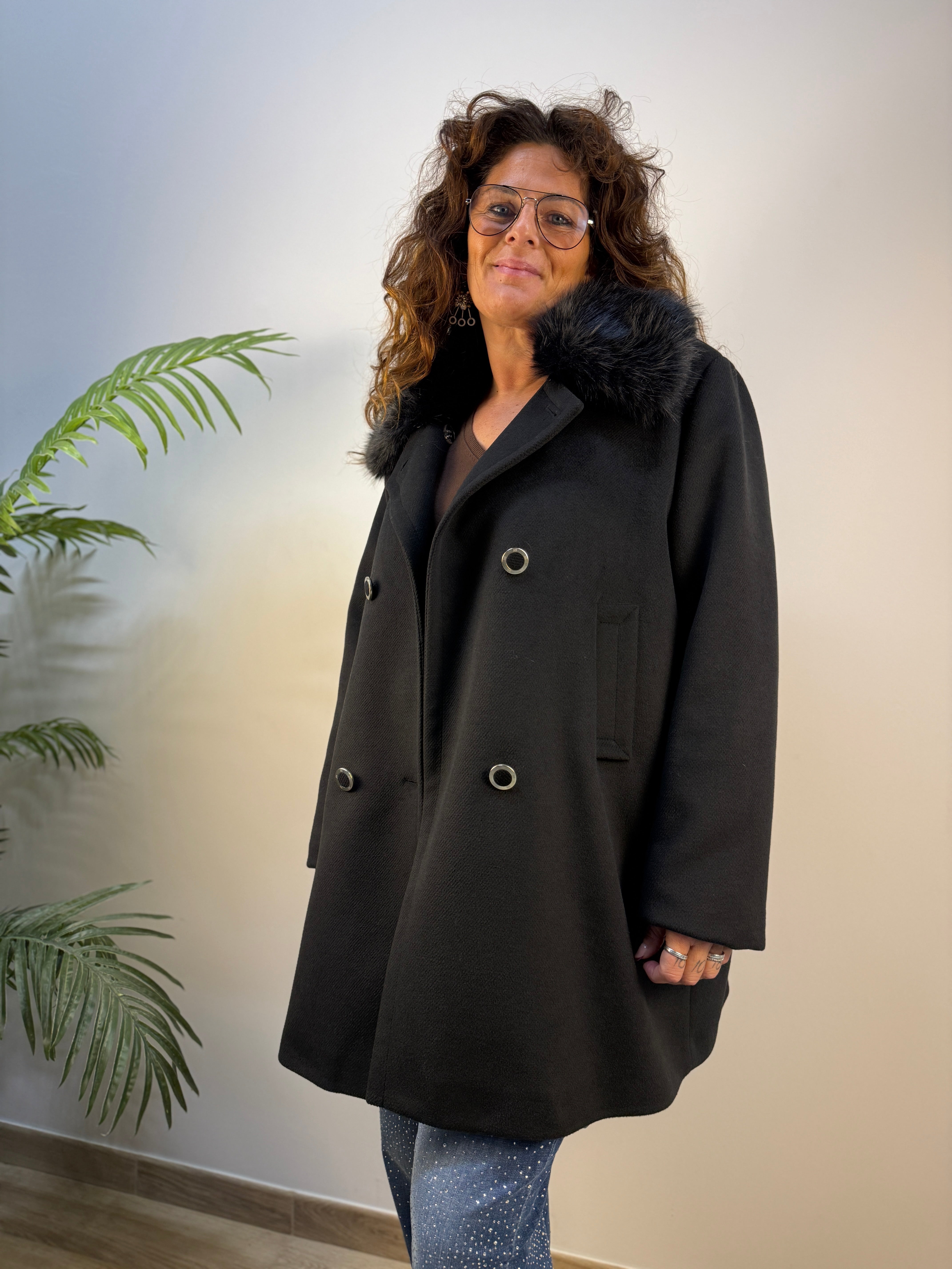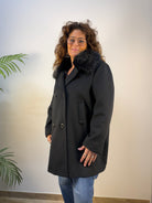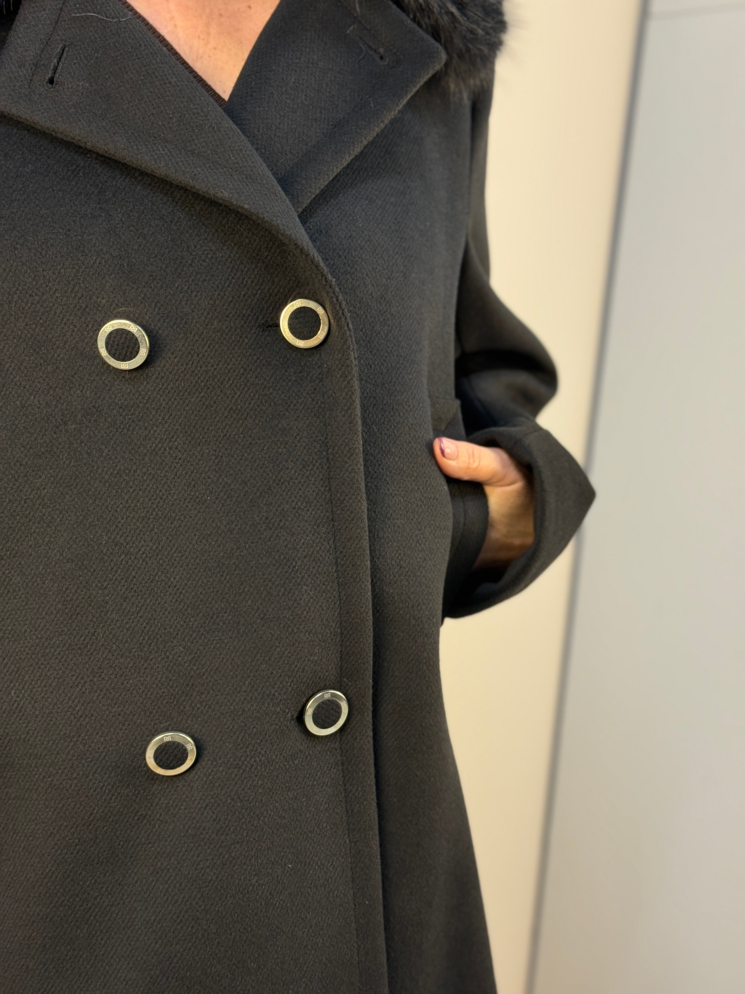 Cappotto Rinascimento elegante e raffinato con pelliccia removibile tono su tono. Chiusura doppiopetto con bottoni metallici logati oro e tasche frontali dallo stile pulito ed elegante. Un capo caldo e sofisticato, perfetto per un look chic in ogni occasione.