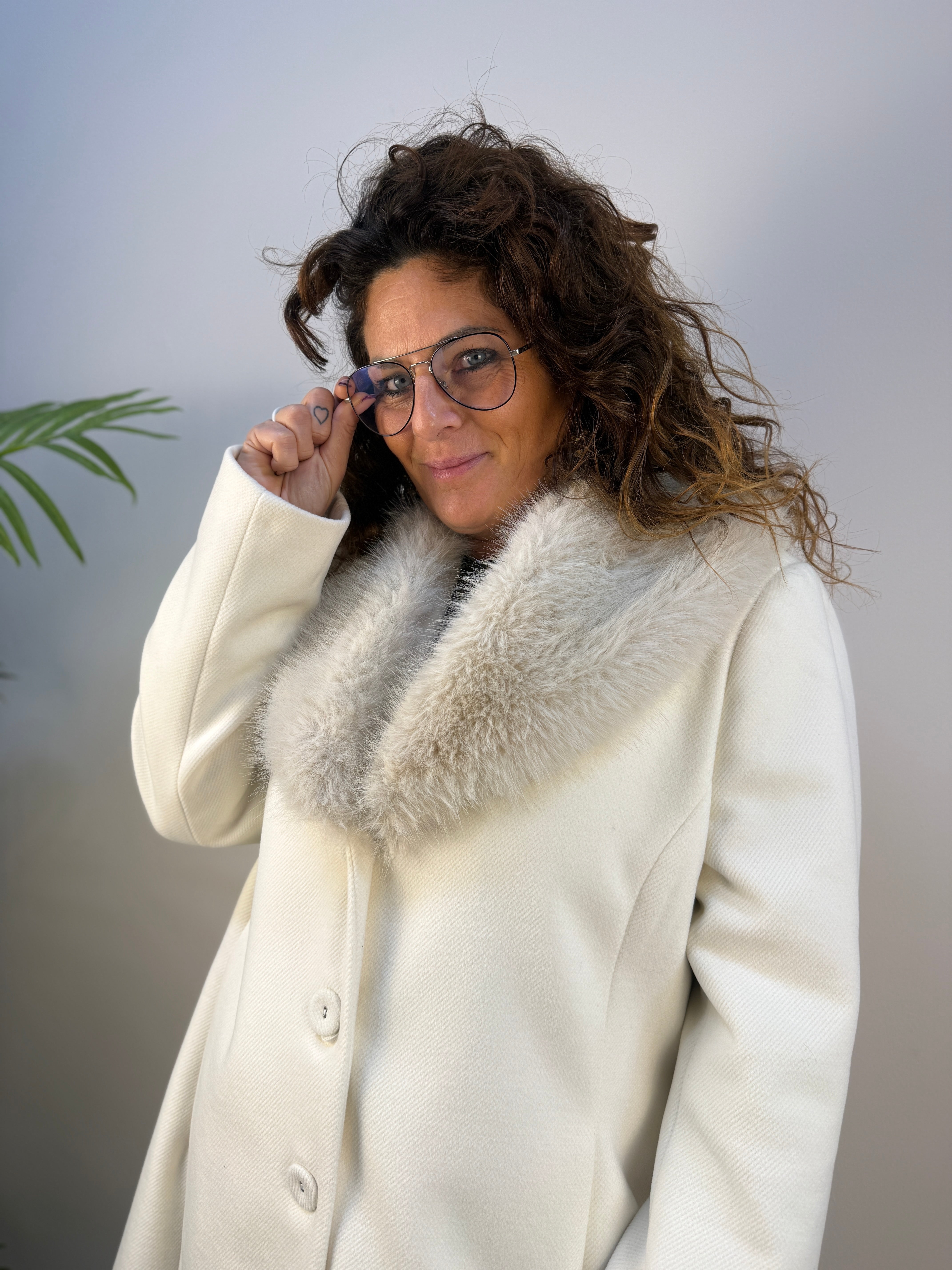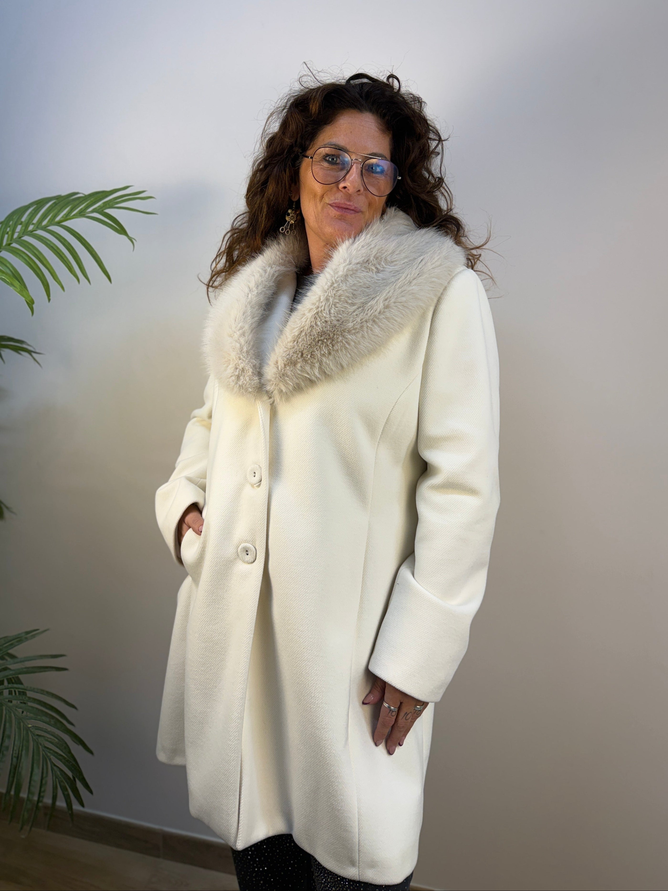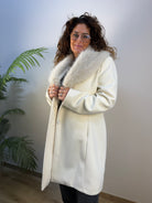 Cappotto Rinascimento elegante e raffinato, impreziosito da ecopelliccia removibile. La chiusura frontale è realizzata con tre bottoni ad asola in tessuto tono su tono. Dotato di tasche frontali, unisce stile e funzionalità per un look sofisticato.