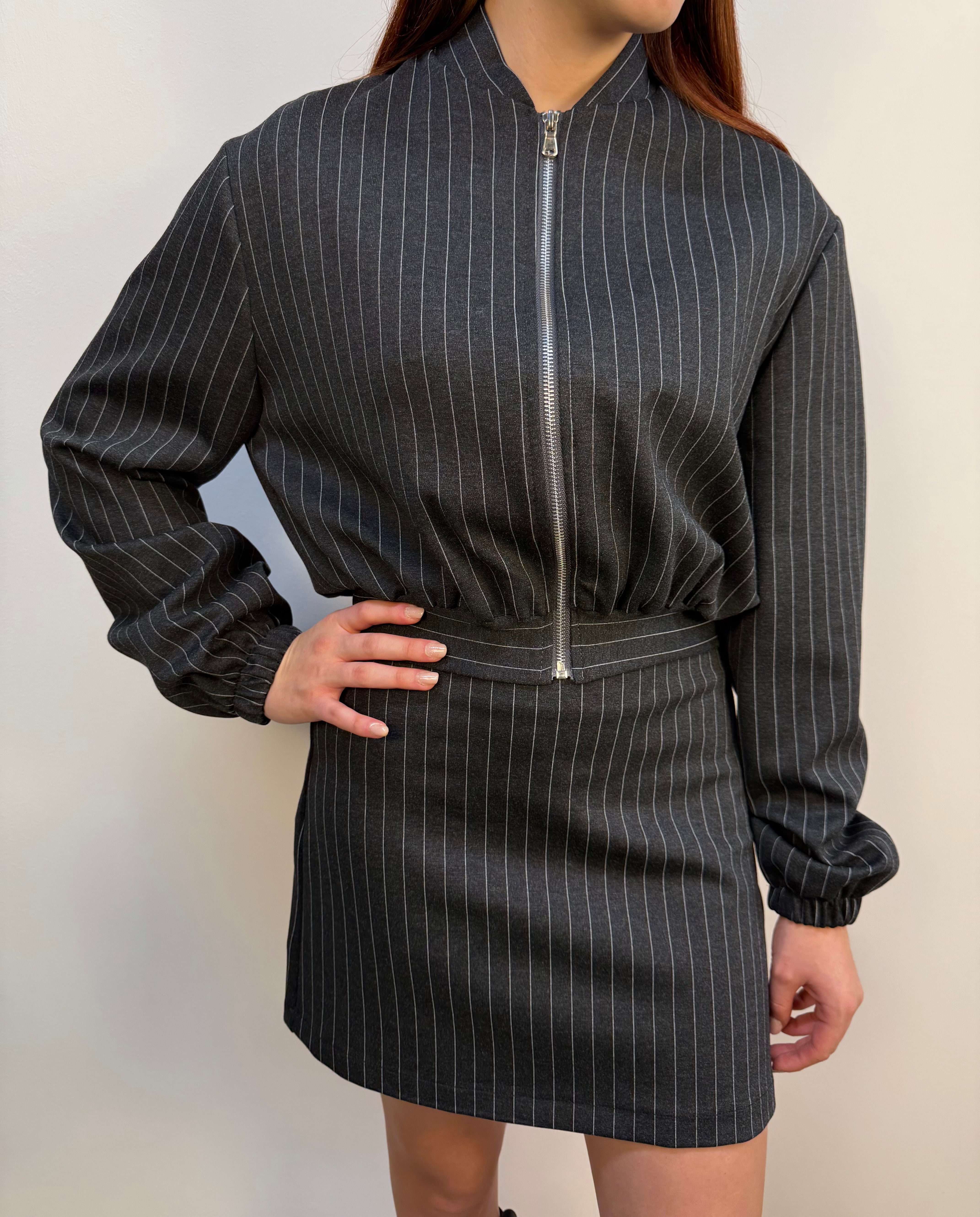 Felpa Akè stile bomber cropped realizzata in tessuto elasticizzato con trama gessata in tonalità grigio scuro, perfetta per un look moderno e sofisticato. La fodera interna garantisce calore e comfort, ideale per le giornate più fresche. La chiusura frontale è con zip in metallo color argento, mentre polsini e fascione elasticizzati assicurano una vestibilità aderente e confortevole. Un capo versatile che unisce stile e praticità in un design contemporaneo.