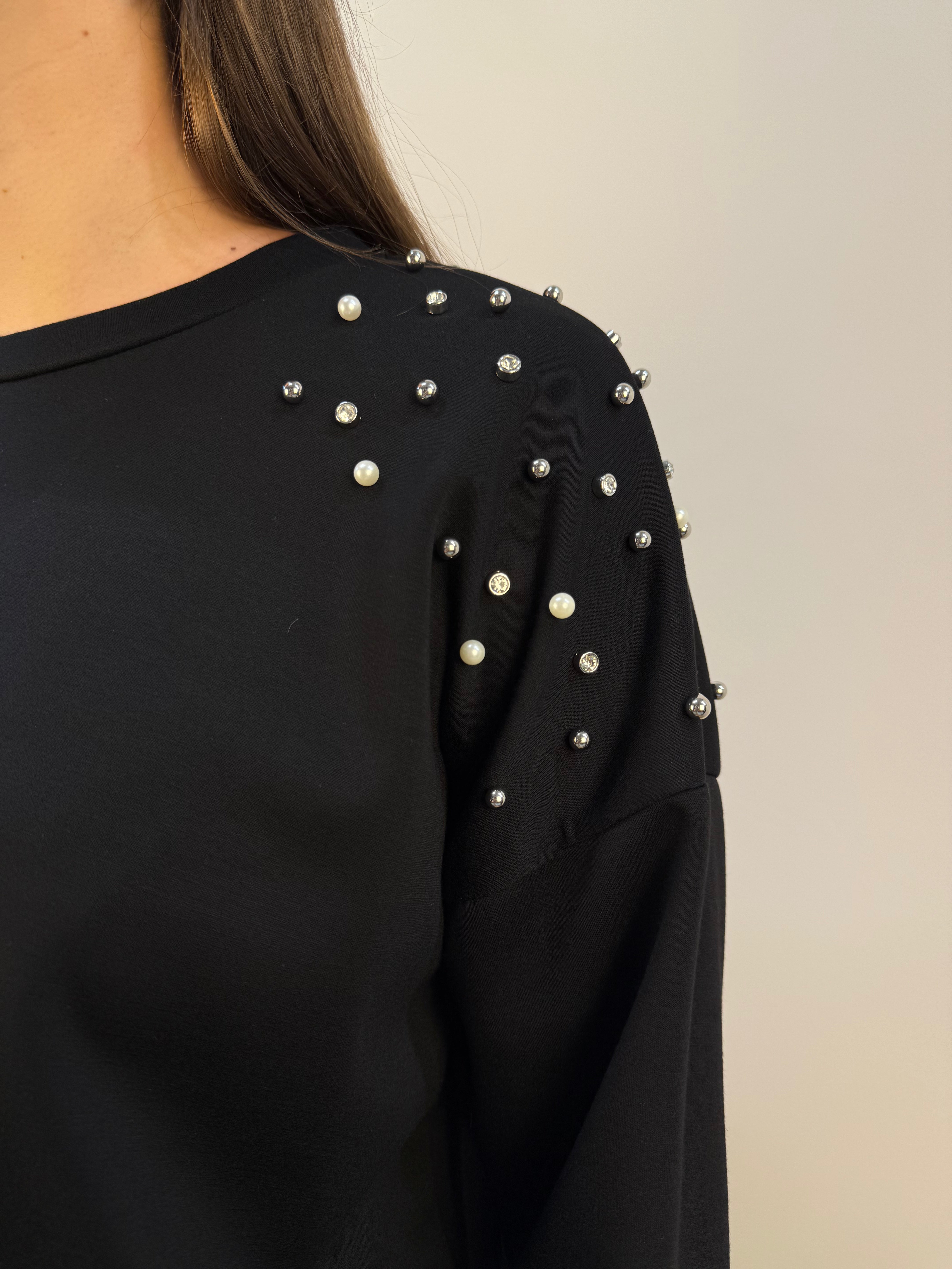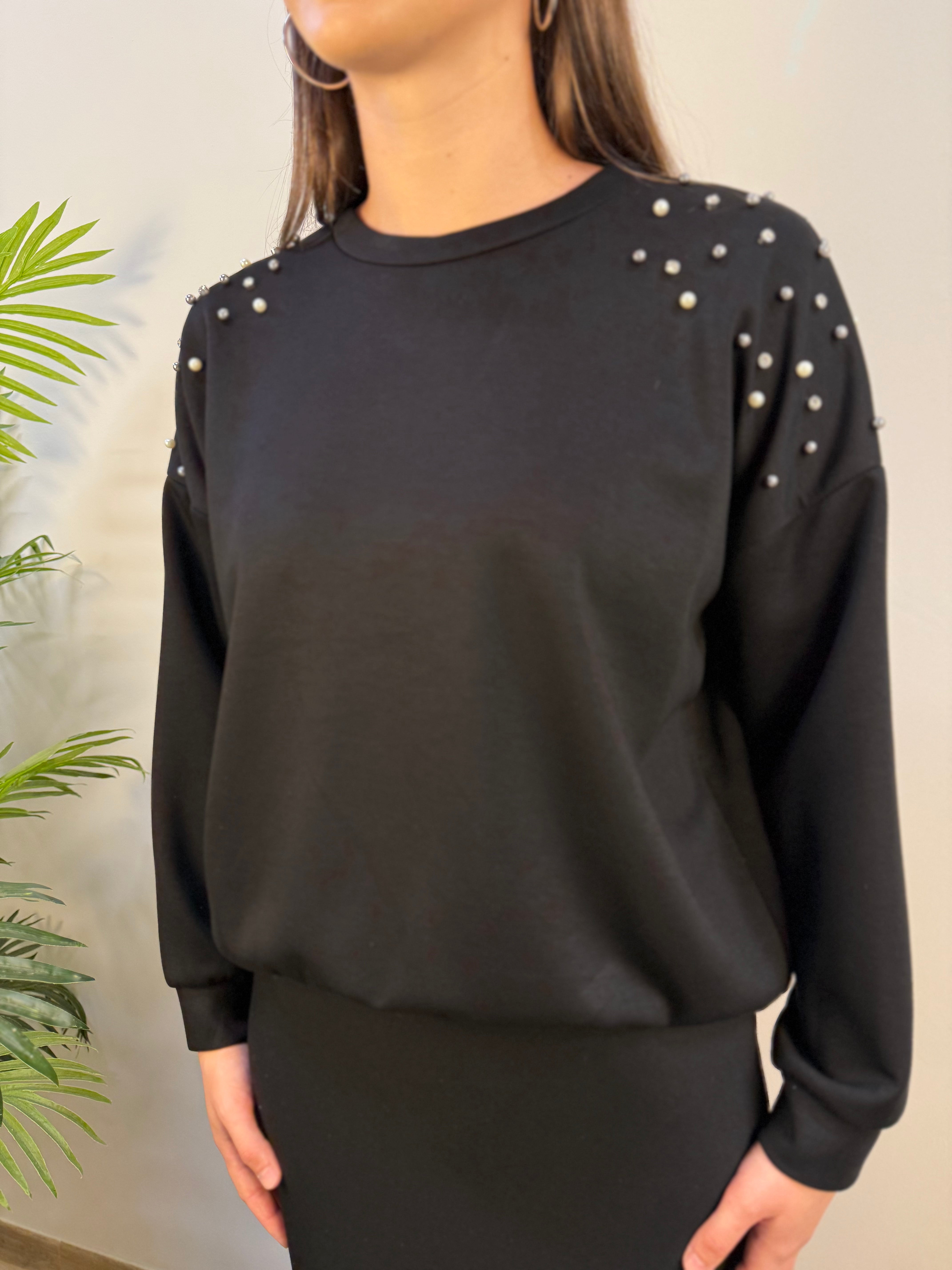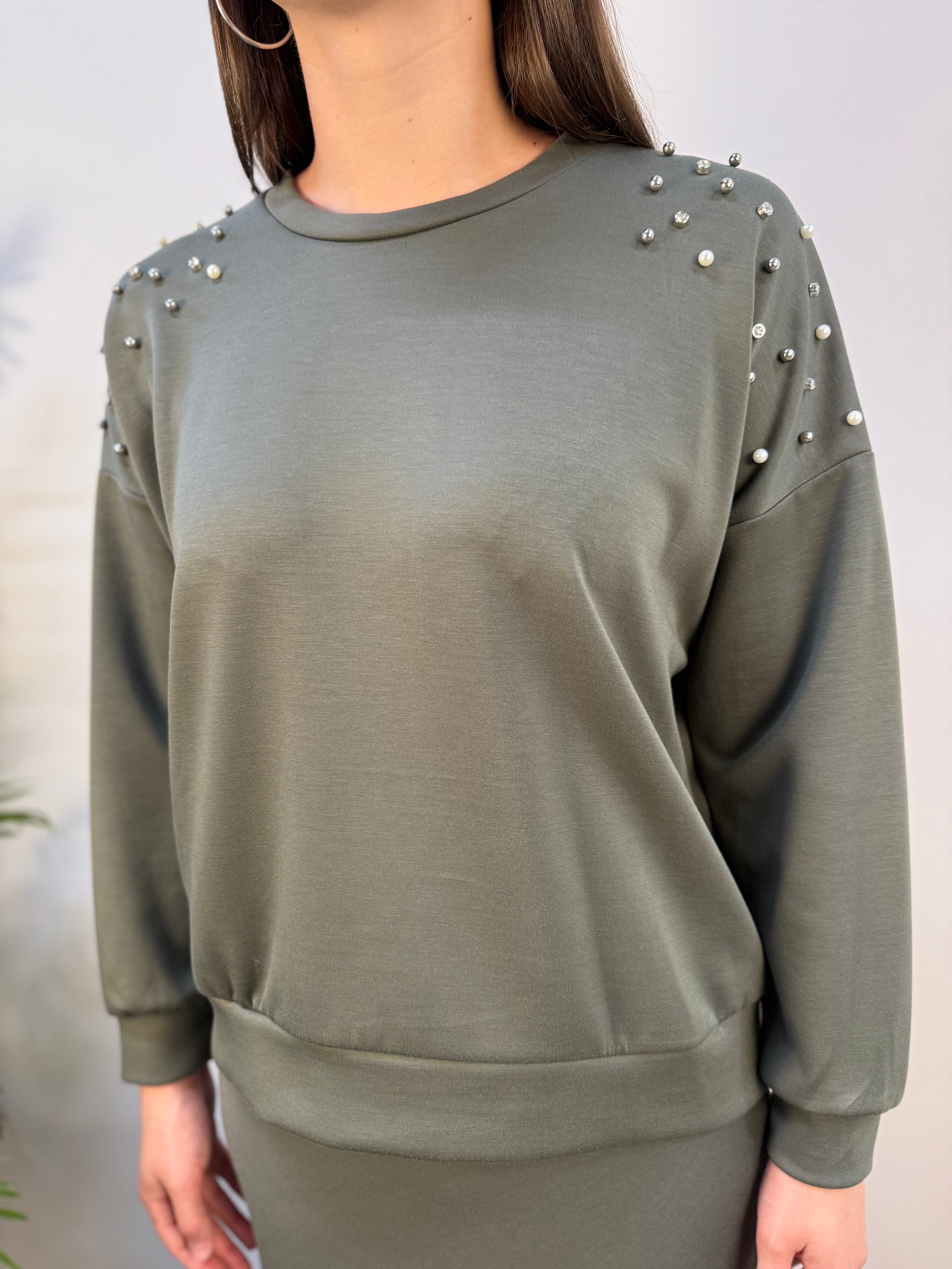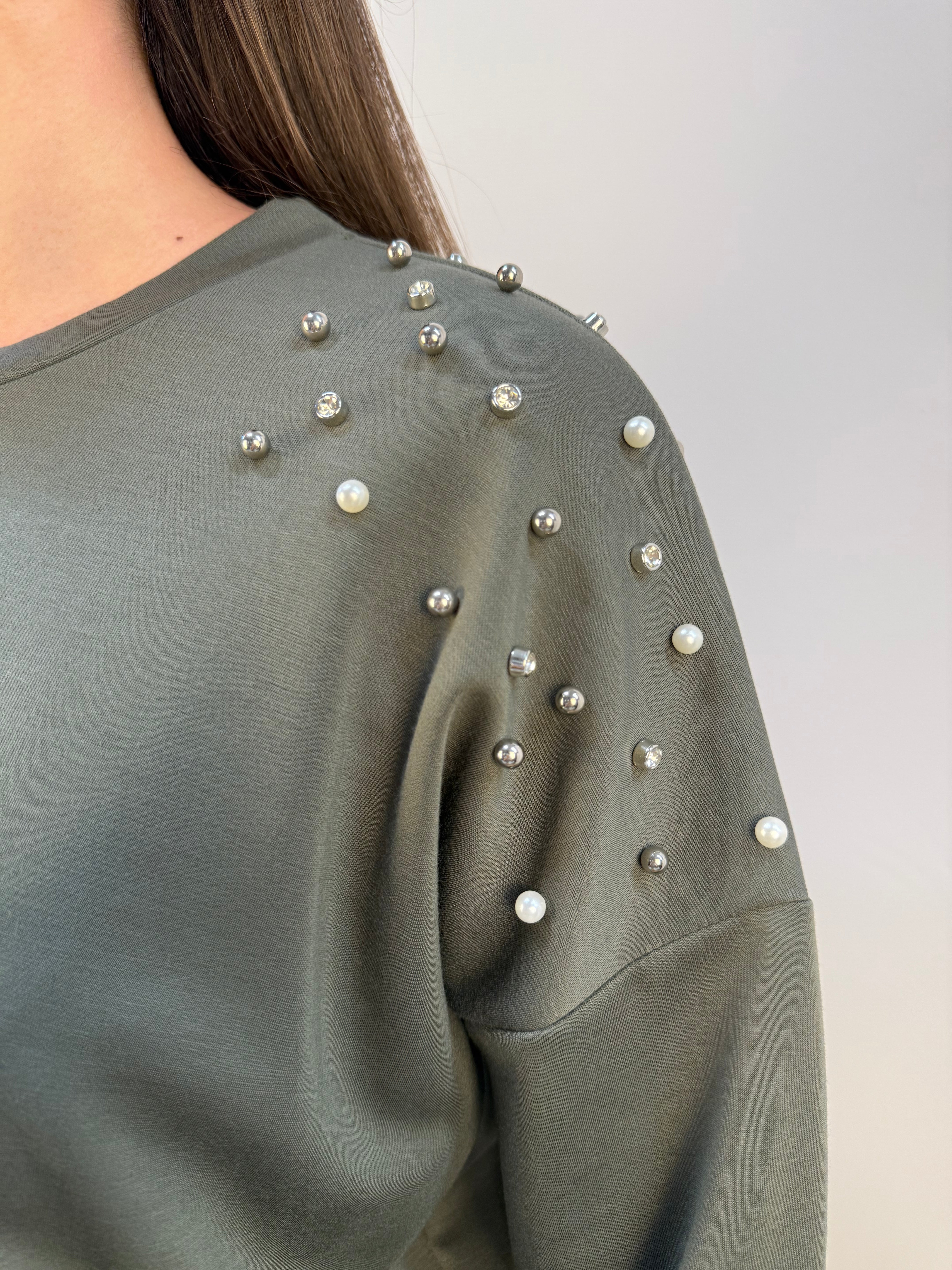 Comfort e stile si incontrano in questa felpa Akè in tessuto scuba, morbido, caldo ed elasticizzato, pensata per accompagnarti con eleganza nelle giornate più fresche. La tinta unita dona versatilità al capo, mentre l'applicazione di perle e strass sulle spalle crea un raffinato punto luce che aggiunge un tocco glamour al look. Un capo perfetto per chi ama distinguersi con discrezione, ideale da abbinare sia a un denim casual che a pantaloni più eleganti per un effetto sofisticato ma rilassato.