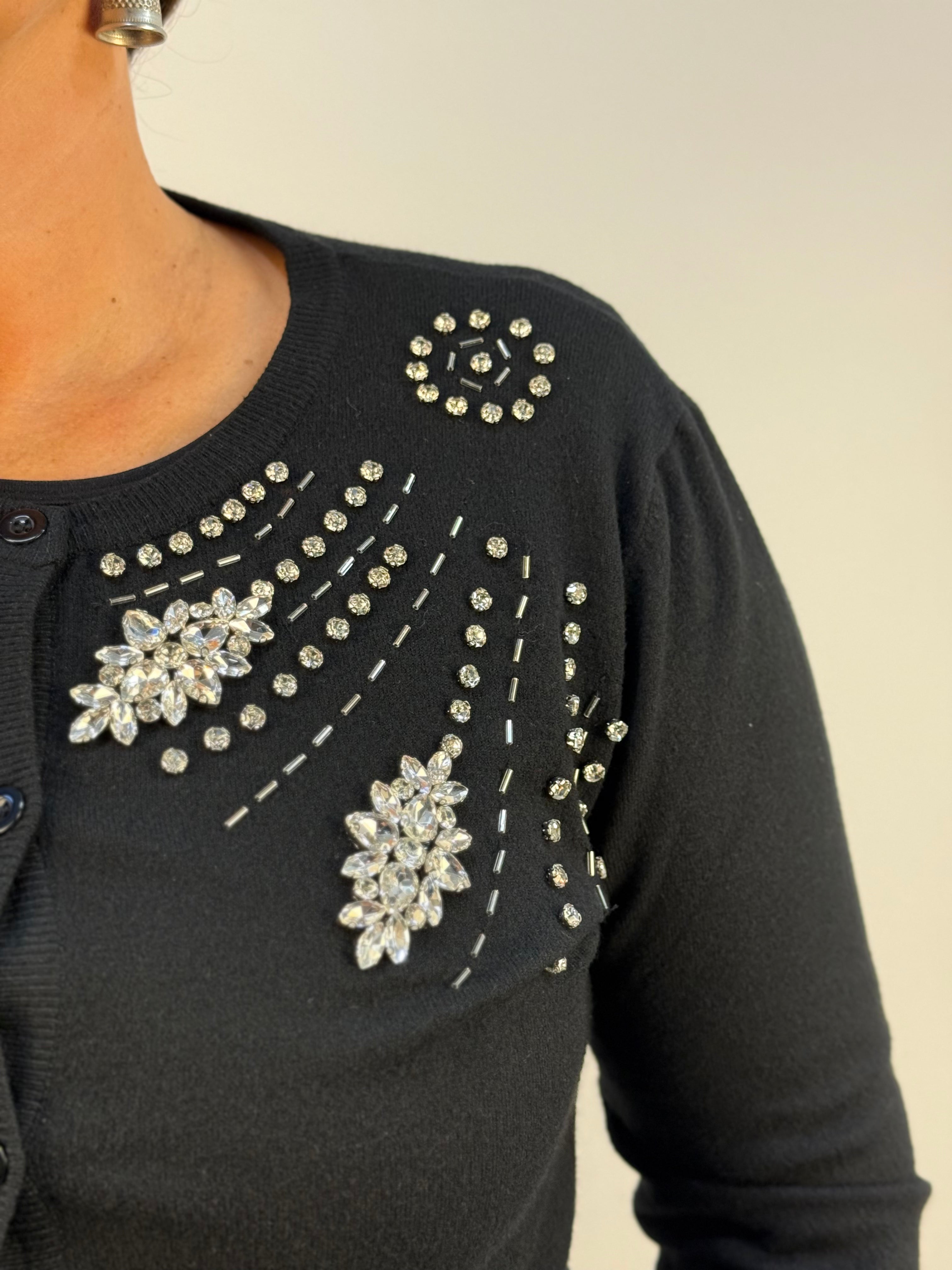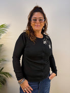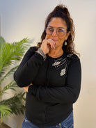 Maglia Exsy tinta unita nera dal design semplice ed elegante, impreziosita da strass applicati sulla spalla che donano un tocco di luce e raffinatezza. Realizzata con polsini, fascione e scollo a costine, offre una vestibilità confortevole e un look curato nei dettagli. Perfetta per aggiungere un accento luminoso ai tuoi outfit quotidiani o serali.