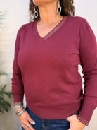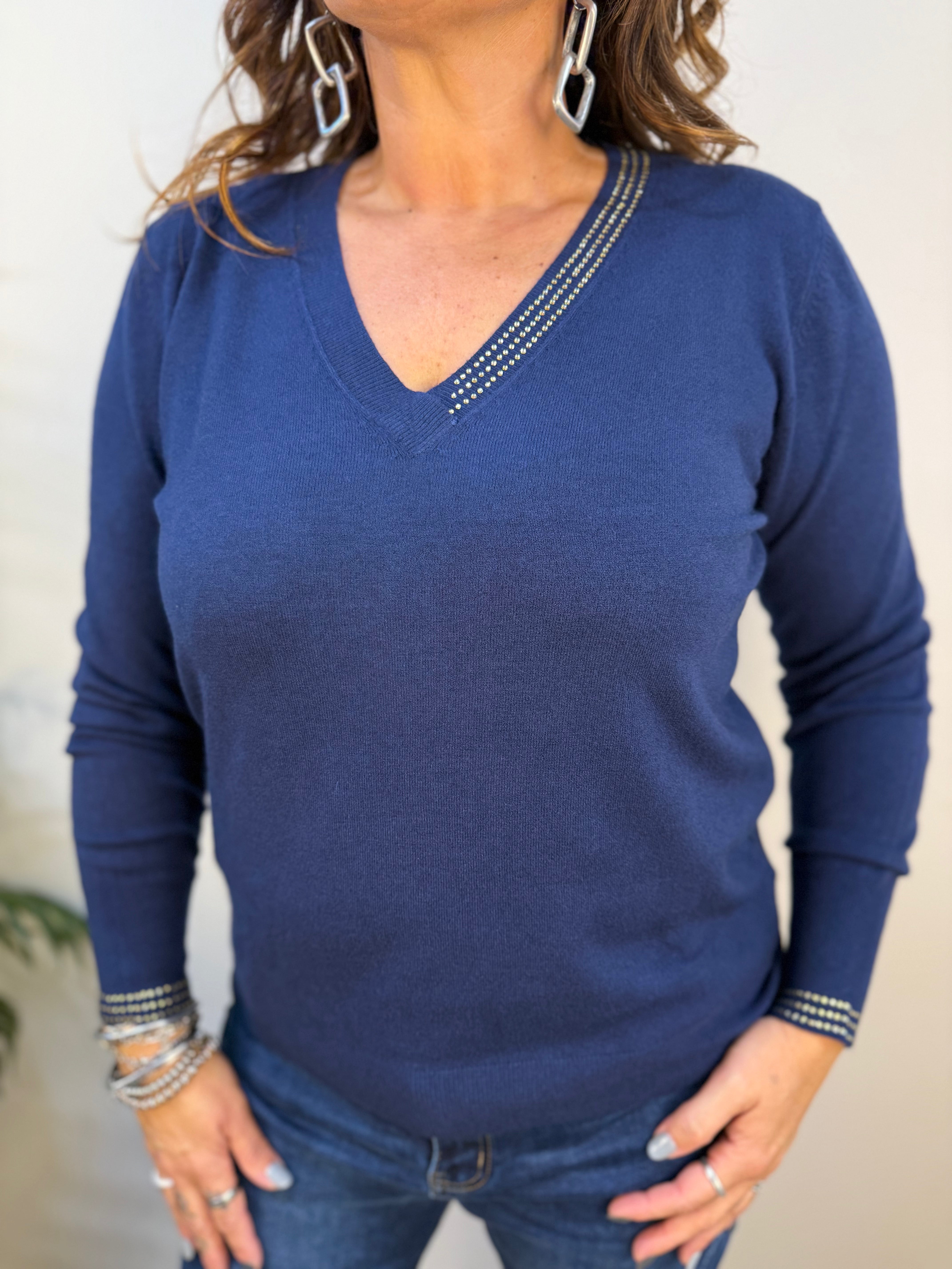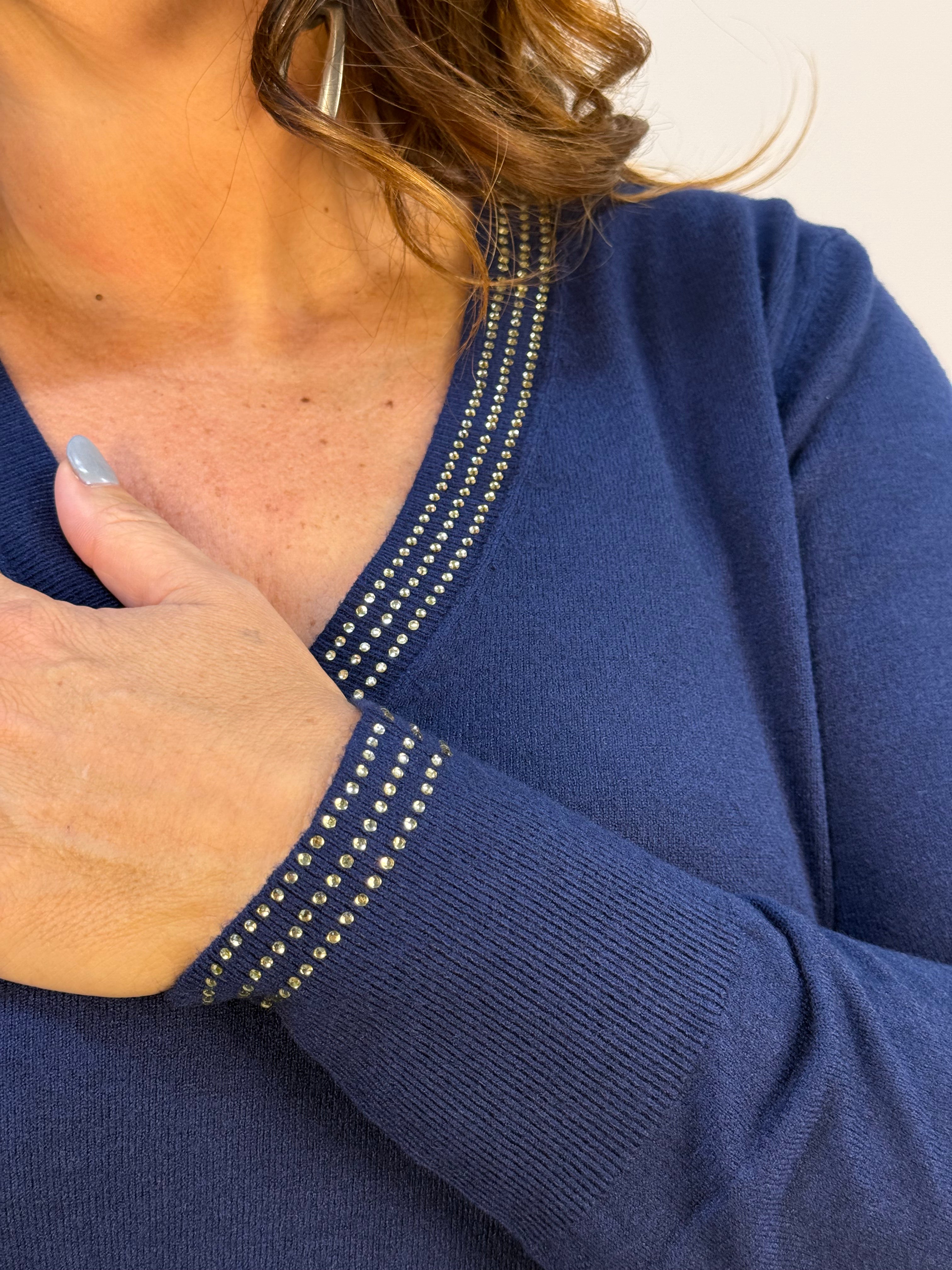 Maglia Exsy in morbido misto viscosa dal design elasticizzato che assicura comfort e una vestibilità perfetta. Proposta in due varianti tinta unita, è impreziosita da delicati strass lungo lo scollo a V, per un tocco elegante e raffinato. I polsini, il fascione e lo scollo a costine completano il capo con dettagli curati e una finitura sofisticata.