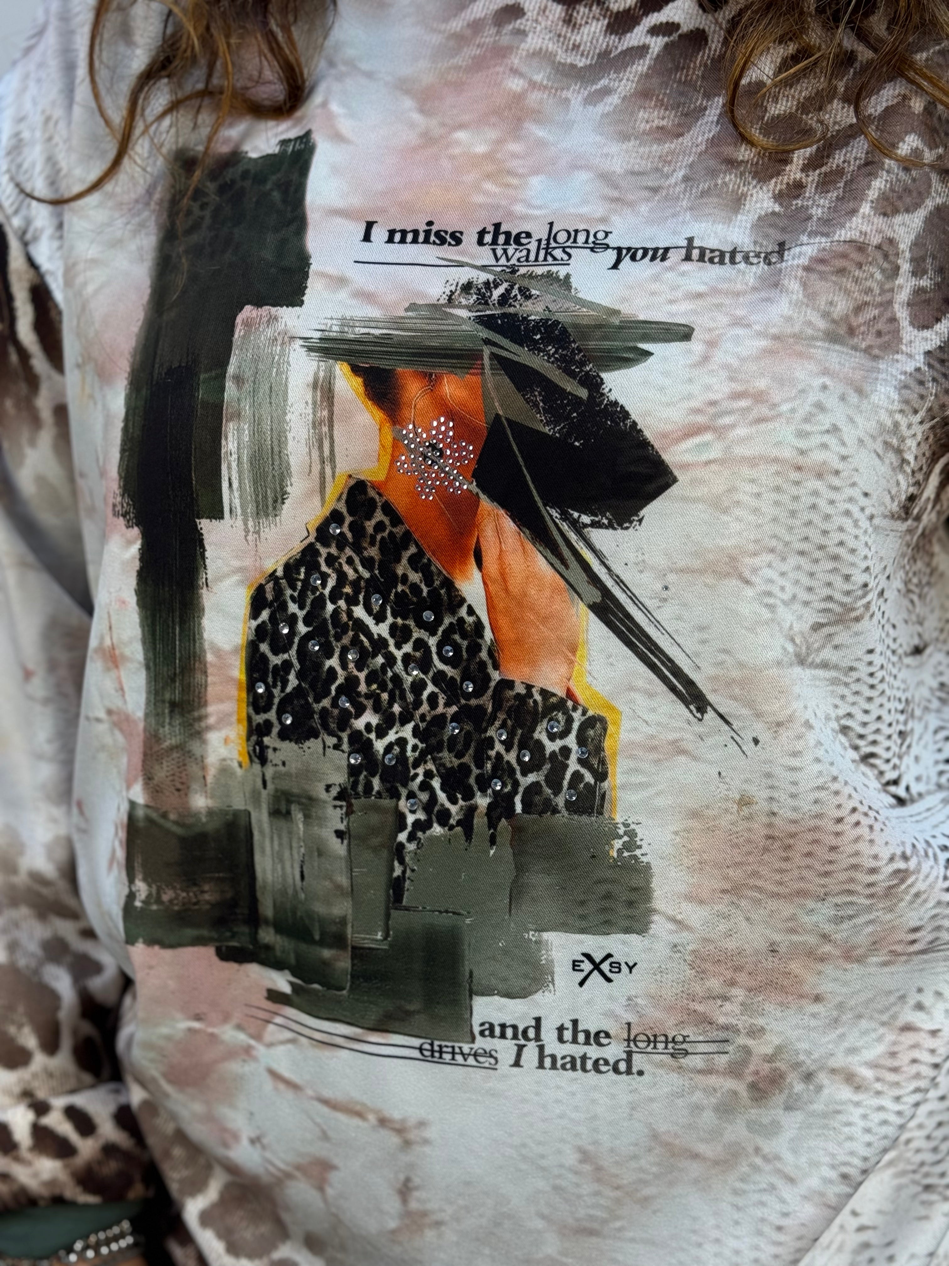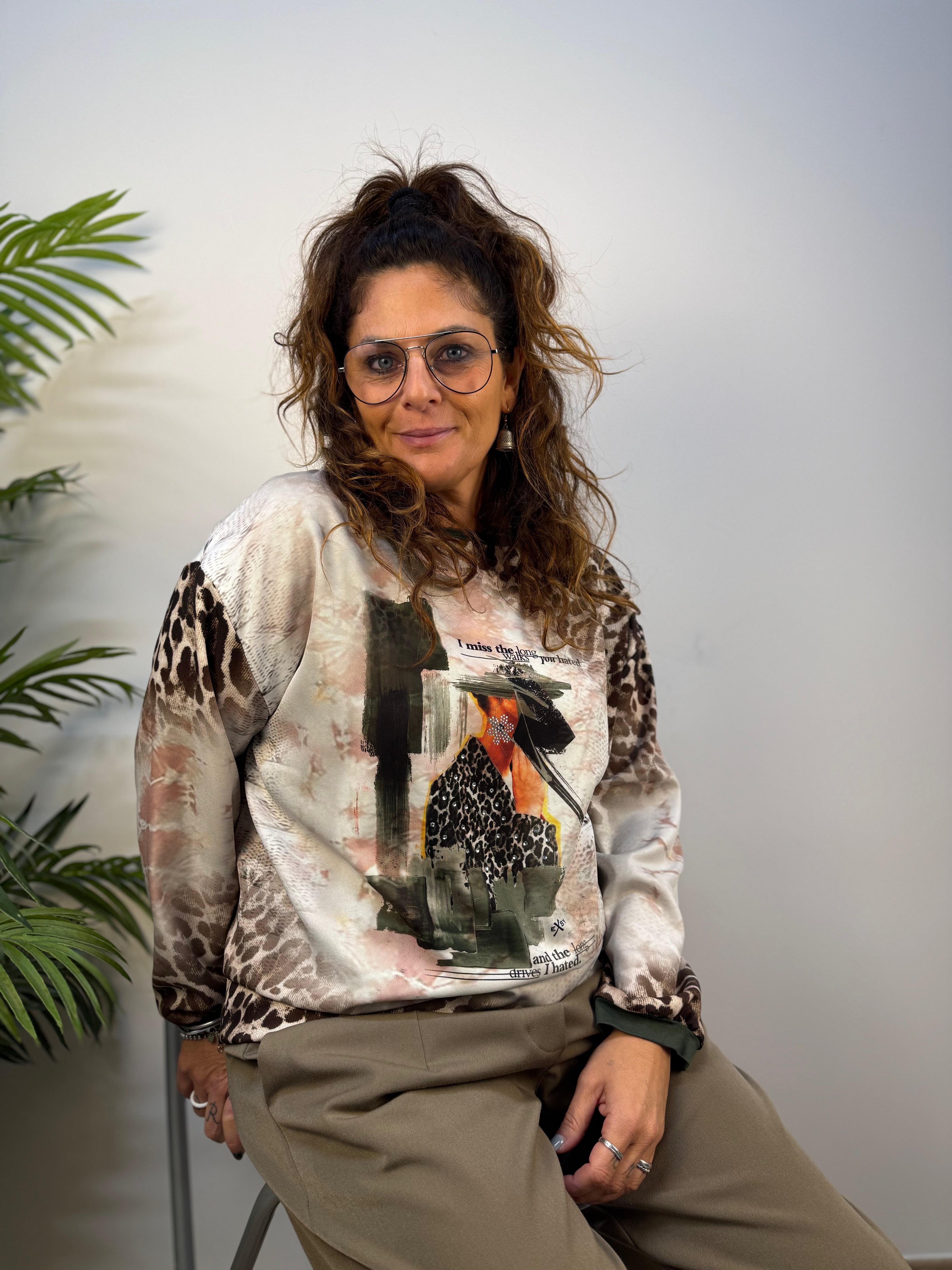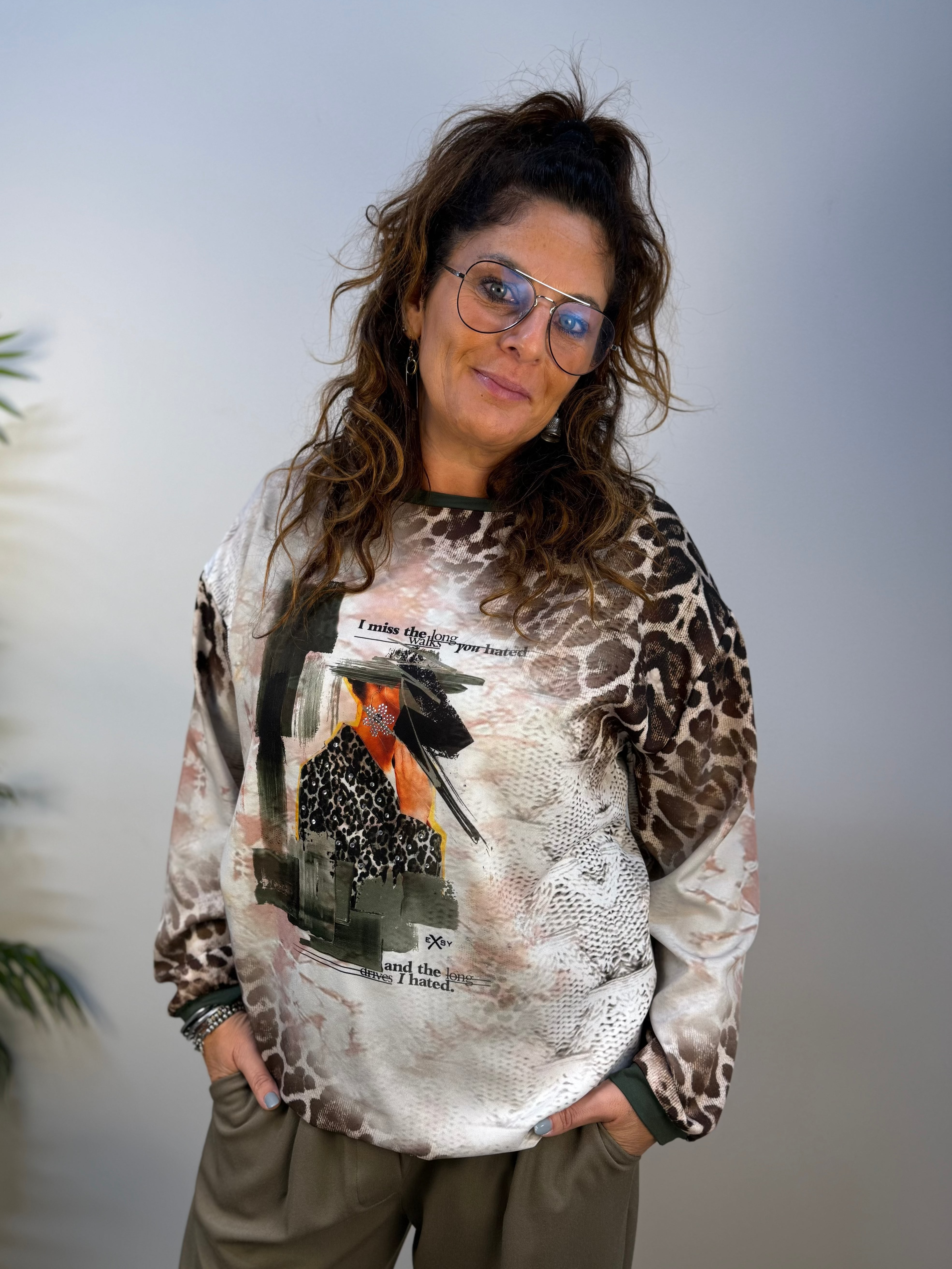 Maglia Exsy dal carattere deciso, realizzata in fantasia mista astratta e animalier arricchita da dettagli in color verde militare che donano un tocco grintoso e contemporaneo. Un capo versatile e originale, perfetto per aggiungere personalità ai look di tutti i giorni.