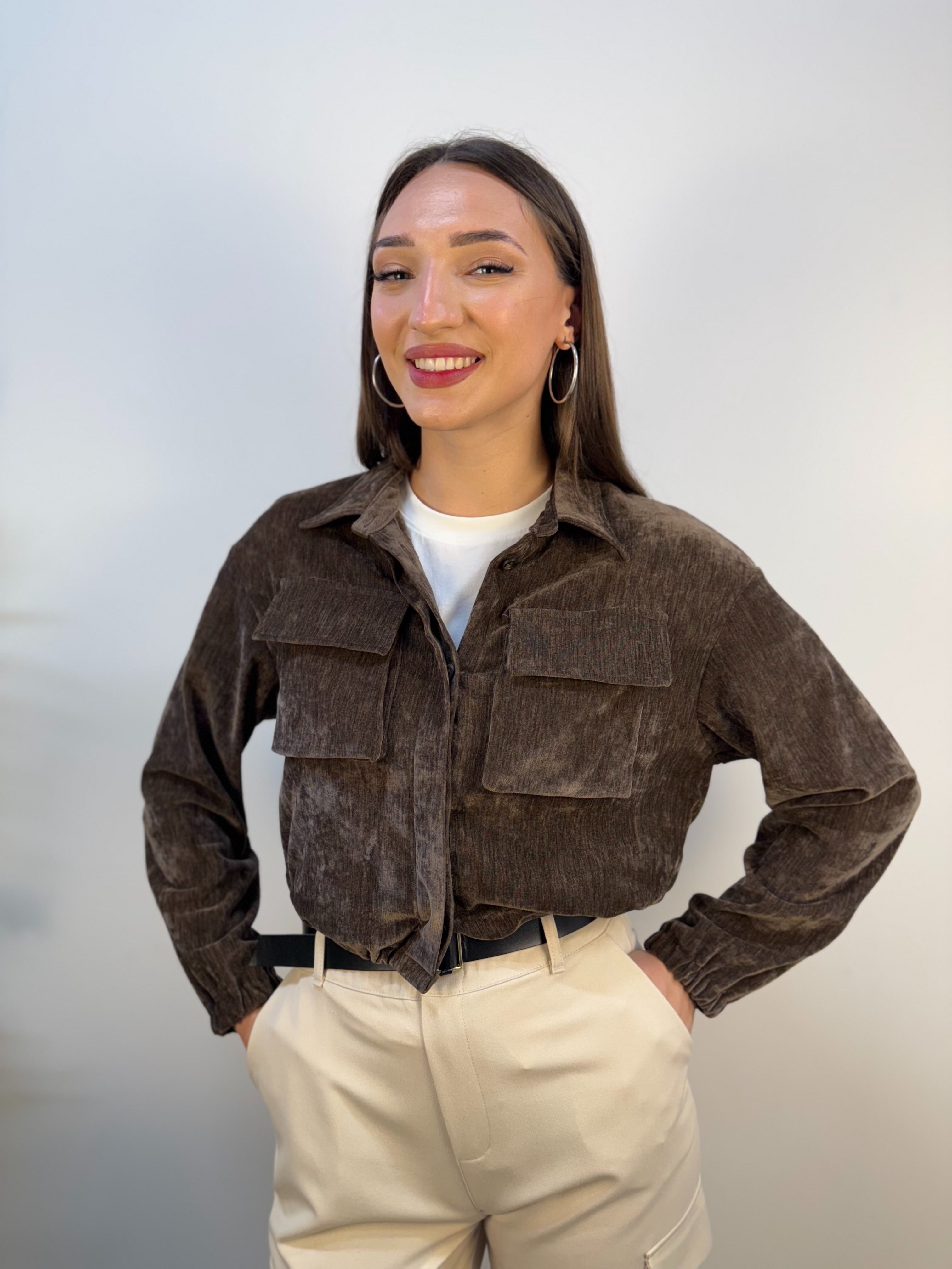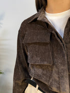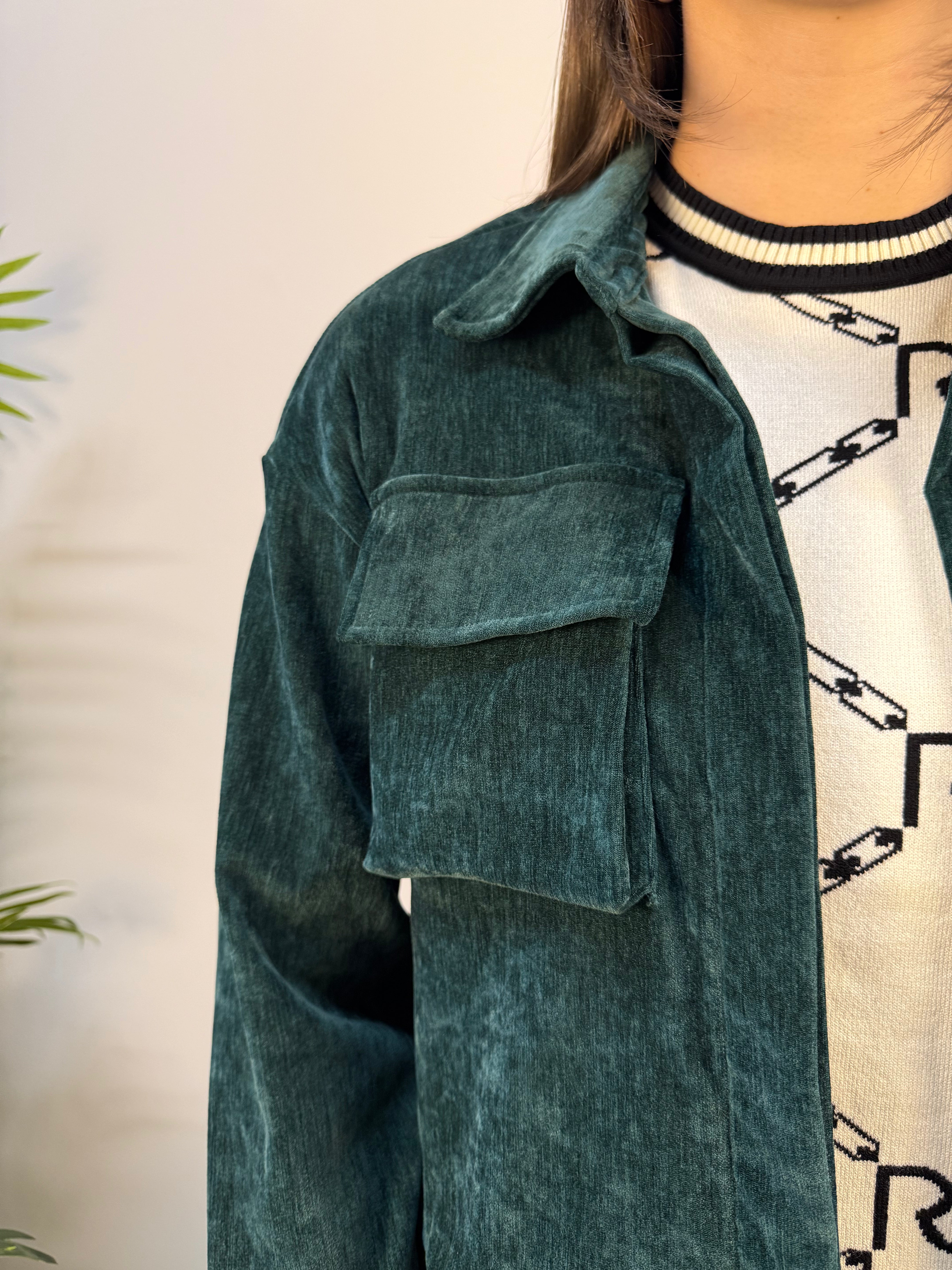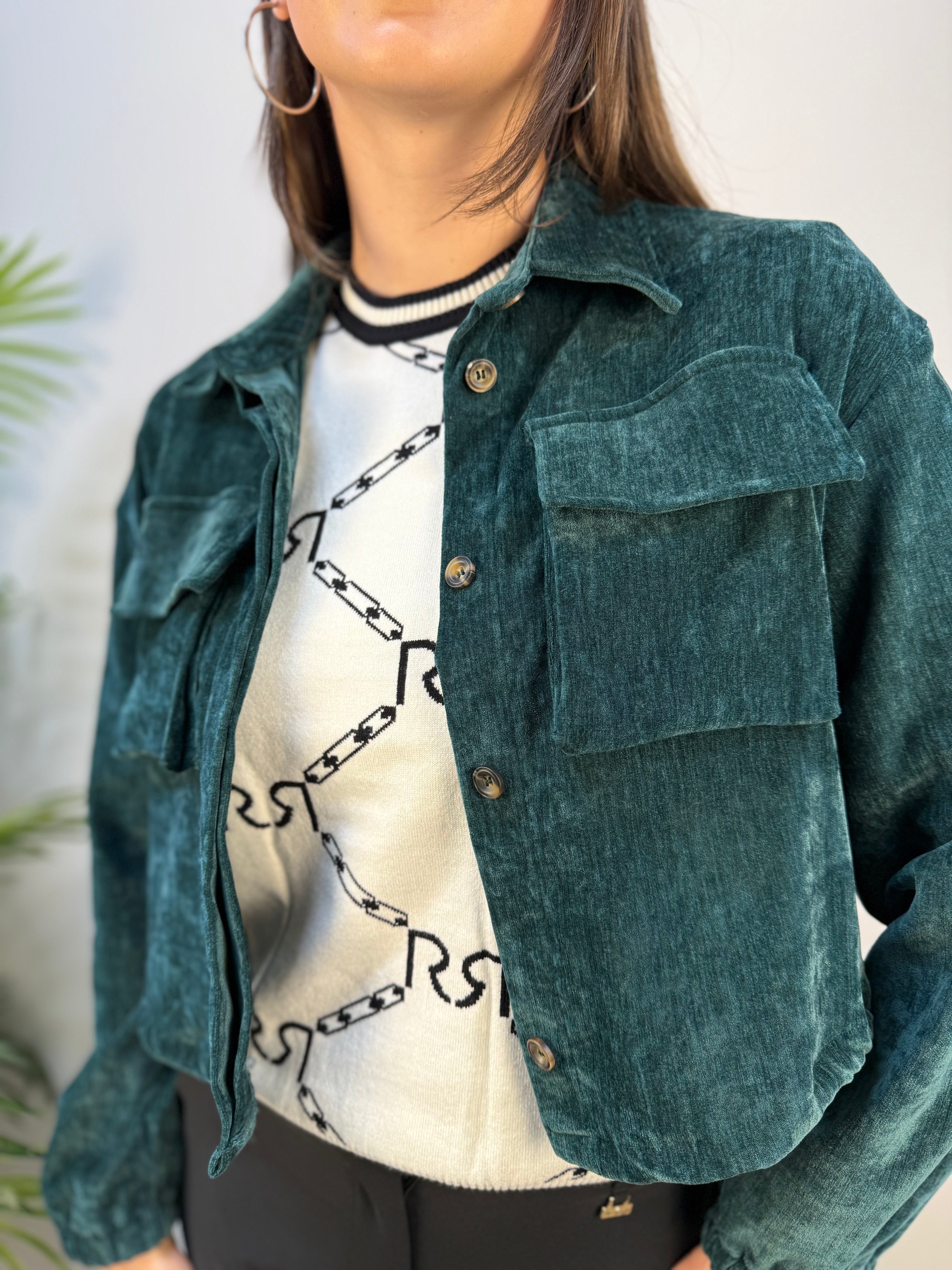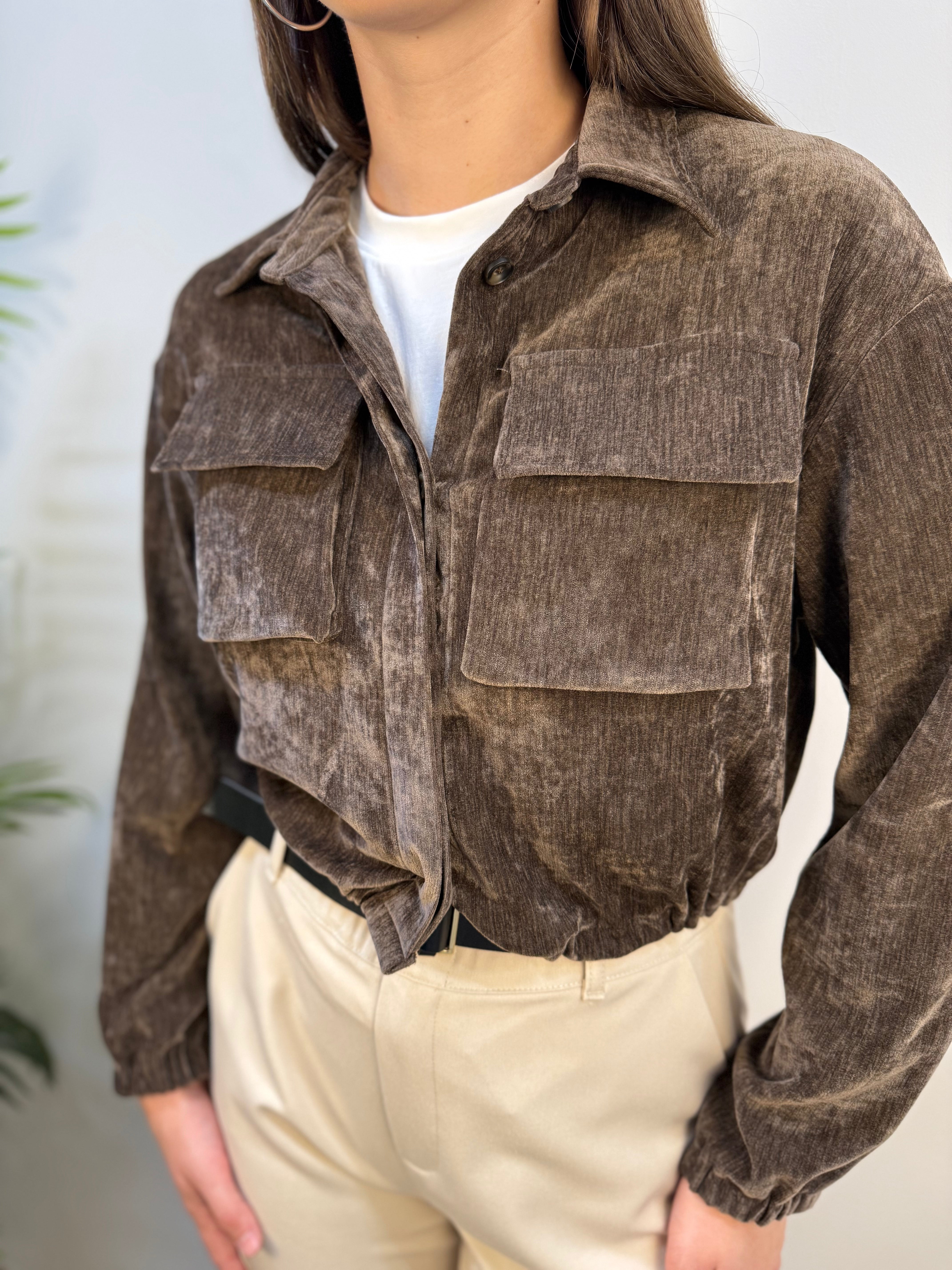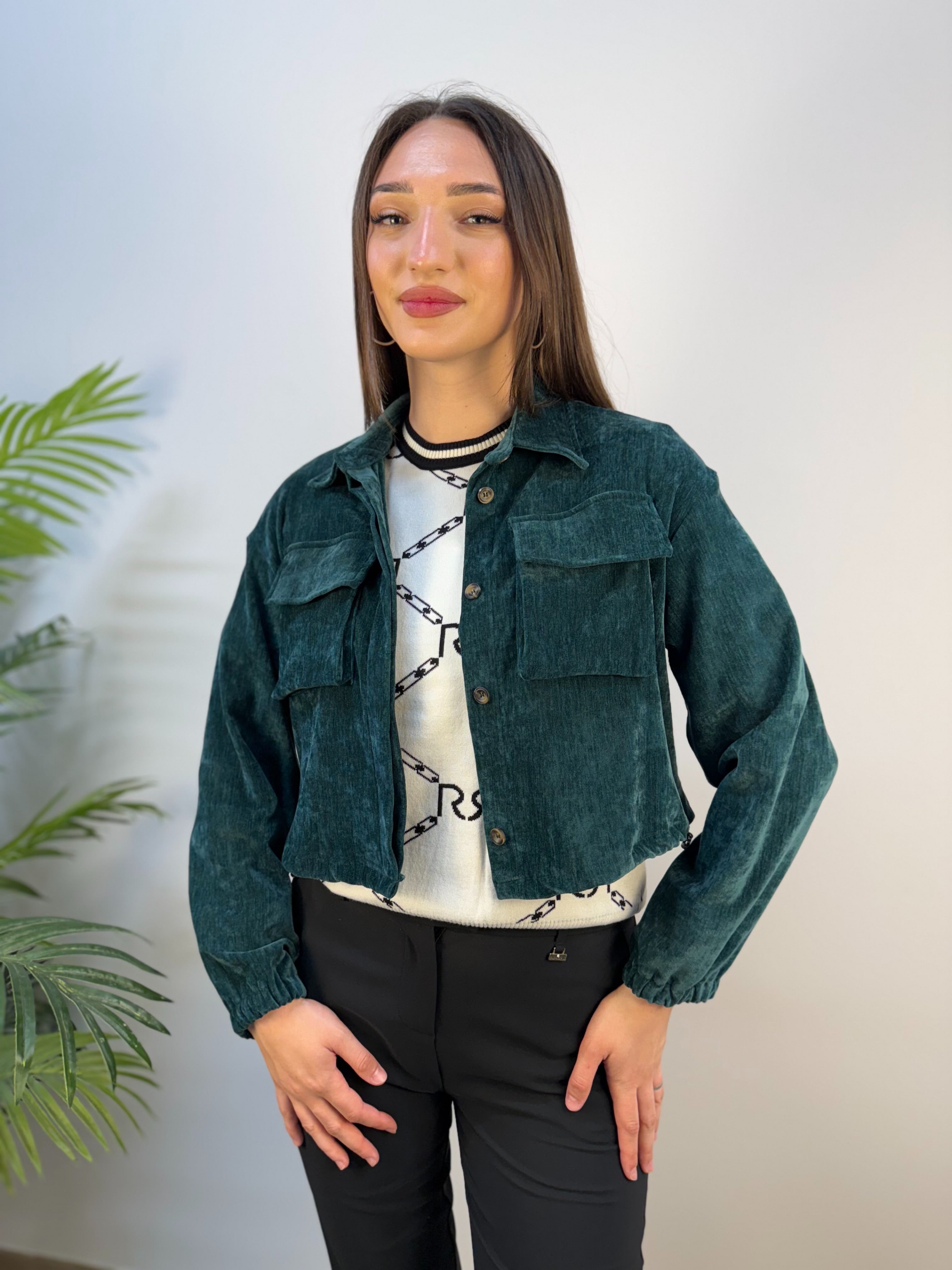 Giubbino corto in ciniglia con chiusura a bottoni nascosti