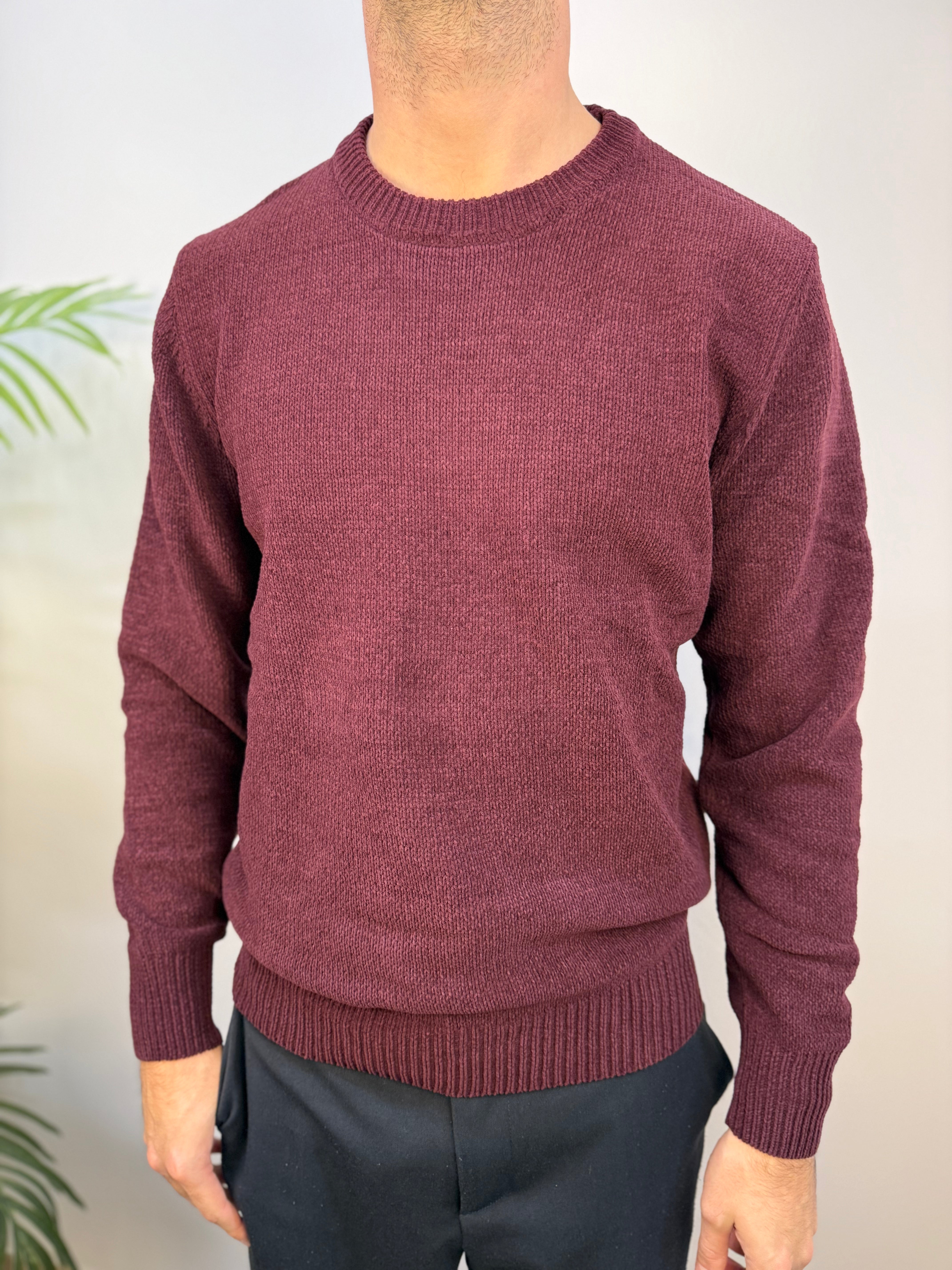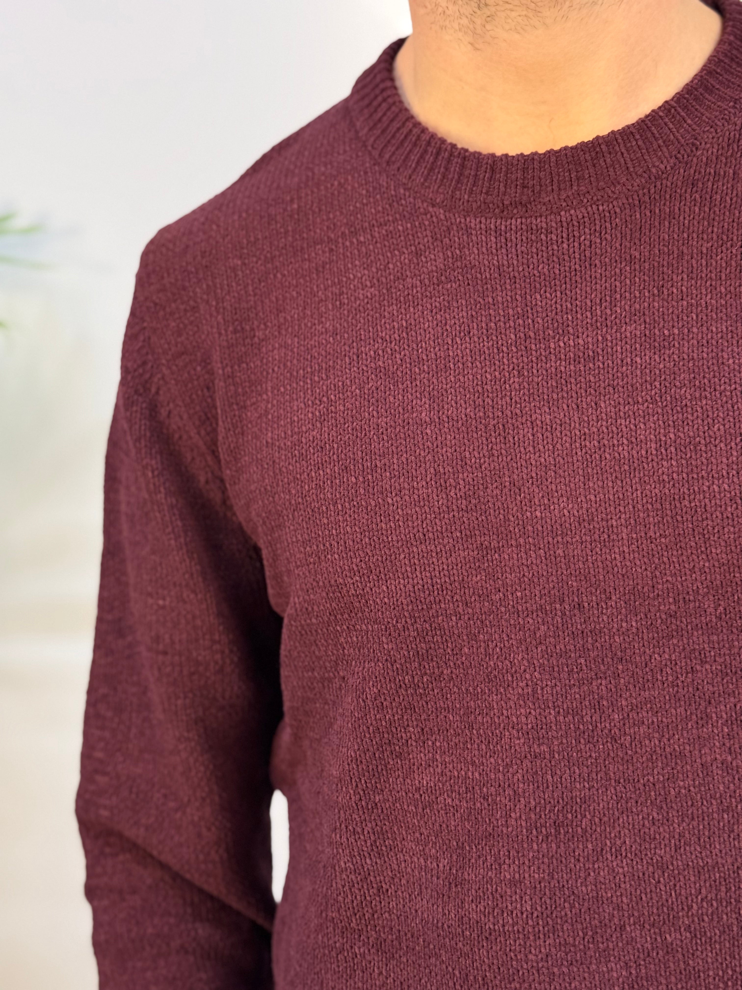 Maglione girocollo in ciniglia con lavorazione a uncinetto