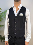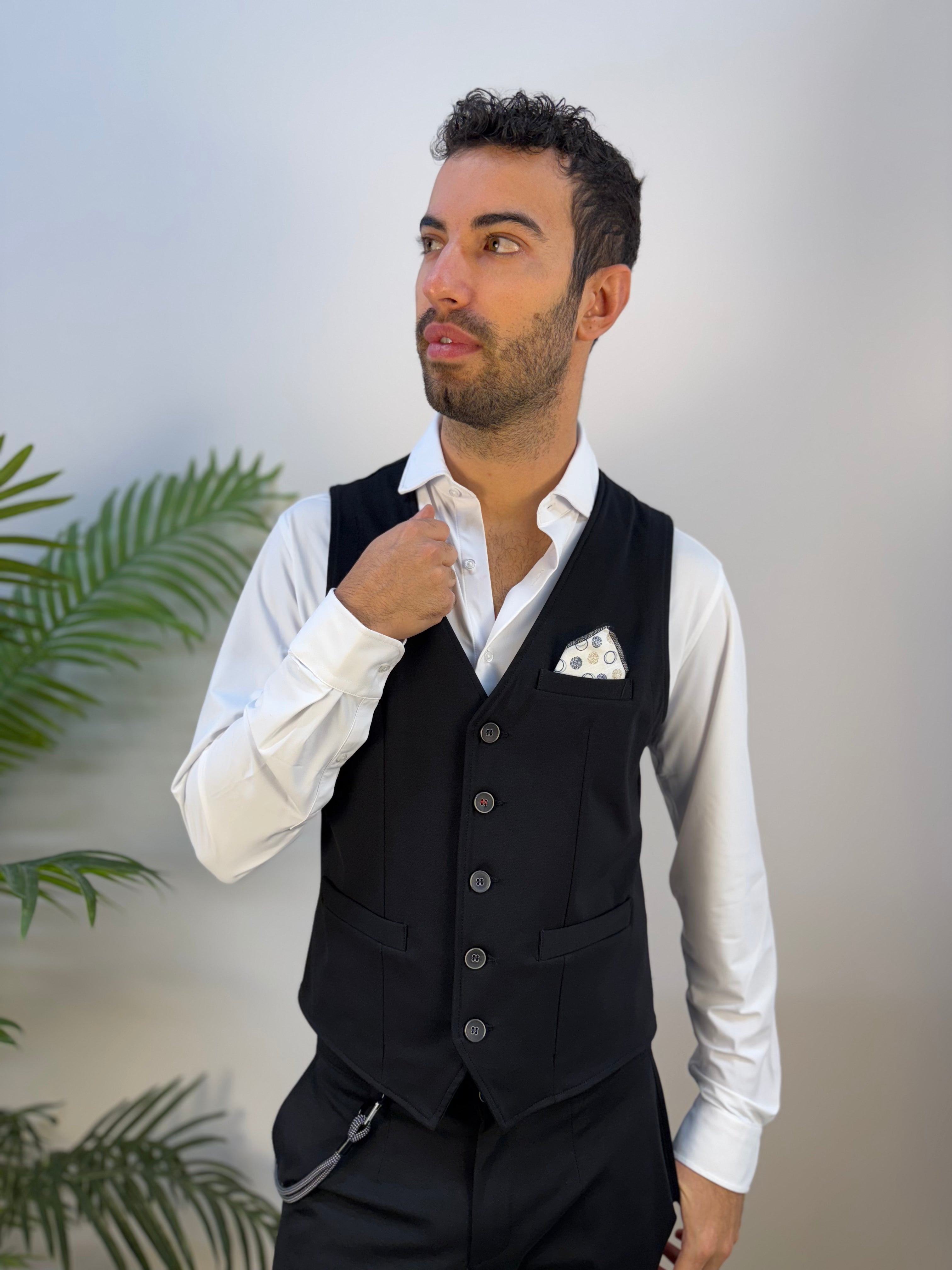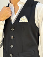 Gilet Andy Don B con chiusura a 5 bottoni, taschino sul cuore e due tasche frontali. Realizzato in tessuto strutturato e leggermente elasticizzato, conferisce una linea elegante e confortevole, perfetta per completare look raffinati o smart casual.