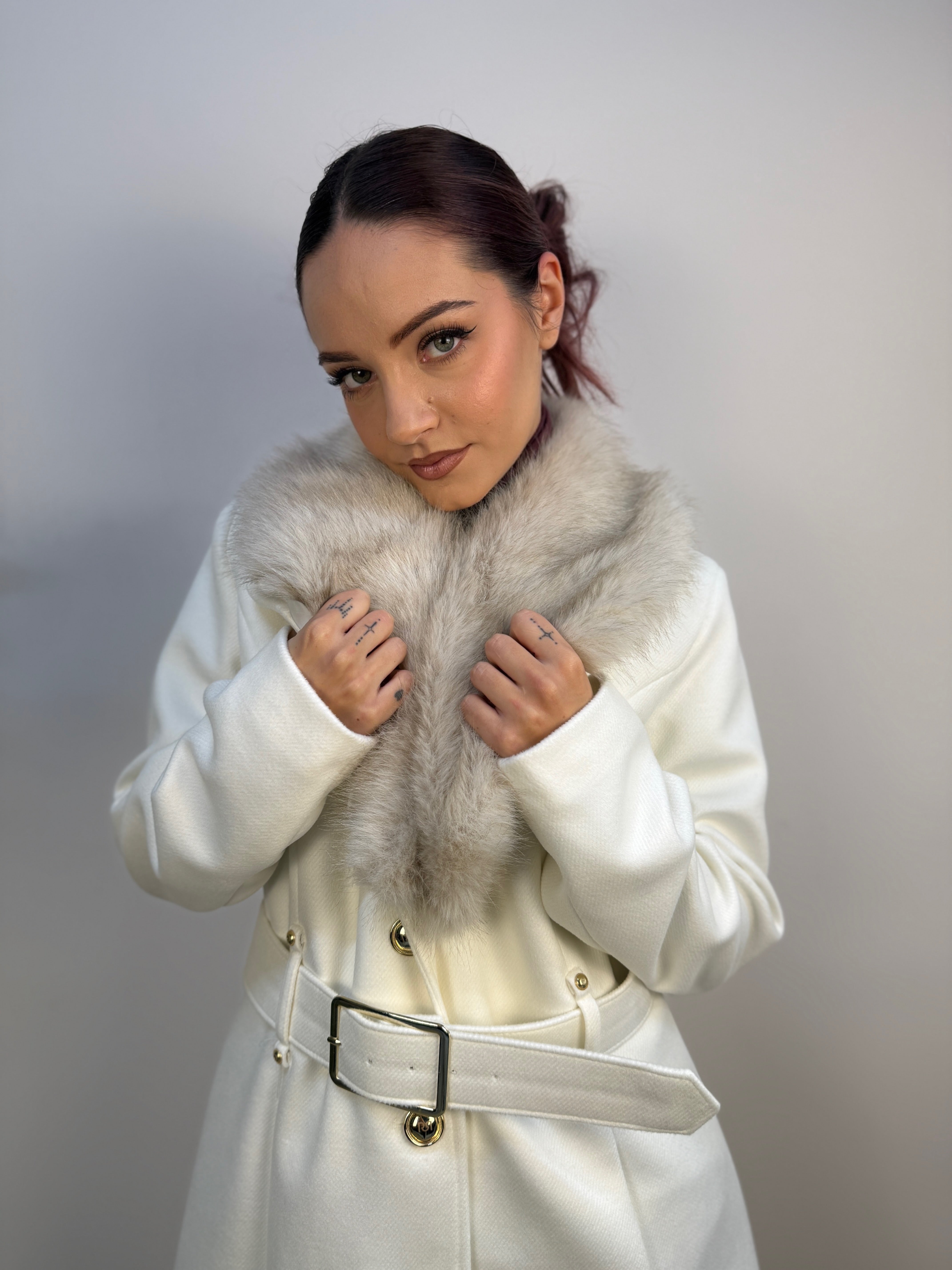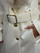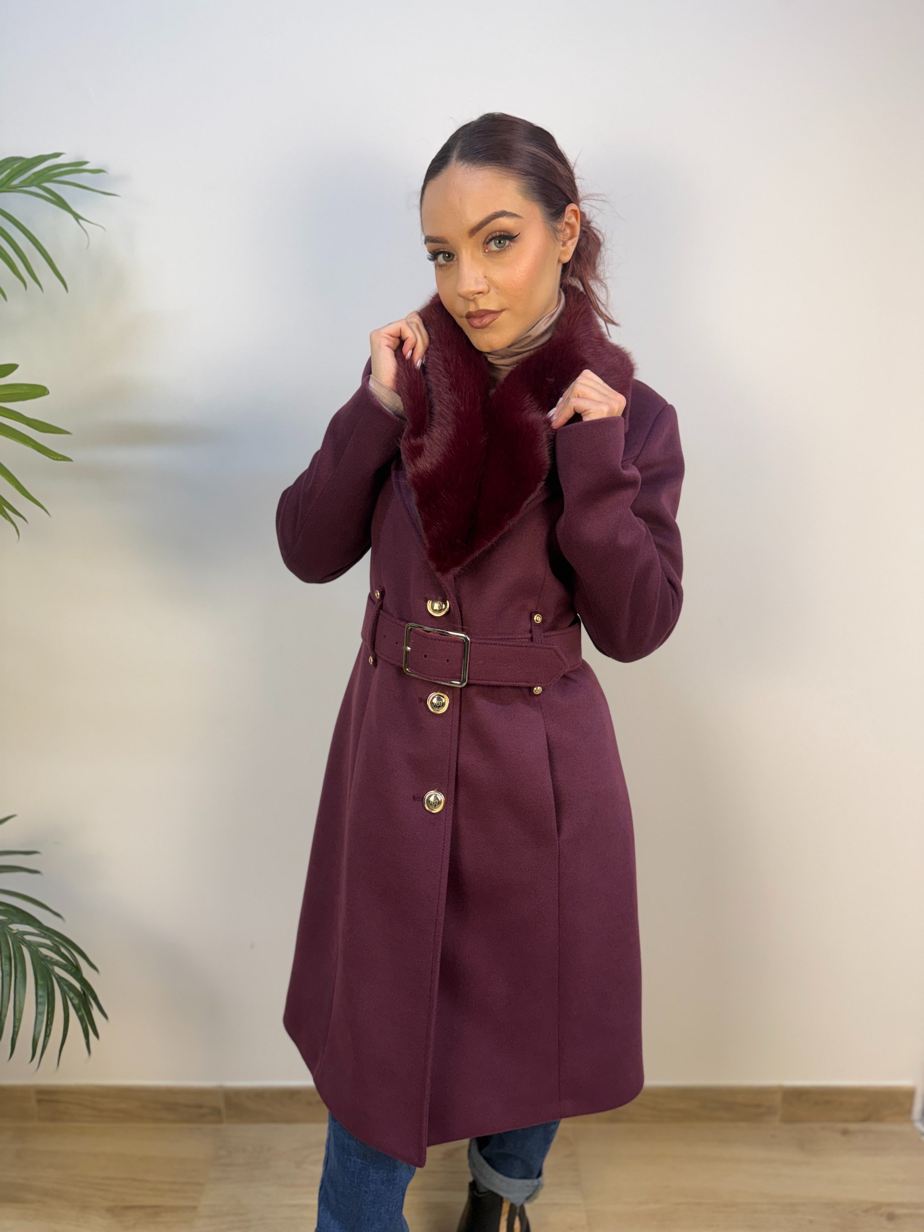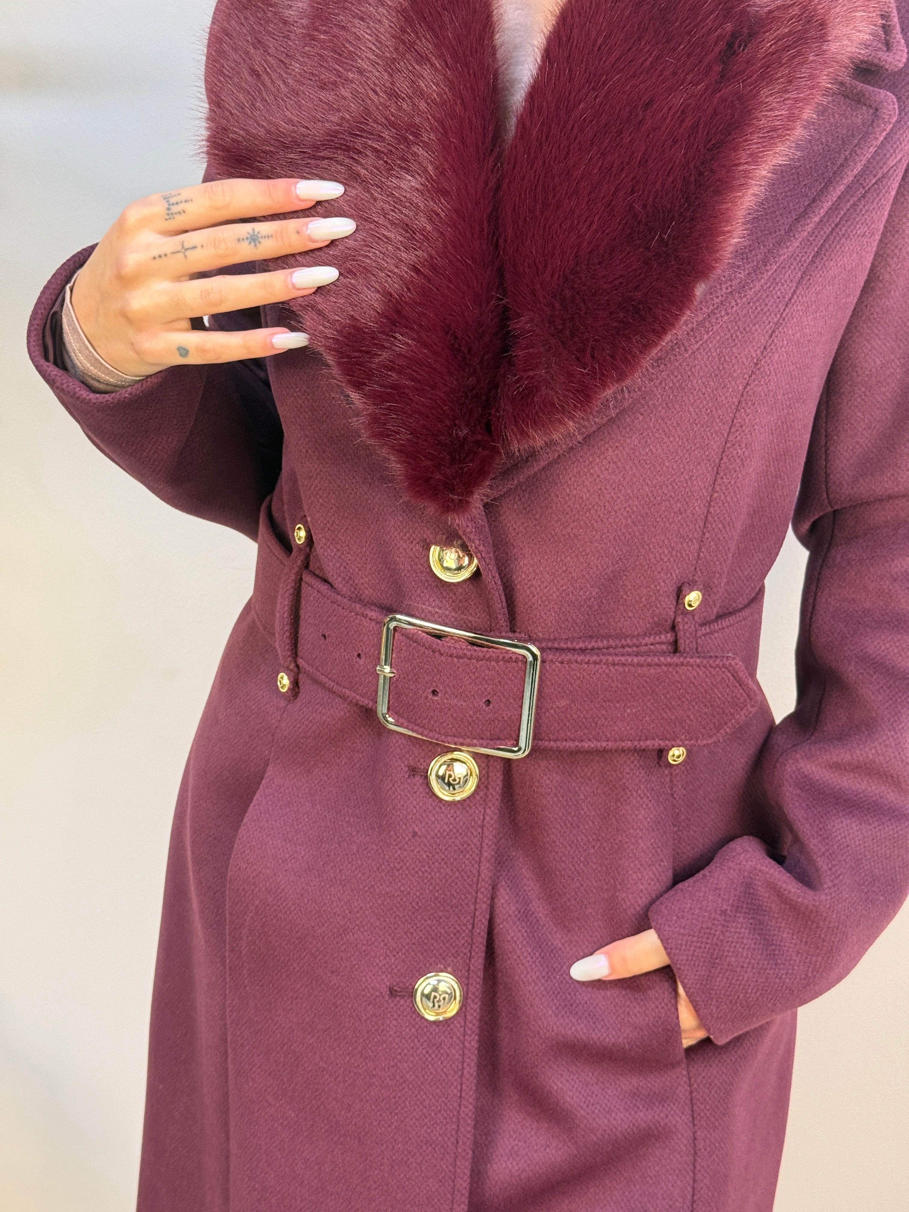 Cappotto Rinascimento con scollo a piega e pelliccia removibile tono su tono, impreziosito da dettagli metallici oro che donano luminosità. Presenta chiusura con tre bottoni logati e cintura rigida tono su tono che valorizza il punto vita. Un capo elegante, raffinato e caldo, perfetto per completare ogni look con stile.