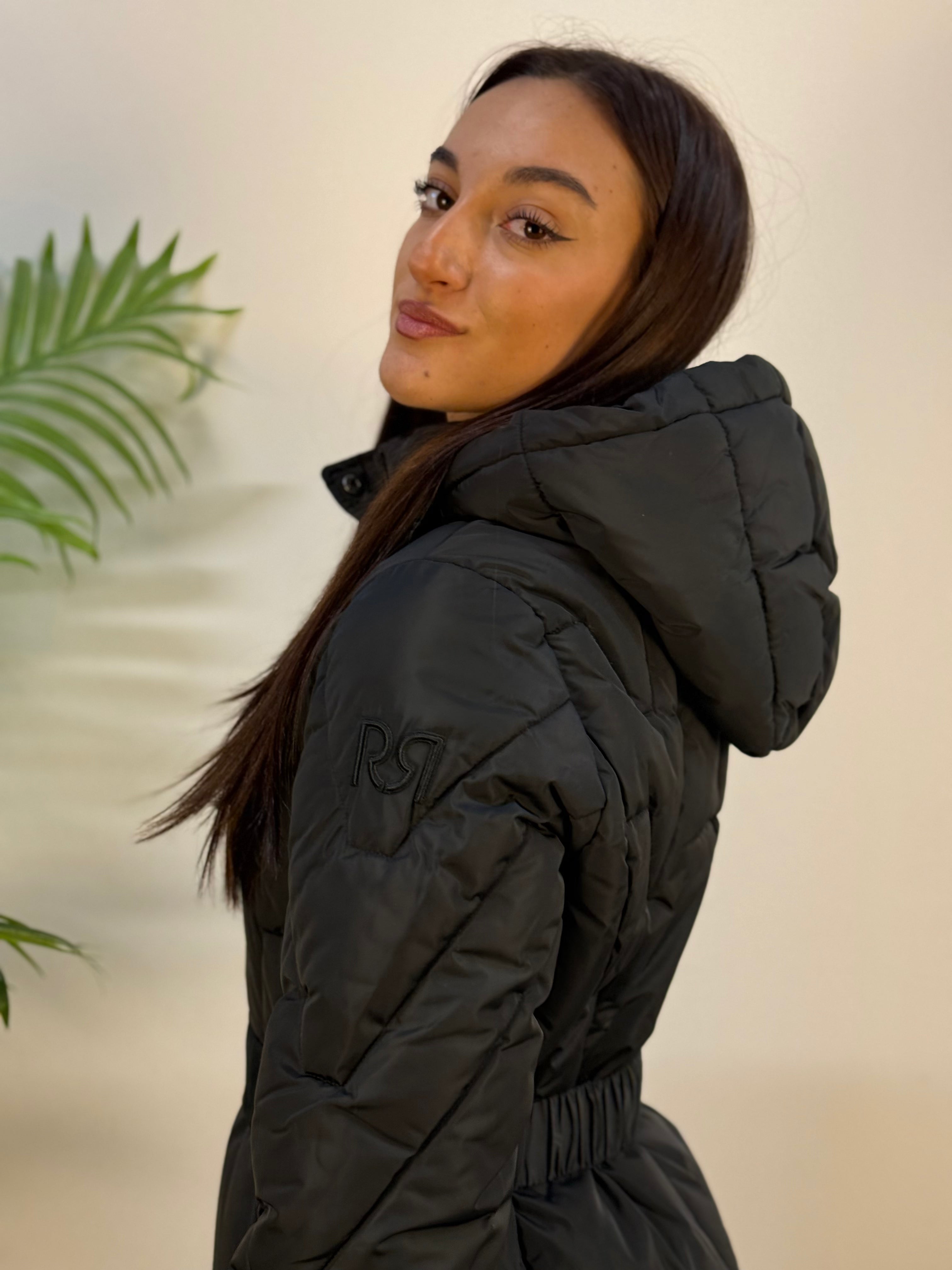 Cappotto imbottito lungo Rinascimenti, realizzato in tessuto water resistant per protezione e comfort. Dotato di cappuccio removibile con zip, chiusura con zip coperta da patta con bottoni a pressione logati, e 2 tasche frontali con zip. I polsini a costine e la cintura elasticizzata tono su tono con fibbia metallica logata assicurano vestibilità e stile. Logo RR ricamato tono su tono sulla manica per un dettaglio raffinato. Un capo caldo, elegante e sofisticato, perfetto per affrontare il freddo con stile.