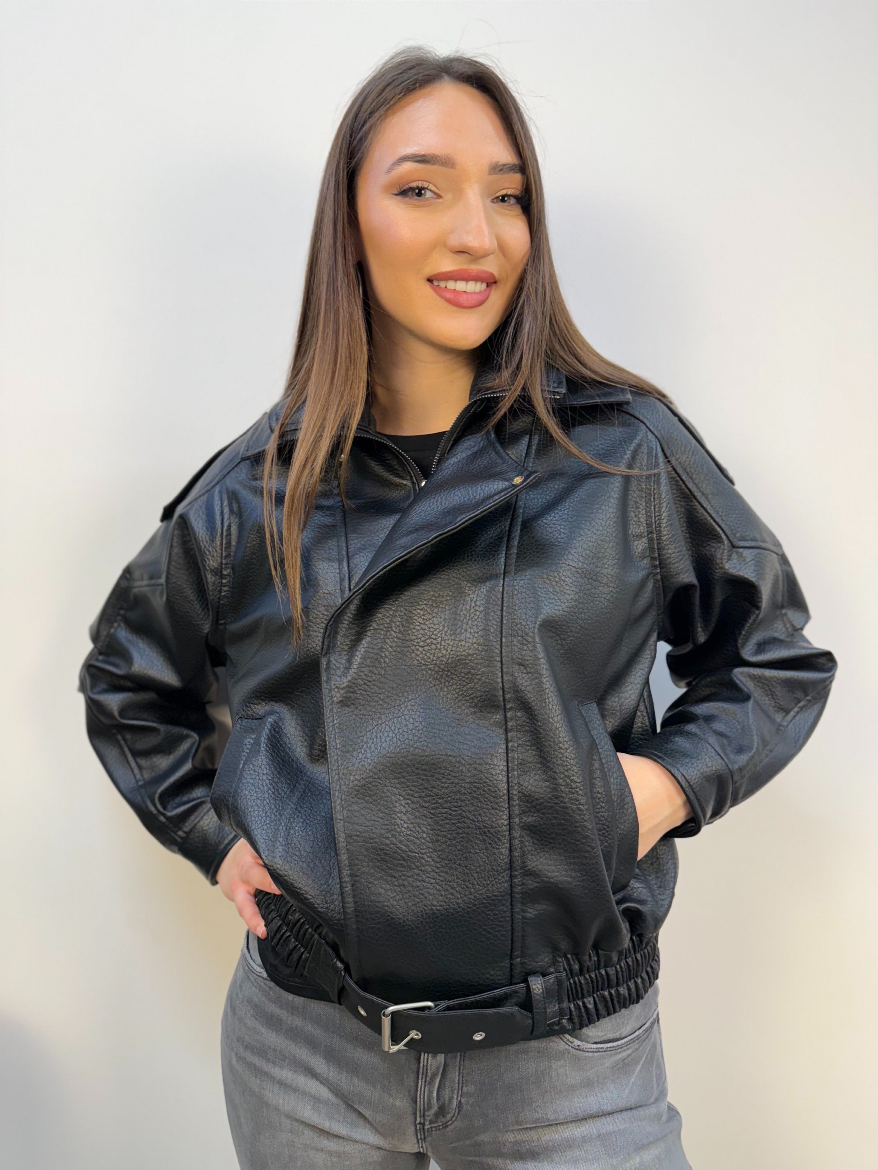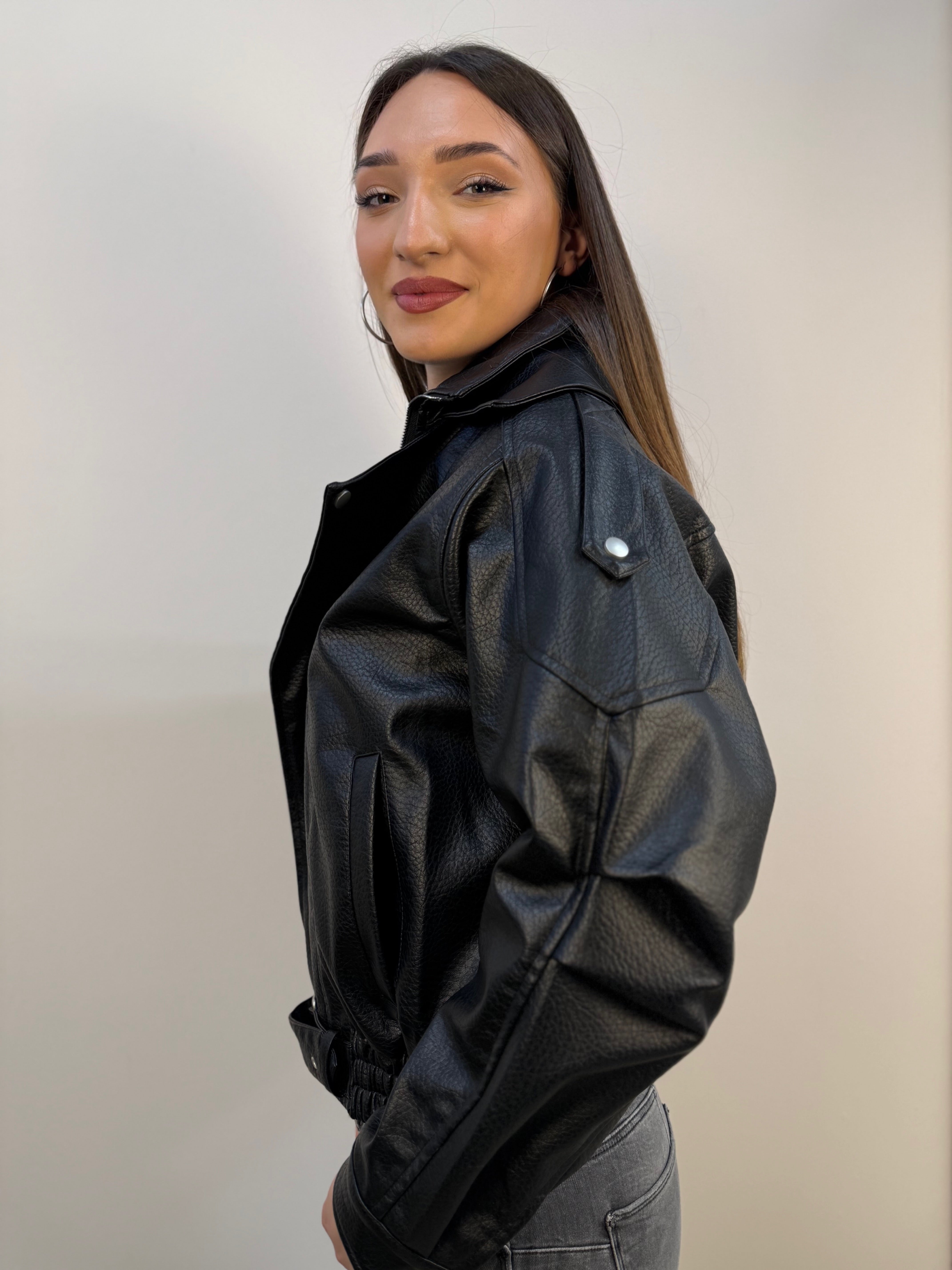 Giacca Vanessa Scott in ecopelle nera dal design oversize, pensata per un look audace e contemporaneo. Il modello presenta una doppia chiusura: zip frontale e patta sovrapposta con bottoni a pressione, entrambi in finitura argento, per un tocco grintoso e urbano.