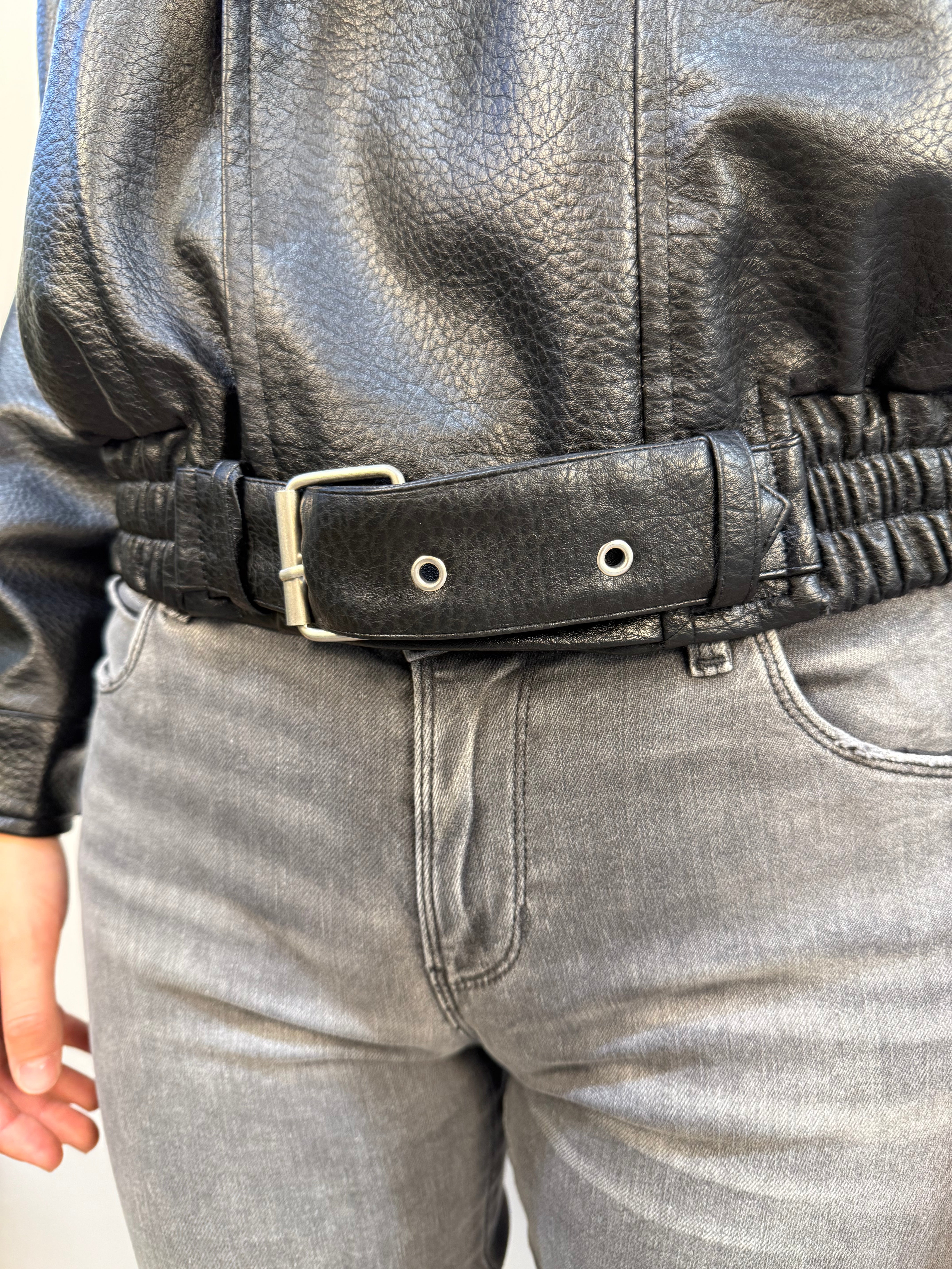L’interno è completamente foderato per un maggiore comfort. Il fondo è definito da un fascione arricciato ed elasticizzato, impreziosito da un dettaglio con fibbia in tinta, che aggiunge carattere al capo e ne valorizza la silhouette. Una giacca d’impatto, dalla vestibilità ampia e strutturata, ideale per completare look casual o streetwear con personalità.