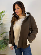 Il modello presenta una chiusura frontale con zip, cappuccio regolabile tramite lacci e tasche laterali funzionali, ideali per custodire piccoli oggetti o tenere le mani al caldo.