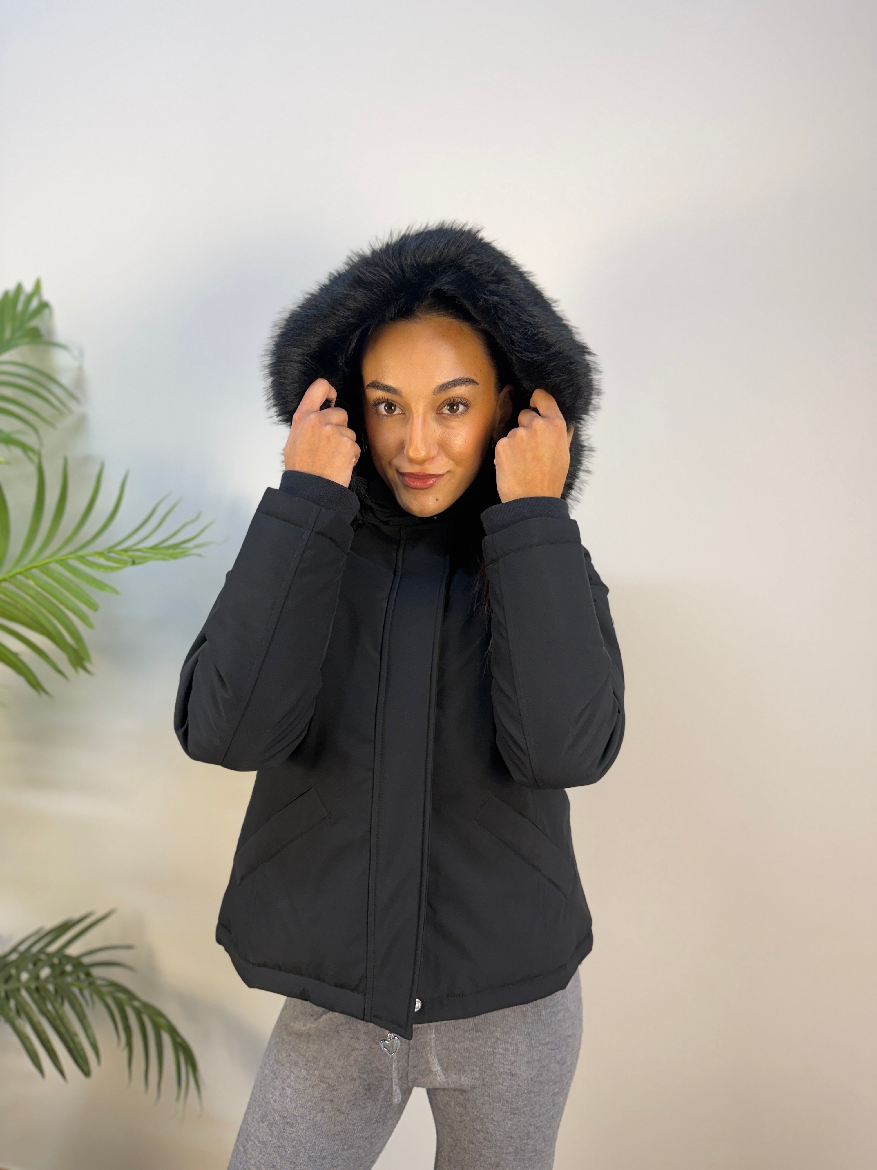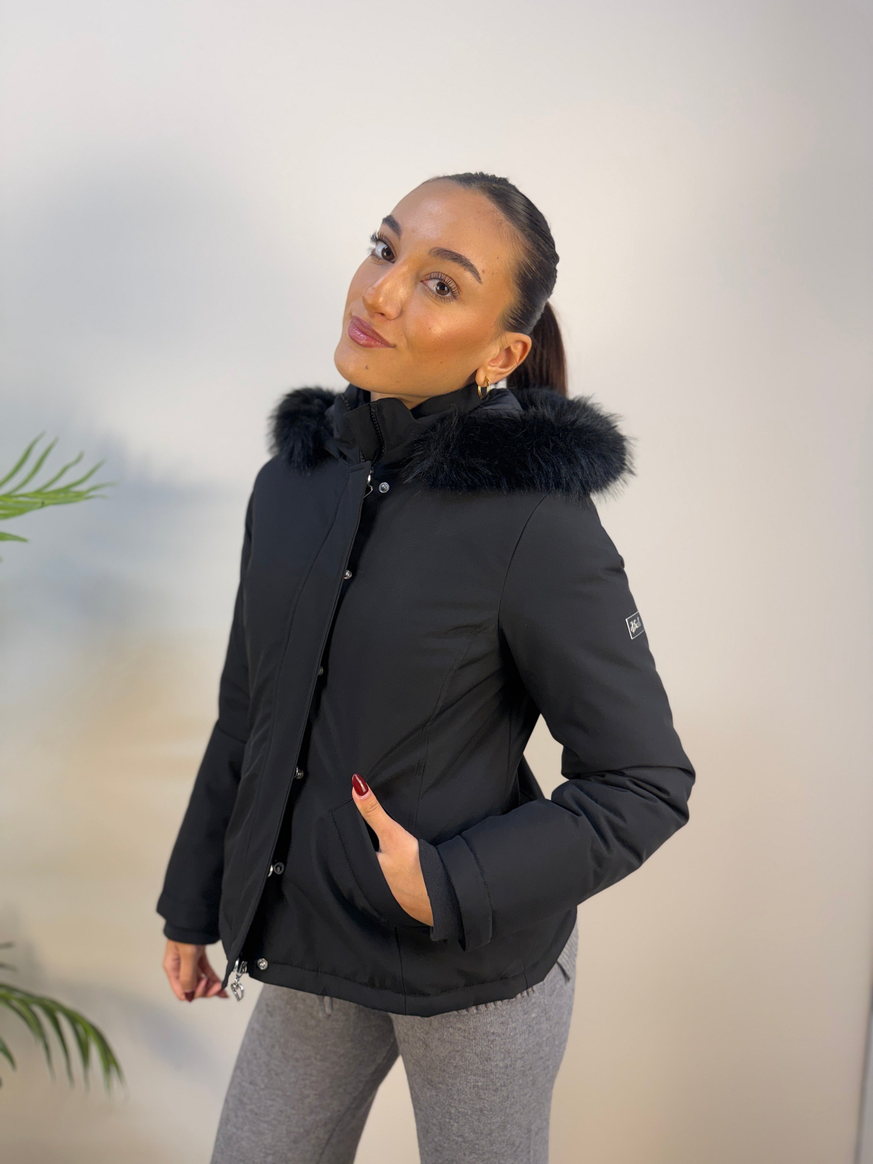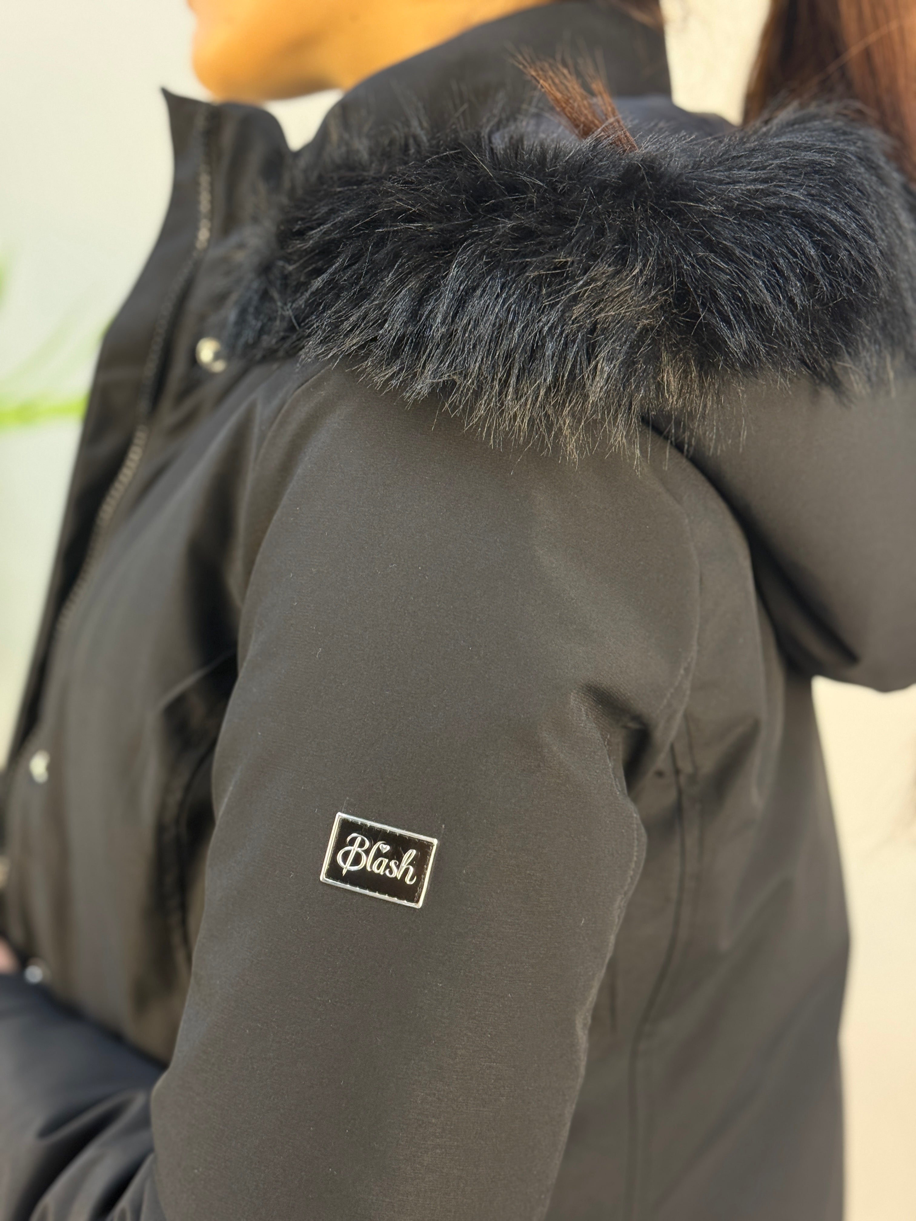 Giubbotto BLASH versatile e dal design pulito, pensato per affrontare la stagione fredda con stile. Realizzato in tessuto tecnico liscio, offre una protezione ottimale e una vestibilità confortevole. Il cappuccio è impreziosito da un bordo in pelliccia removibile, per adattarsi facilmente a ogni occasione e condizione. La doppia chiusura con cerniera e bottoni garantisce praticità e isolamento, mentre le due tasche frontali con chiusura interna a bottone aggiungono funzionalità e discrezione. Un must-have contemporaneo che unisce eleganza e performance.