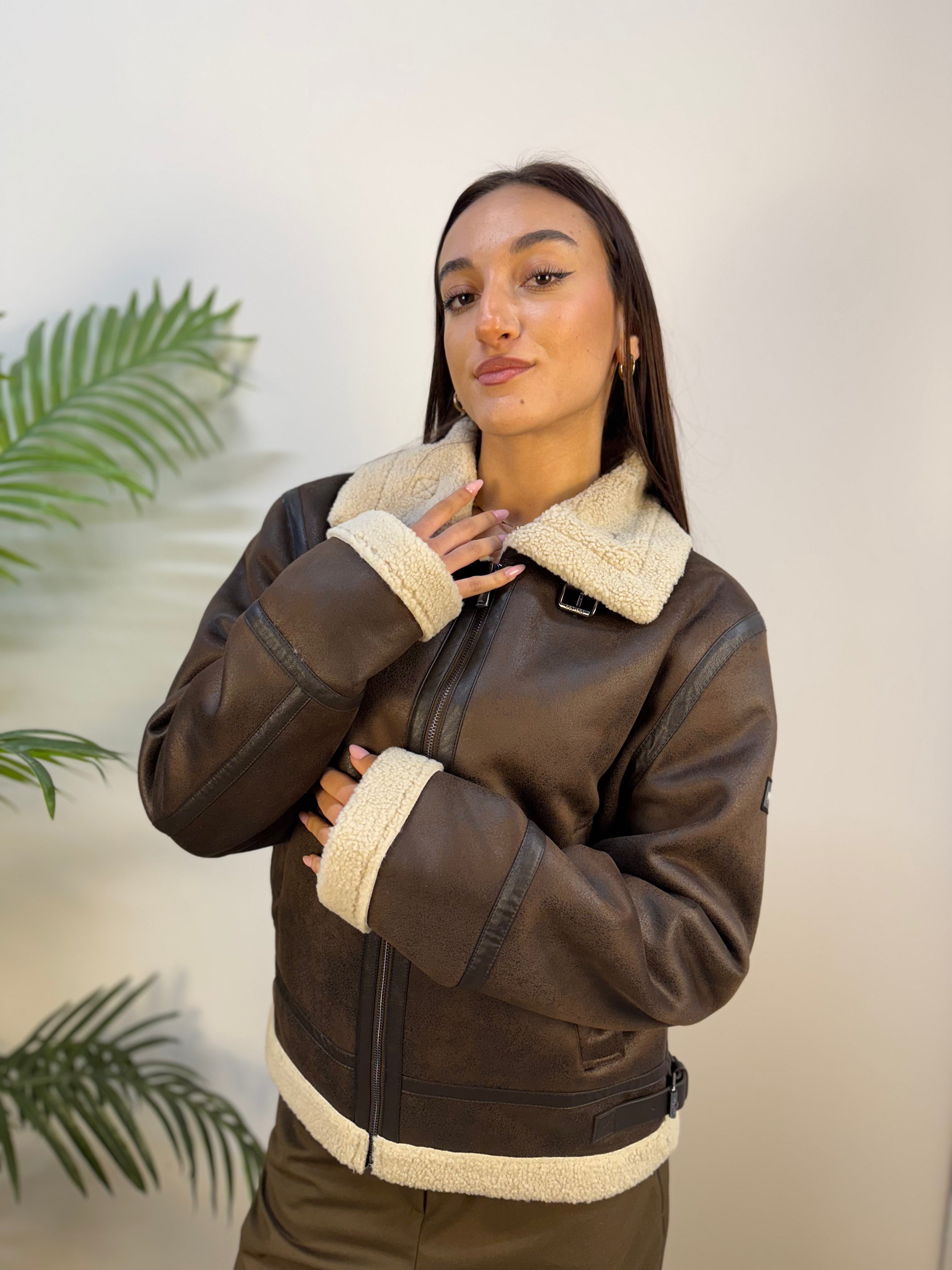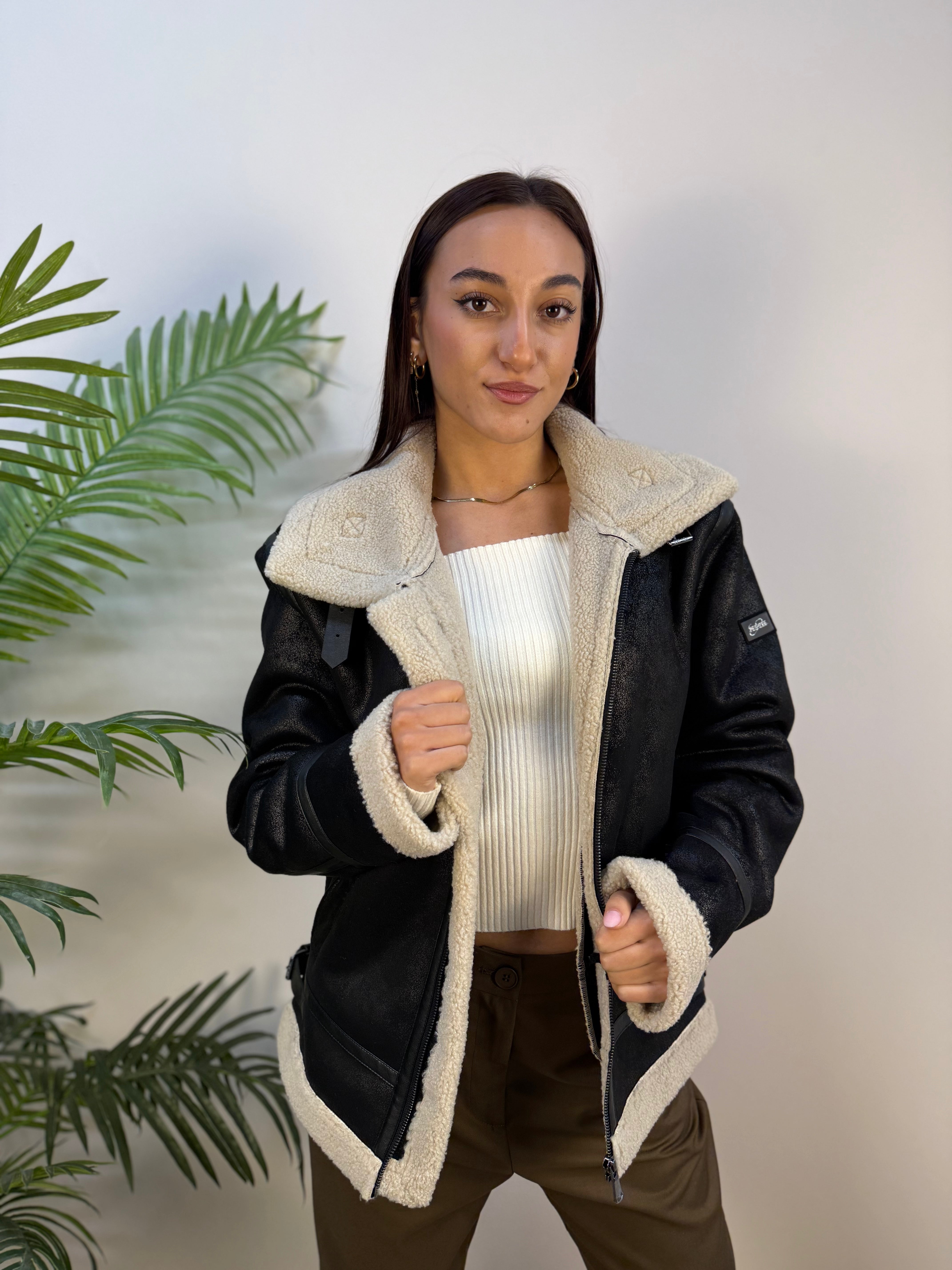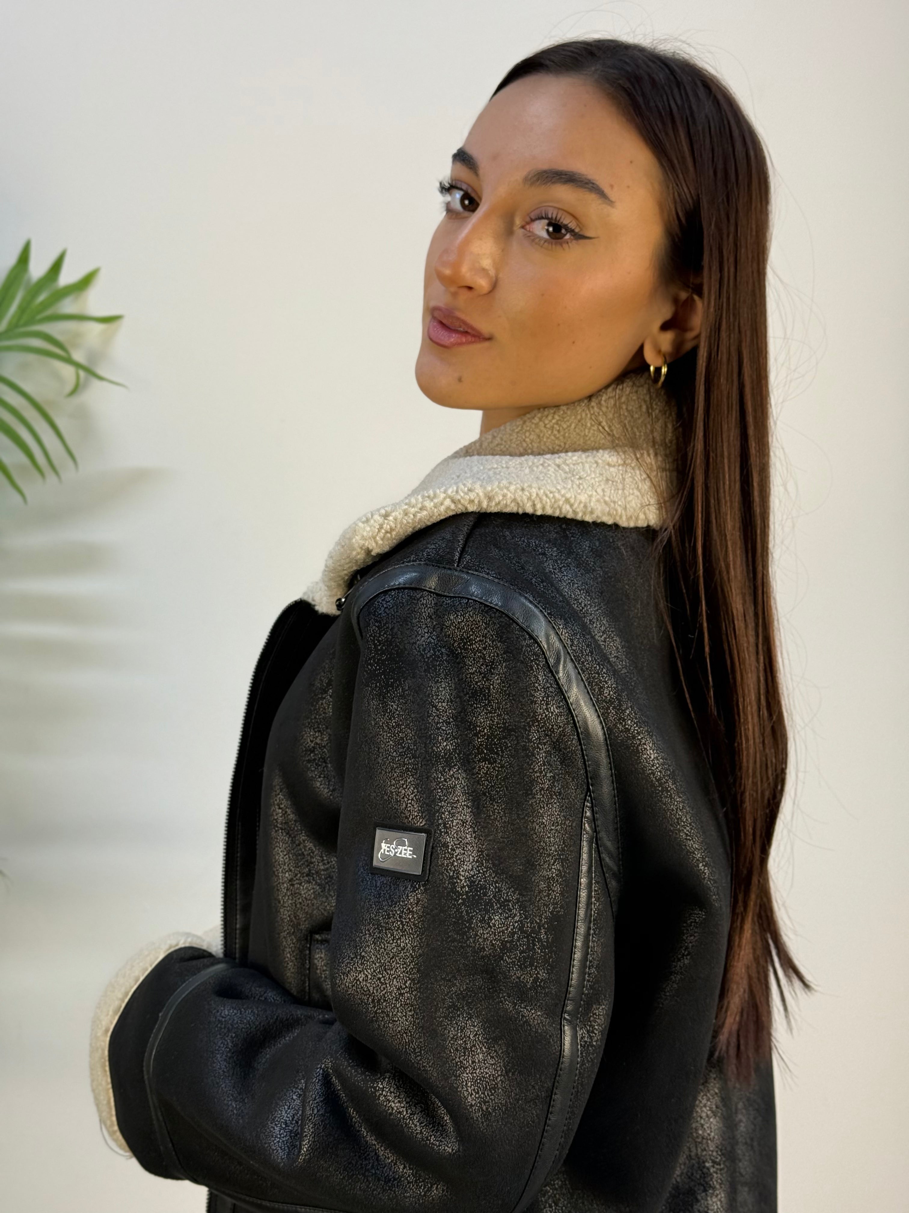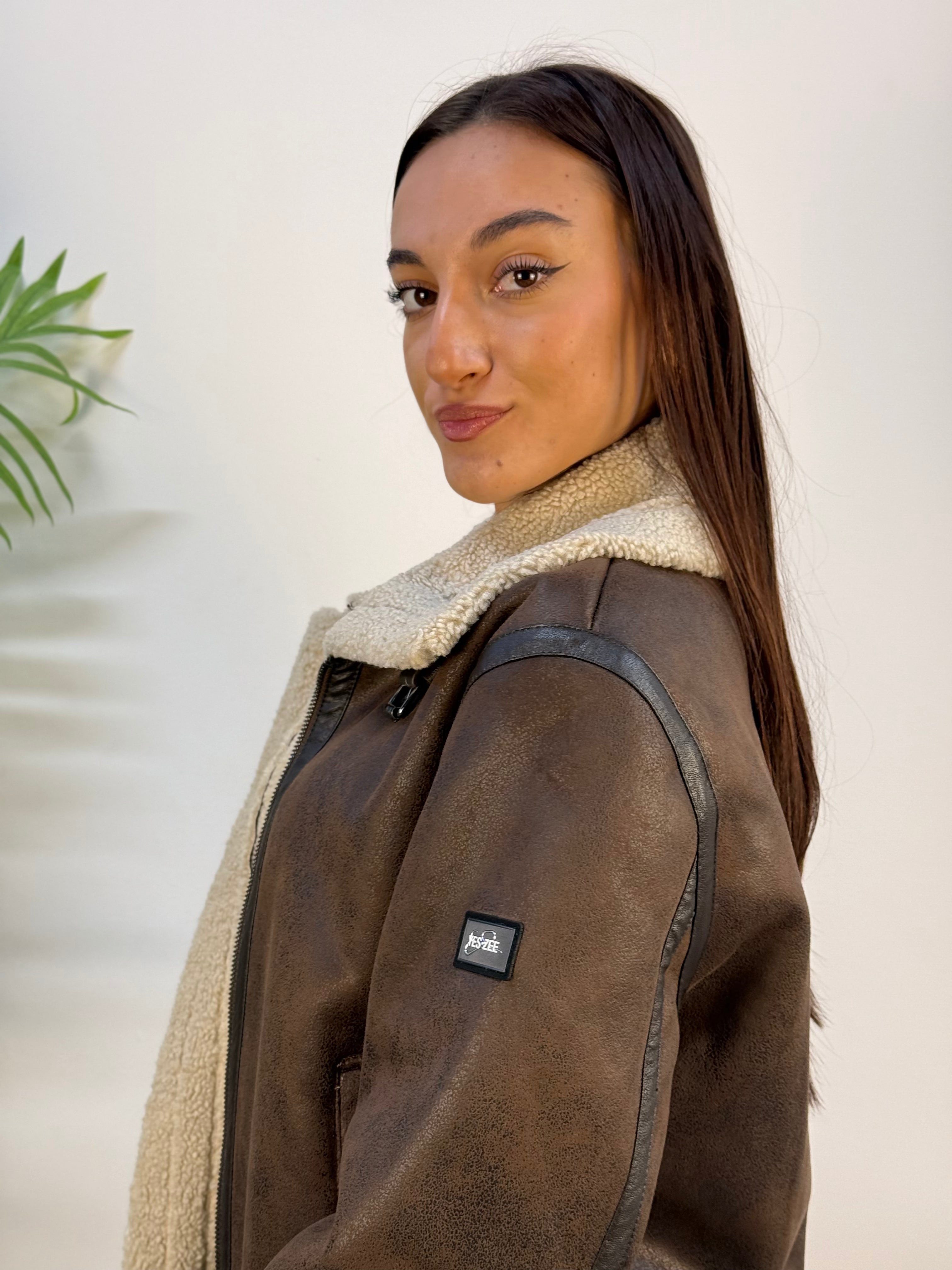 Giubbotto Yes-Zee oversize in tessuto scamosciato con dettagli in similpelle tono su tono e morbida pelliccia effetto montone, dentro e fuori, per massimo calore e comfort. Rifinito da zip, tasche frontali, patch logata sulla manica e fibbie su polsini, collo e fianchi per un look raffinato e contemporaneo.