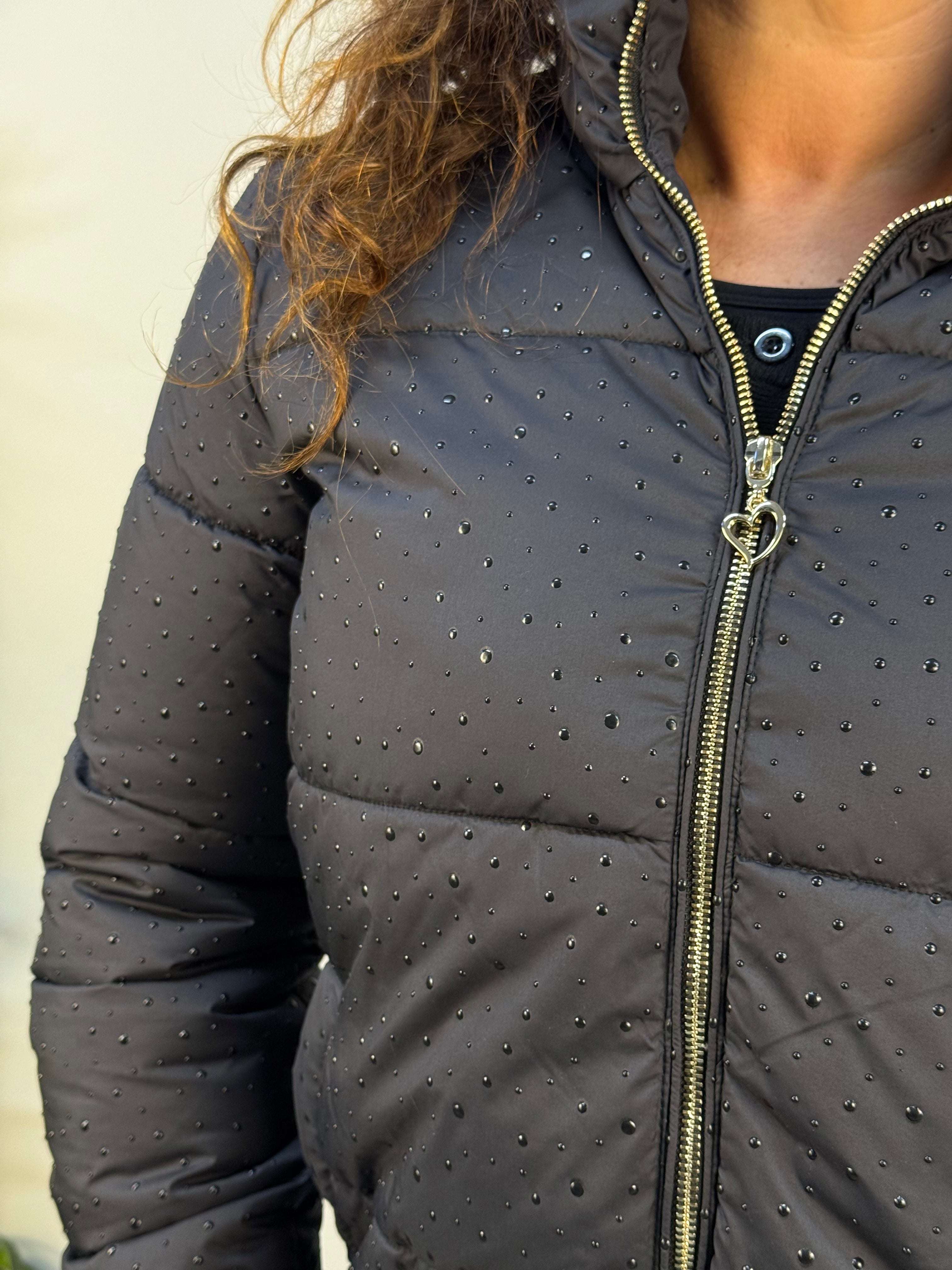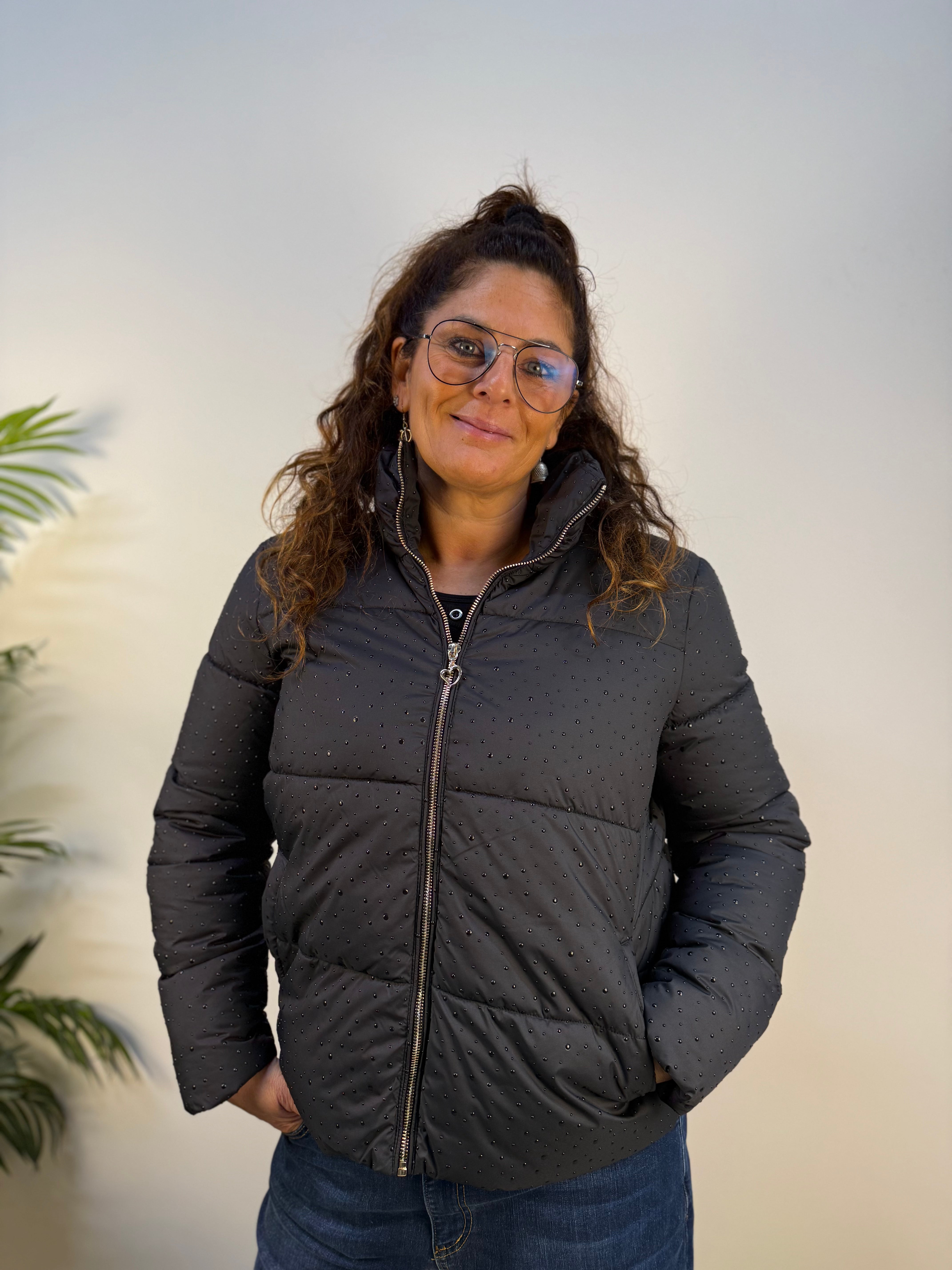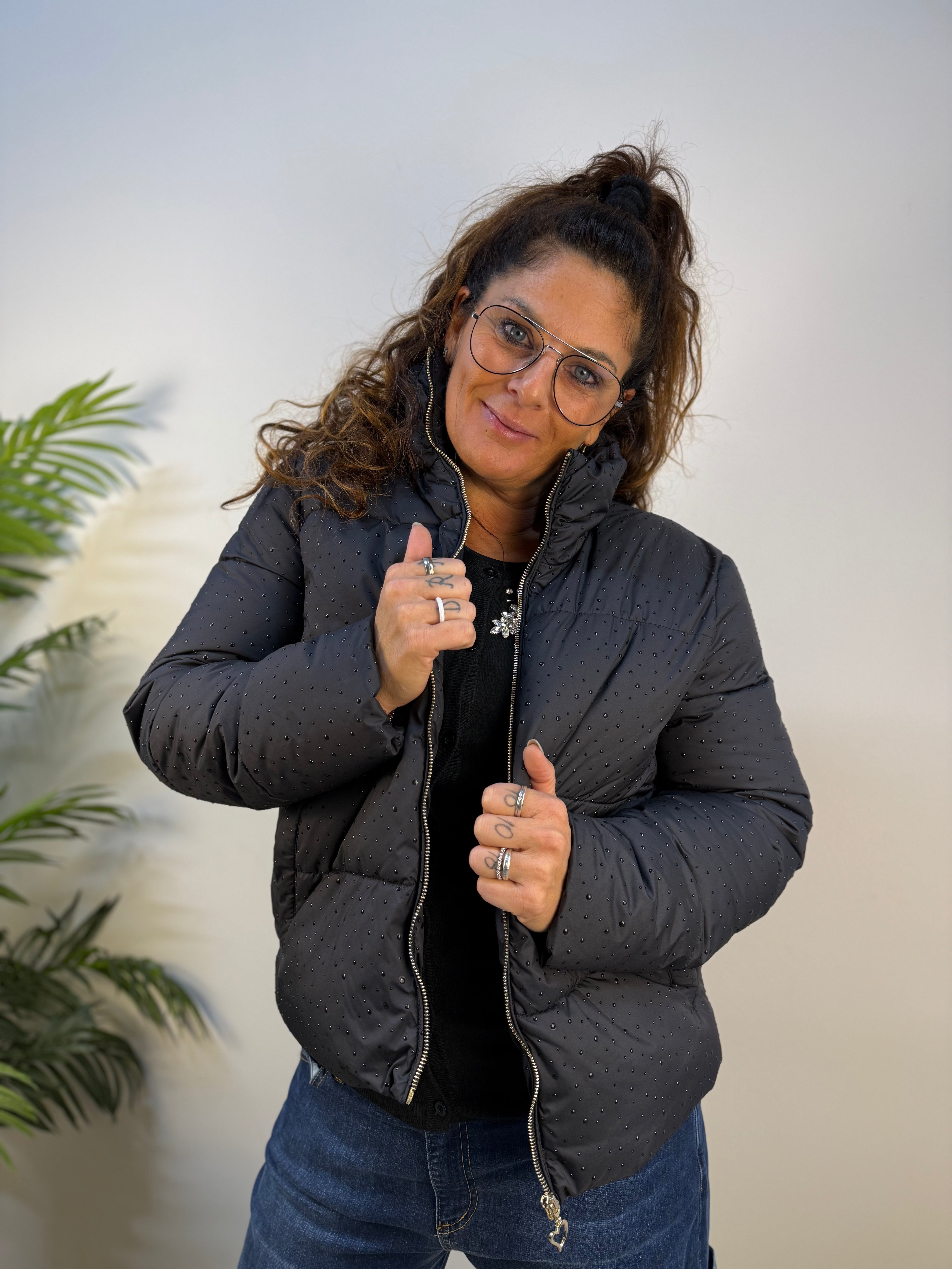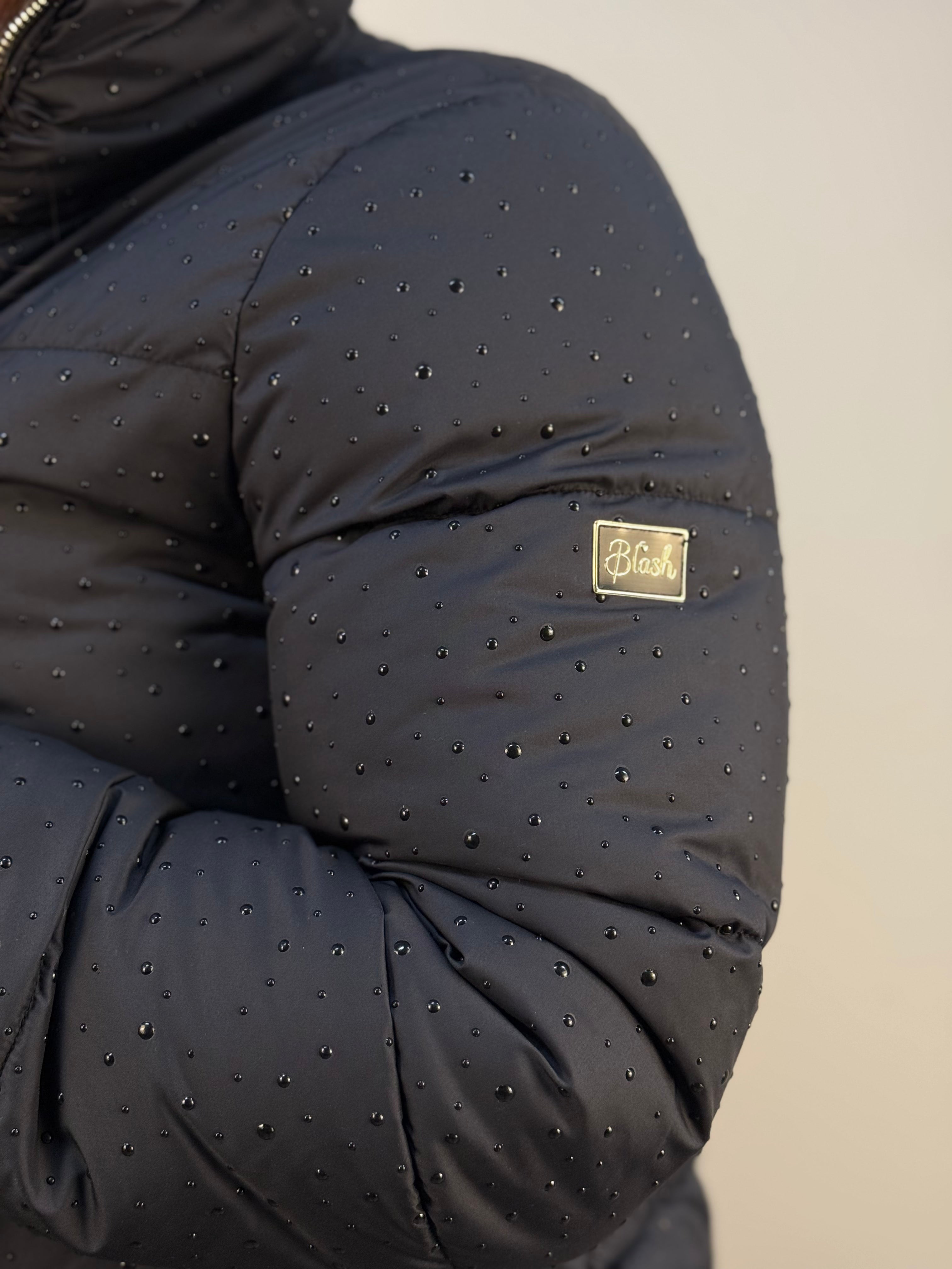 Piumino Blash in microfibra tinta unita dal design elegante e luminoso, impreziosito da delicati strass tono su tono che riflettono la luce con raffinatezza. La chiusura frontale con zip è valorizzata da un romantico cursore a forma di cuoricino, mentre la patch logata sulla spalla aggiunge un tocco distintivo al capo. Caldo, femminile e perfetto per illuminare i look invernali.