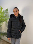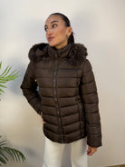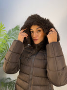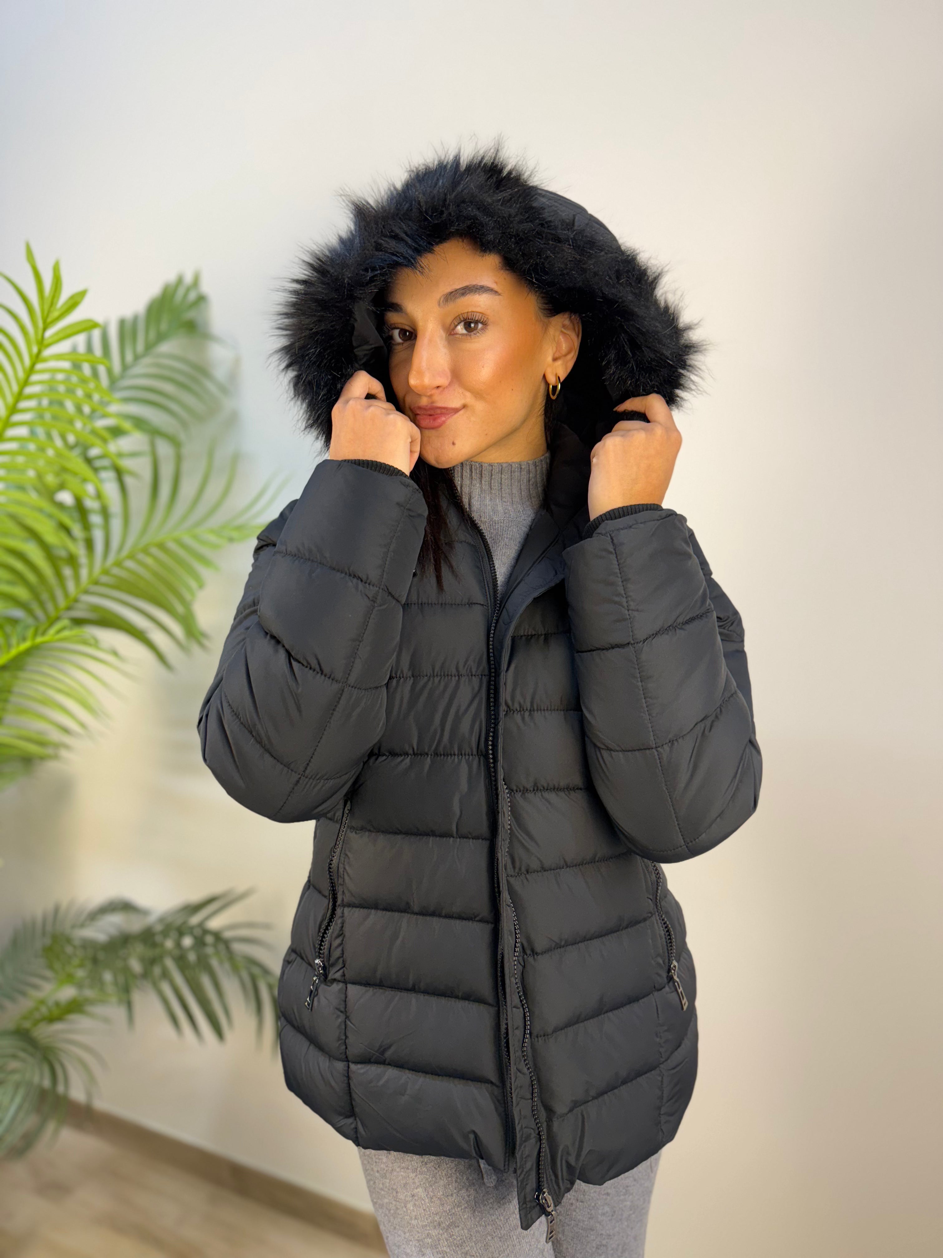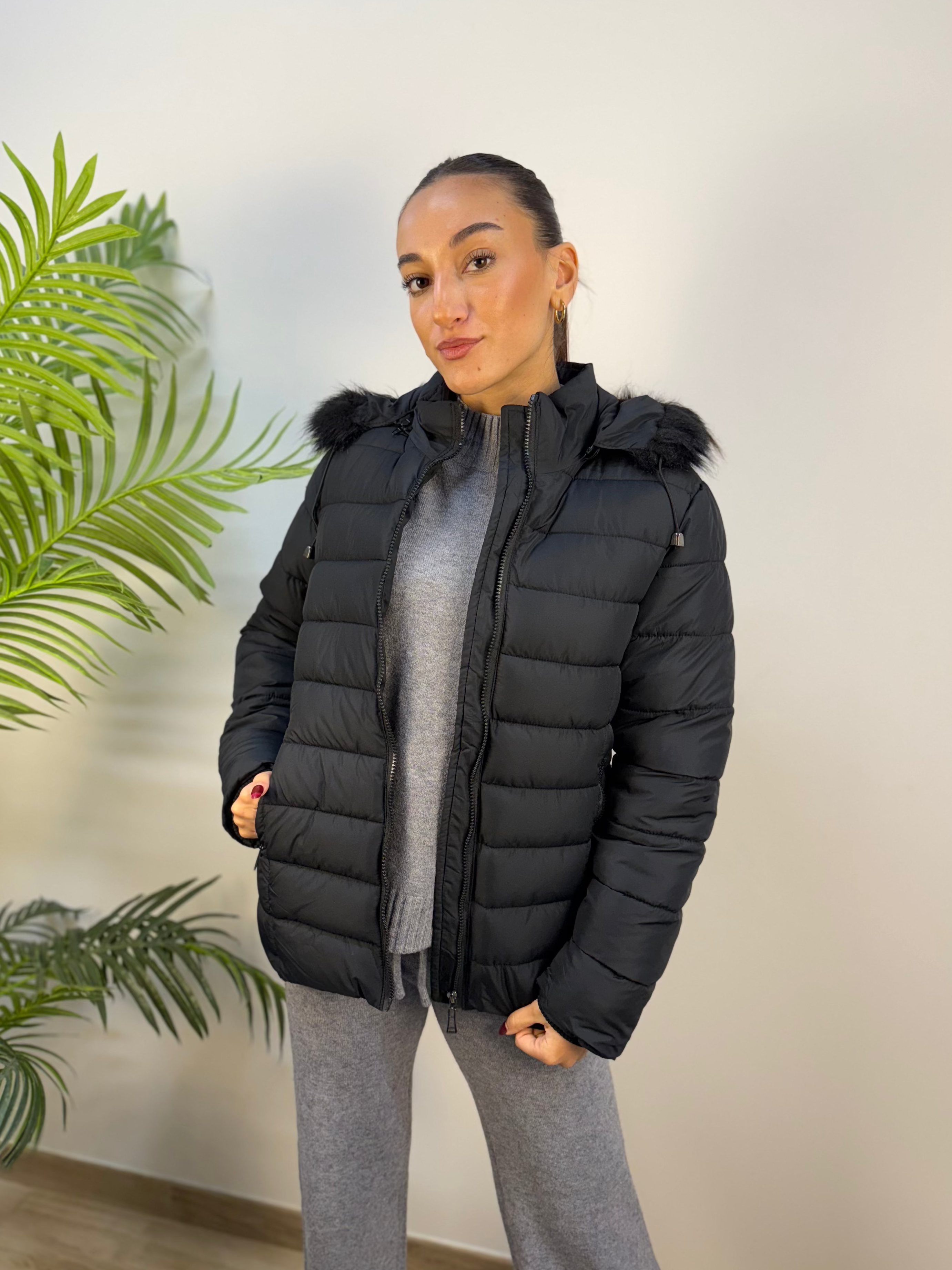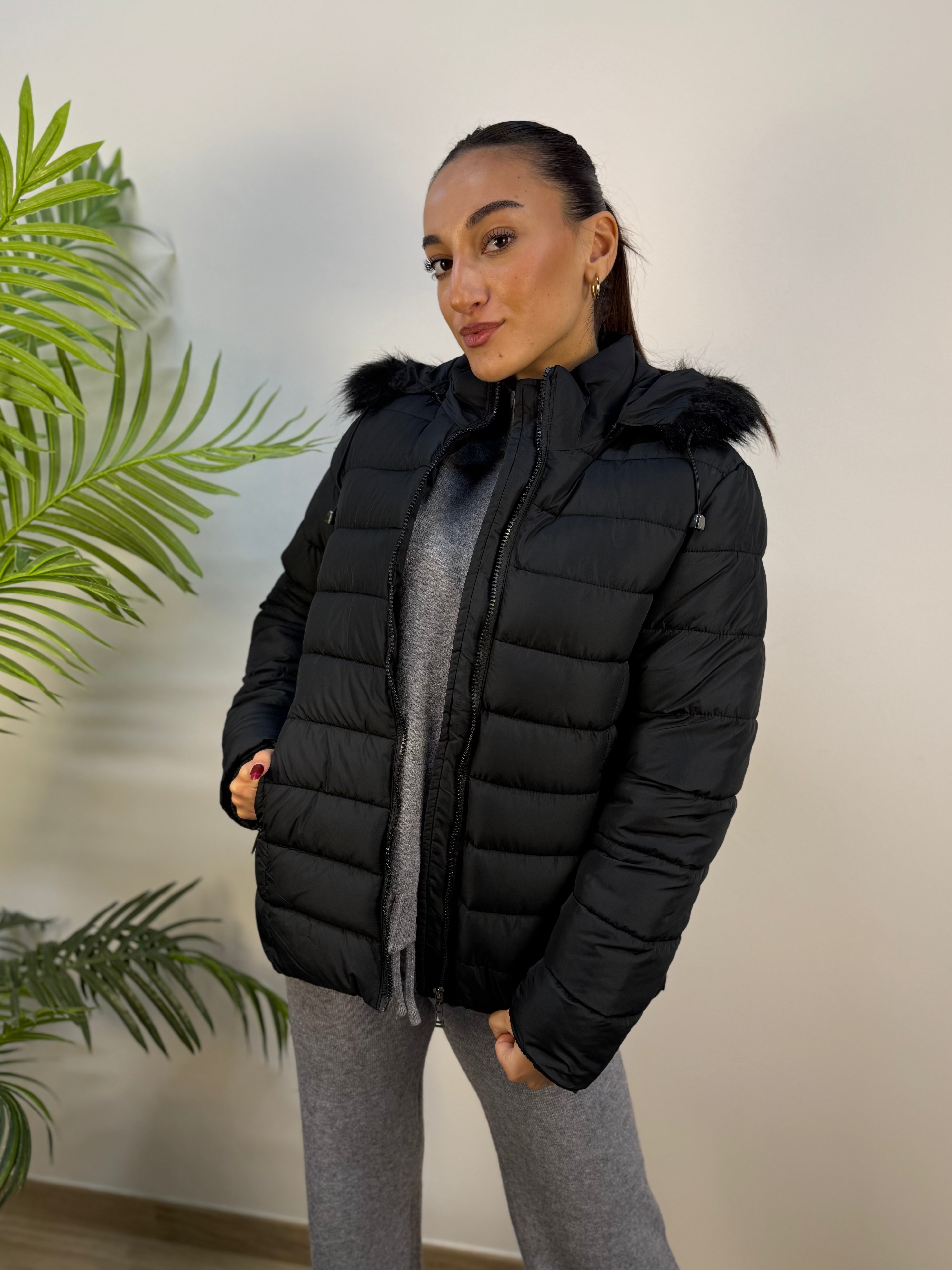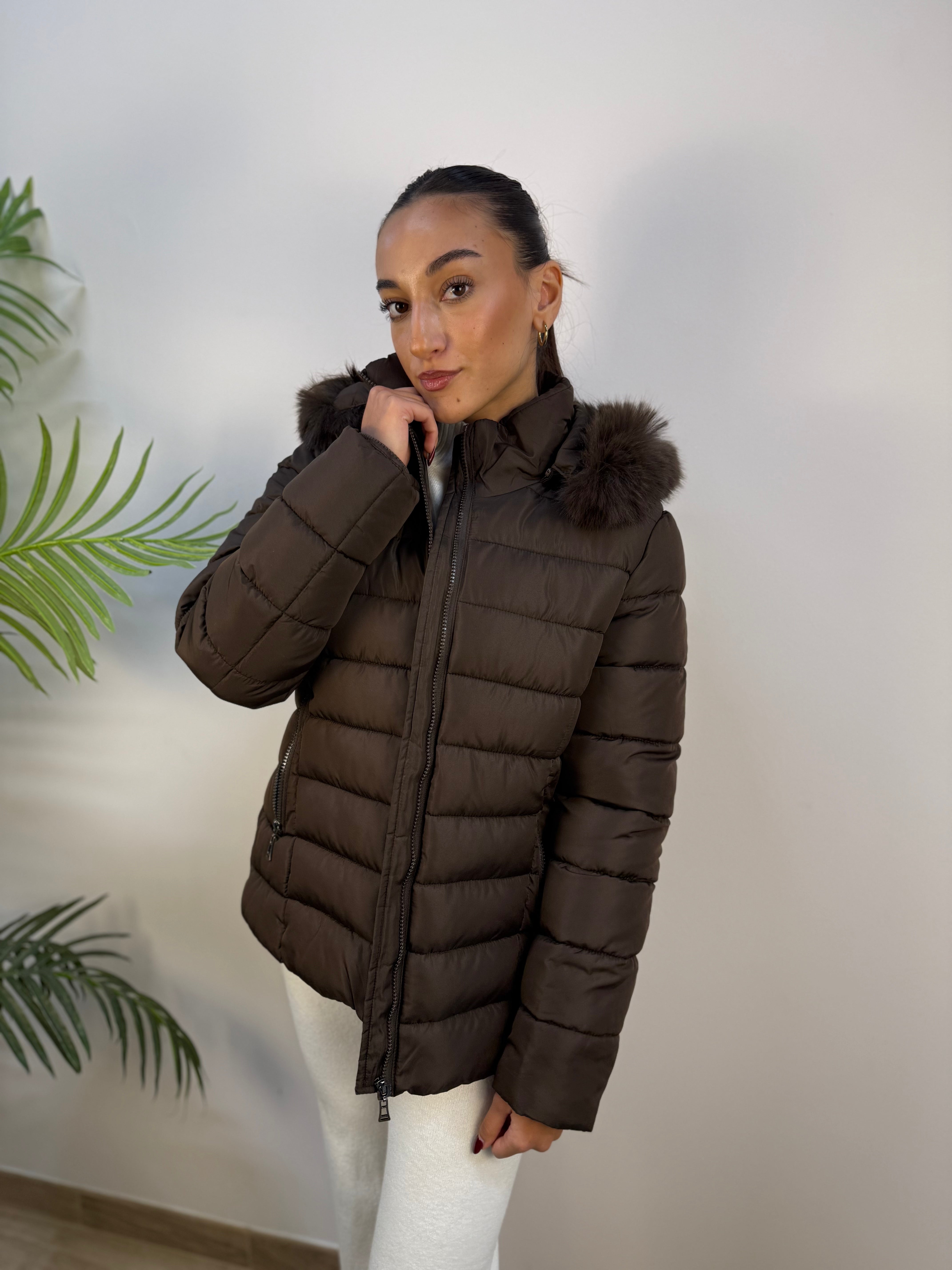 Piumino Akè con finitura opaca e imbottitura calda, dotato di chiusura frontale con zip e tasche frontali con zip. Il cappuccio con bordo in pelo è removibile e regolabile con lacci elasticizzati. Un capo pratico e raffinato, ideale per la stagione fredda.