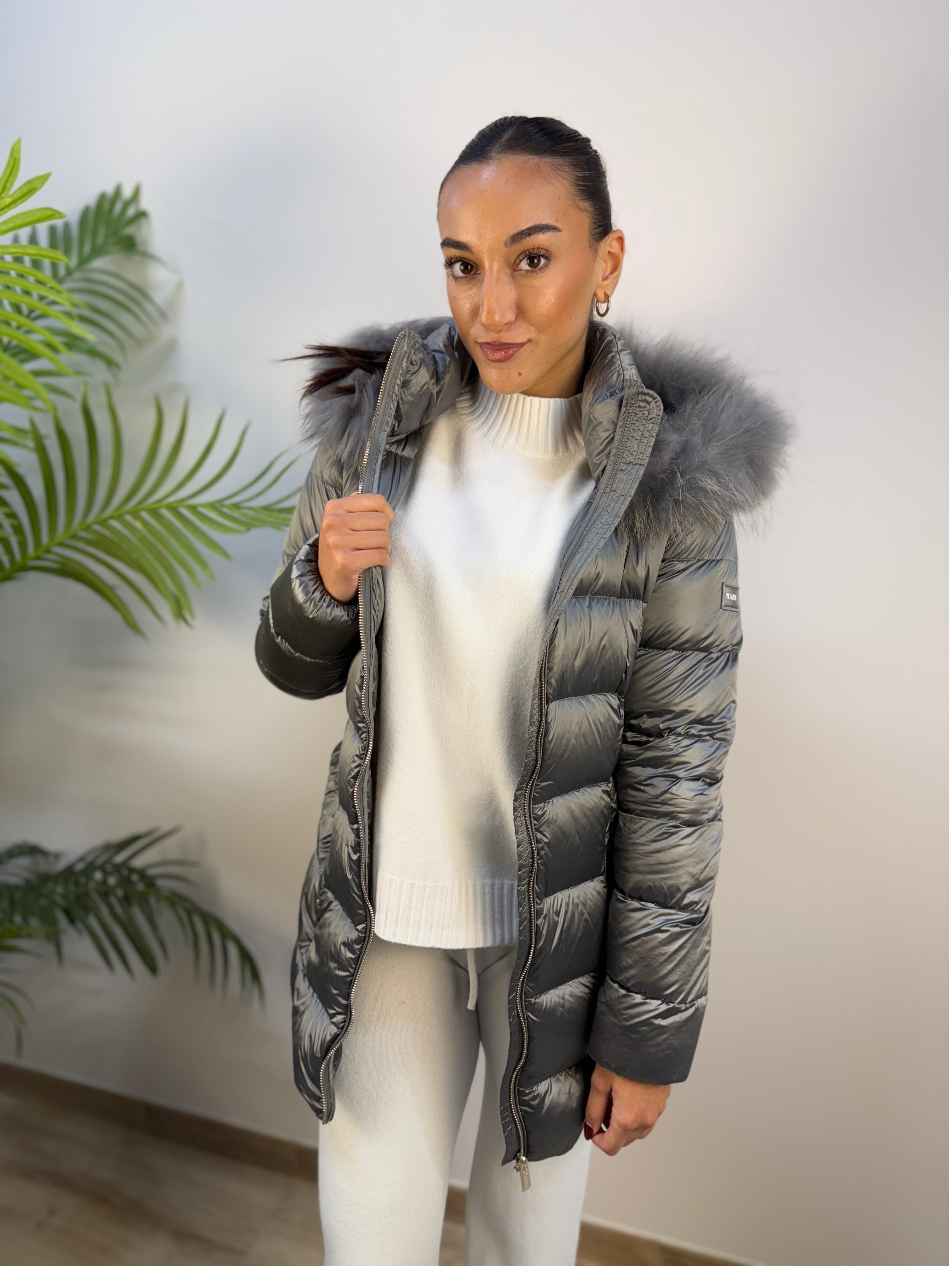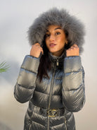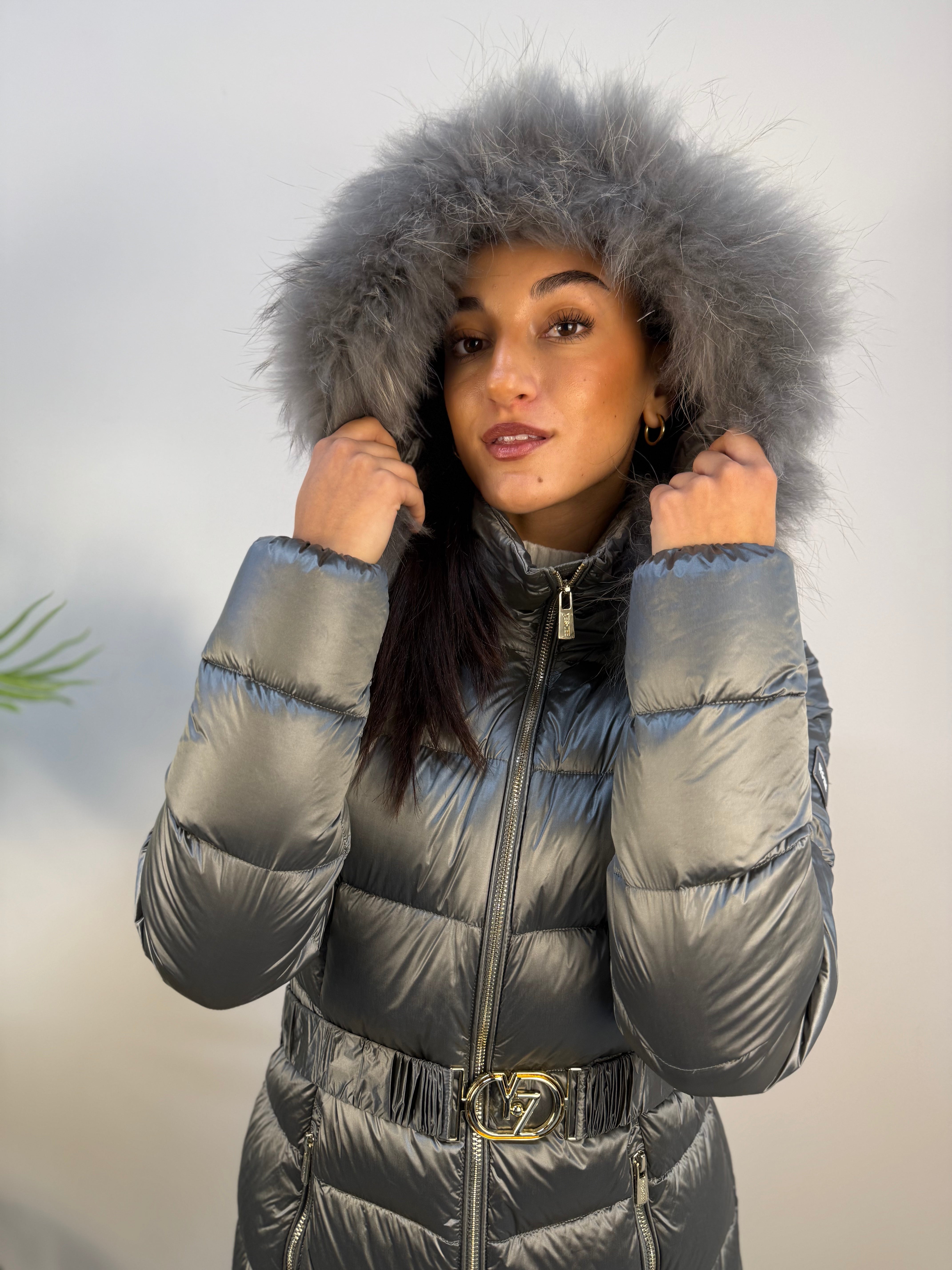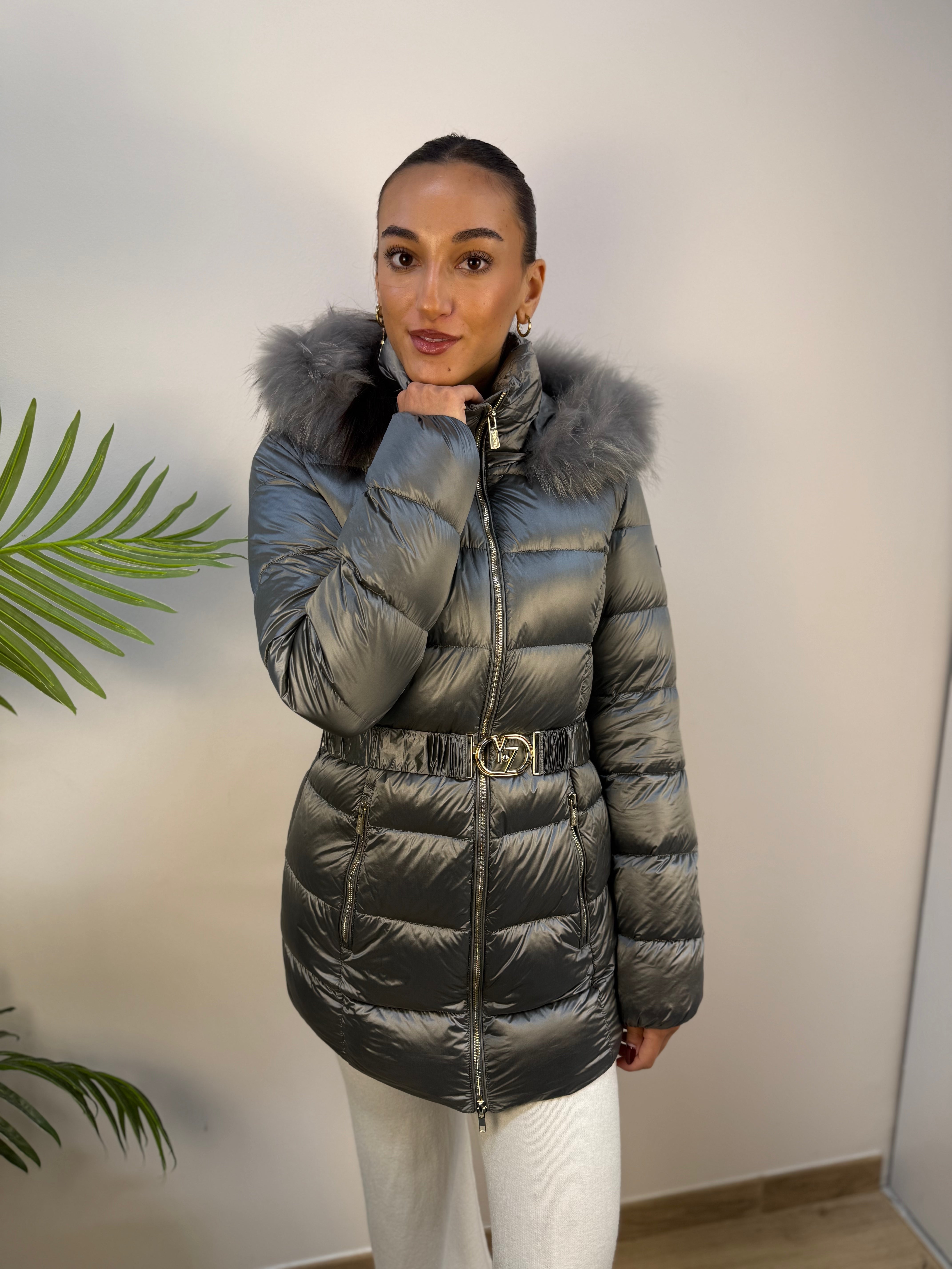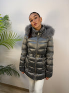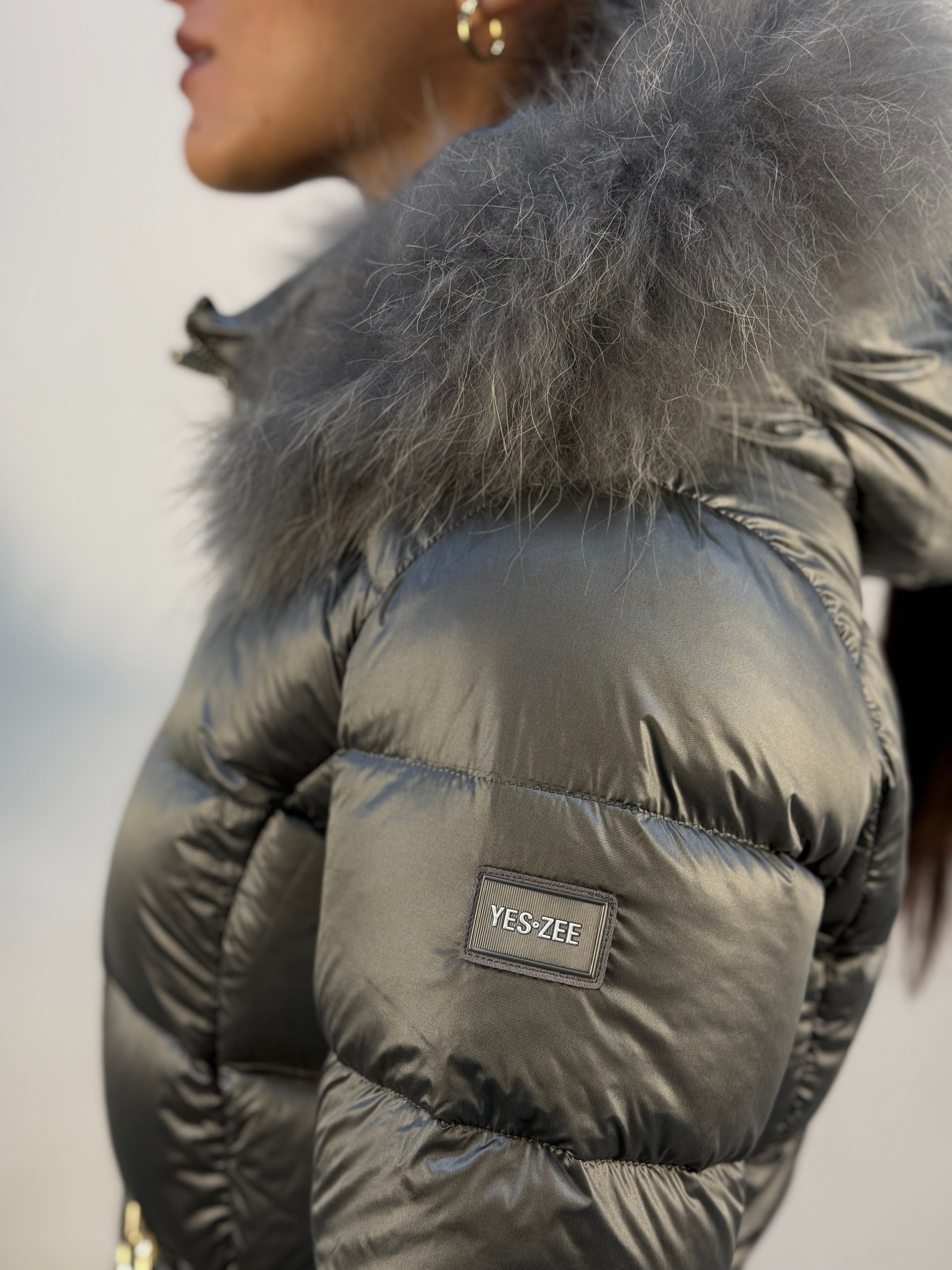 Piumino Yes-Zee in un elegante color grigio effetto lucido, dal look raffinato e femminile. Dotato di chiusura frontale con zip, tasche frontali con zip e polsini elasticizzati. Il cappuccio con bordo in pelo removibile tramite zip unisce stile e praticità. Completa il design la cintura elasticizzata tono su tono con fibbia logata metallica, che valorizza la silhouette con un tocco chic.