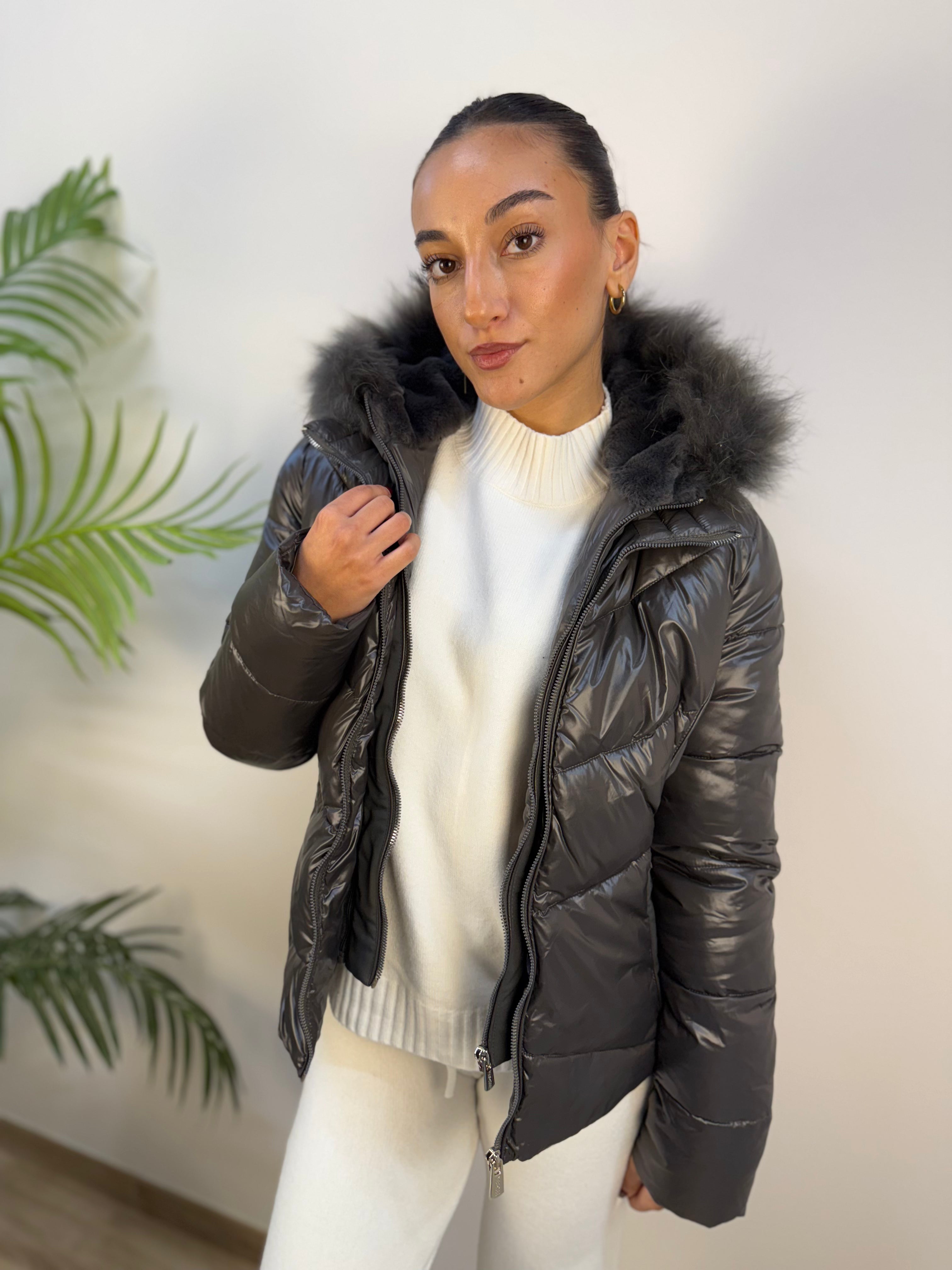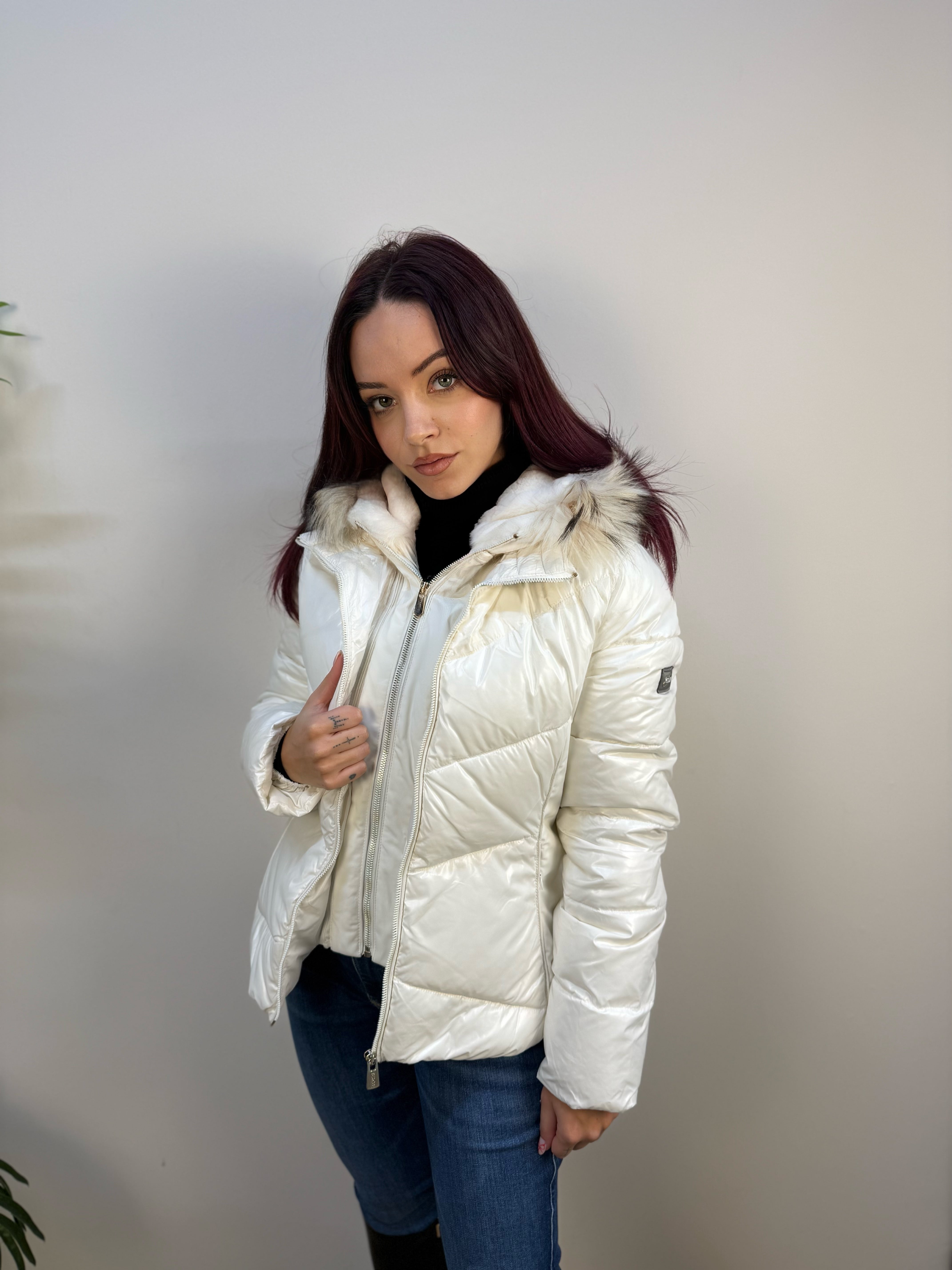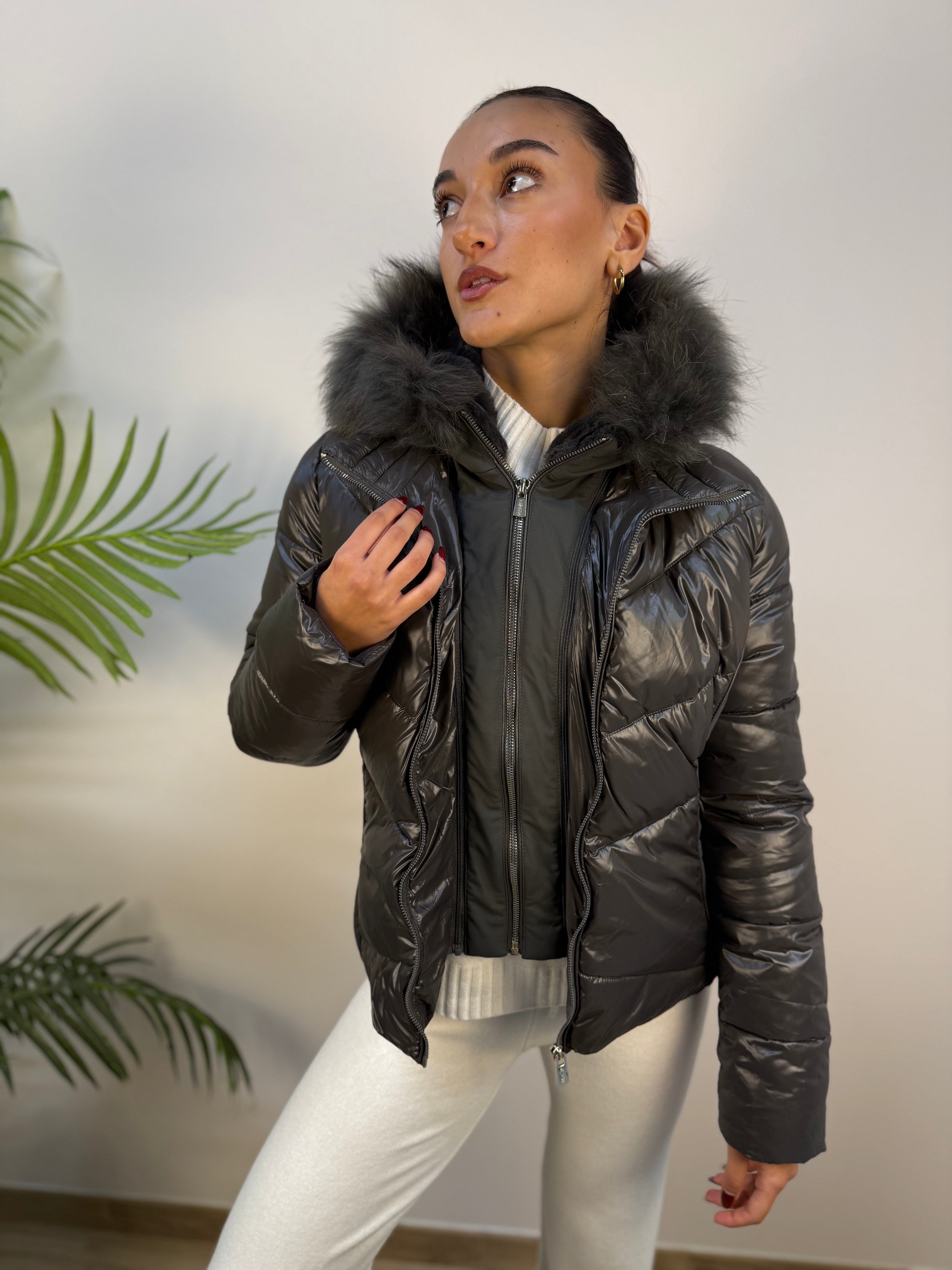 Piumino Yes-Zee con dettagli laterali in tessuto tecnico, dotato di inserto antivento e cappuccio removibili. L’interno del cappuccio è in pelo corto con bordo in pelo per maggiore calore. Presenta tasche laterali con zip invisibile e chiusura frontale con zip. Caldo e raffinato, unisce funzionalità e stile elegante per la stagione fredda.